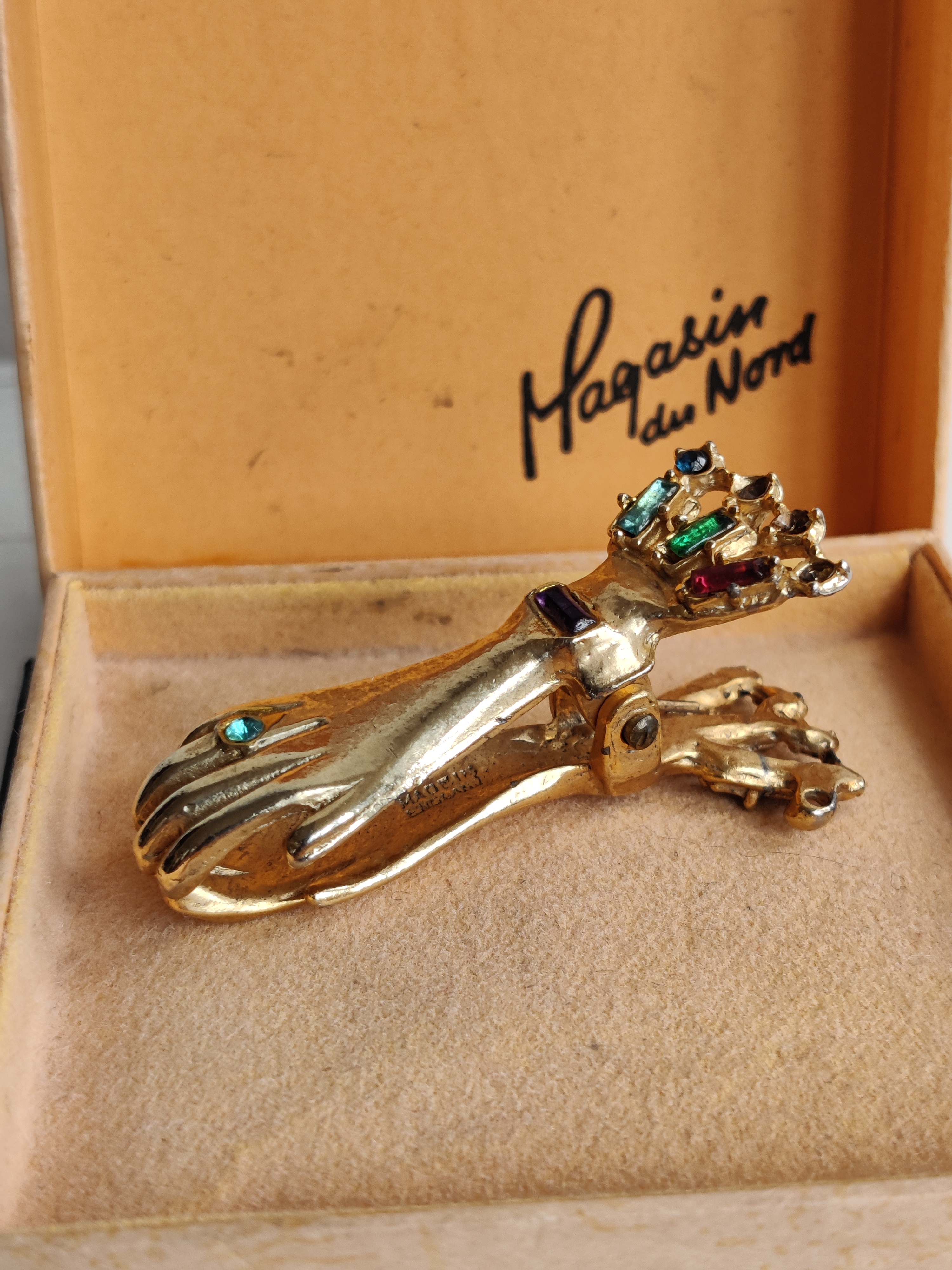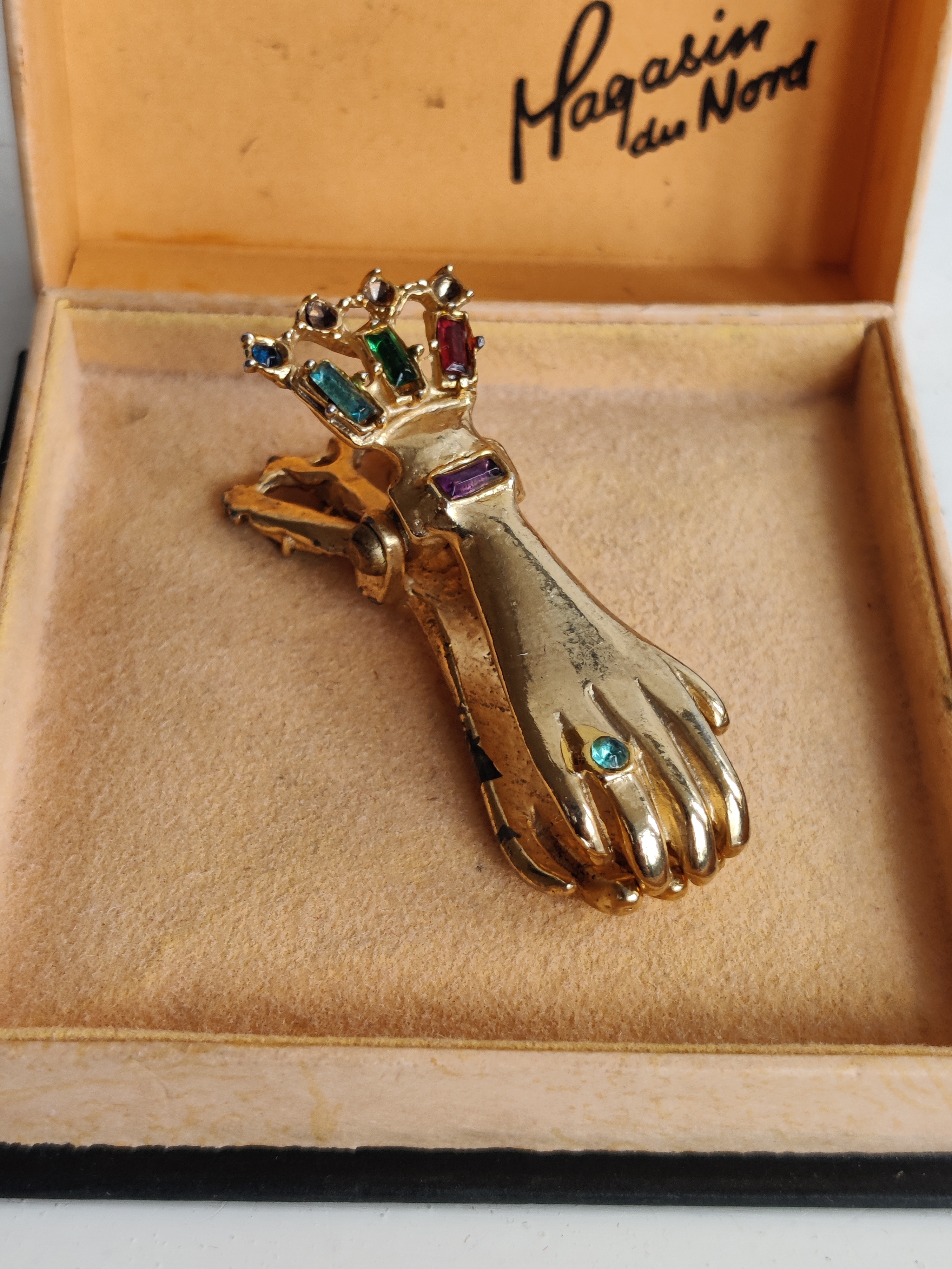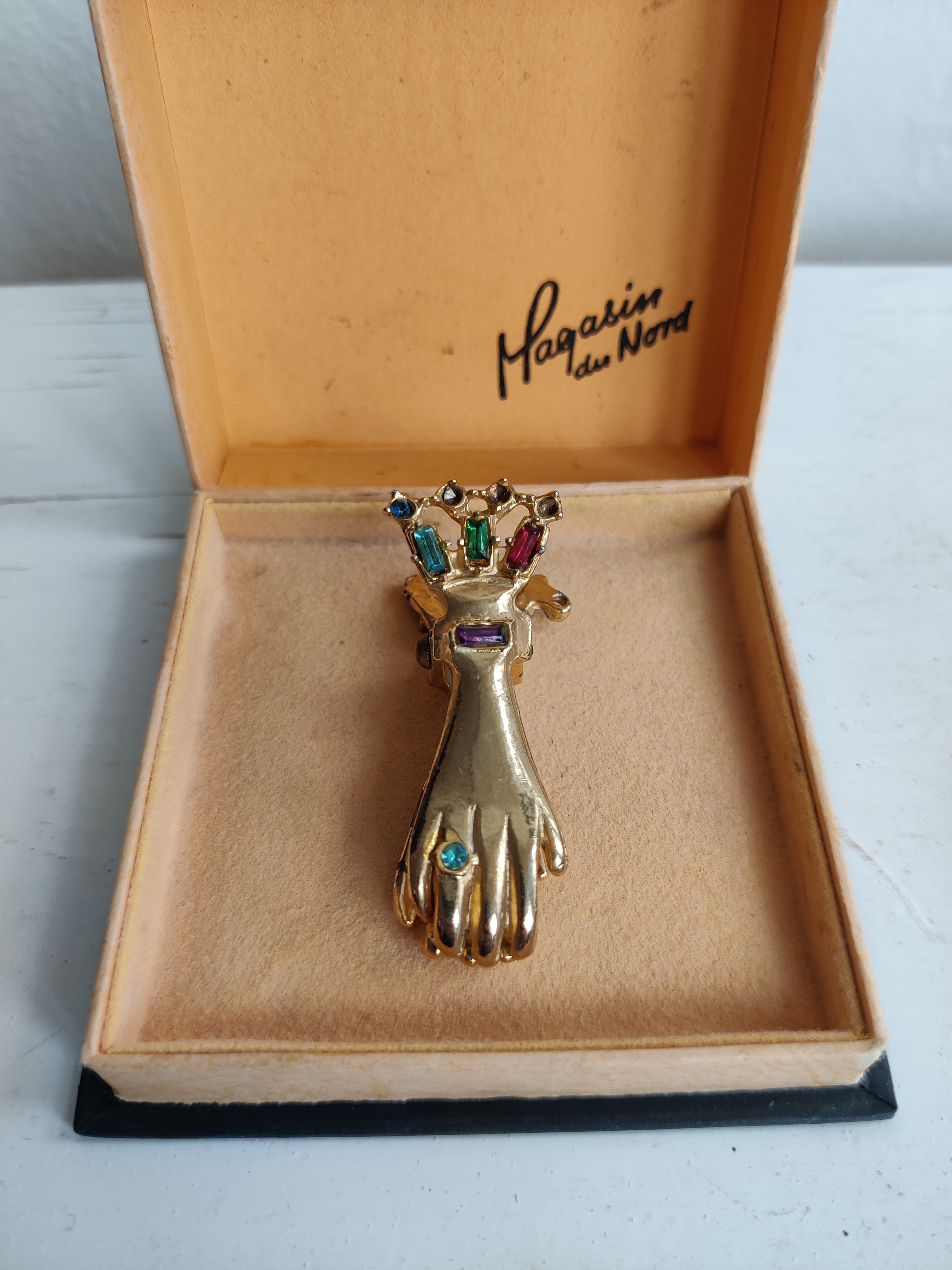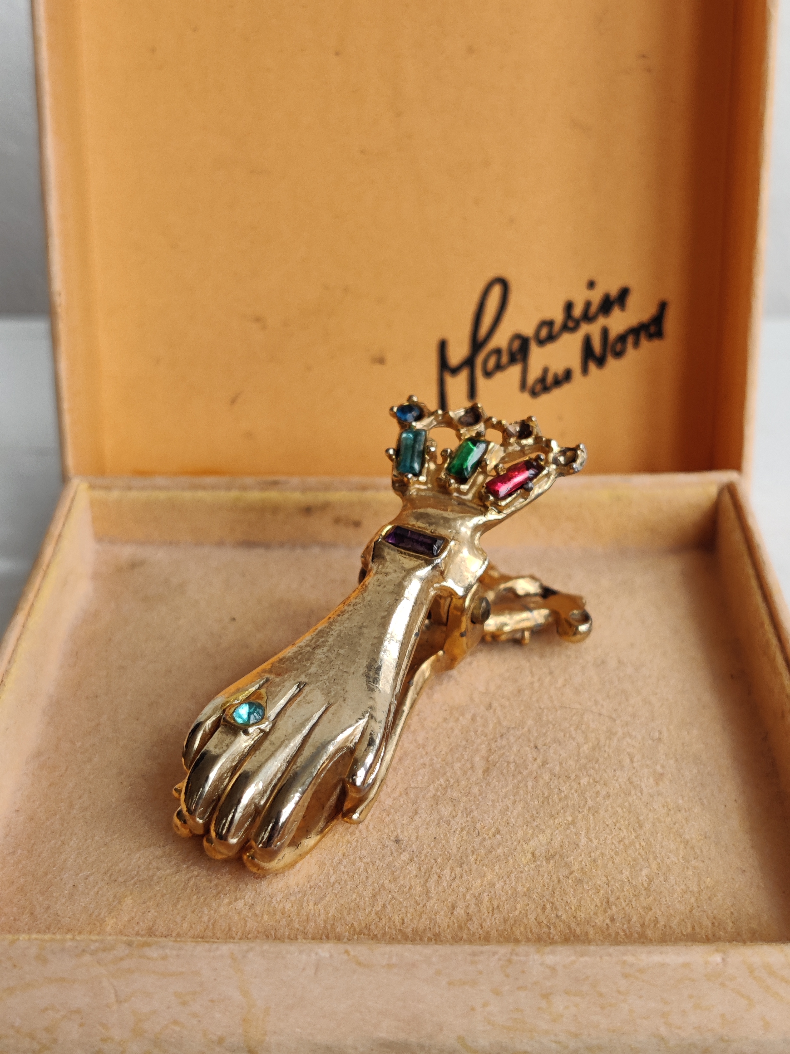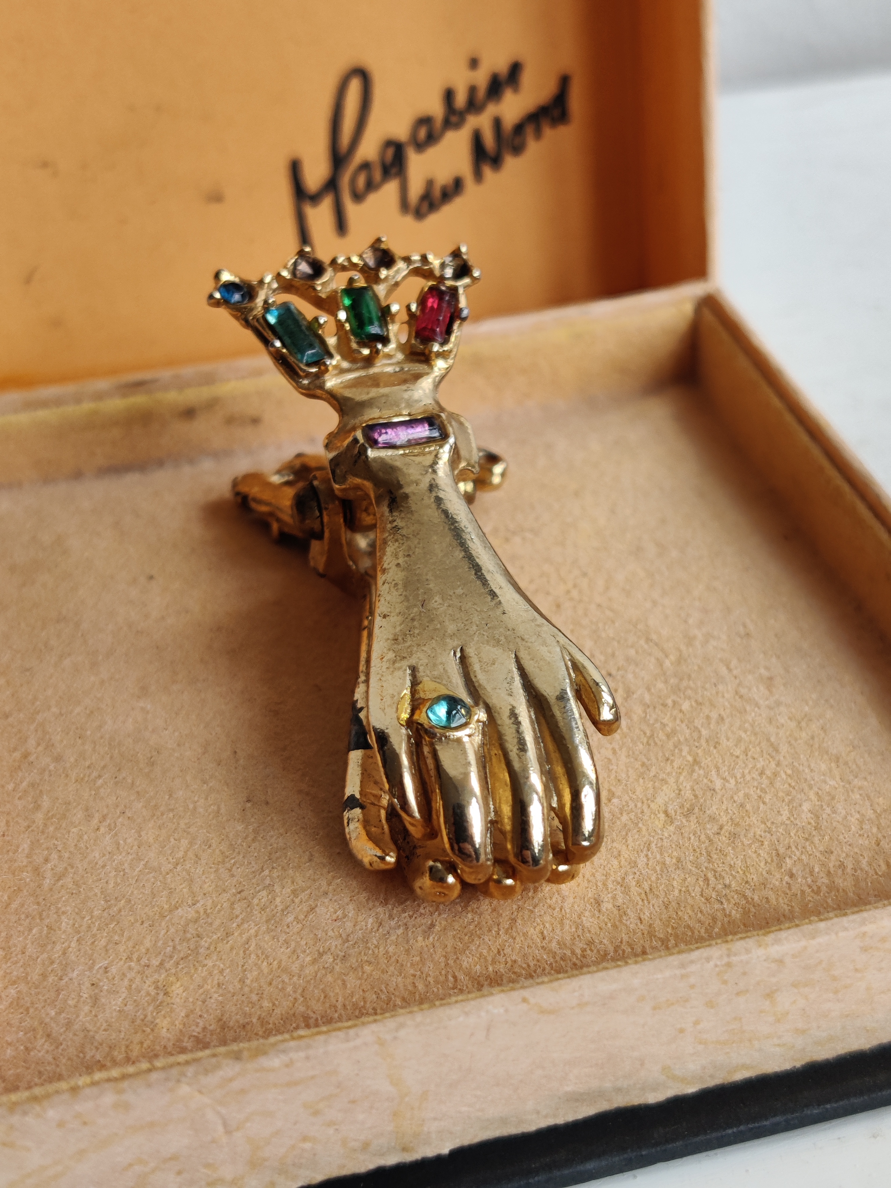 Klips af gyldne hænder med farvede sten, made in England. Den kan fx hapses på tøjet, forårshatten eller slipset. Den har også plads til, at man kan sætte en øsken og en kæde i, hvis den skal hænges om halsen. Der mangler enkelte sten på begge sider. Mål 5 x 2 cm