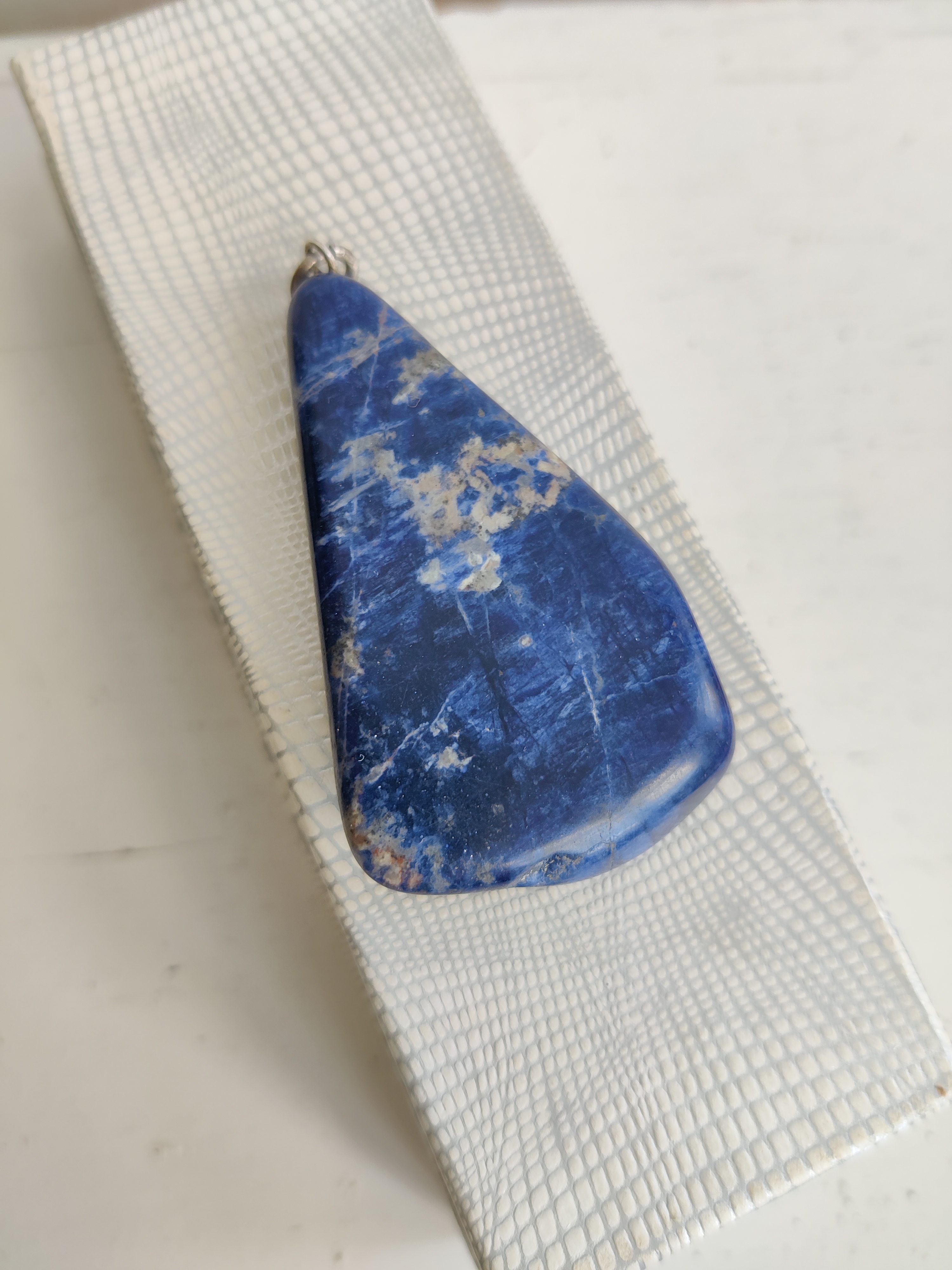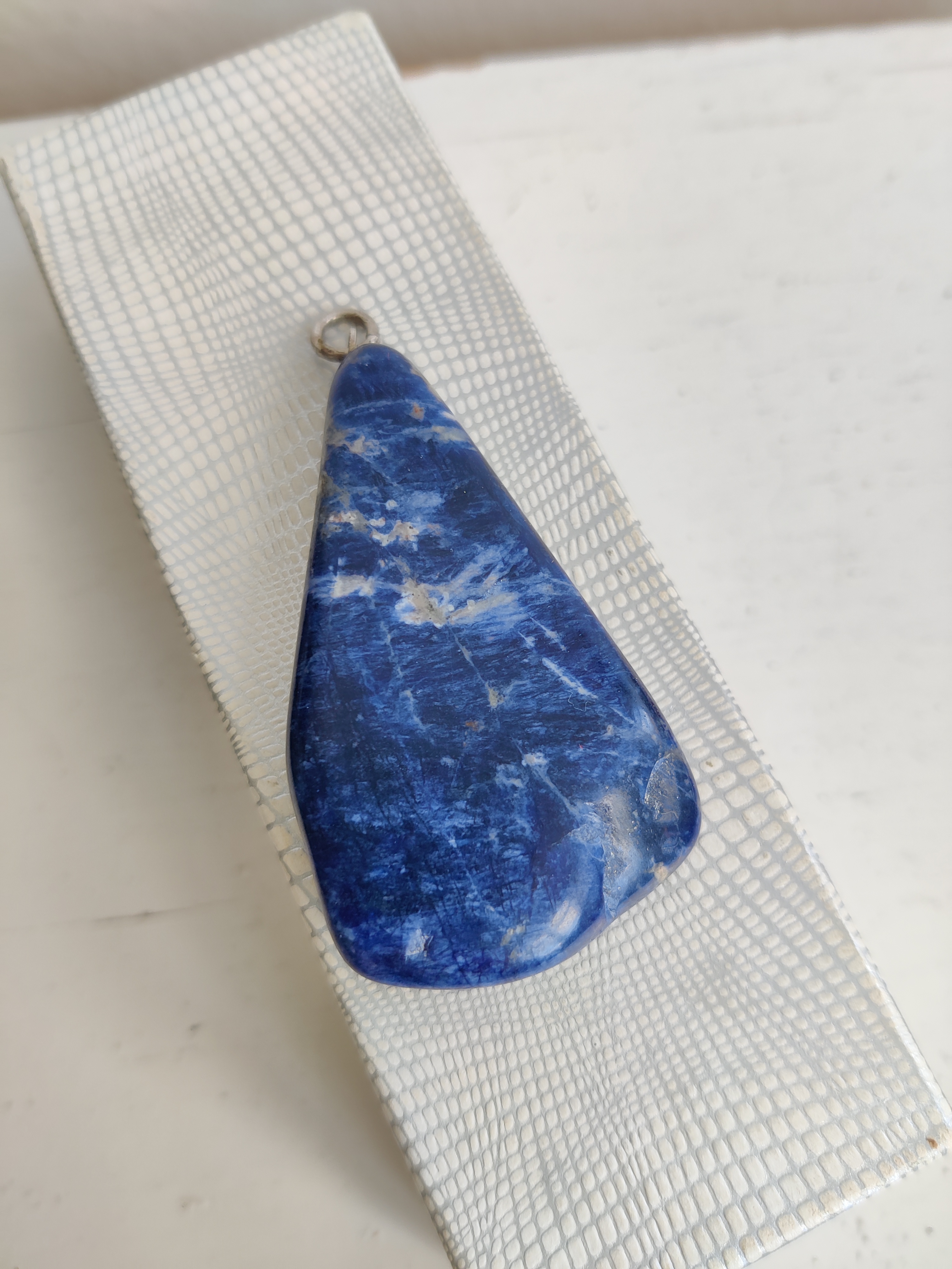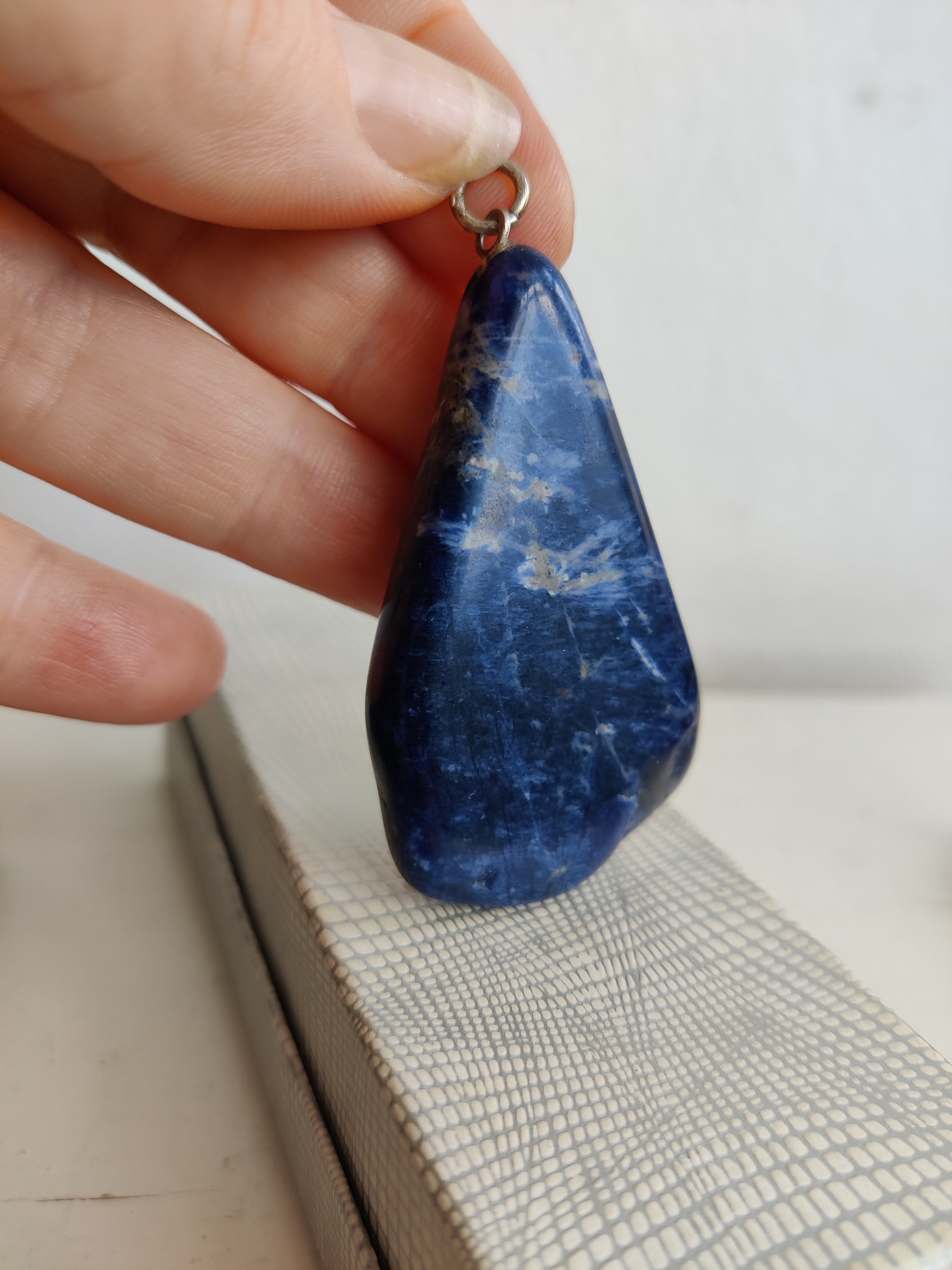 Stort smukt vedhæng af blå sten, måske Lapis Lazuli. Mål 5,5 x 3 cm.