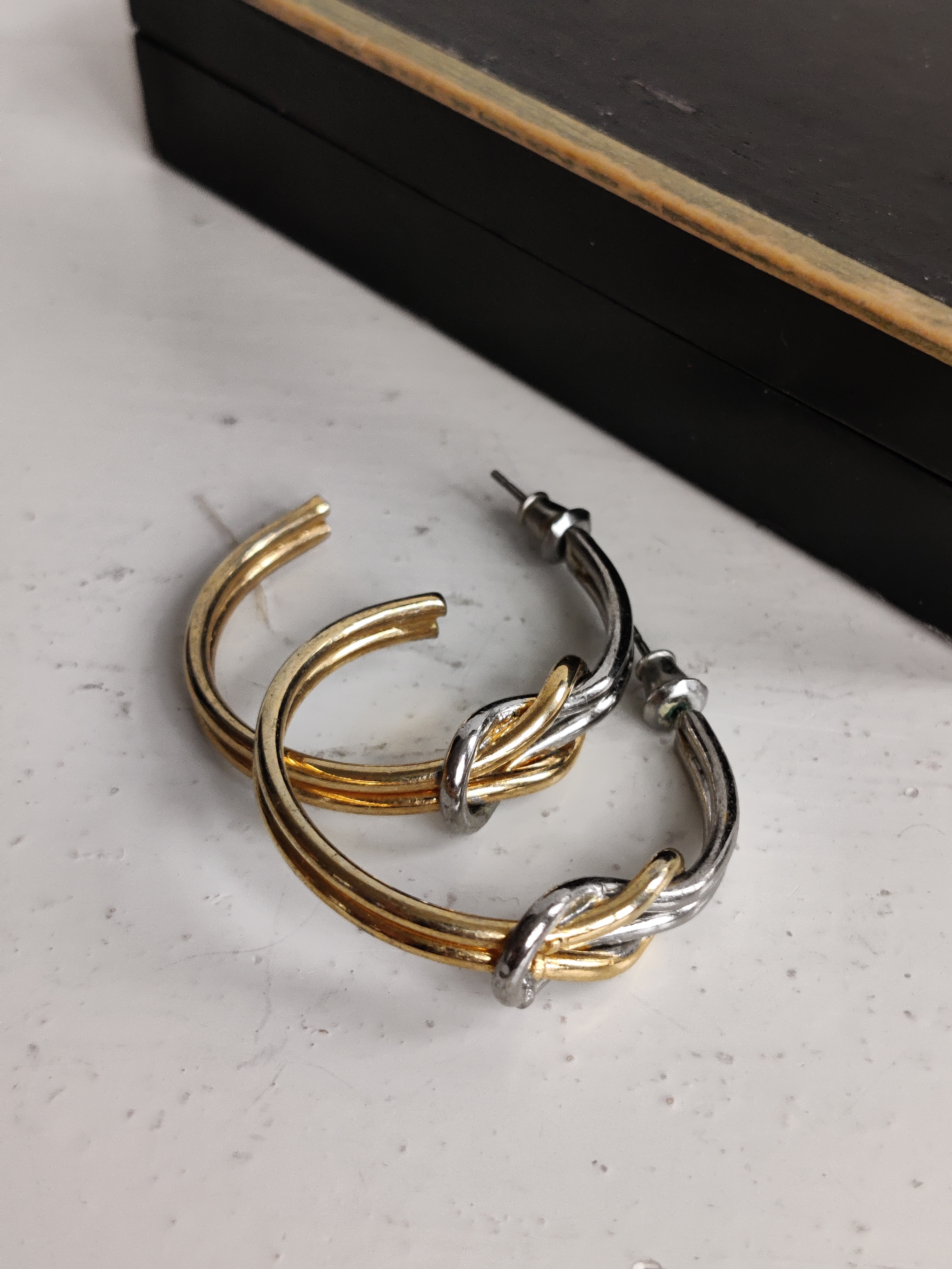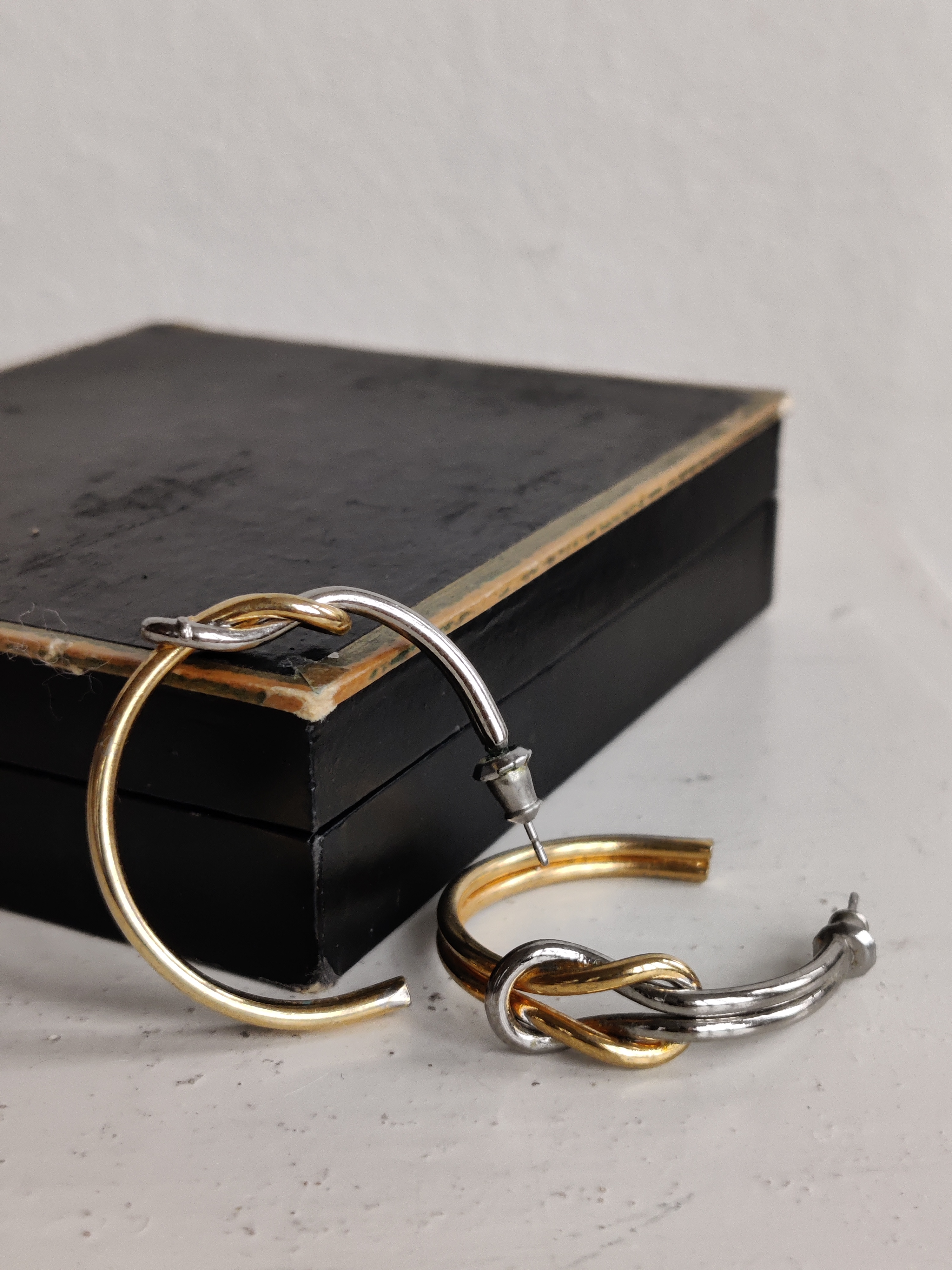 Fede åbne hoops med en knude, der forbinder guld- og sølv. De er fra 1980-1990'erne og måler ca 4 x 4 cm.