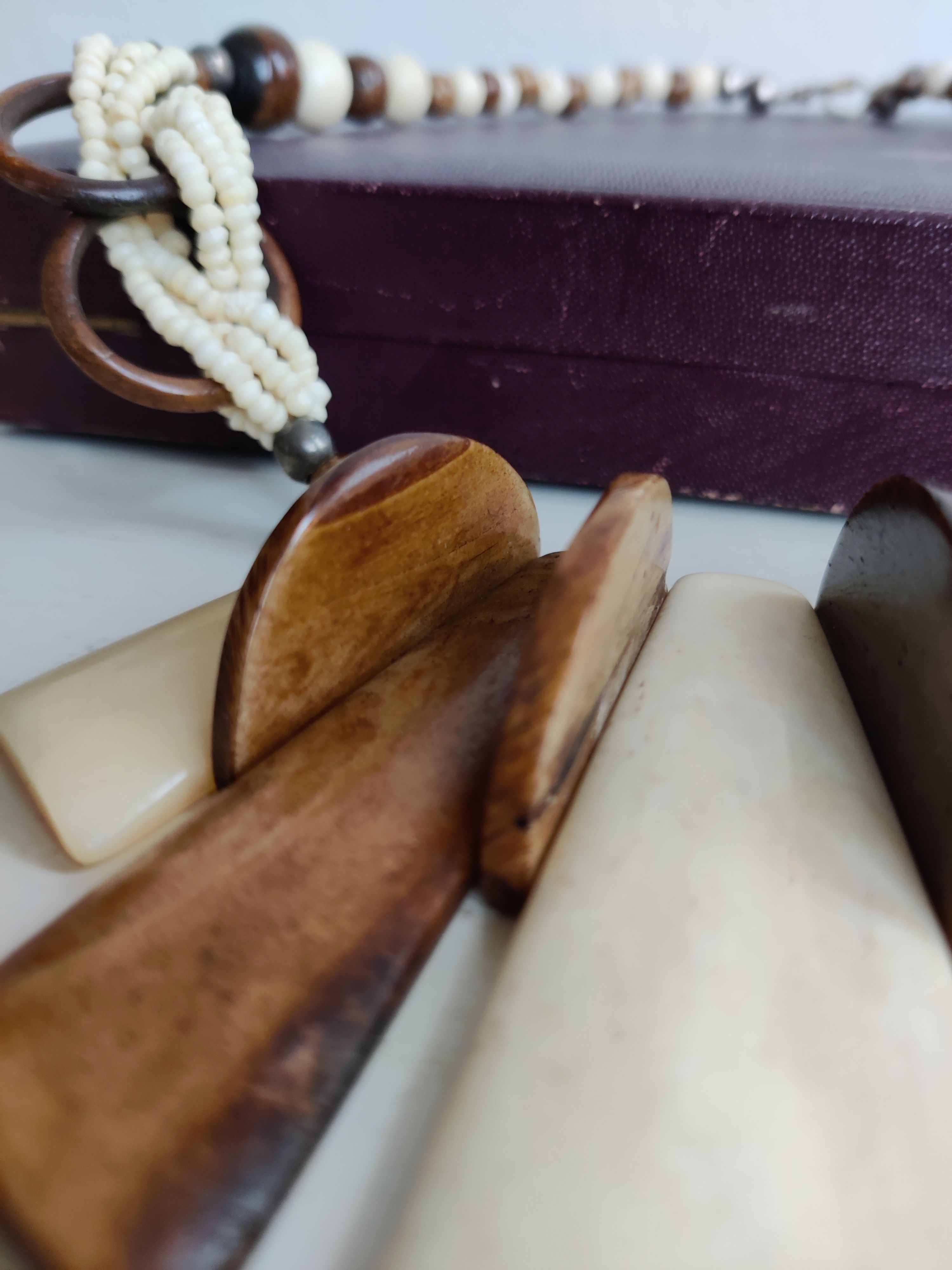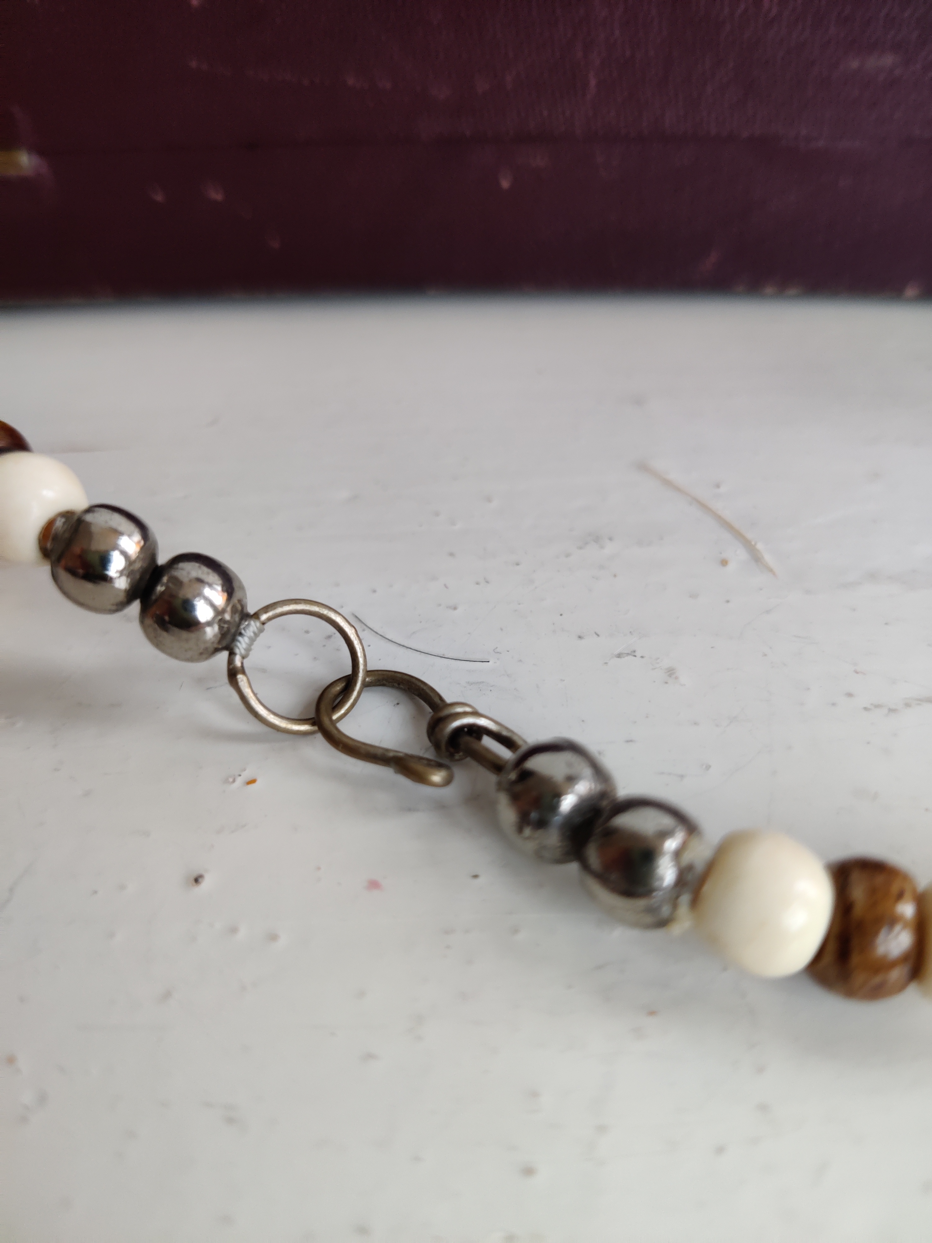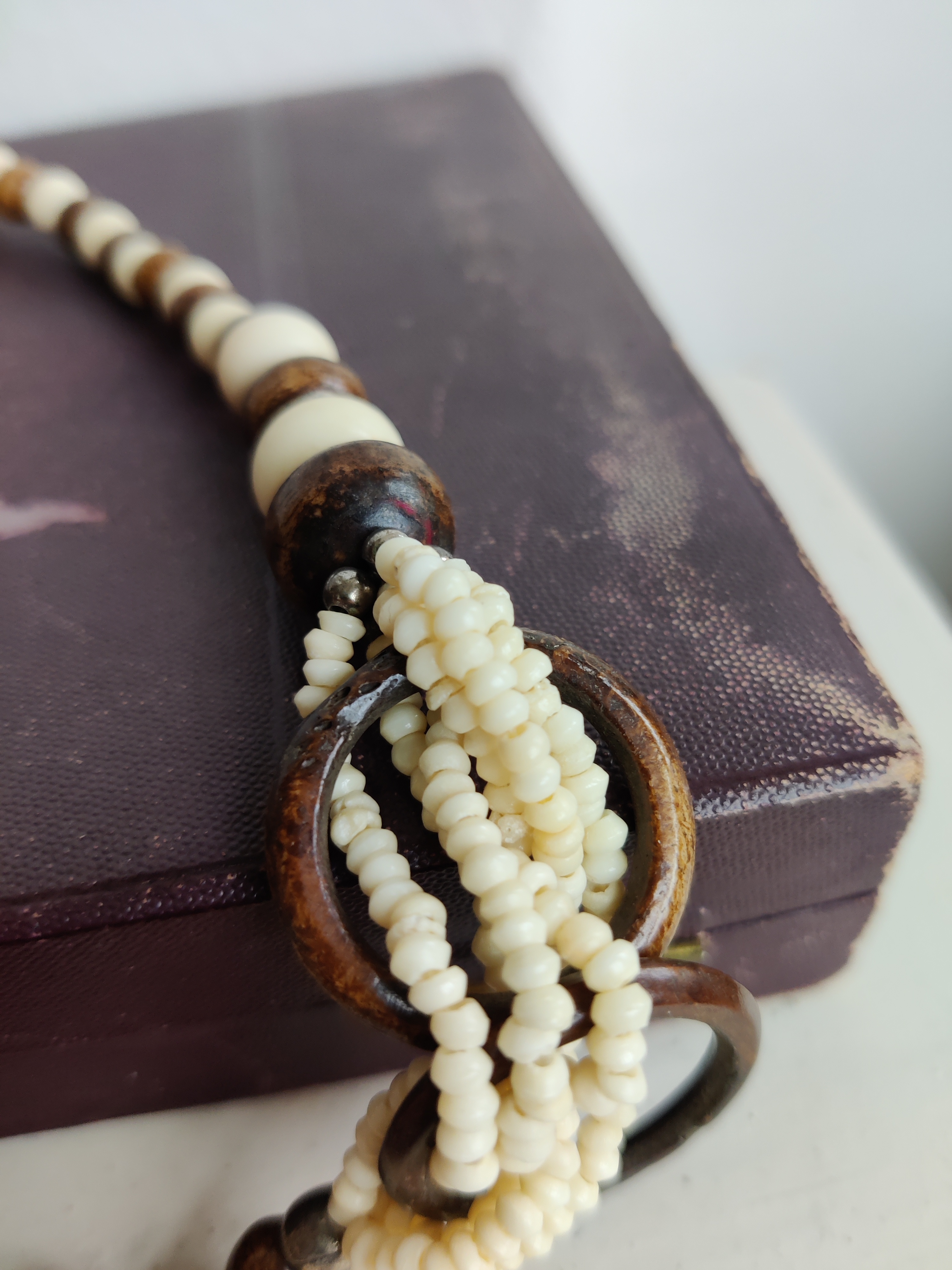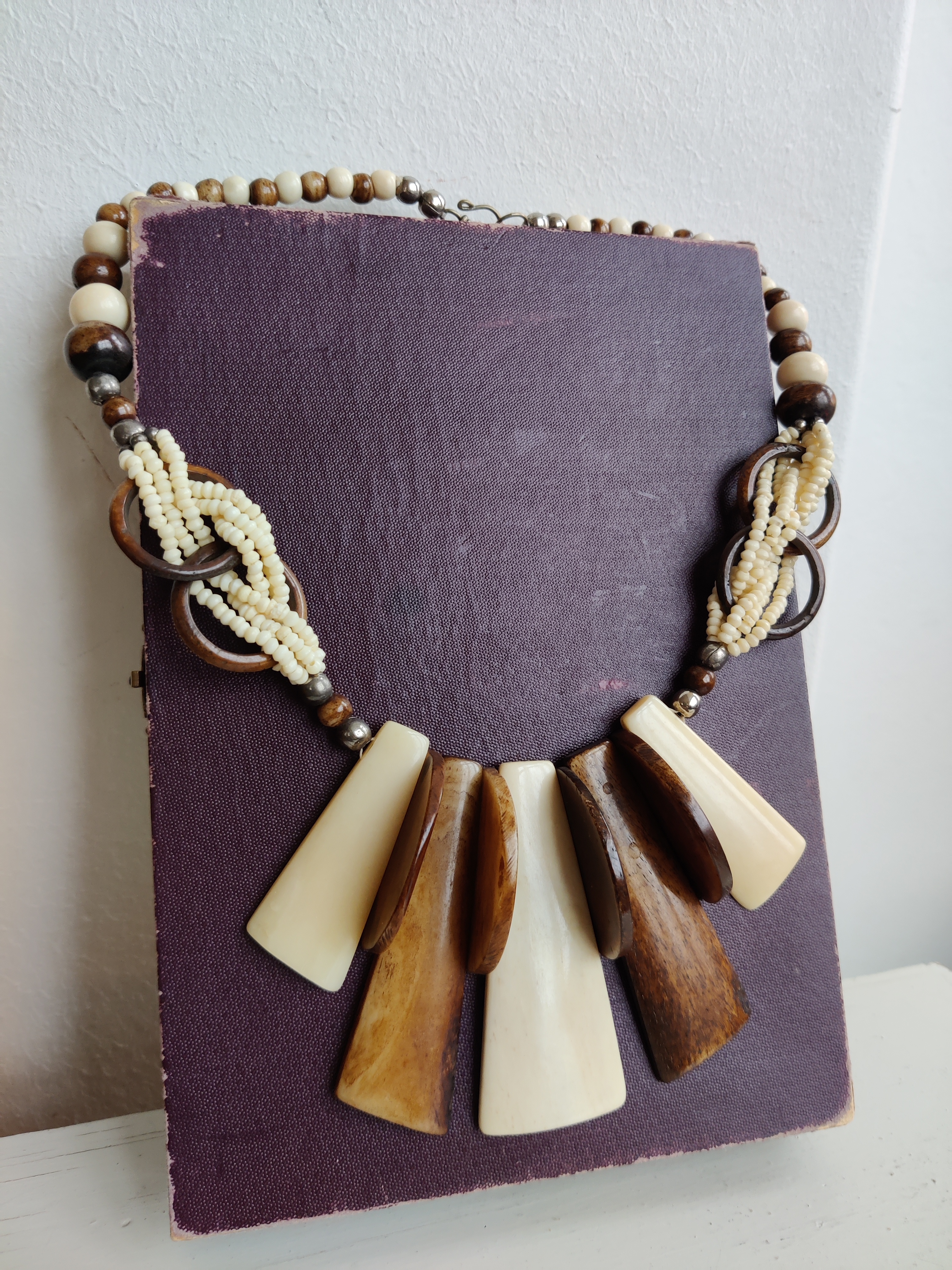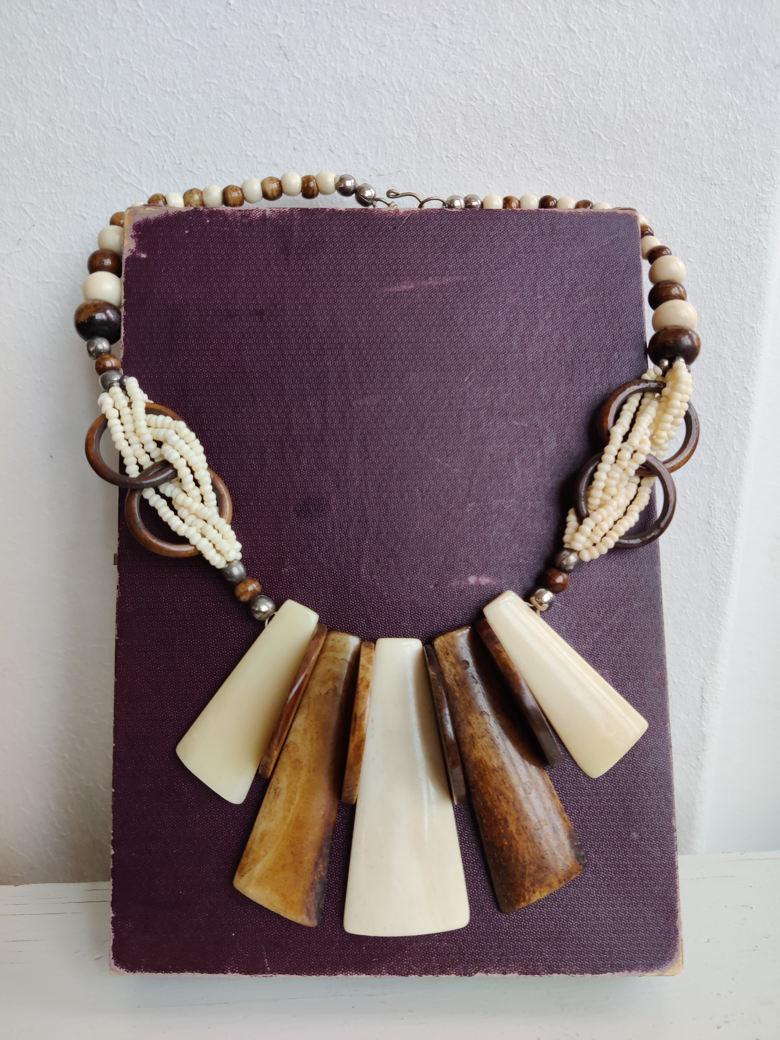 Flot congolesisk halssmykke på 45 cm med polerede stykker af ben/horn og perler i forløb.