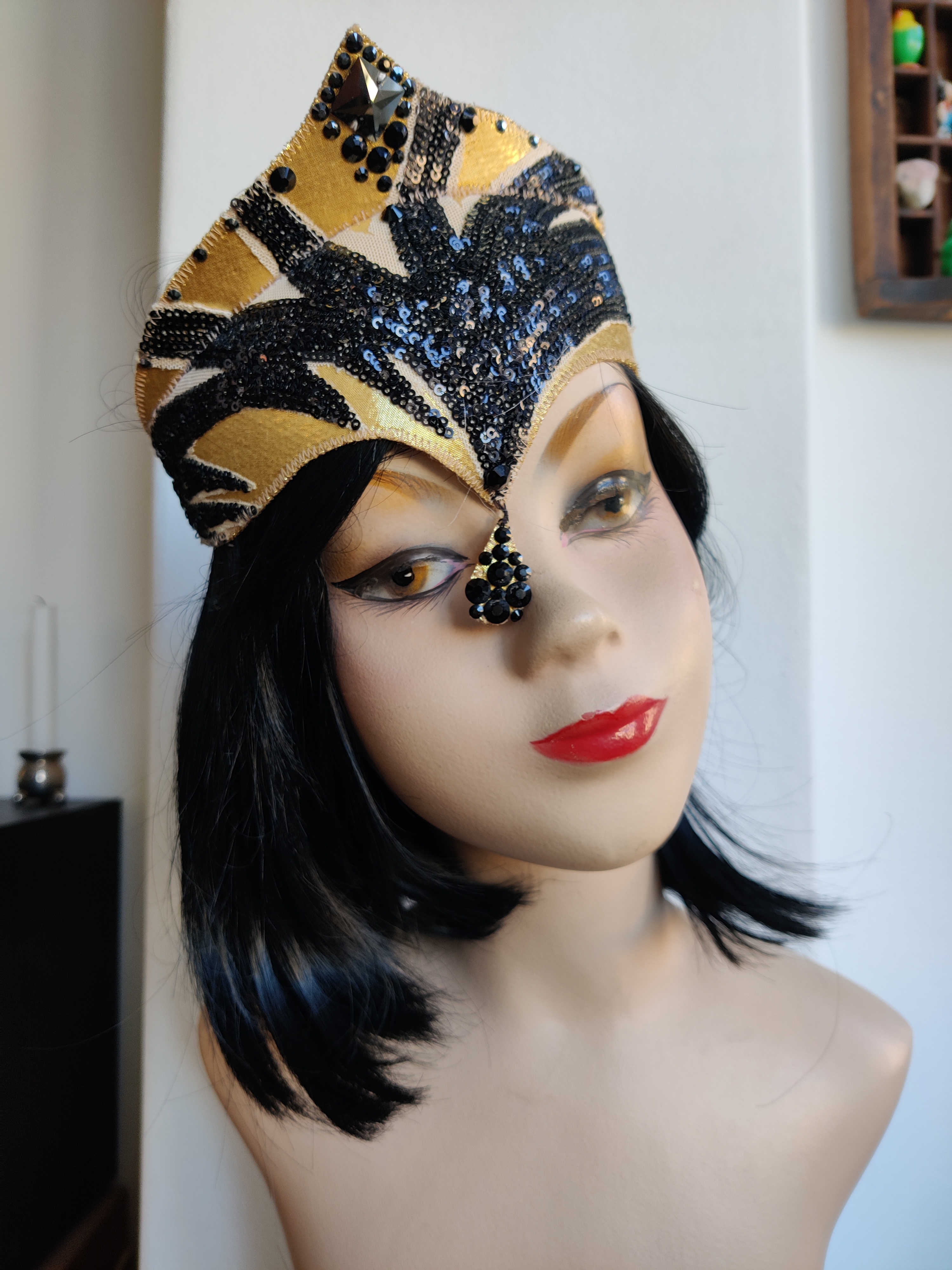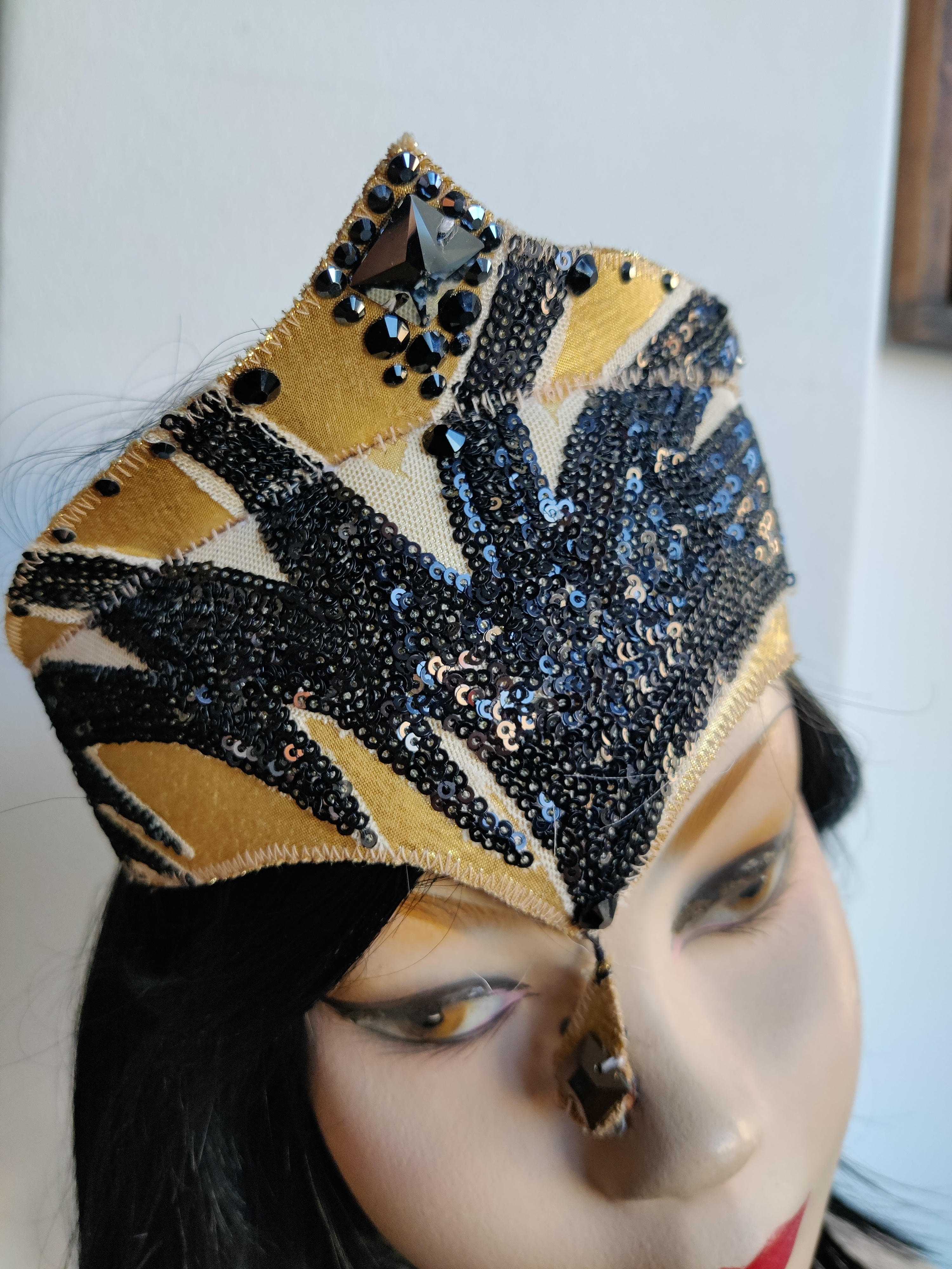 Fabelagigt kostume pandebånd af guld/sort pailetter. Fra Østre Gasværks kostumeafdeling. Hvilken forestilling den stammer fra, vides desværre ikke. Elastikbånd i nakken.
