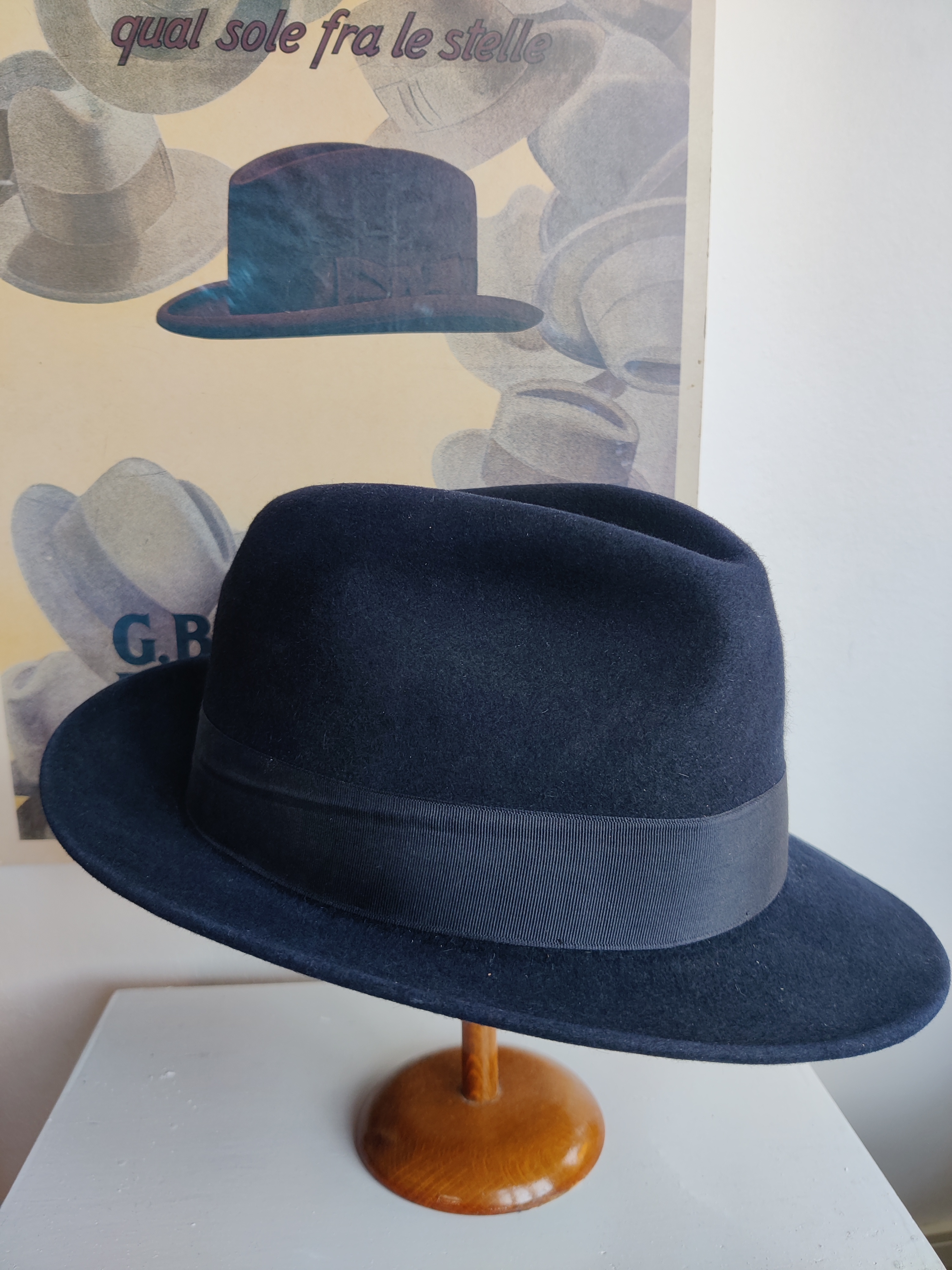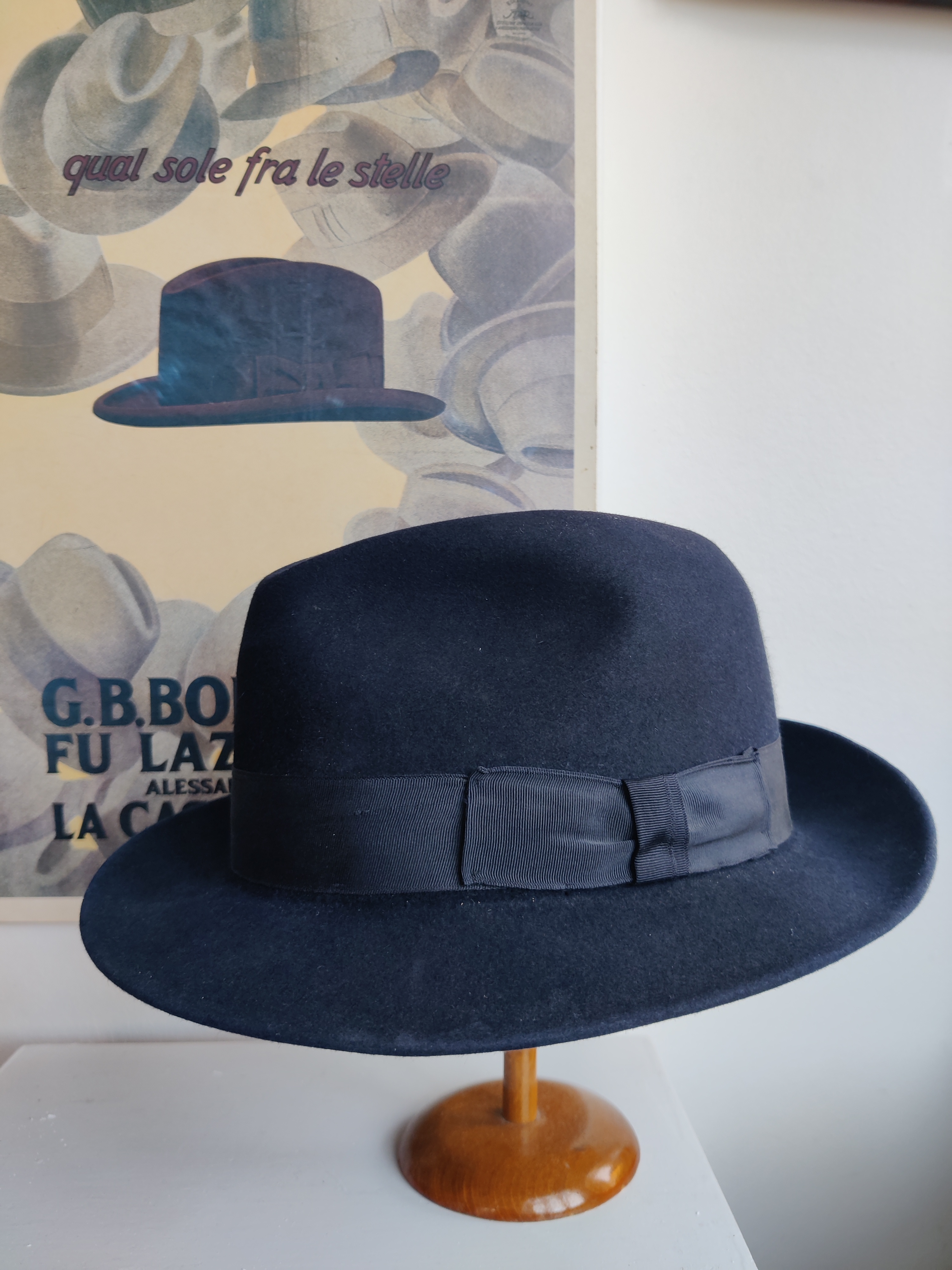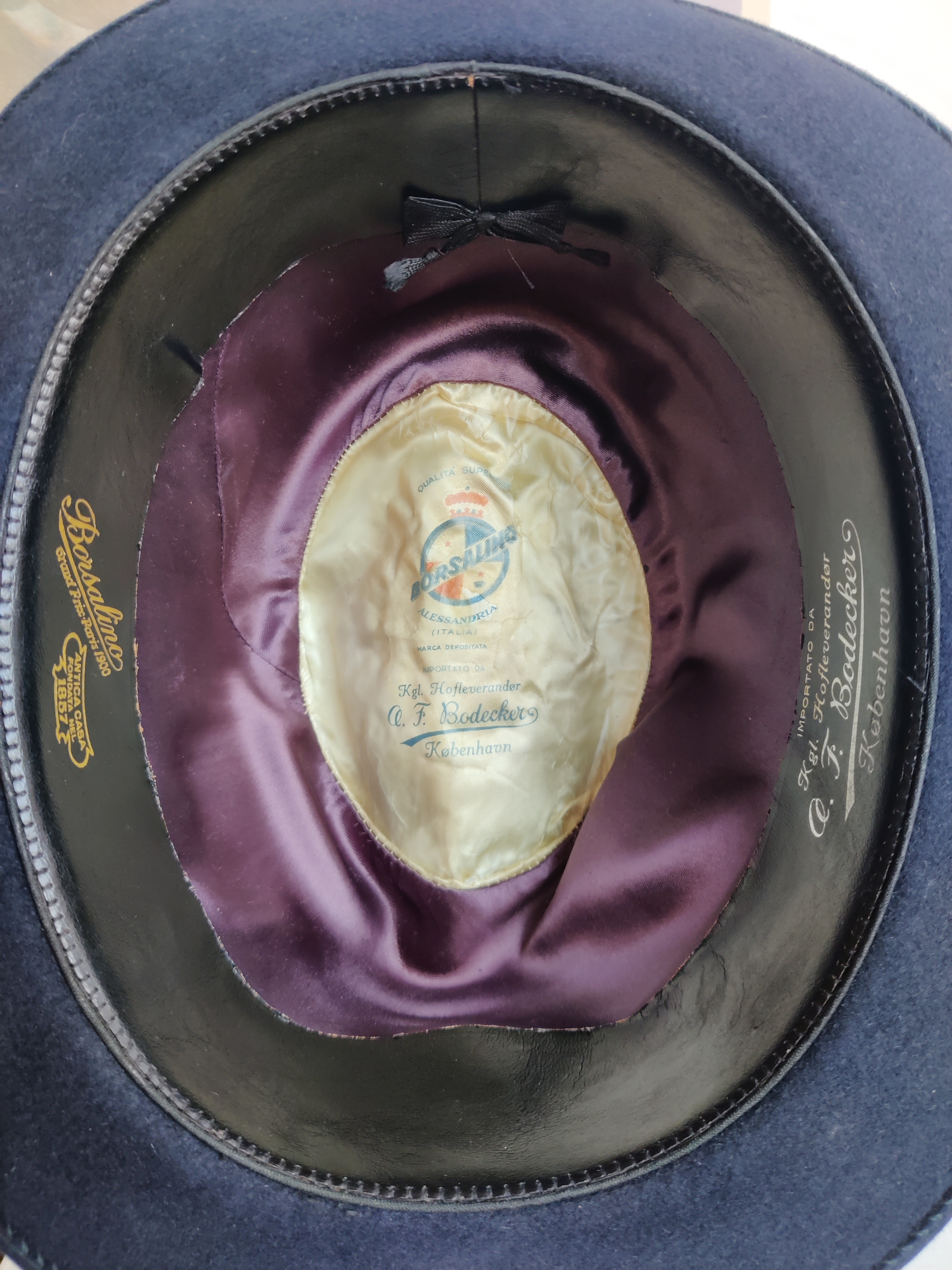 Flot vintage Borsalino fedora i mørkeblåt filt, den er sandsynligvis fra mellem 1940-1950. Under læderet inden i hatten står størrelse 6 1/2 - målt med målebånd er den 57 cm indeni. Importeret af og solgt hos det navnkundige hattefirma Bodecker i København, som lukkede i 1960'erne.