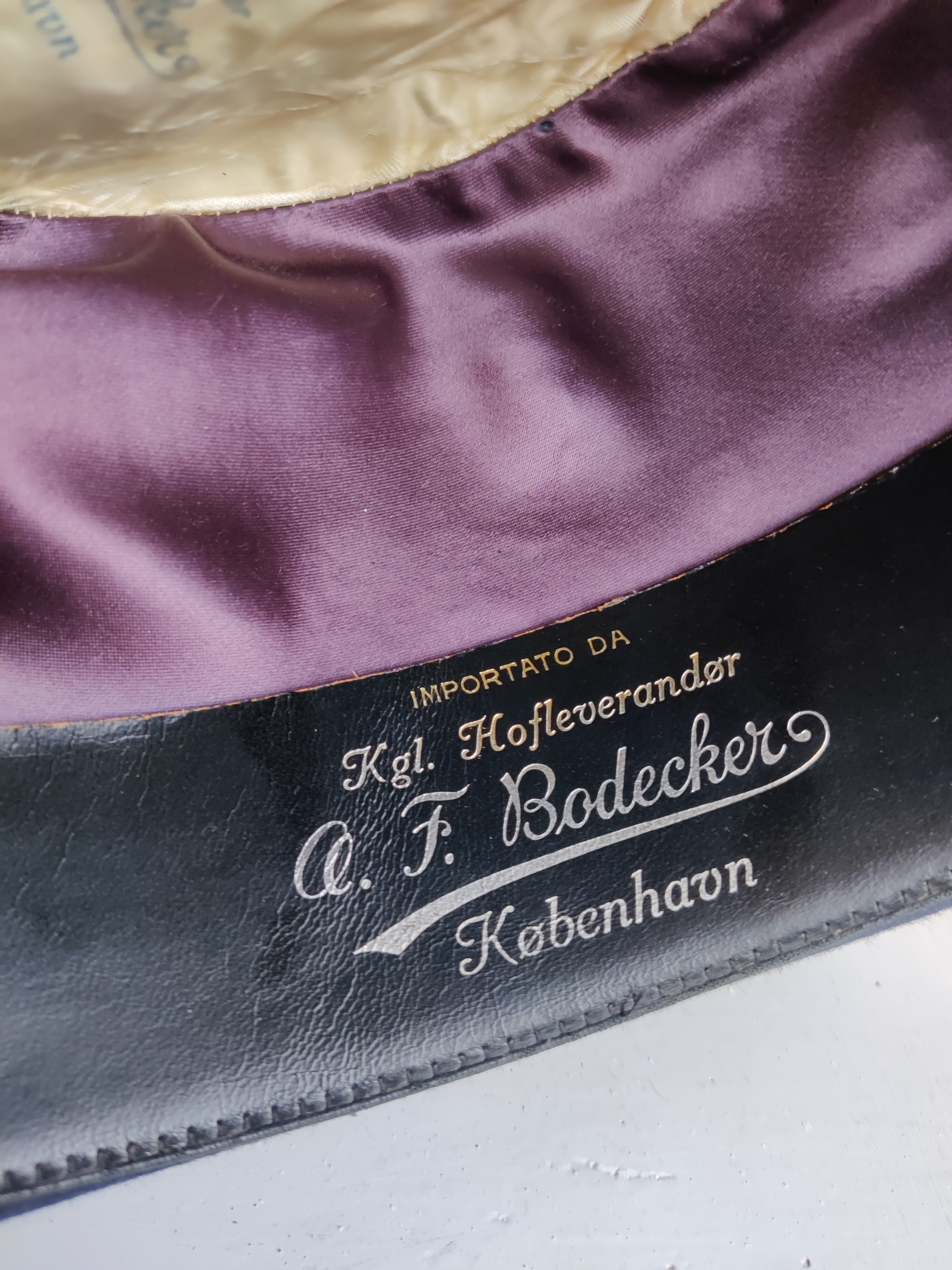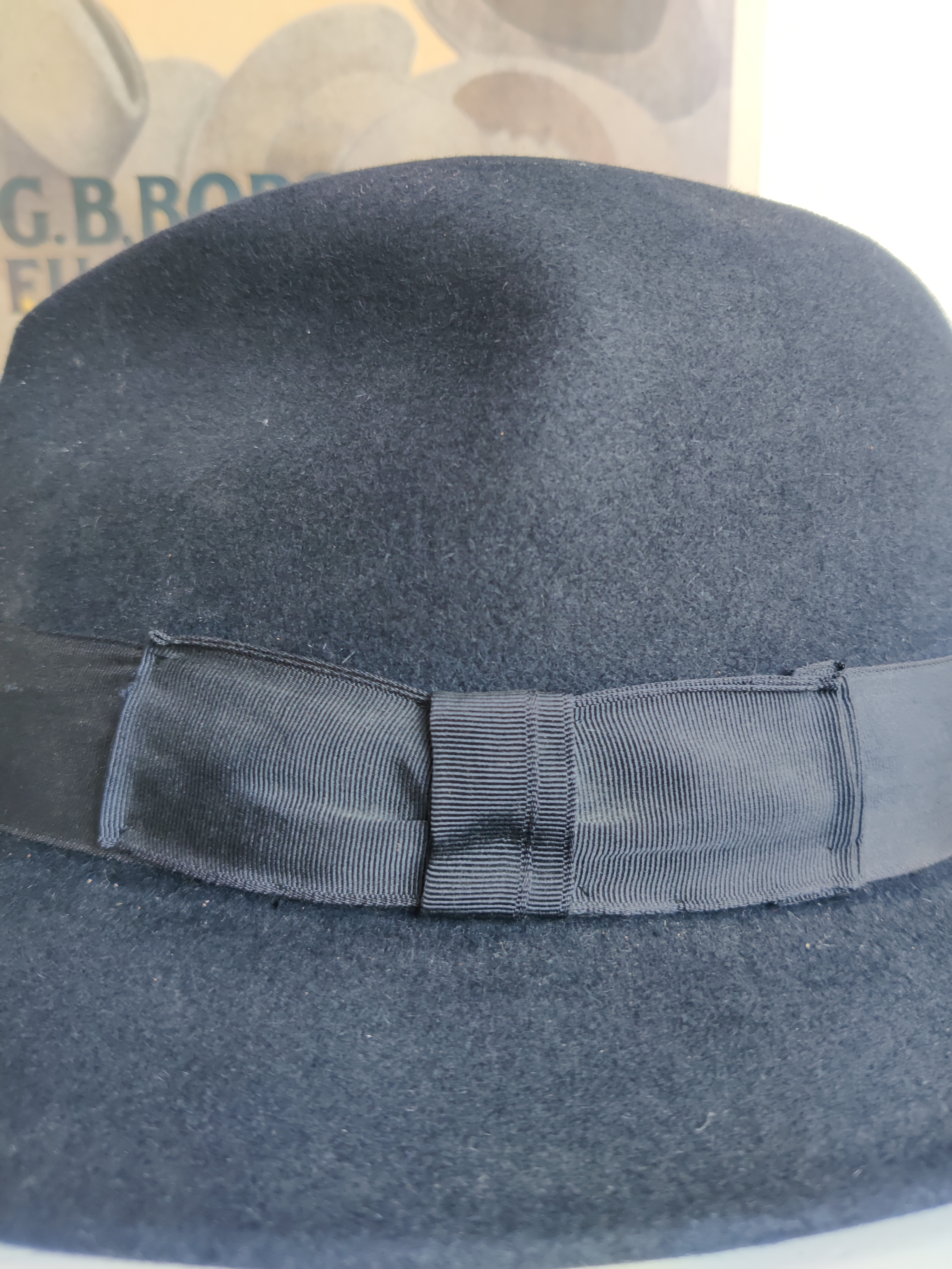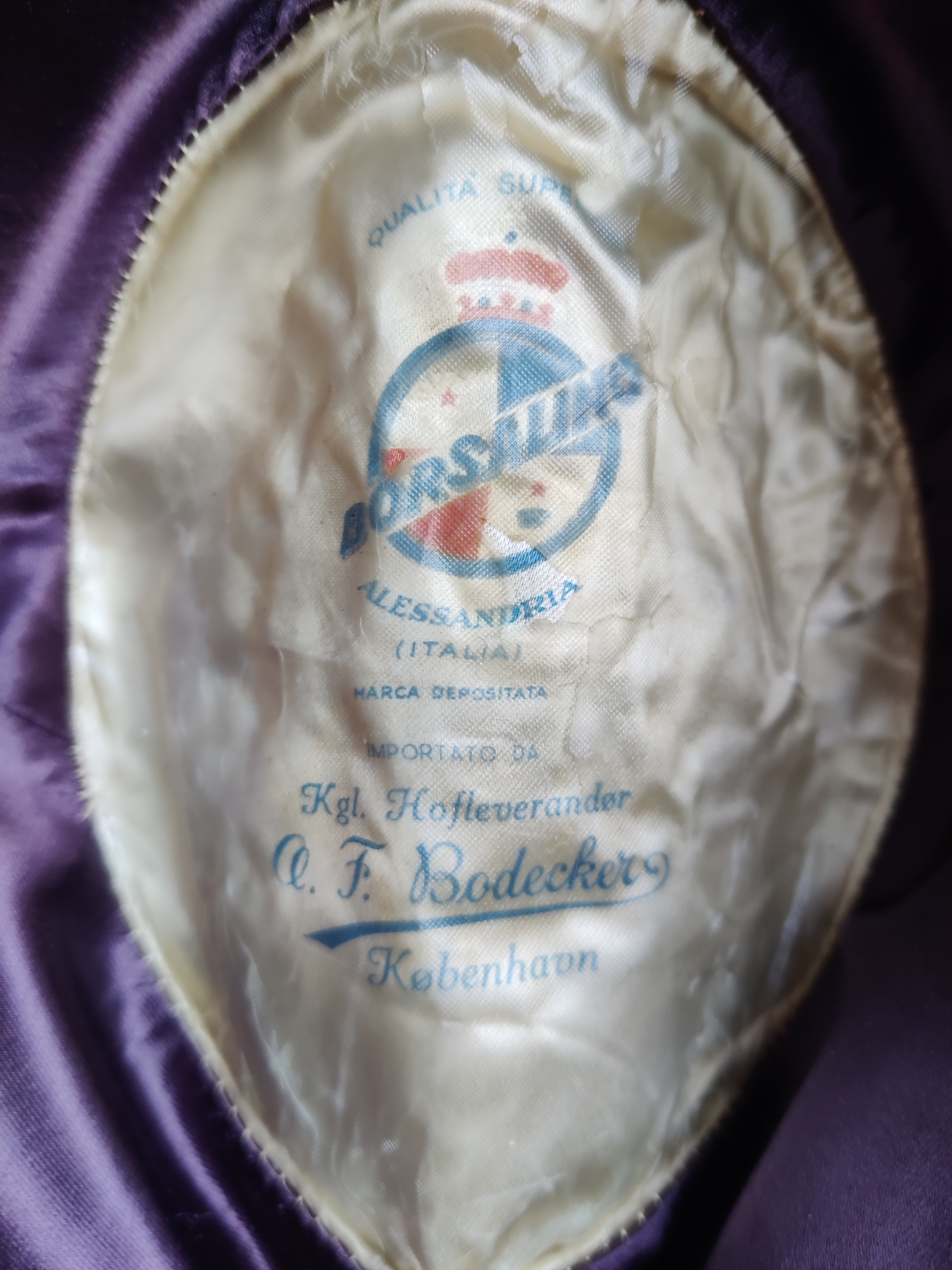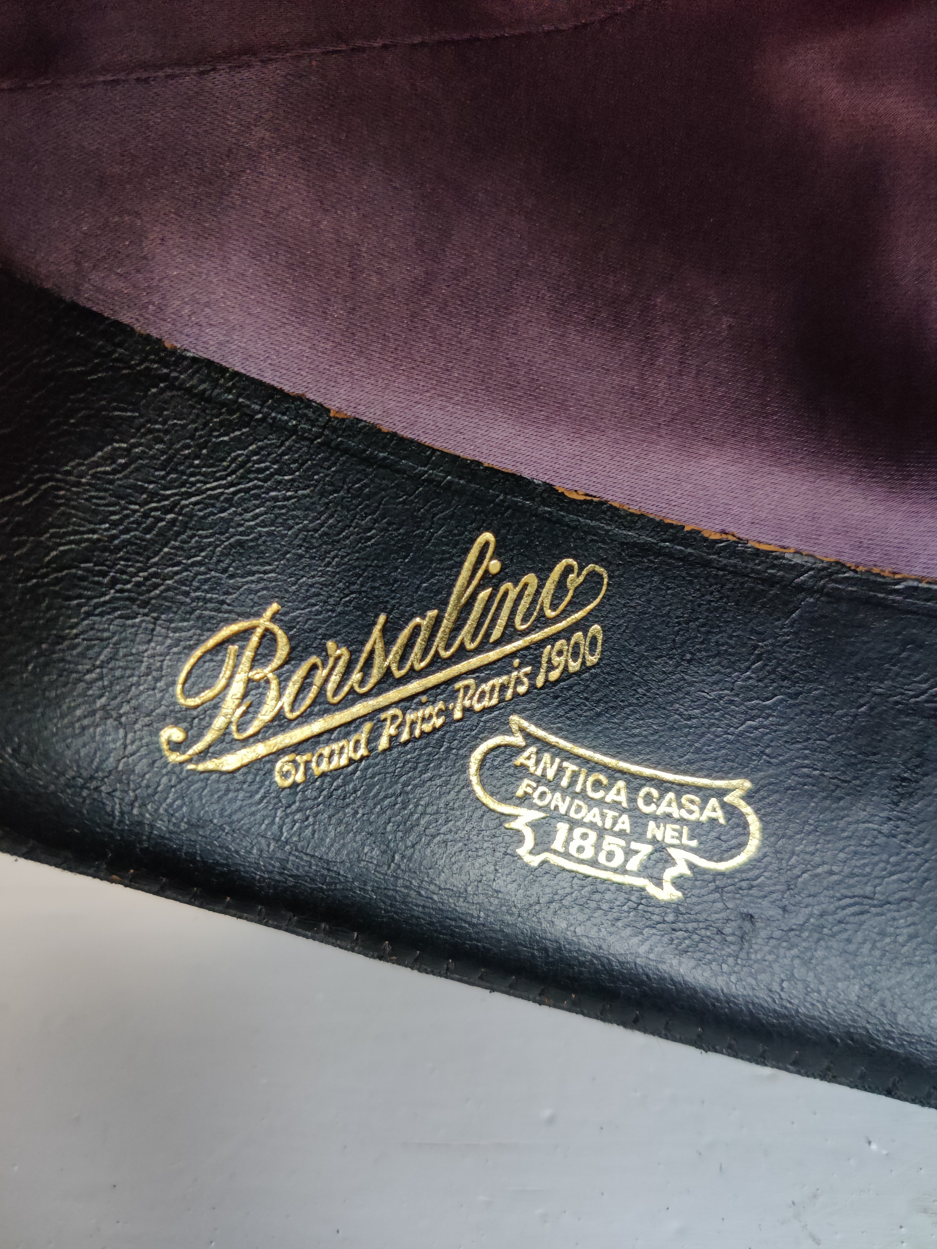 Flot vintage Borsalino fedora i mørkeblåt filt, den er sandsynligvis fra mellem 1940-1950. Under læderet inden i hatten står størrelse 6 1/2 - målt med målebånd er den 57 cm indeni. Importeret af og solgt hos det navnkundige hattefirma Bodecker i København, som lukkede i 1960'erne.