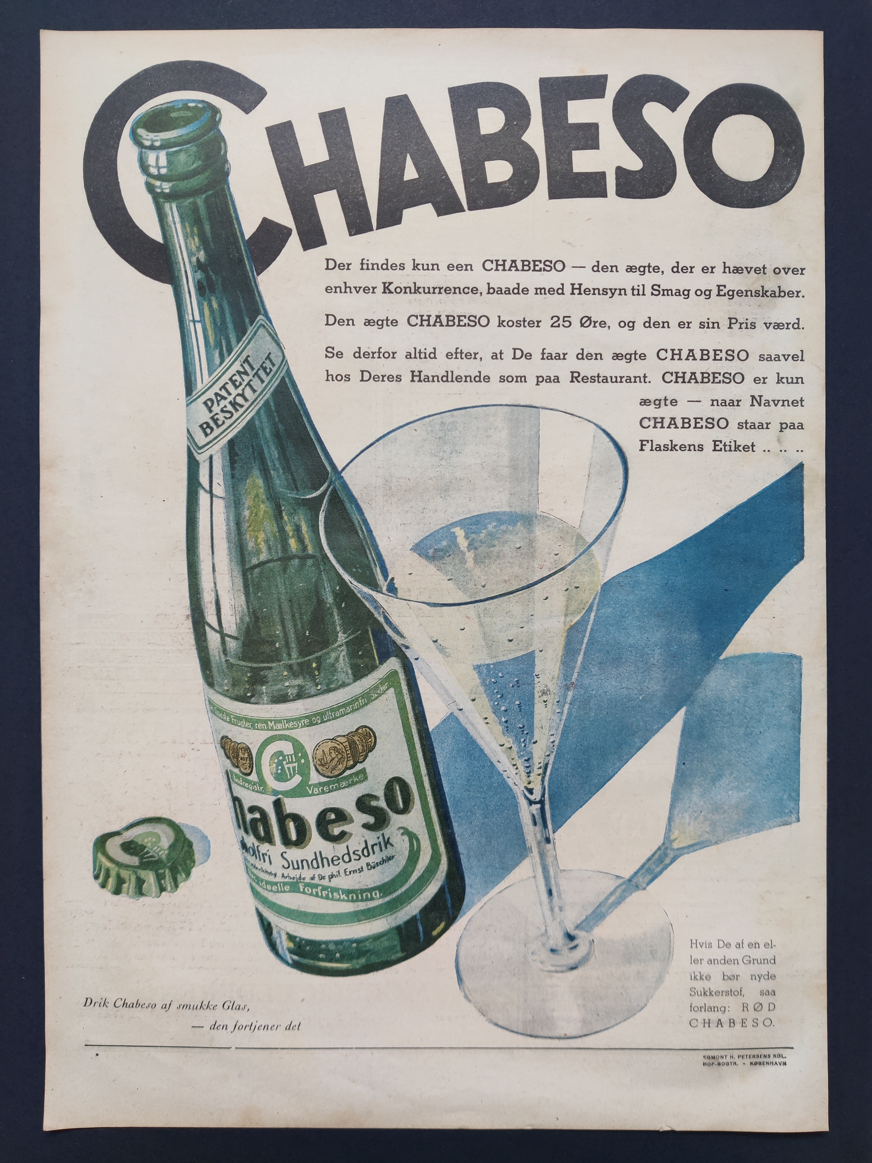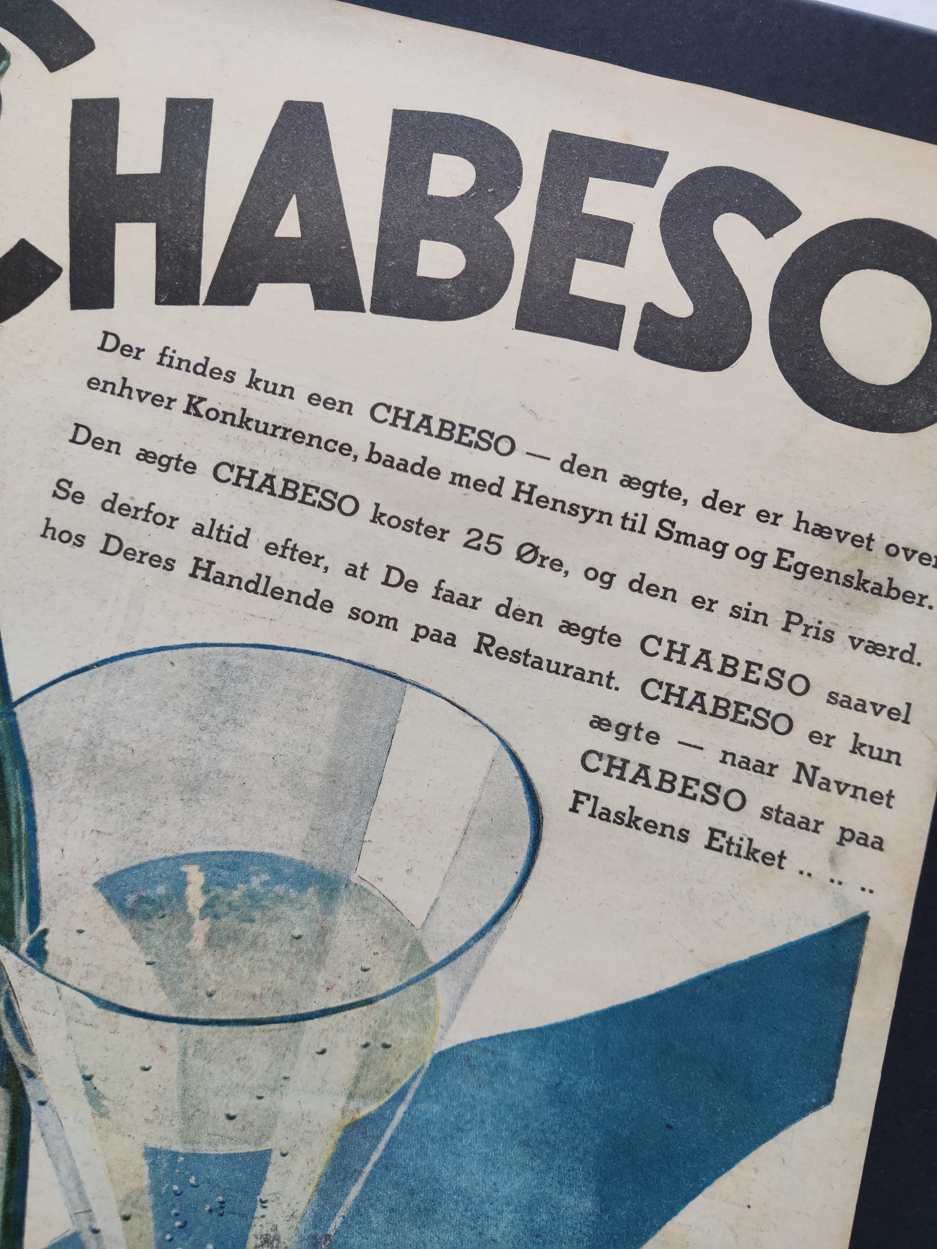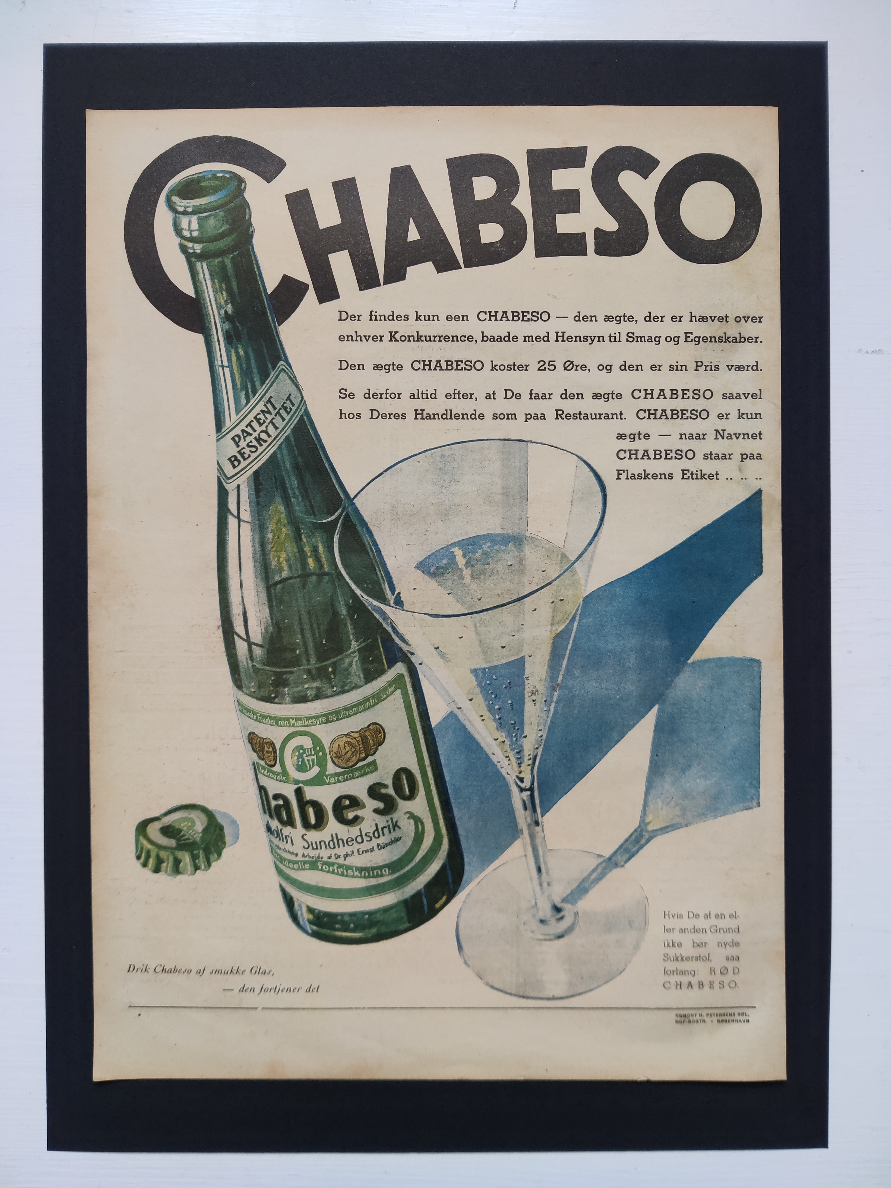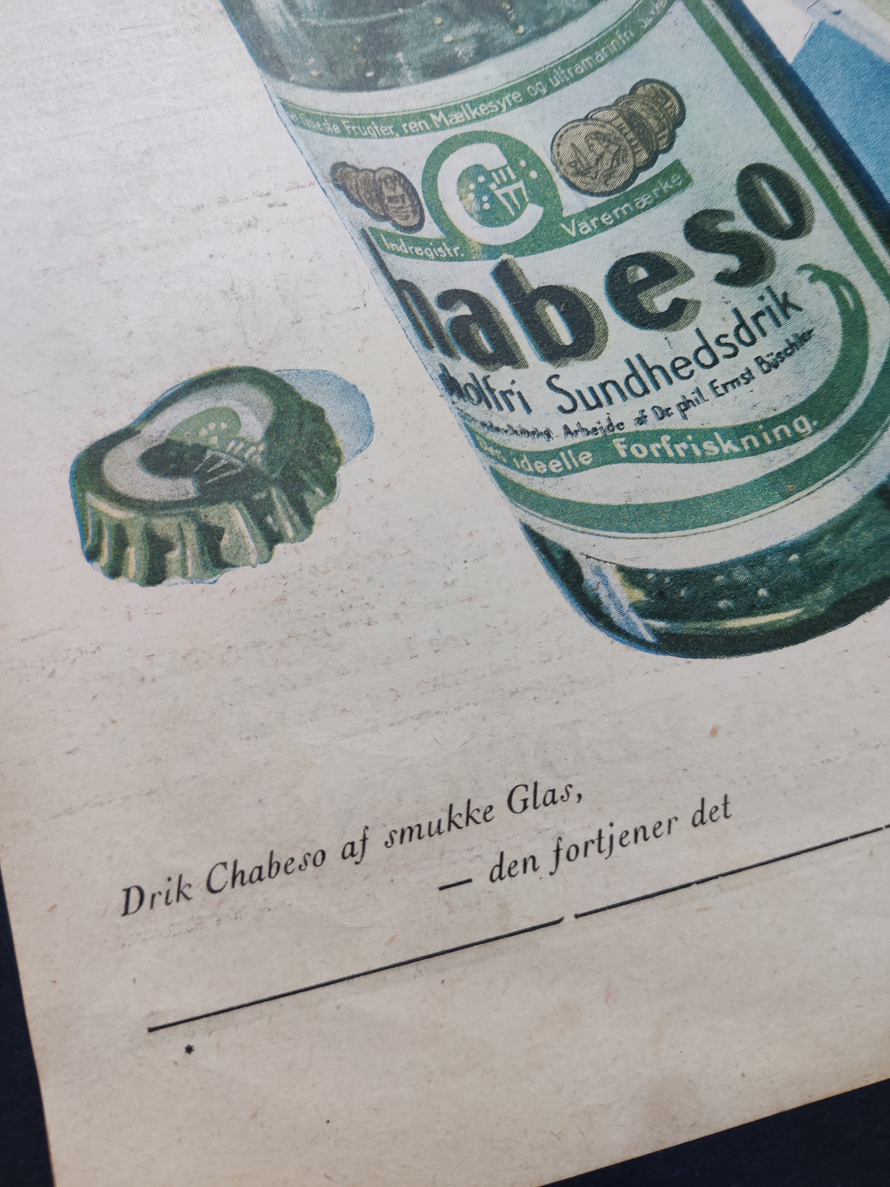 Virkelig flot gammel reklame for Chabeso, som var en stangmoderne læskedrik for omkring 100 år siden. Hvis du synes, det lyder bekendt, så er det nok fordi, du ligesom mig elsker Matador - eller Badehotellet. Ugebladet Hjemmet, 1934. Opklæbet på tykt sort karton i A3-format.