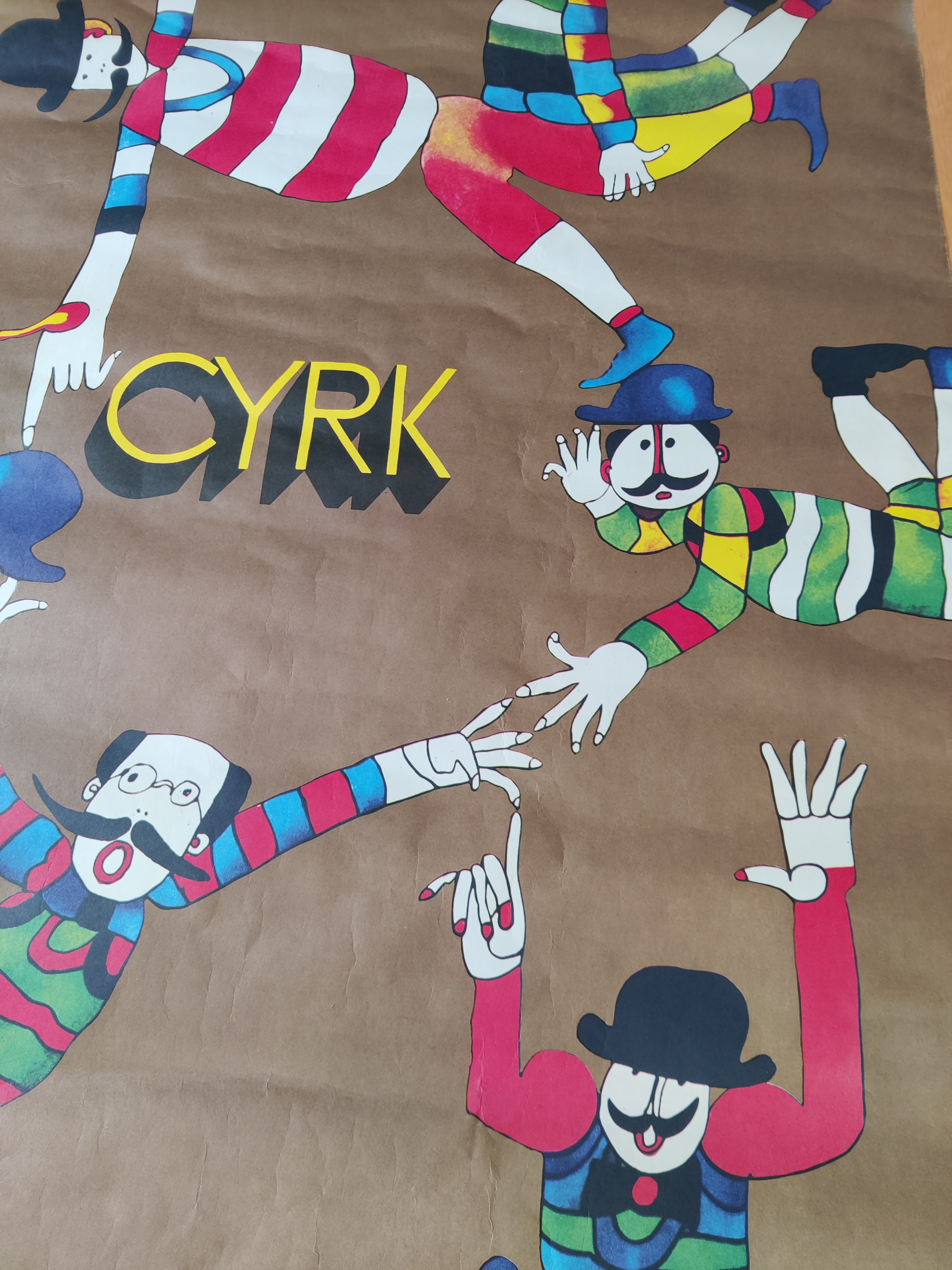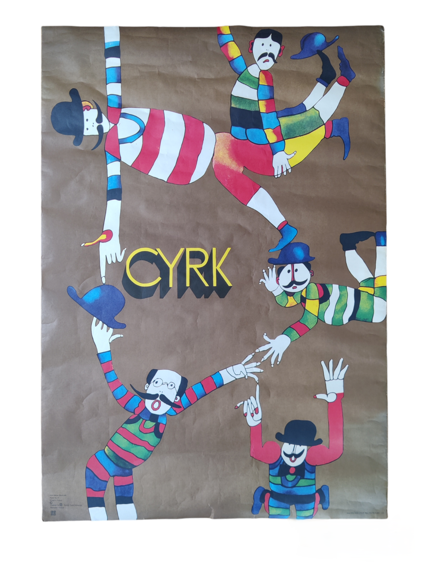 Sjælden polsk vintage cirkusplakat fra 1979 med klovne el. akrobater på guldfarvet baggrund. Et rigtig flot samleobjekt for elskere af europæisk plakatkunst og cirkus, tegnet af Marian Stachurski (1931-1980). God stand. Har lille riv + en reparation med tape nederst. Mål 96 x 67 cm.