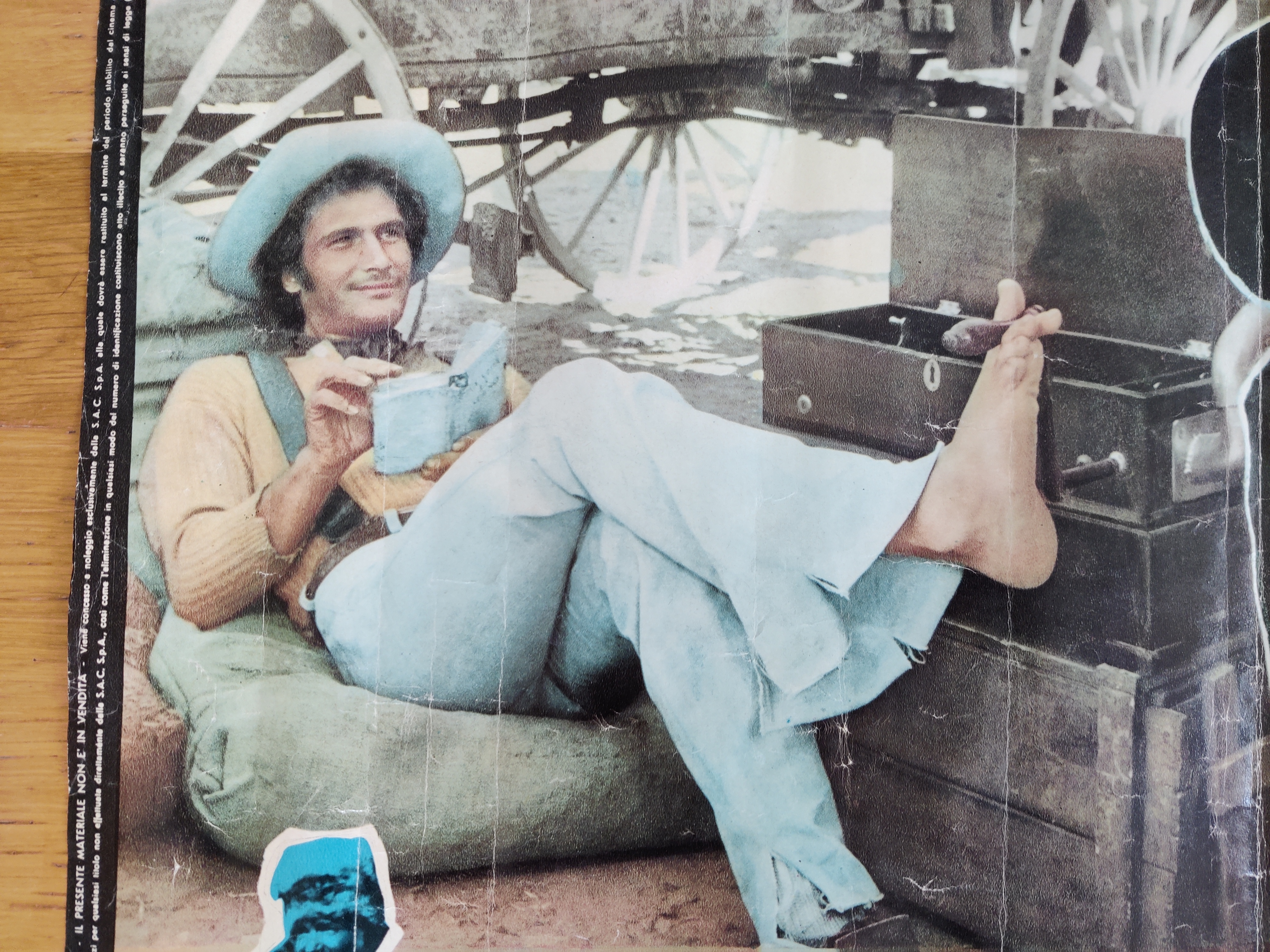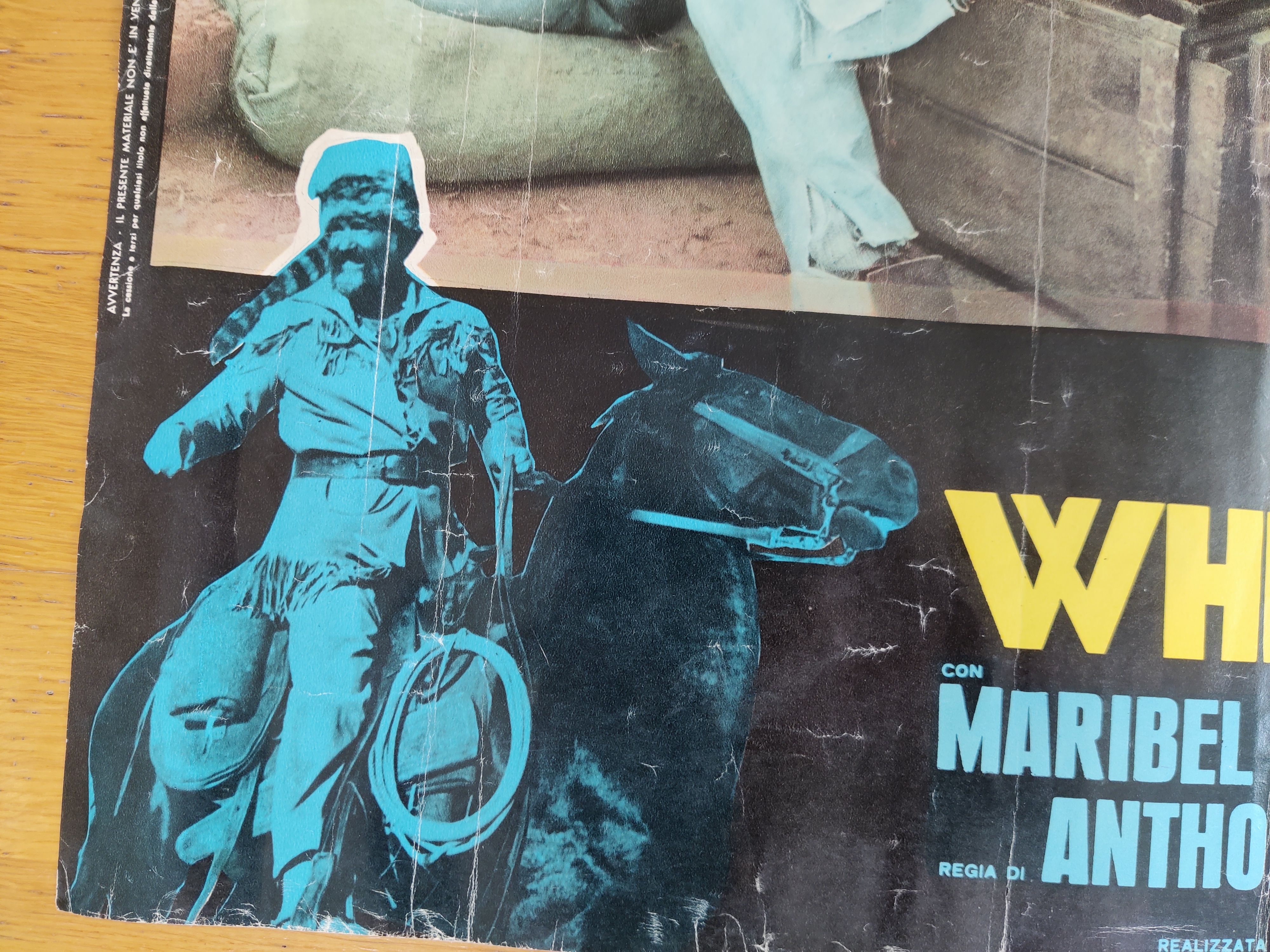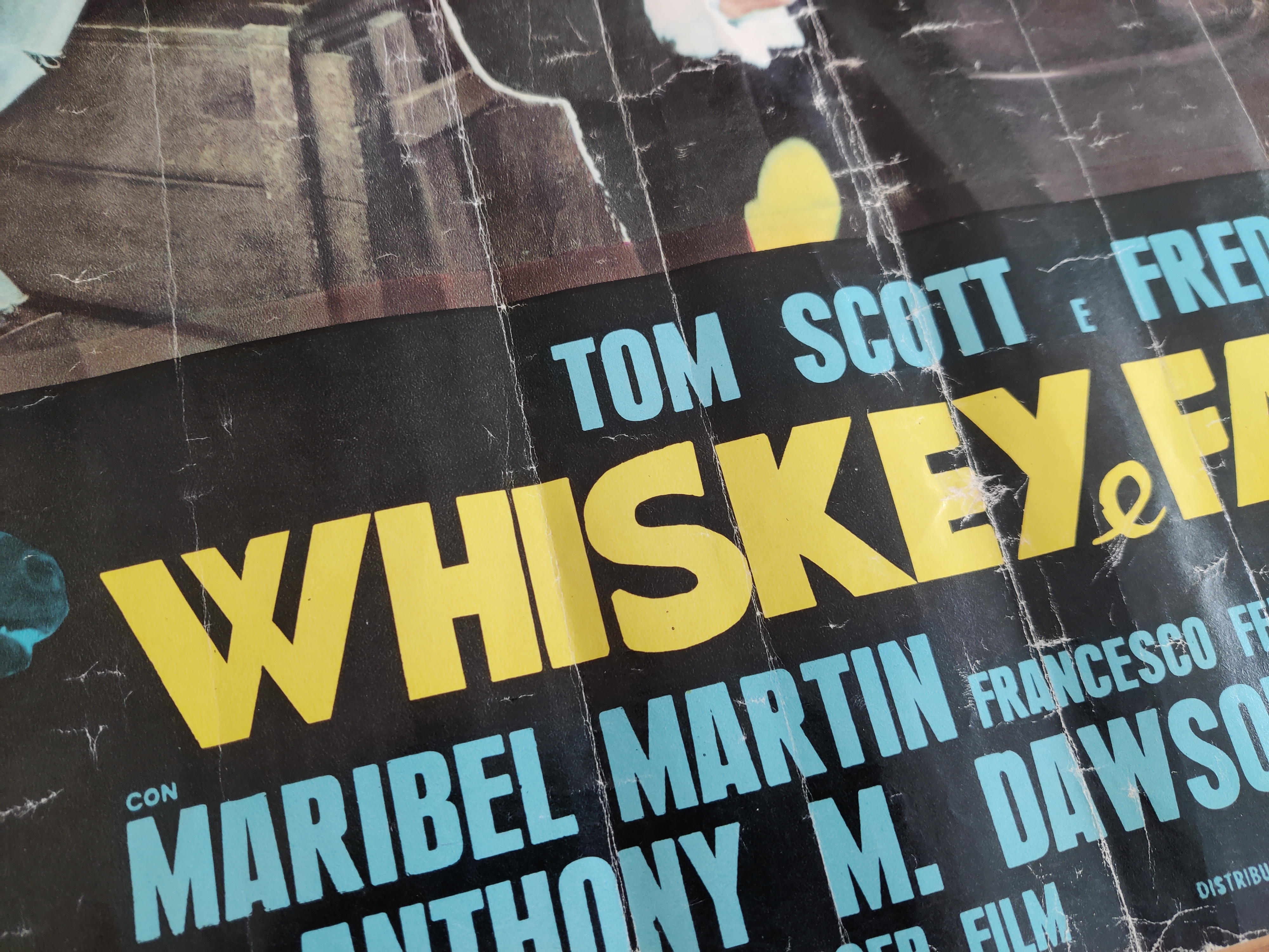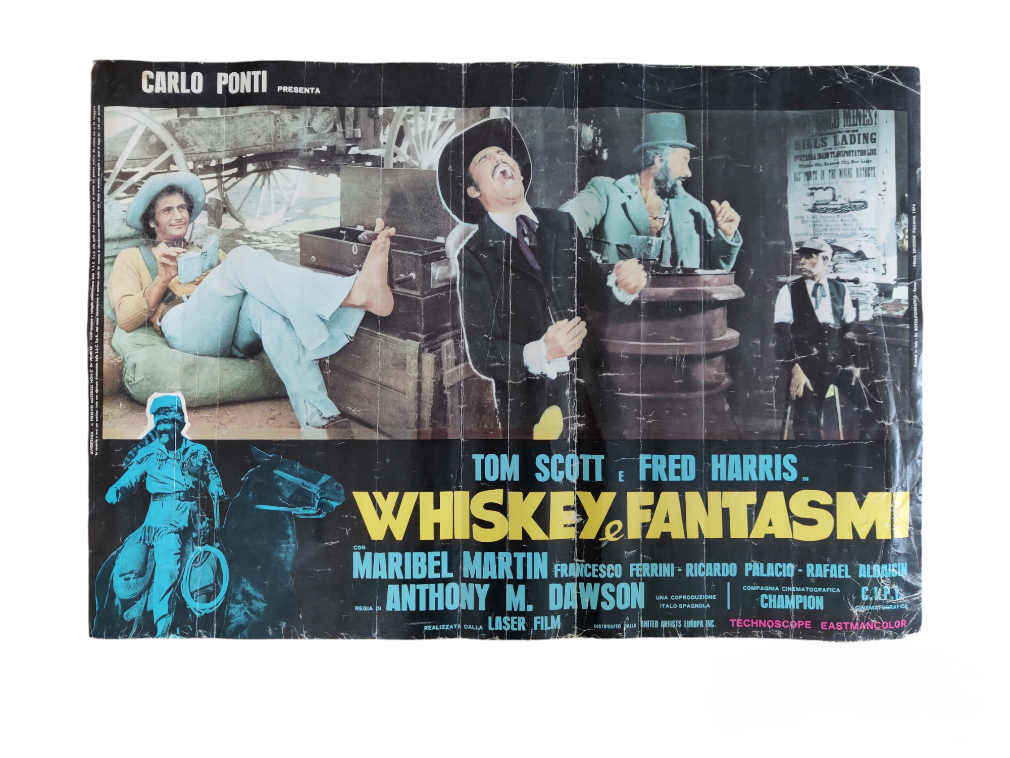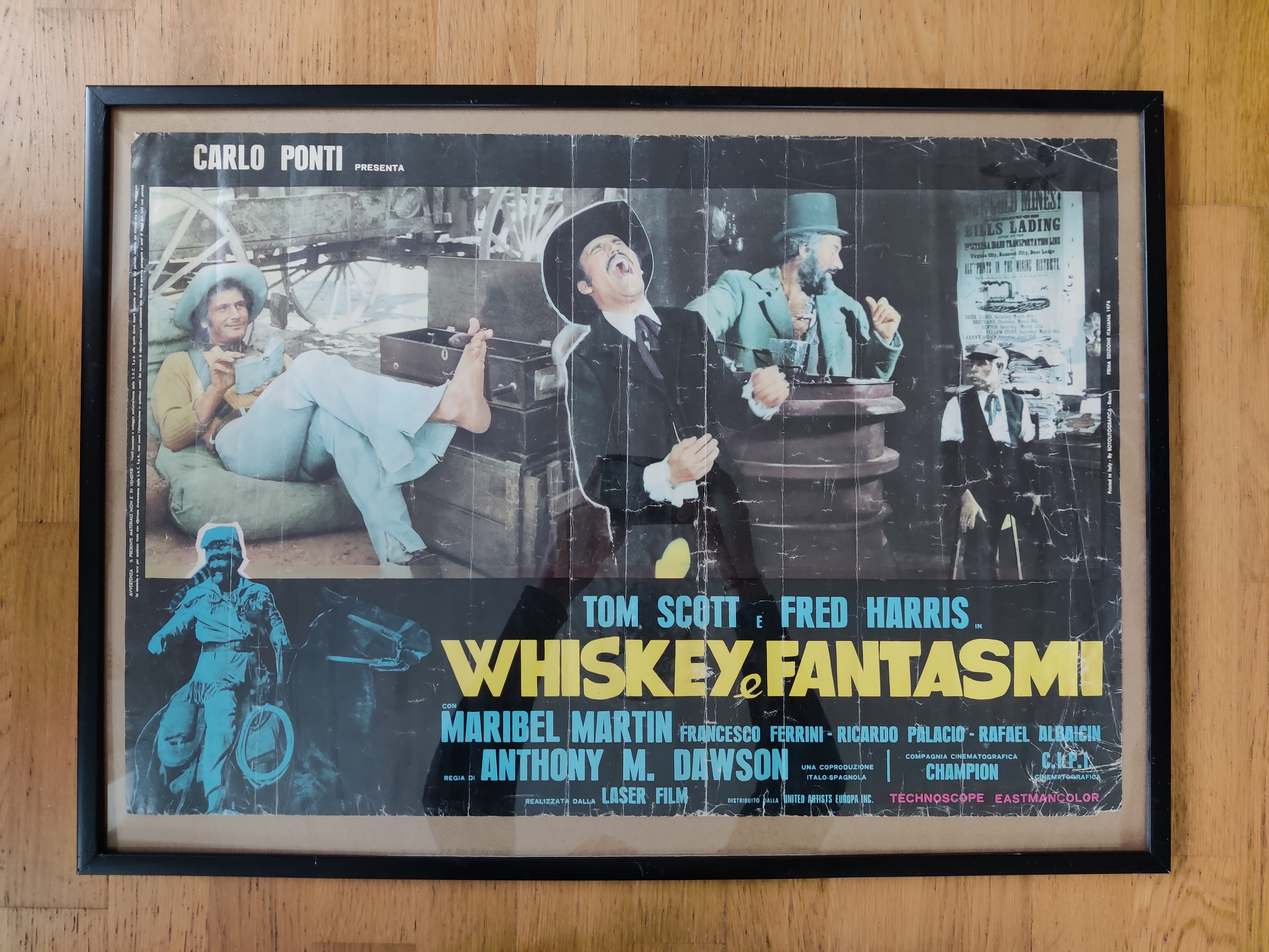 Topcharmerende, original italiensk filmplakat 1974 for verdens dårligste spaghettiwestern ifølge internettet - og det er alligevel lidt af en præstation. Whiskey e fantasmi betyder whiskey og spøgelser - og plottet er derefter: Vor helt får hjælp af tre ånder på sin flugt fra mexikanske banditter - heriblandt Davy Crocketts spøgelse. Tarantino-fans vil genkende instruktørens navn, Antonio Margariti, som optræder både i Inglorious Basterds og Once upon a time in Hollywood. Har patina og bor derfor i en billig ramme, som følger med. Mål 65 x 45 cm.