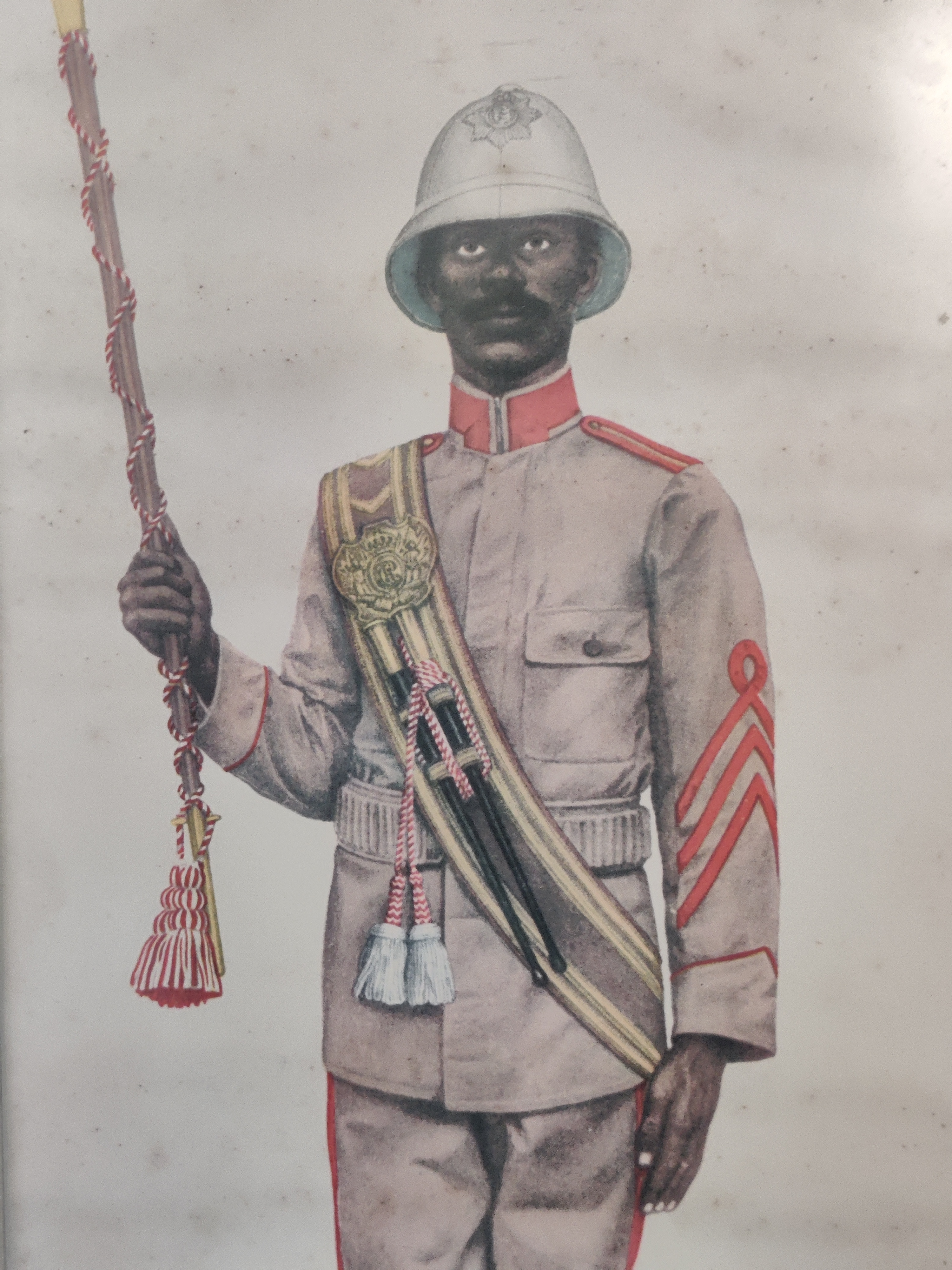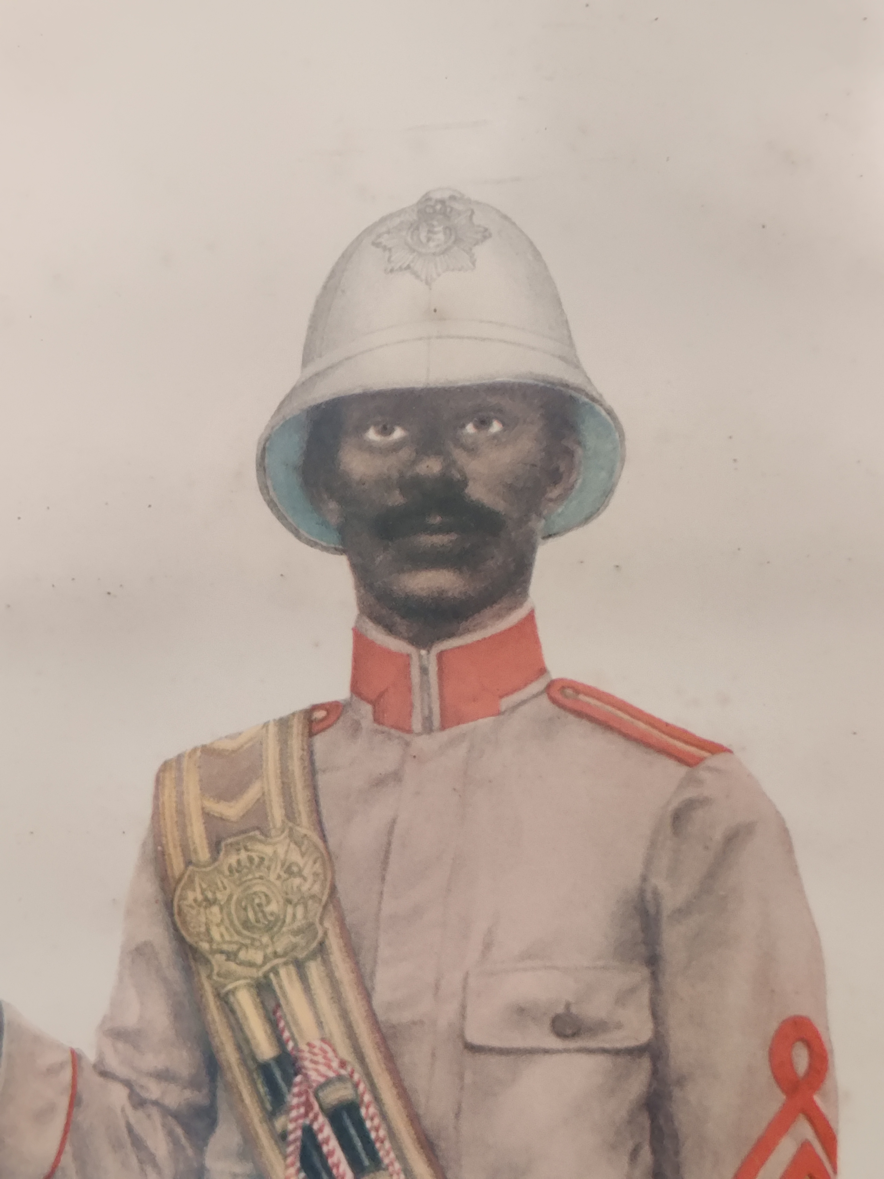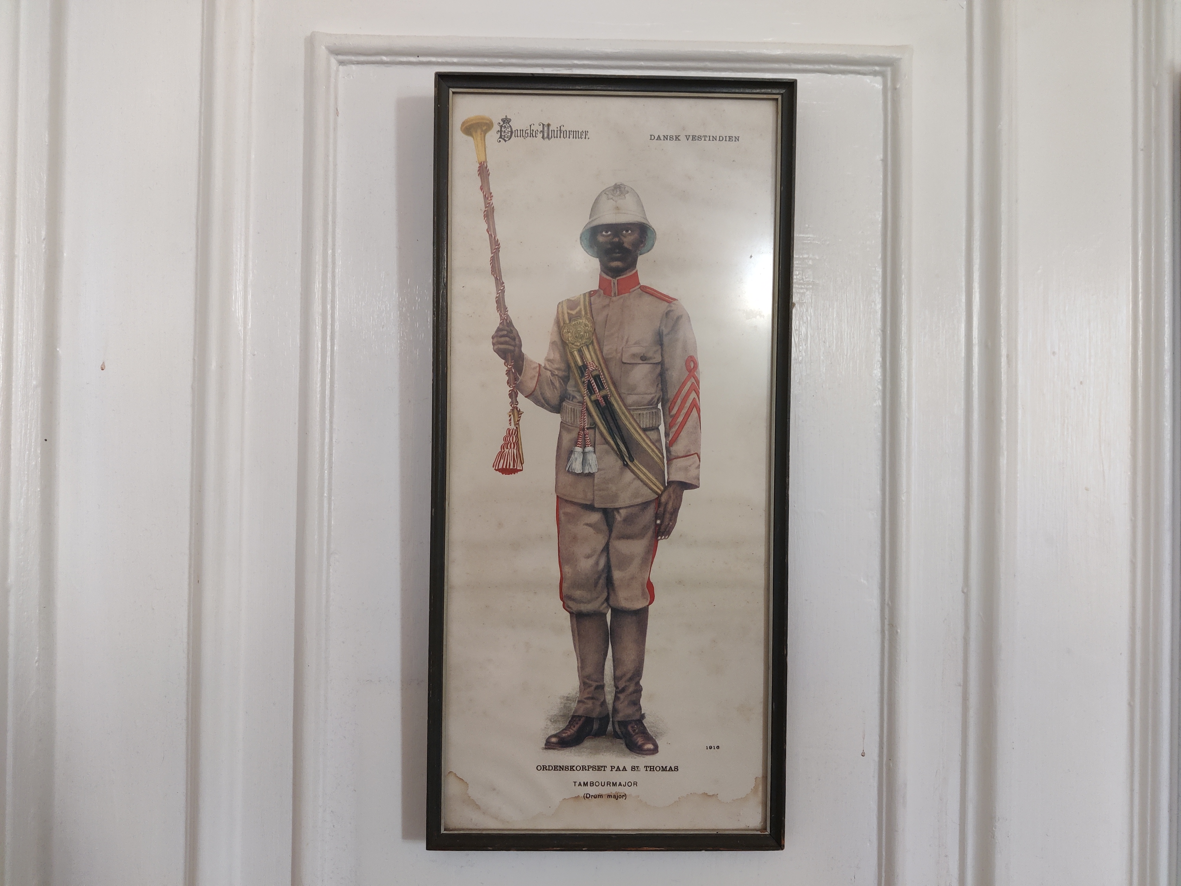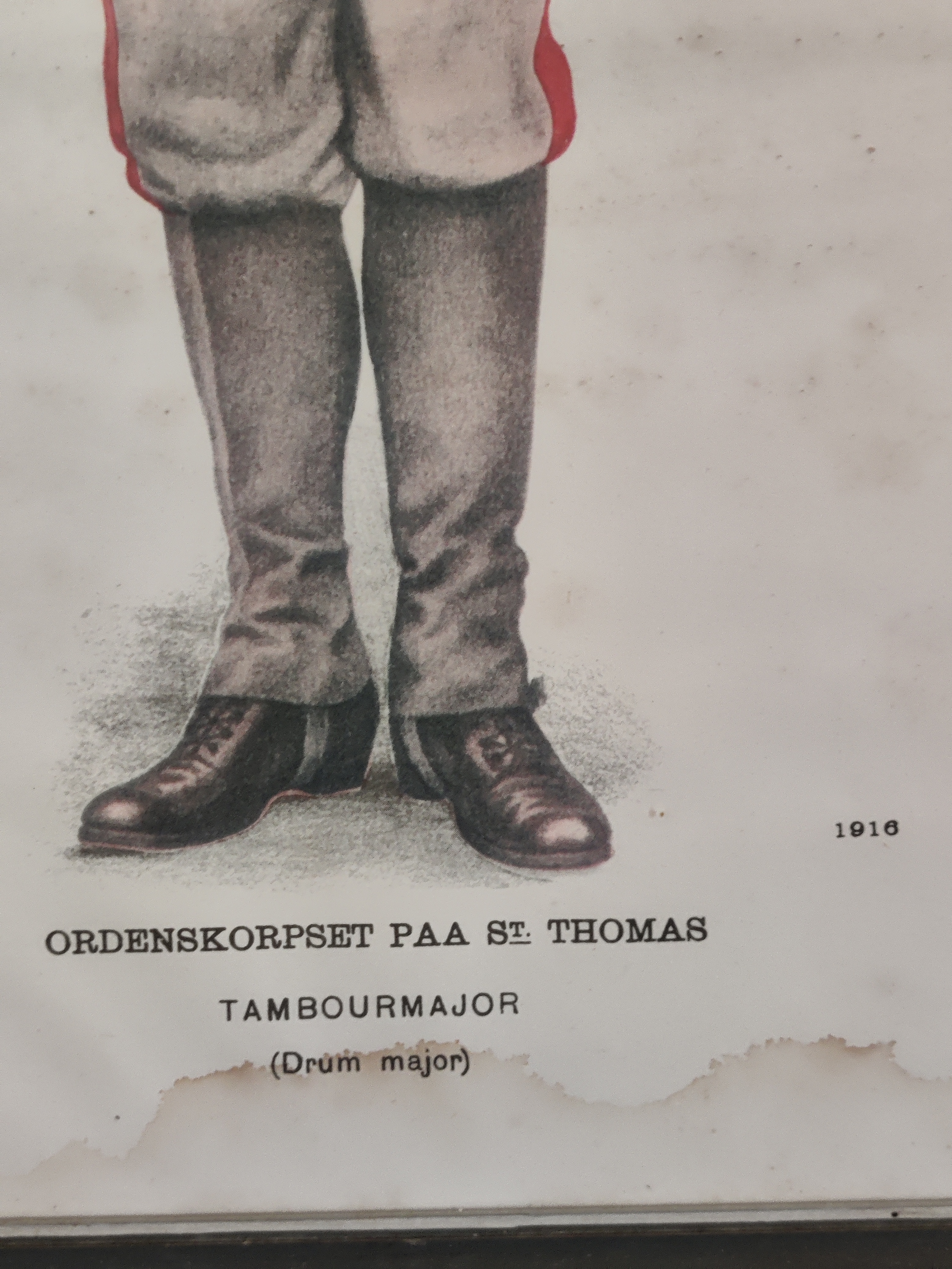 Gammelt tryk fra 1916 af en flot tambourmajor fra den Vestindiske ø St Thomas i fuld uniform. Billedet er en slags sidste omgang tam-tam for kolonimagten Danmark - for samme år afholdt man folkeafstemningen om, hvorvidt vi skulle blive ved med at eje øerne - og året efter blev De Vestindiske Øer solgt til USA. Ingen spurgte beboerne på øerne, hvad de synes... Mål 46,5 x 21,5 cm.