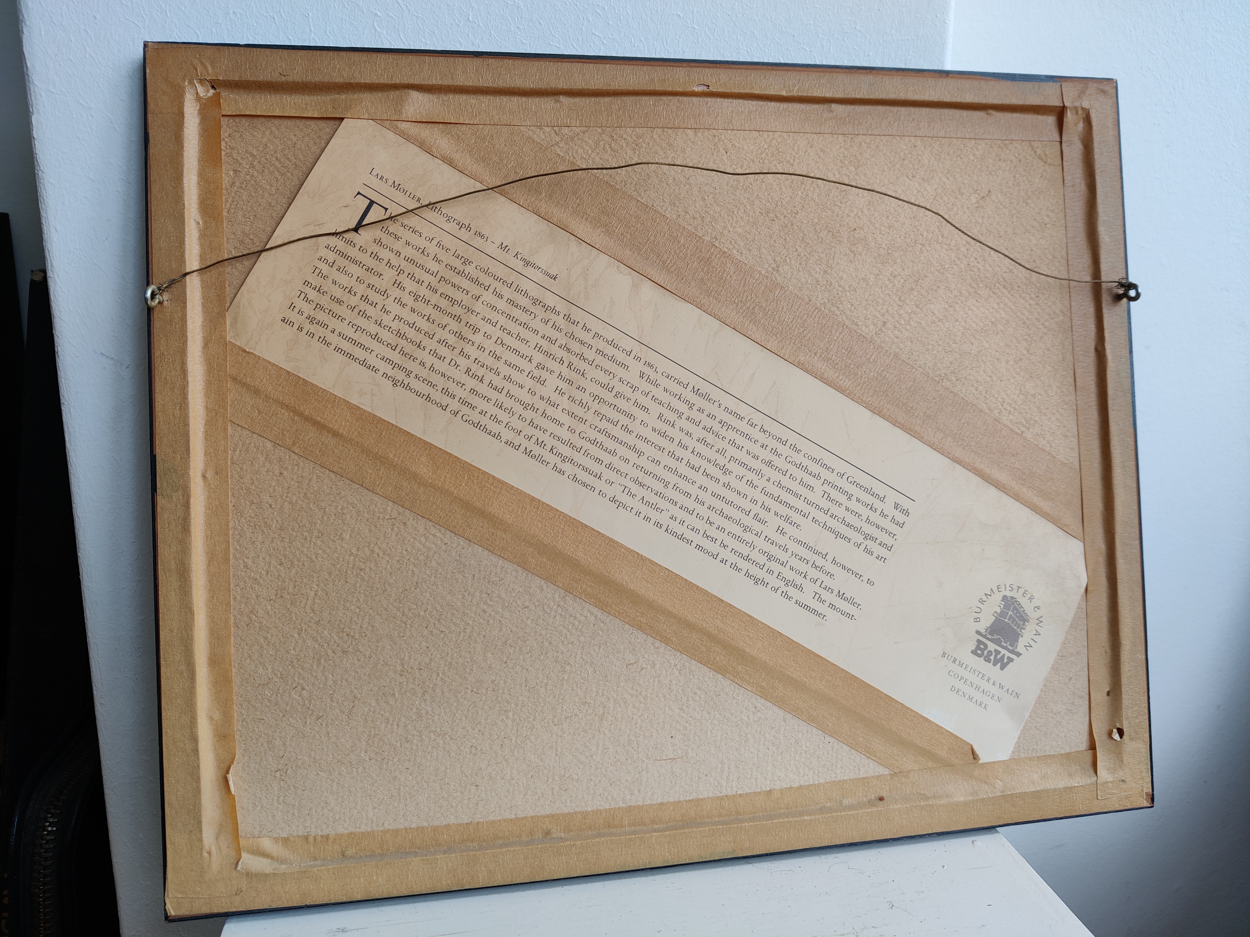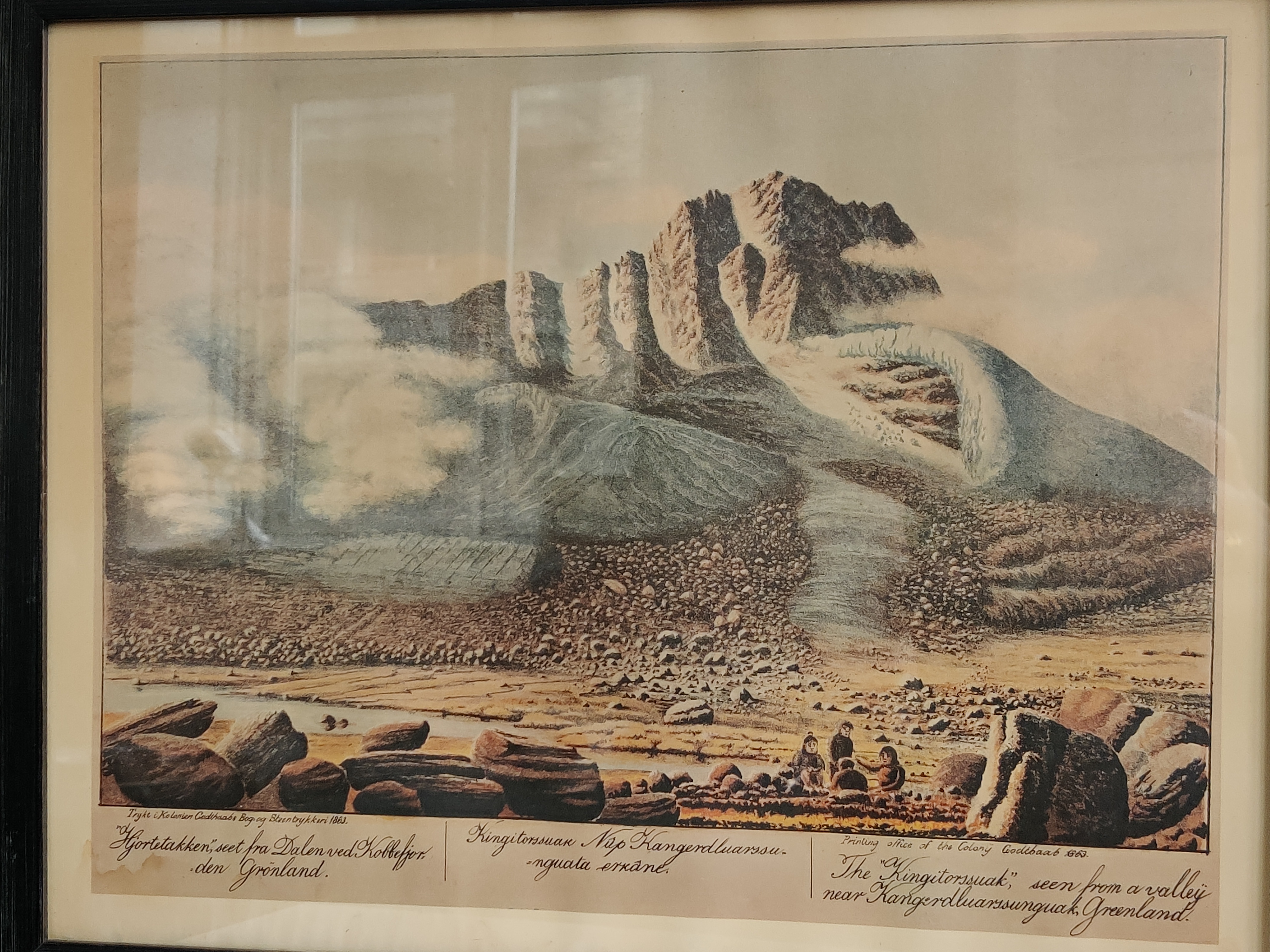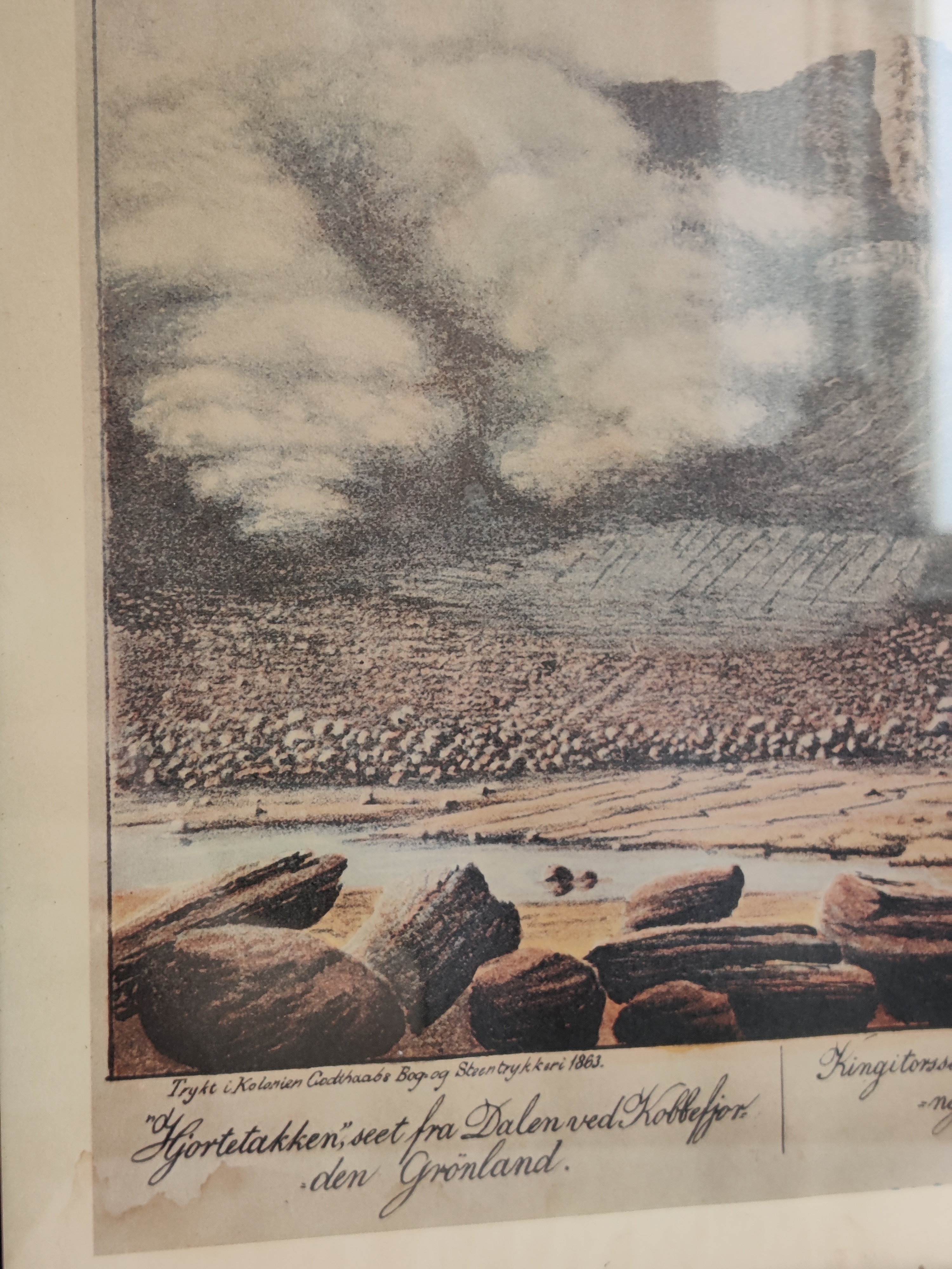 Hjortetakken seet fra Dalen ved Kobberfjorden, Grønland, 1893. Indrammet tryk af den grønlandske bogtrykker, litograf og kunstner Lars Møller (1842-1926). Fantastisk smukt motiv med de blødeste farver og detaljer. Bagpå er indsat en engelsk tekst fra B&W, der fortæller kort om kunsteren, så trykket har muligvis hængt på skibsværftet og blevet auktioneret eller foræret væk. Rammemål 39 x 31 cm.