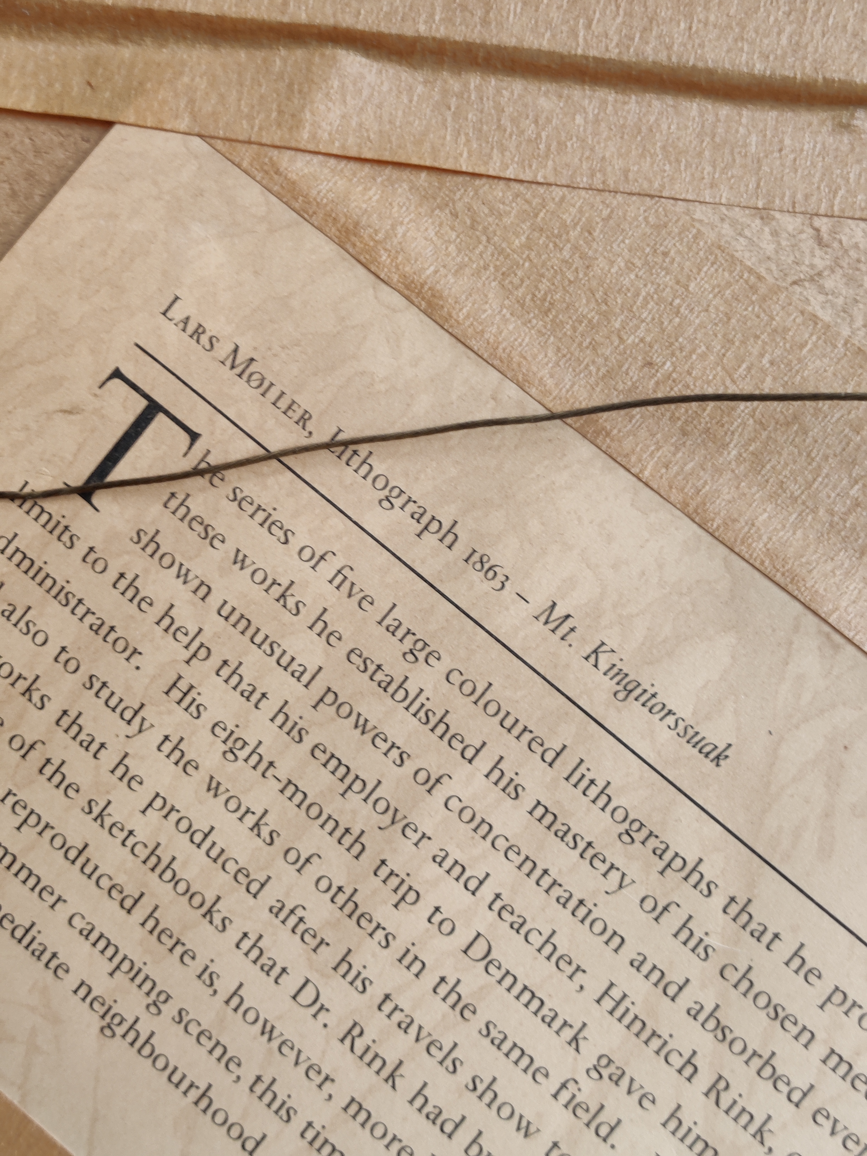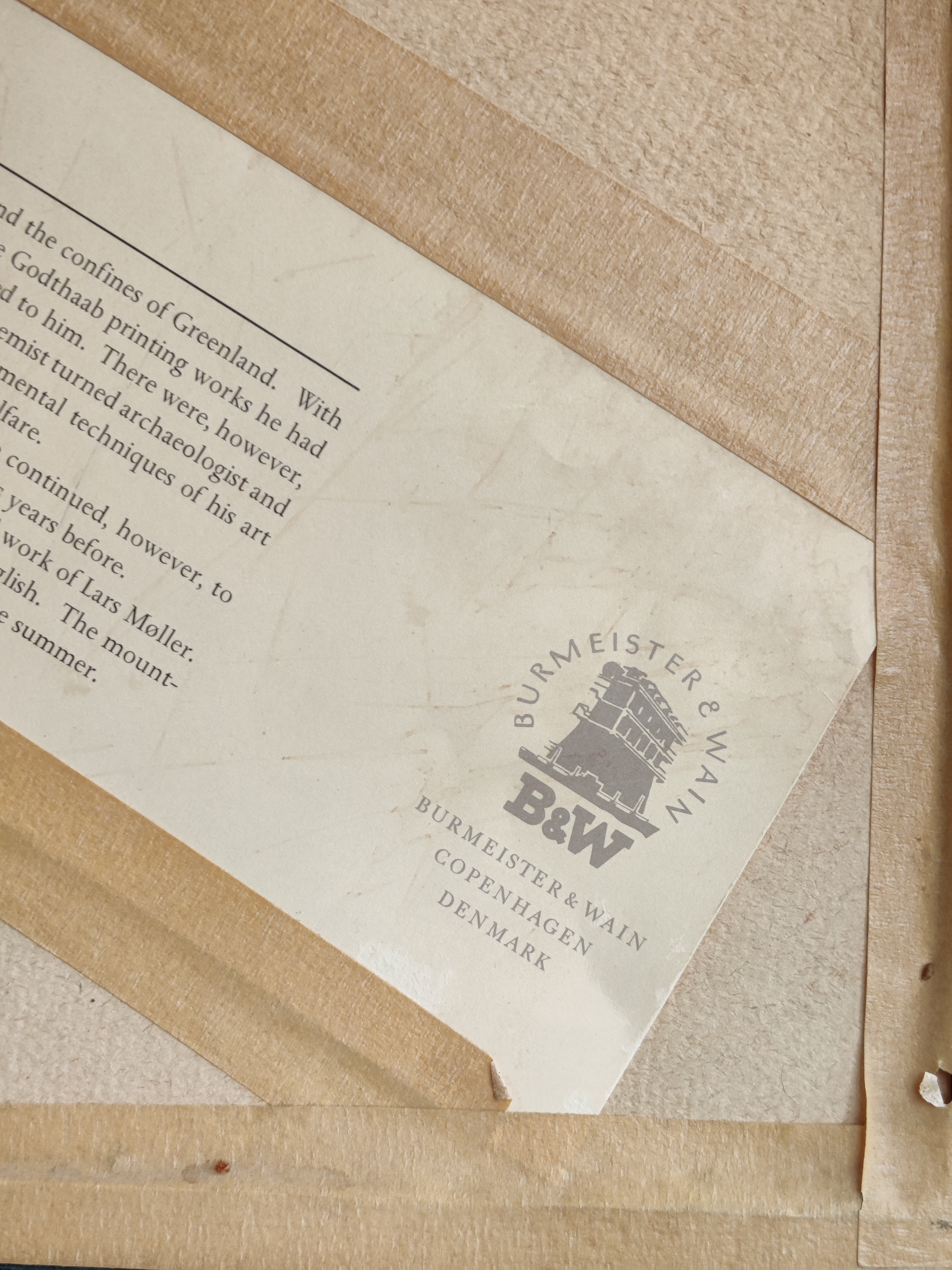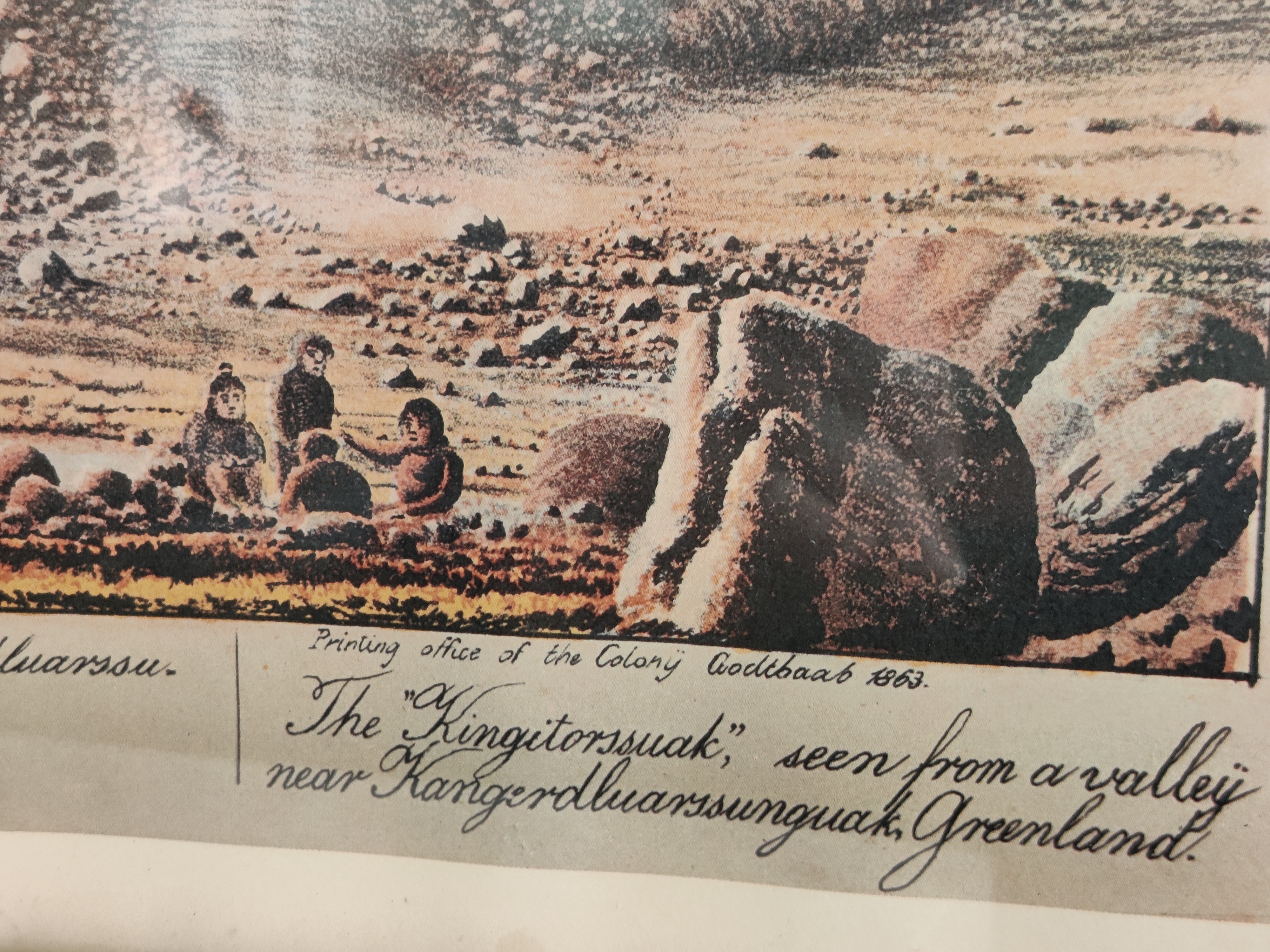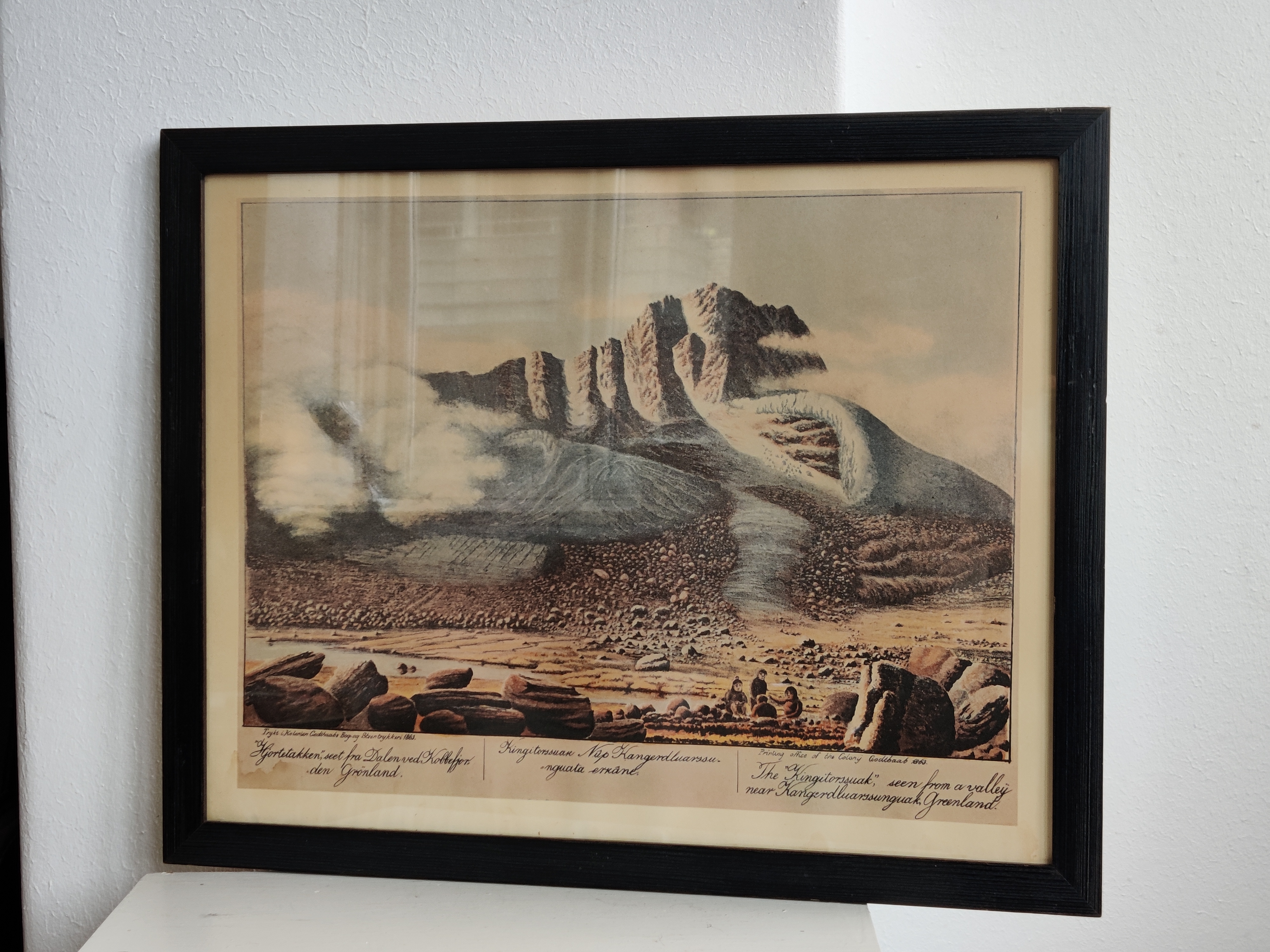 Hjortetakken seet fra Dalen ved Kobberfjorden, Grønland, 1893. Indrammet tryk af den grønlandske bogtrykker, litograf og kunstner Lars Møller (1842-1926). Fantastisk smukt motiv med de blødeste farver og detaljer. Bagpå er indsat en engelsk tekst fra B&W, der fortæller kort om kunsteren, så trykket har muligvis hængt på skibsværftet og blevet auktioneret eller foræret væk. Rammemål 39 x 31 cm.