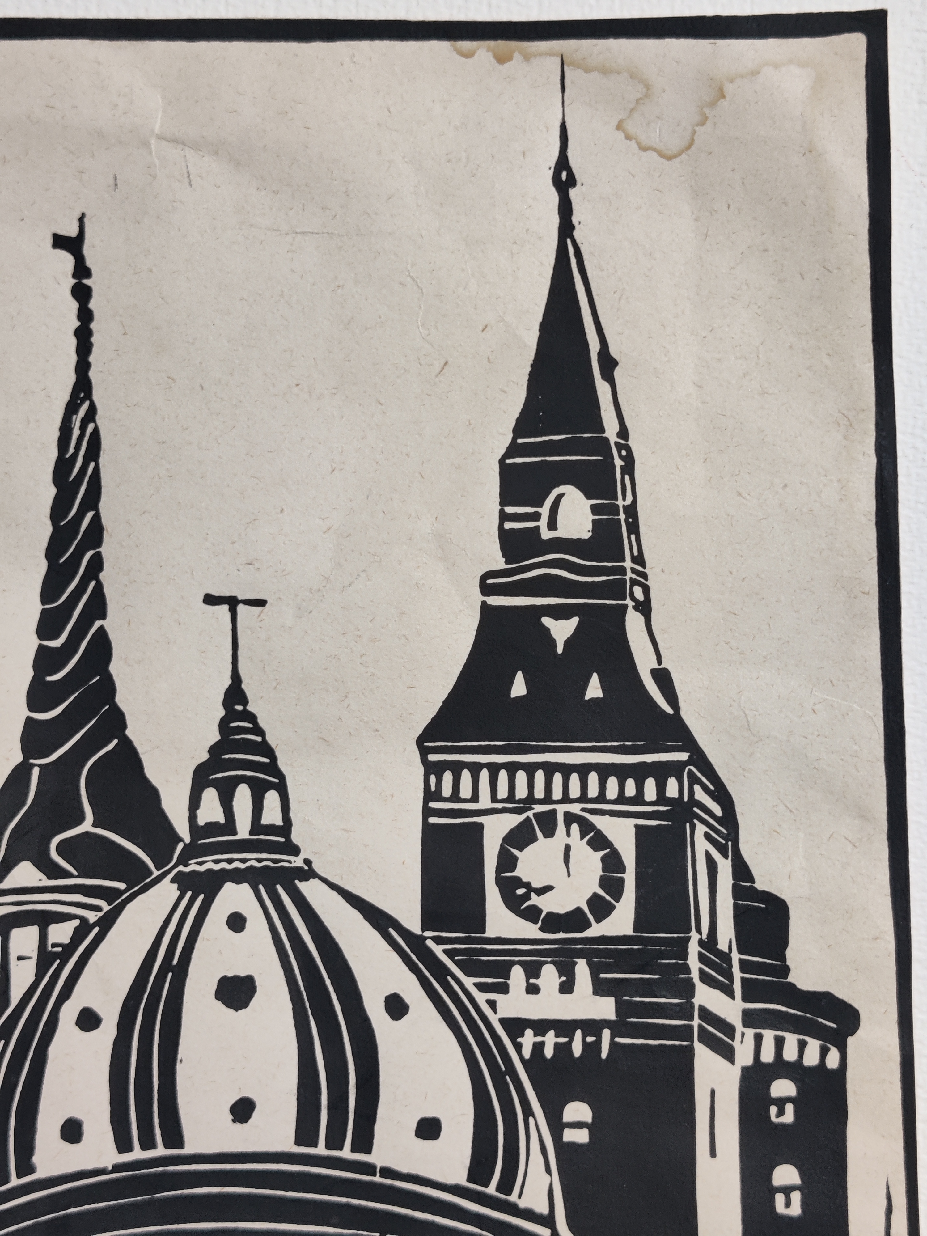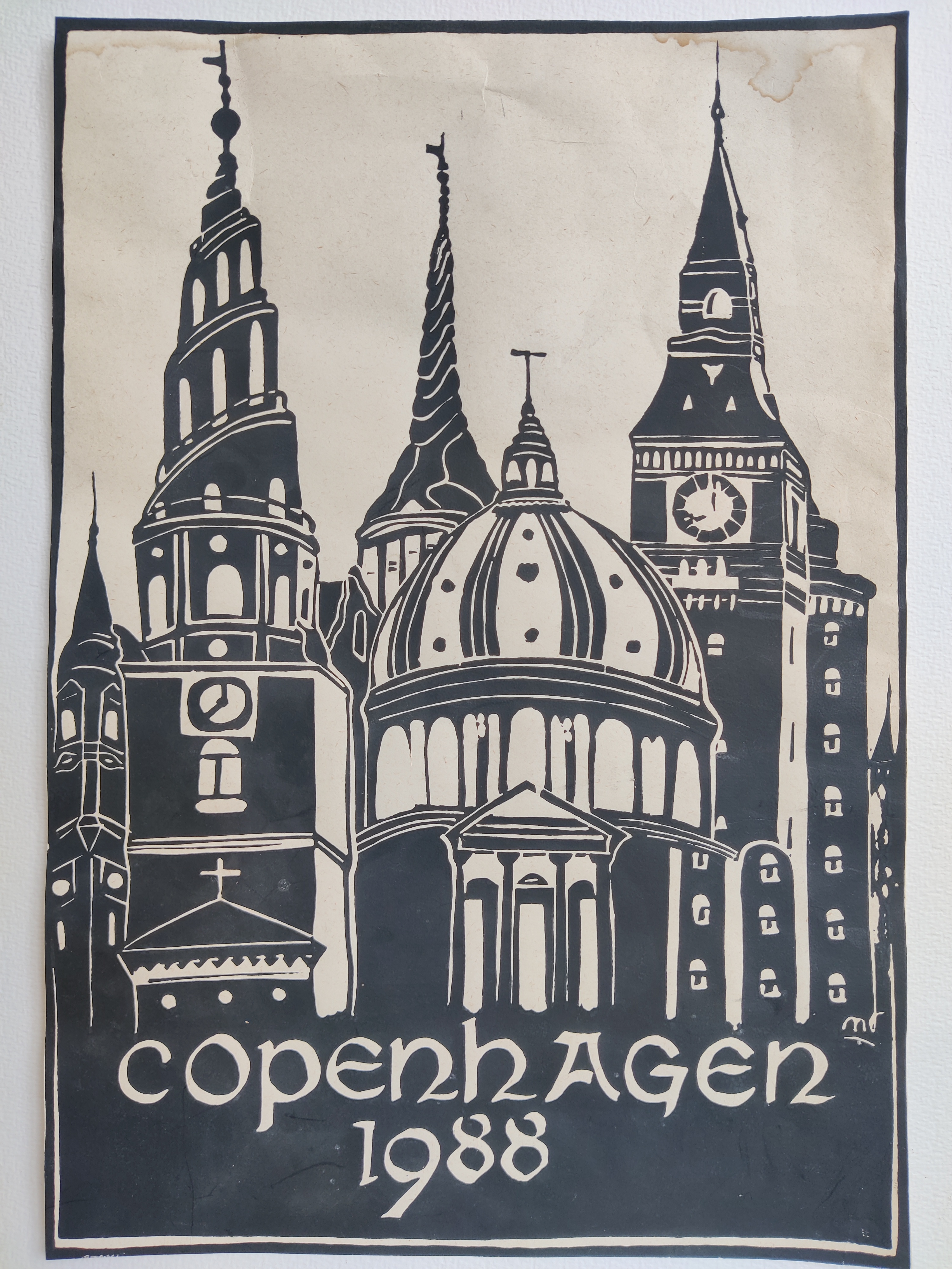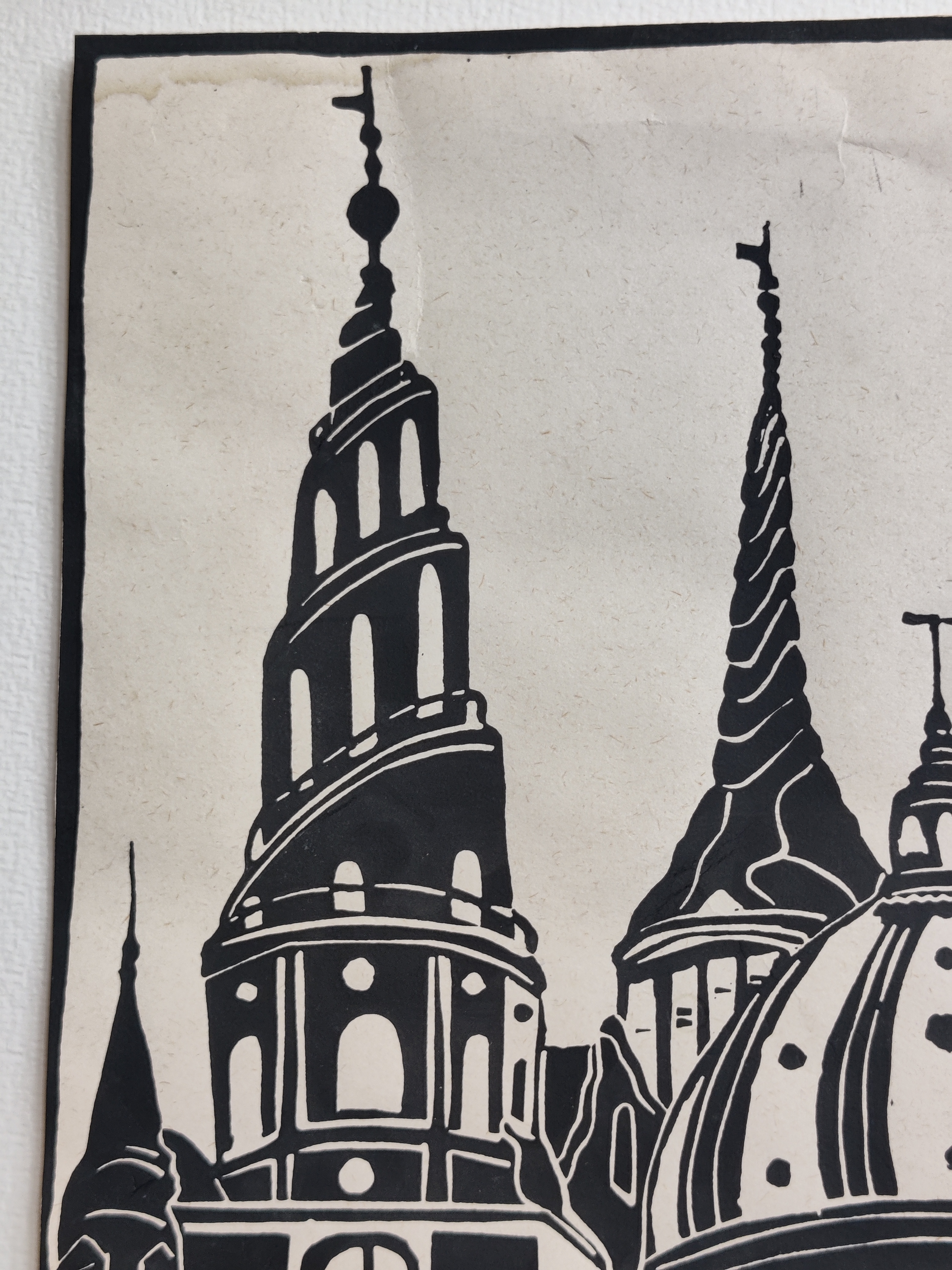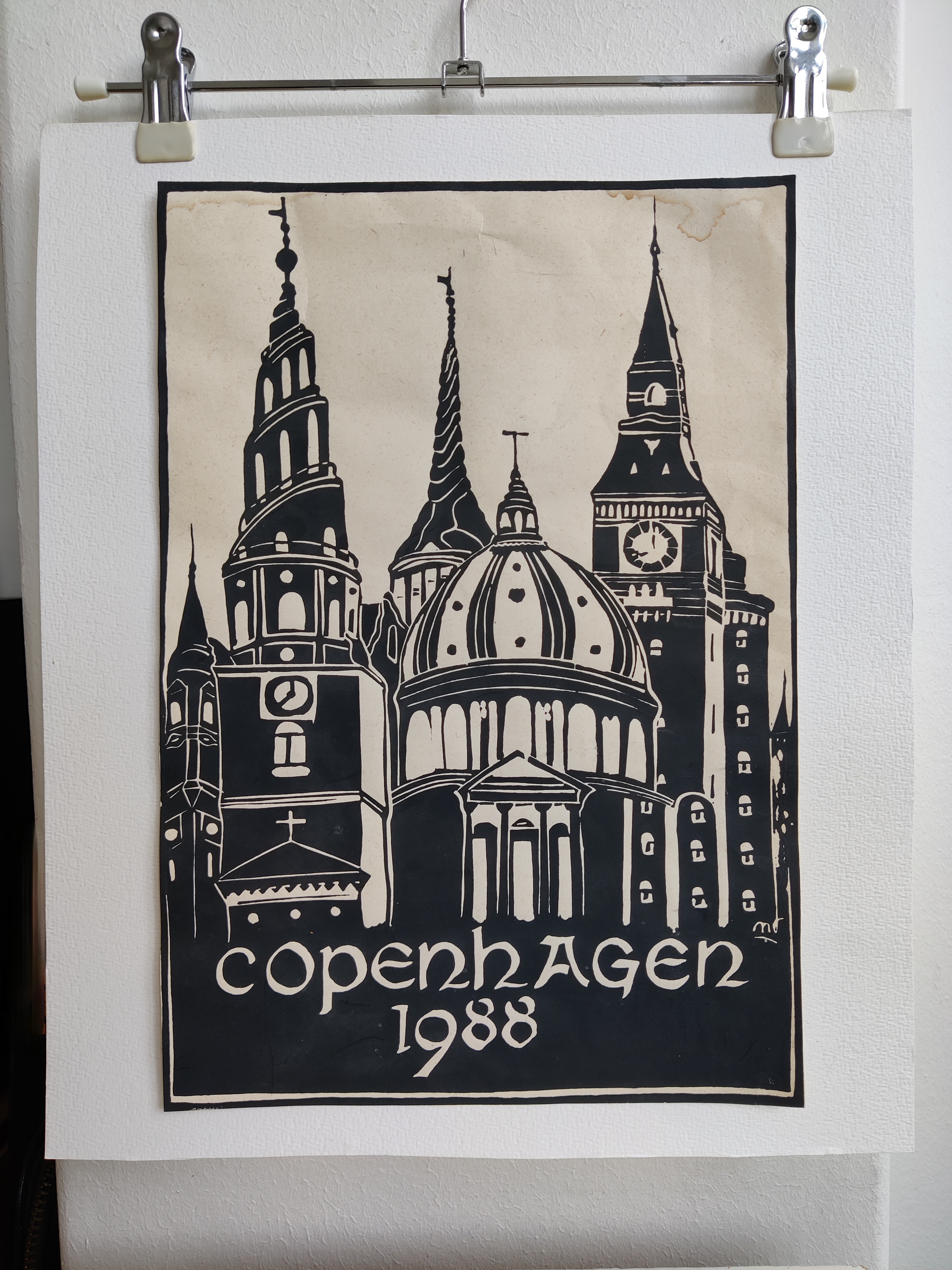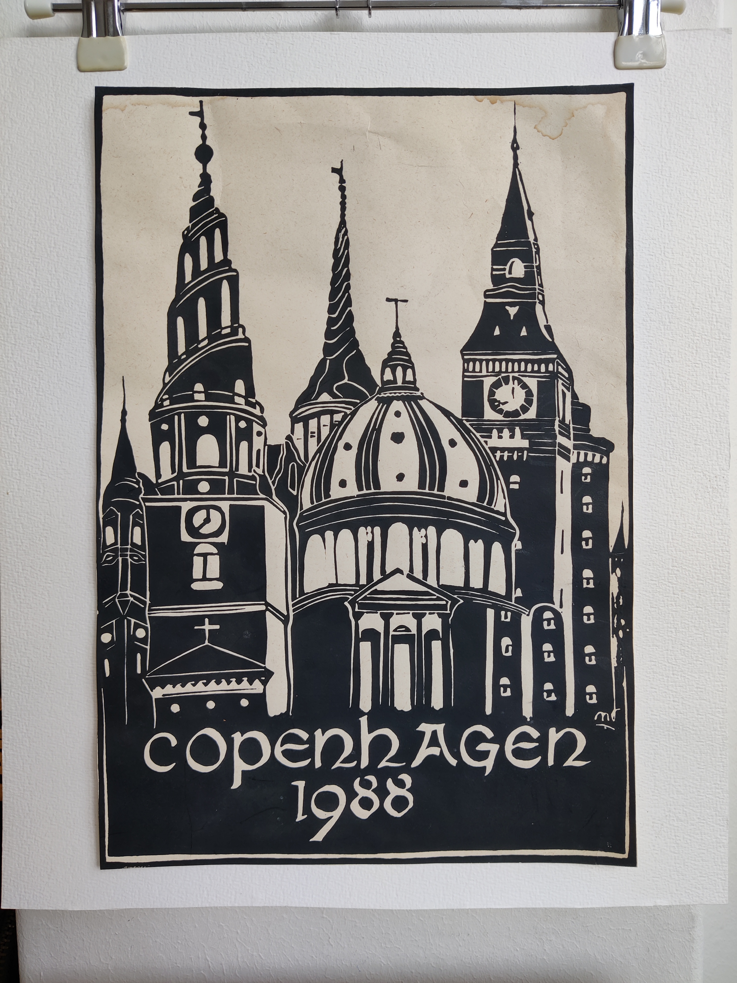 Fantastisk linoleumstryk af Københavns tårne, inklusiv dragespiret på Børsen, som vi forhåbentlig snart får igen. Kender du en, der er født i hovedstaden i 1988, er dette den perfekte gave. Bestem selv ramme, passepartout mm - deraf prisen. Lille vandskade øverst. Mål 35 x 24 cm.