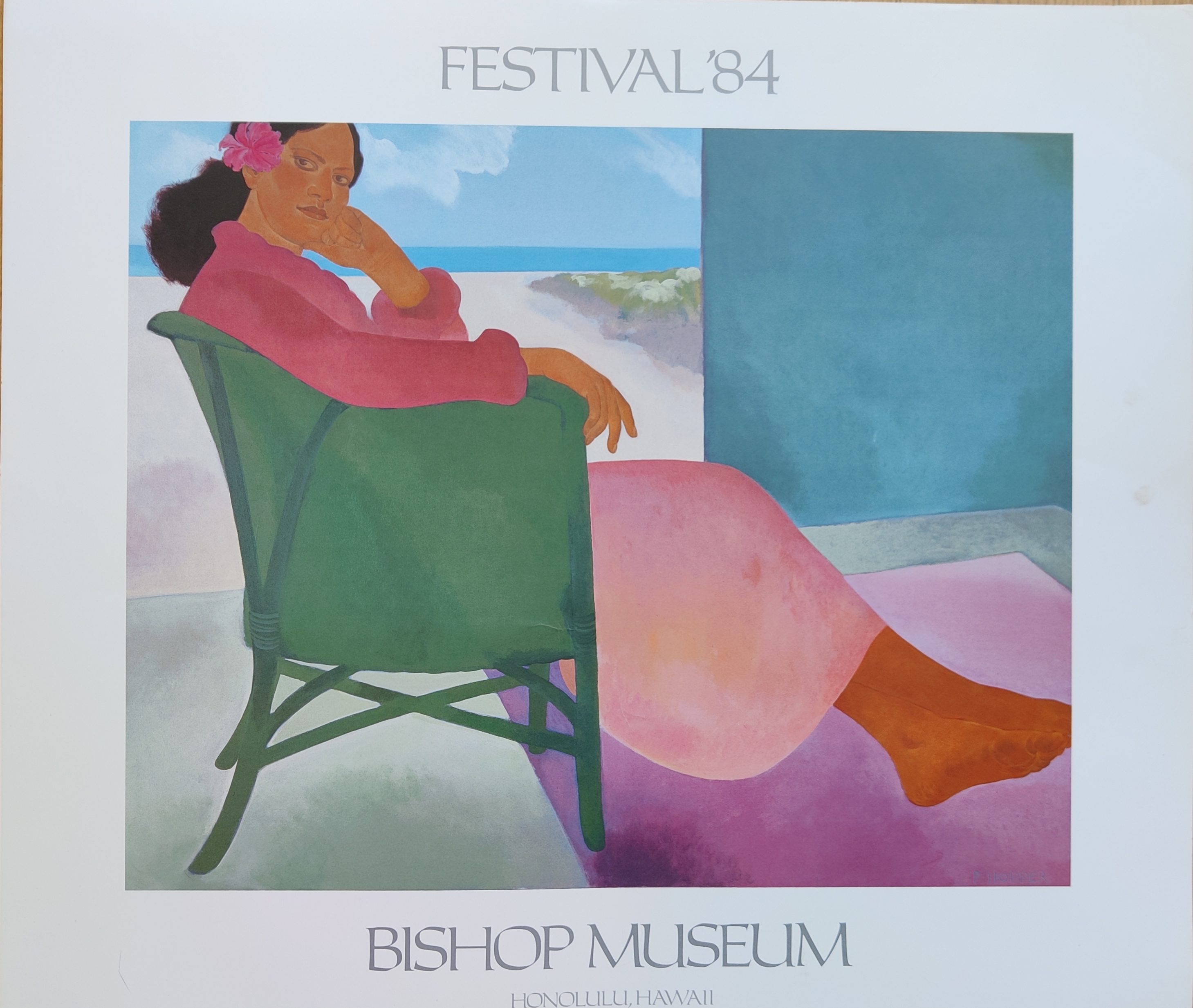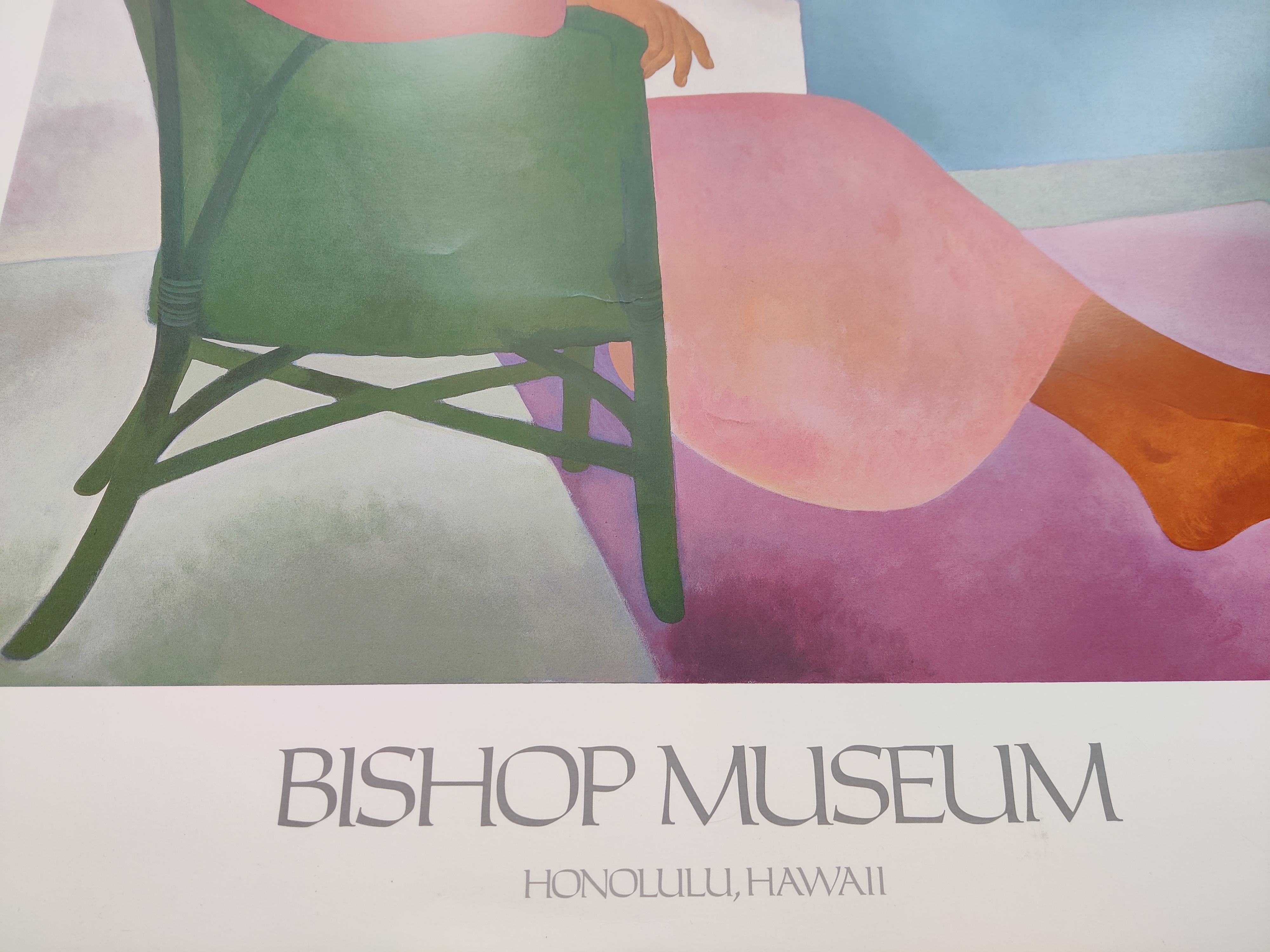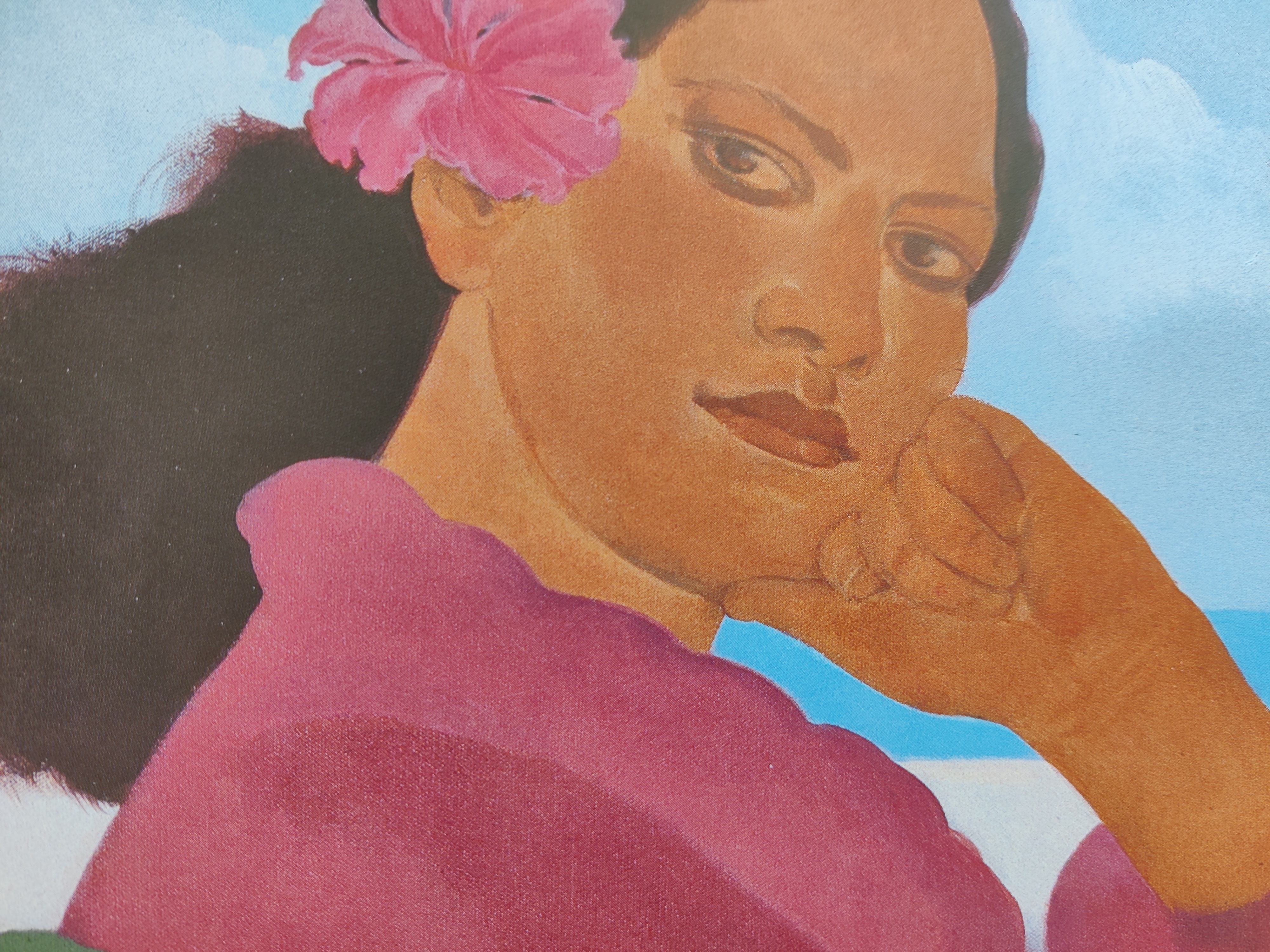 Smukt og intenst kvindeportræt i fantastiske farver. Kunsttryk på tykt karton fra Bishop Museum på Hawaii 1984. Værket hedder Lanilai Afternoon og kunstneren Pegge Hopper, en kvindelig amerikansk kunstner f. 1938, som er bosat på øerne. Flot stand med lille fingermærke i højre side. Mål 65 x 84 cm, kan sendes rullet eller fladt efter ønske.