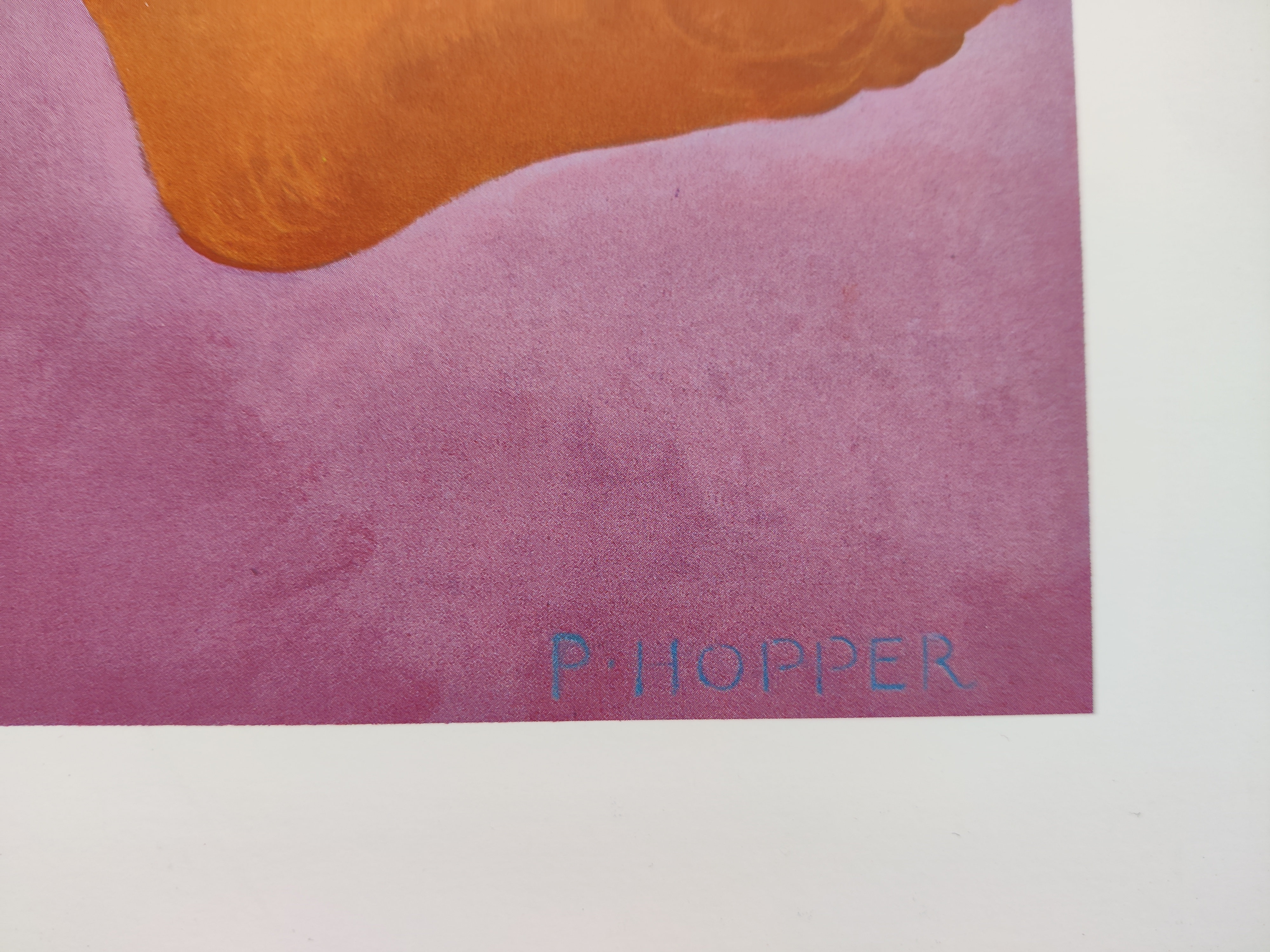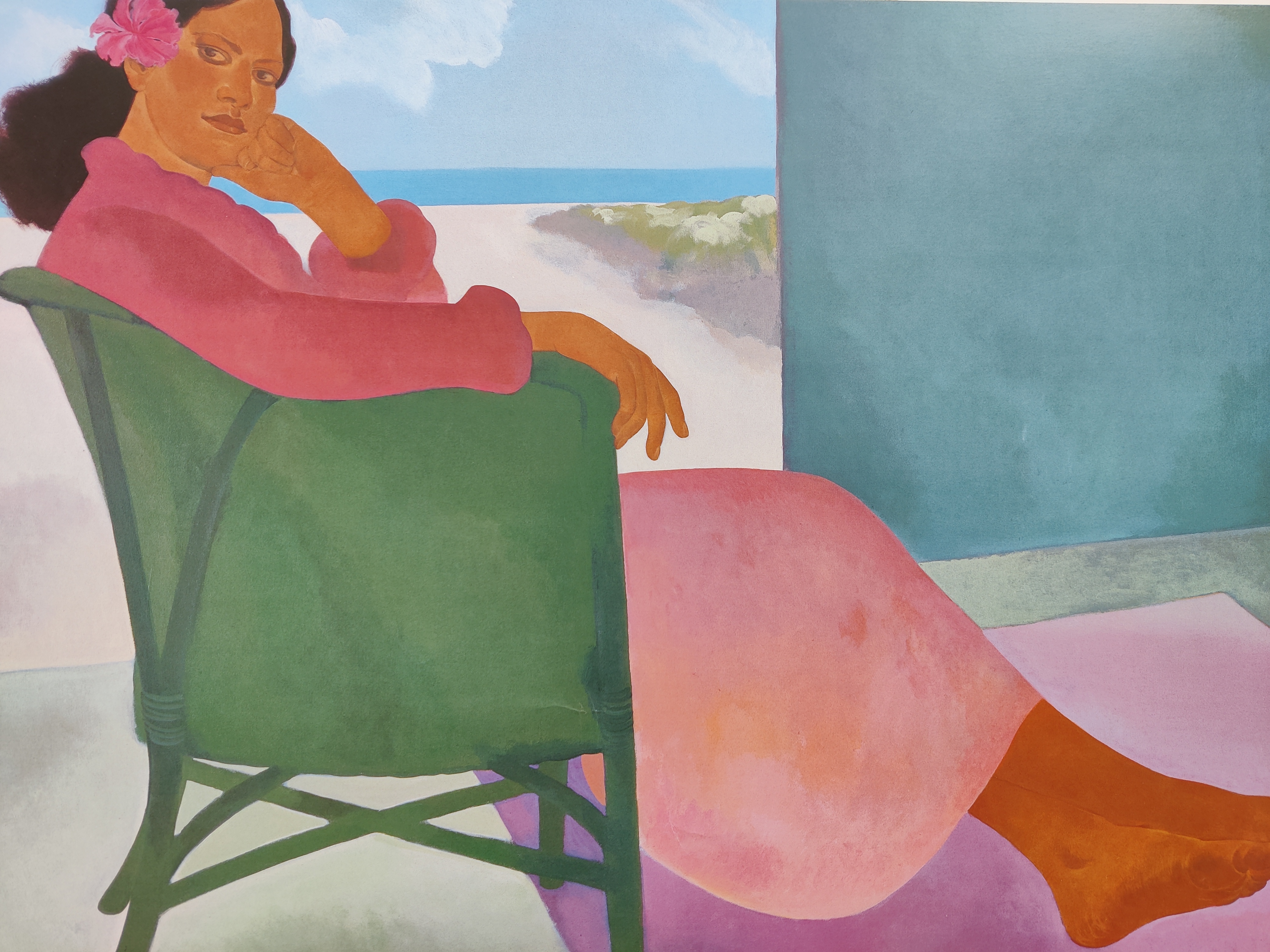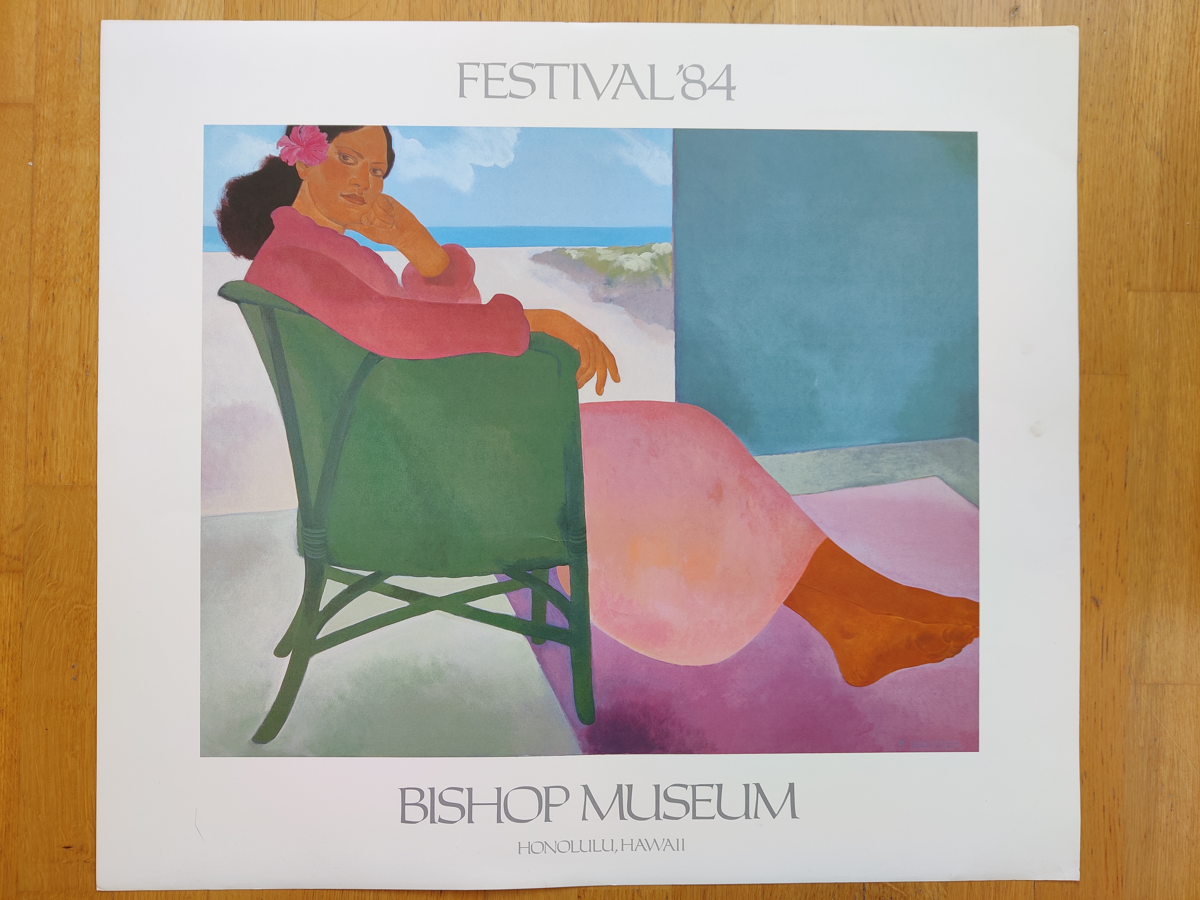 Smukt og intenst kvindeportræt i fantastiske farver. Kunsttryk på tykt karton fra Bishop Museum på Hawaii 1984. Værket hedder Lanilai Afternoon og kunstneren Pegge Hopper, en kvindelig amerikansk kunstner f. 1938, som er bosat på øerne. Flot stand med lille fingermærke i højre side. Mål 65 x 84 cm, kan sendes rullet eller fladt efter ønske.