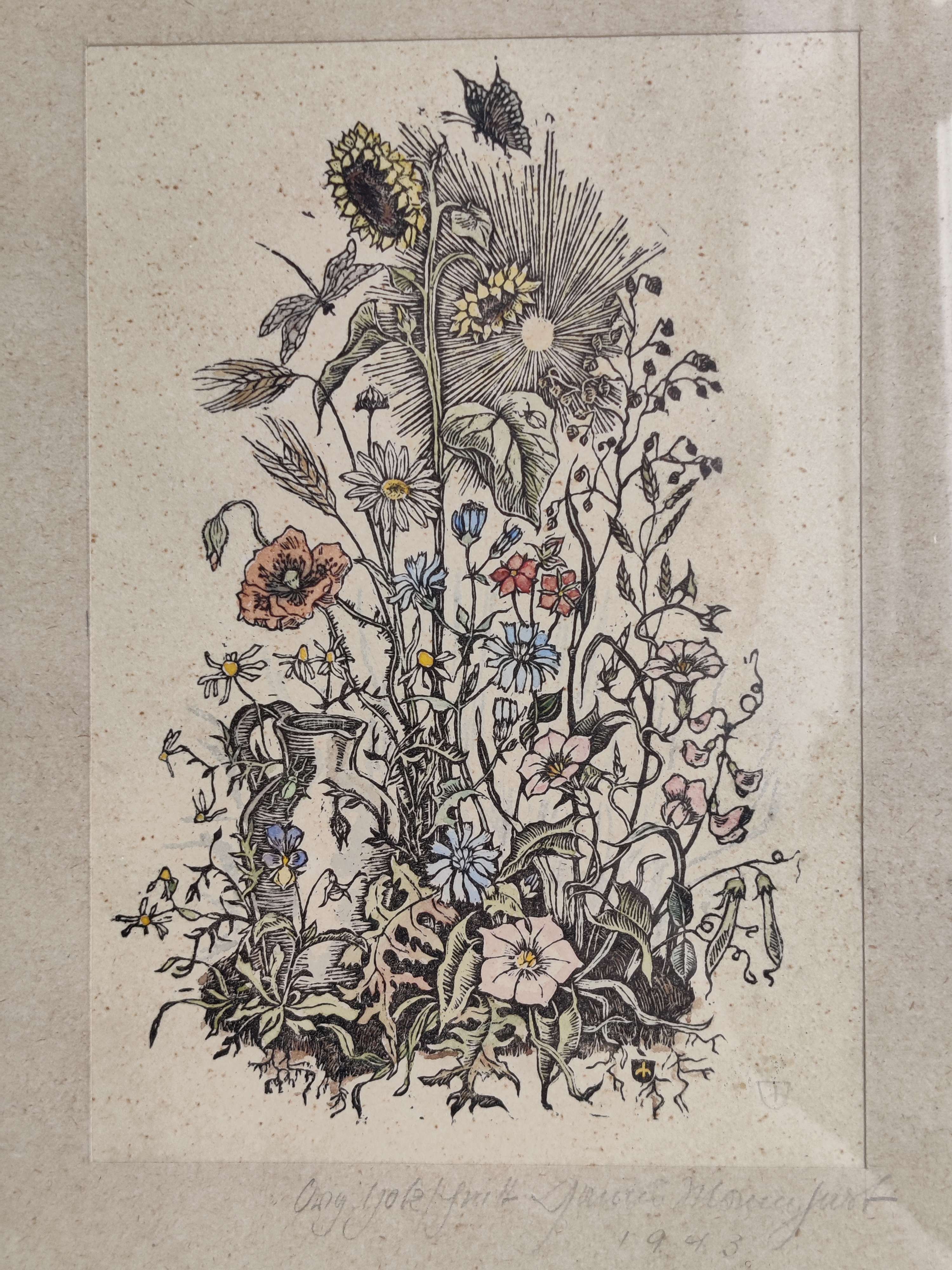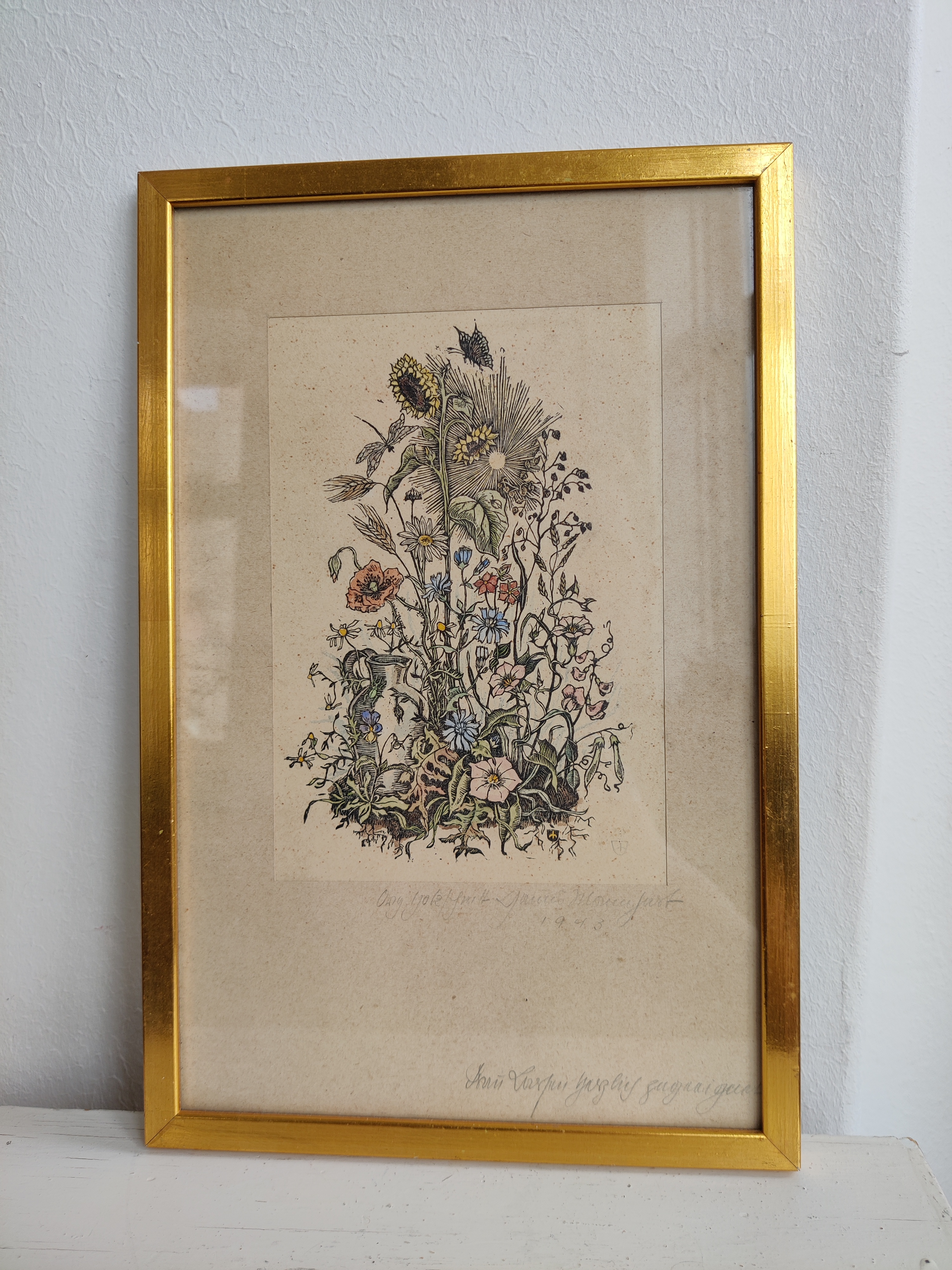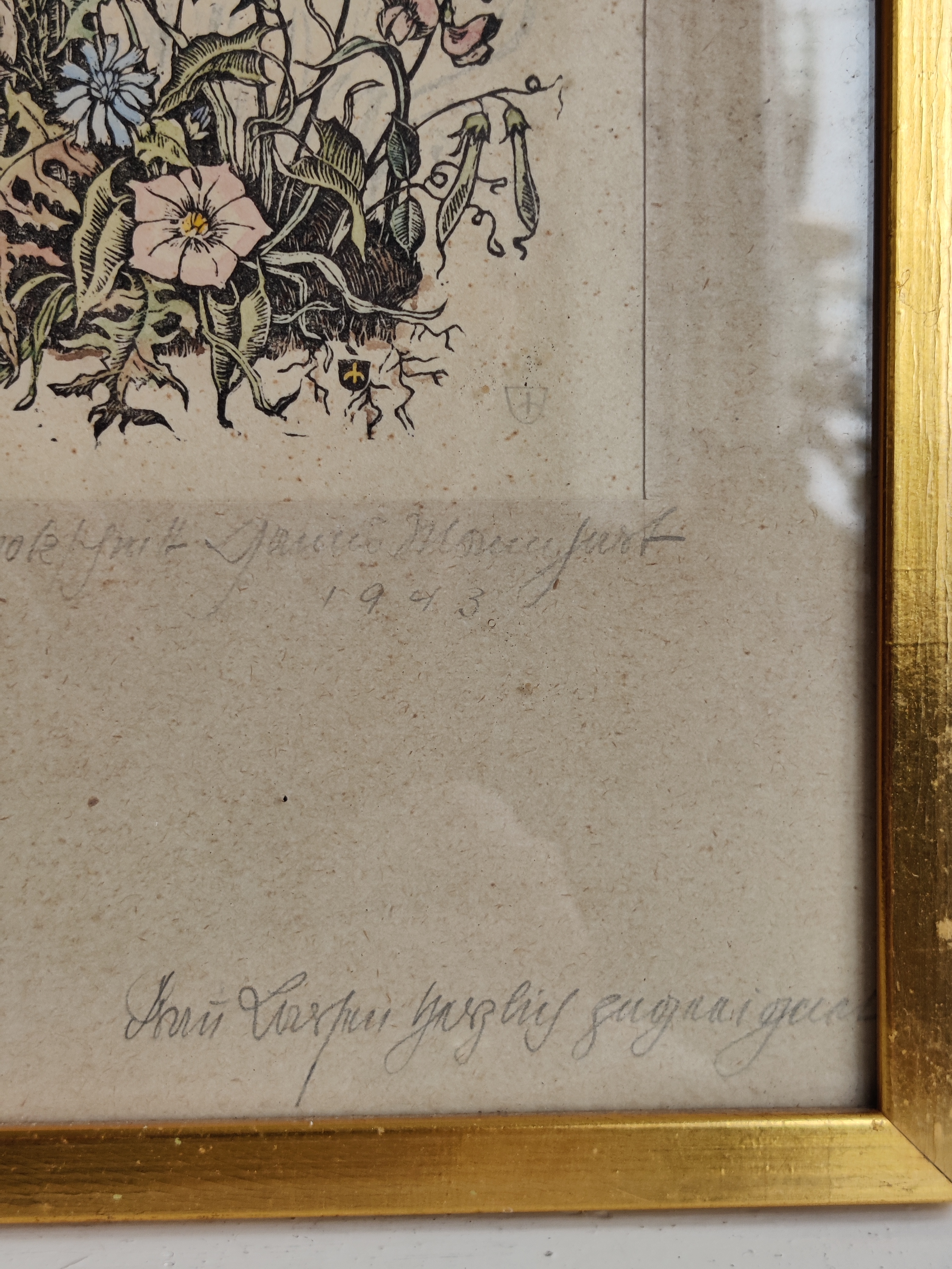Poetisk litografisk kunsttryk med de smukkeste detaljer fra en frodig have, signeret af kunstneren 1943. Stammer fra Letland og derfor kan jeg ikke læse hverken signatur eller dedikation - måske kan du eller en du kender? Ramme mål 29 x 19 cm.