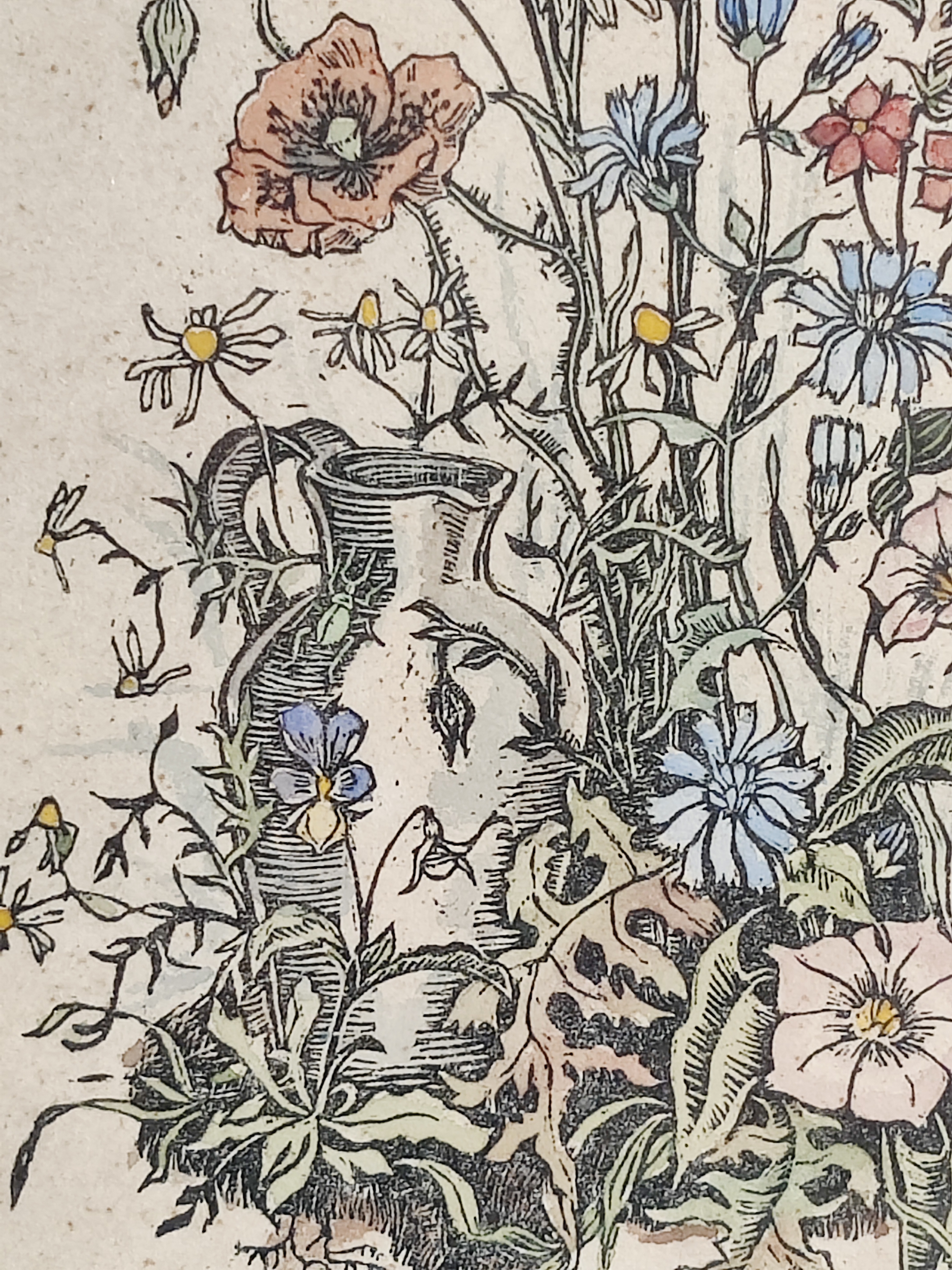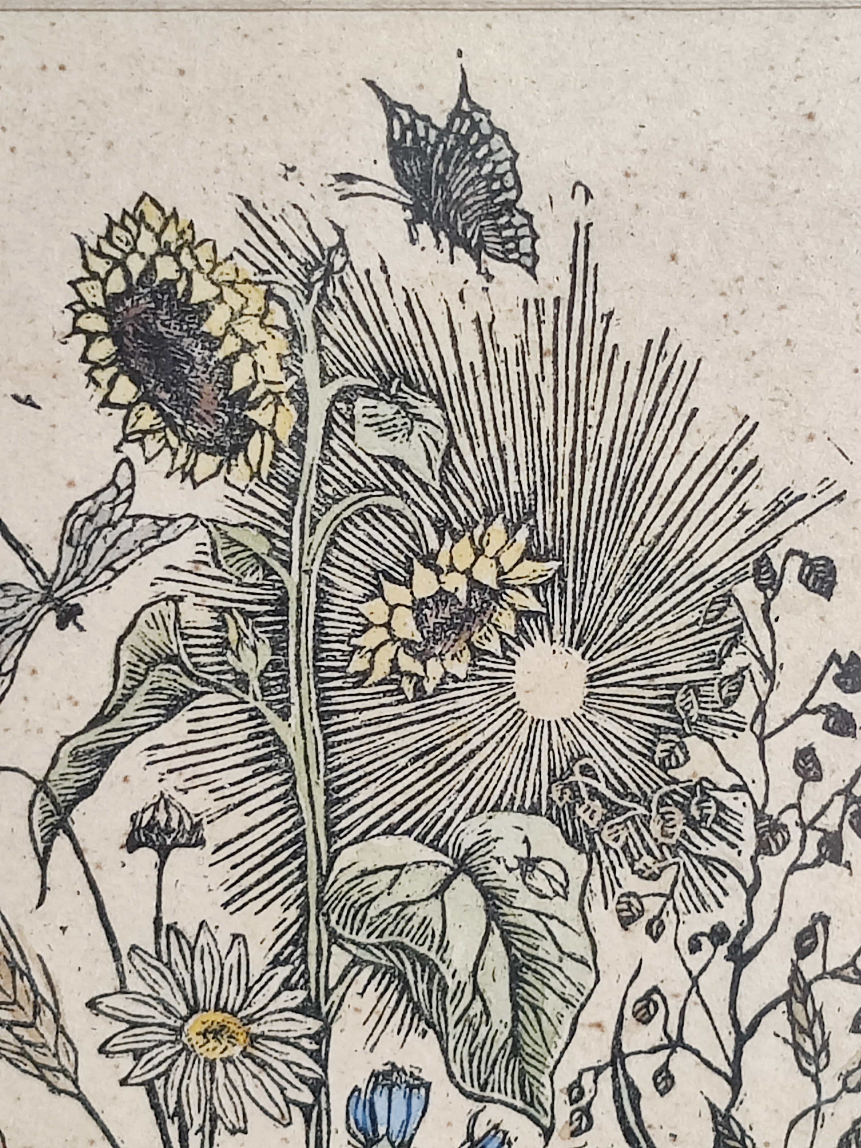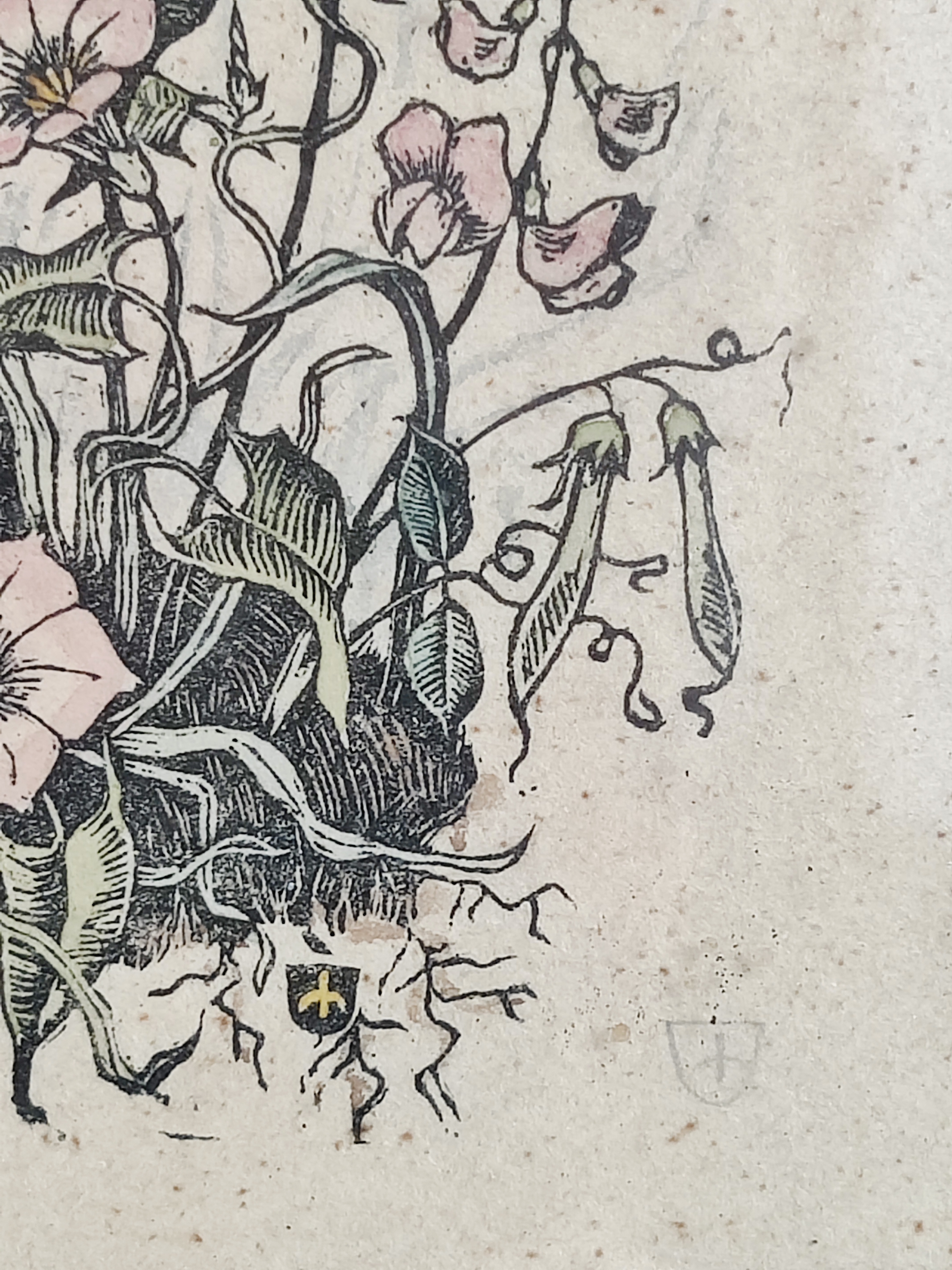 Poetisk litografisk kunsttryk med de smukkeste detaljer fra en frodig have, signeret af kunstneren 1943. Stammer fra Letland og derfor kan jeg ikke læse hverken signatur eller dedikation - måske kan du eller en du kender? Ramme mål 29 x 19 cm.