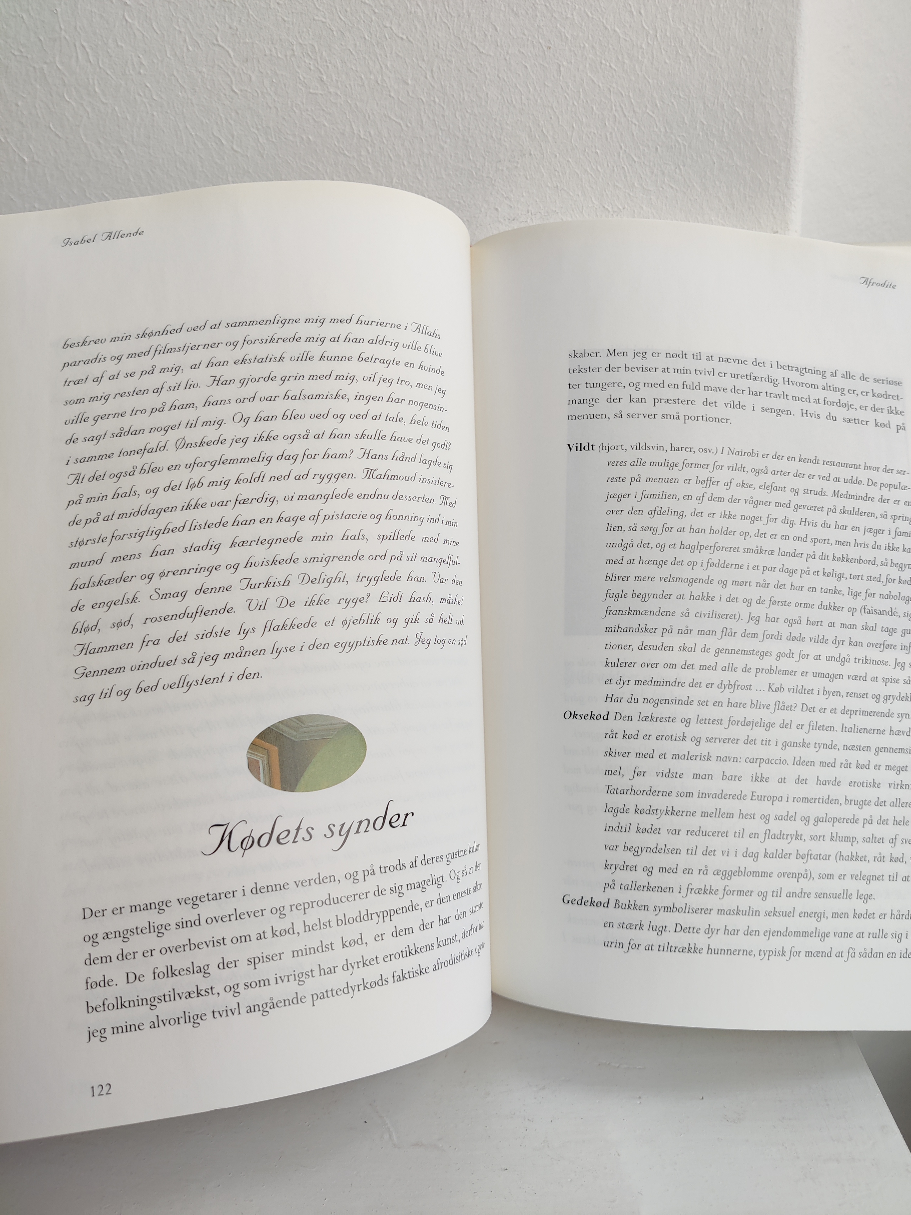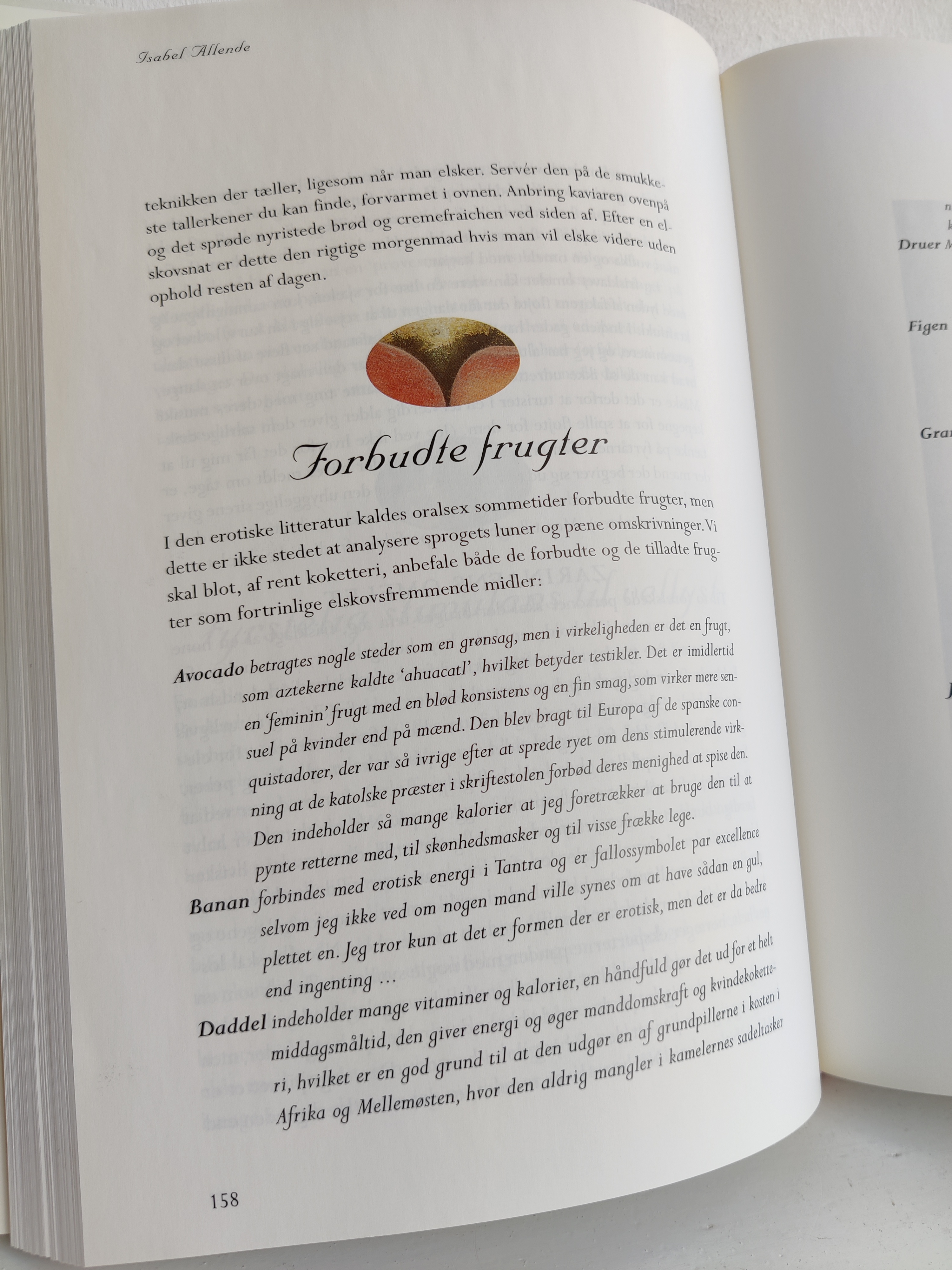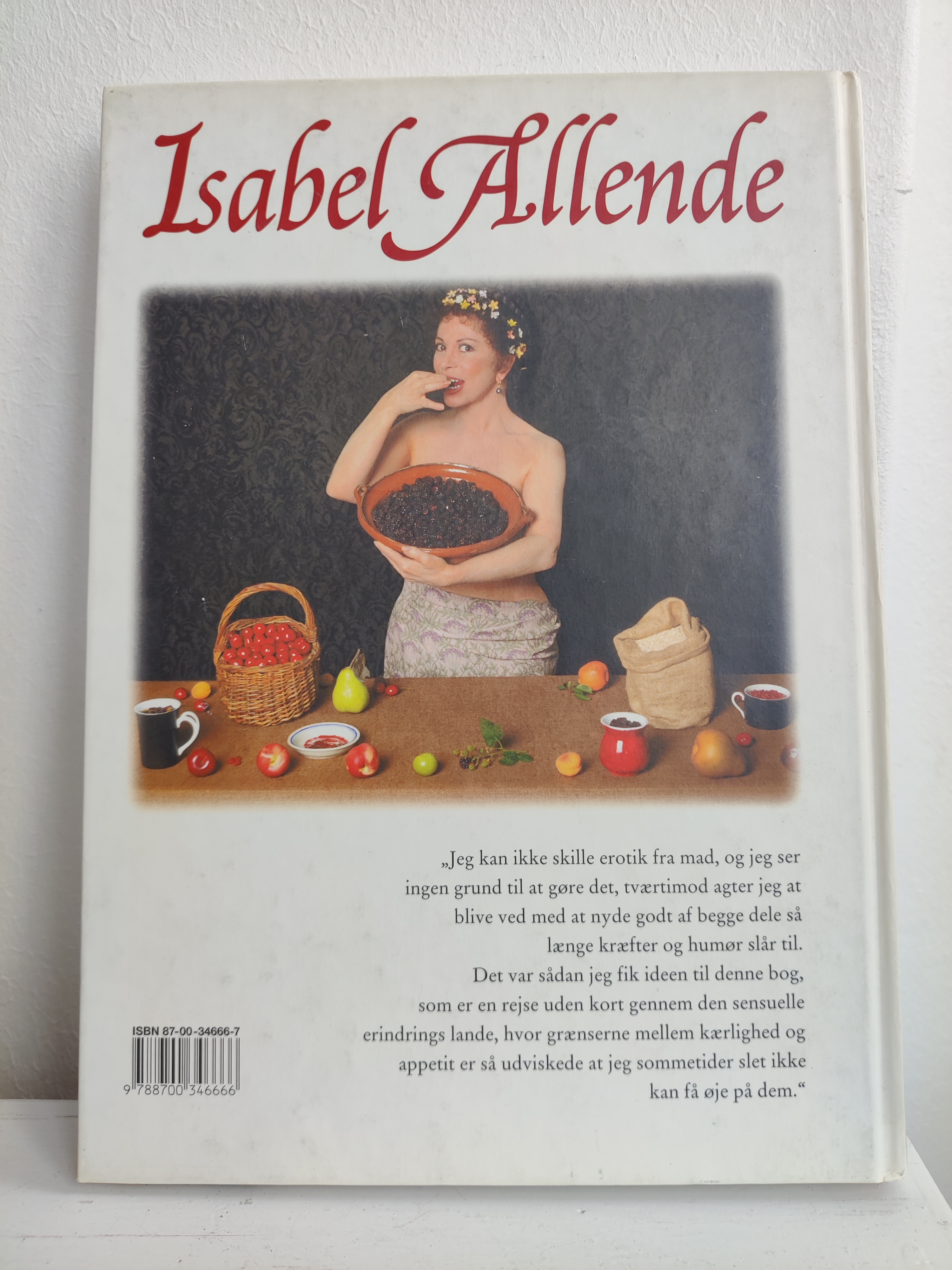 Afrodisiske ingrendienser kan være alt muligt ud over østers, og det sanselige køkken er the place to be, når man er fyldt 50, som der står i indledningen. Det er budskabet i Isabel Allendes kogebog fra 1998 med masser af fortællinger om erotikkens kulinariske historie, og konkrete opskrifter på retter som Sheikens Auberginer og Frivole Svesker. Format 25 x 18 cm.