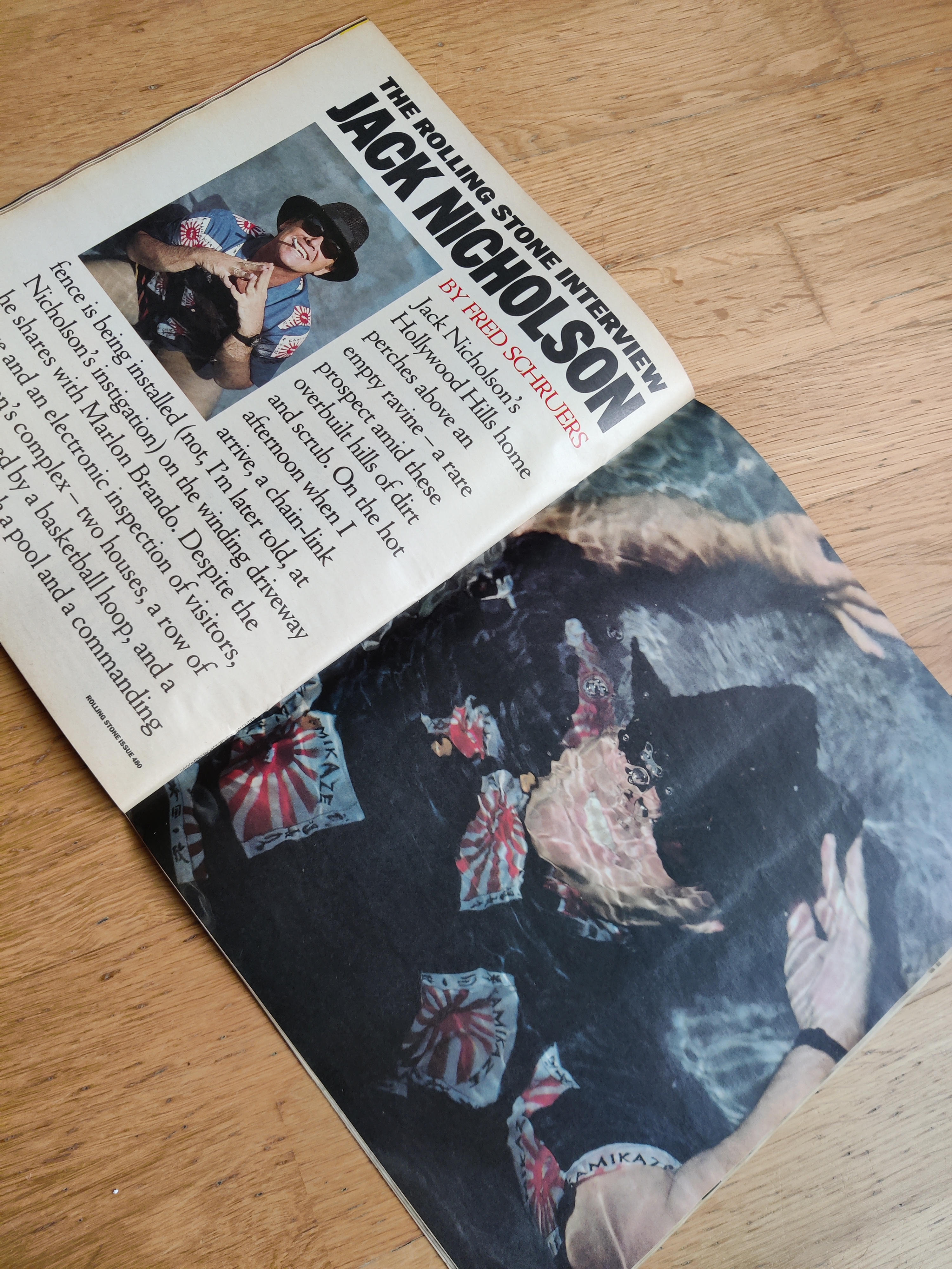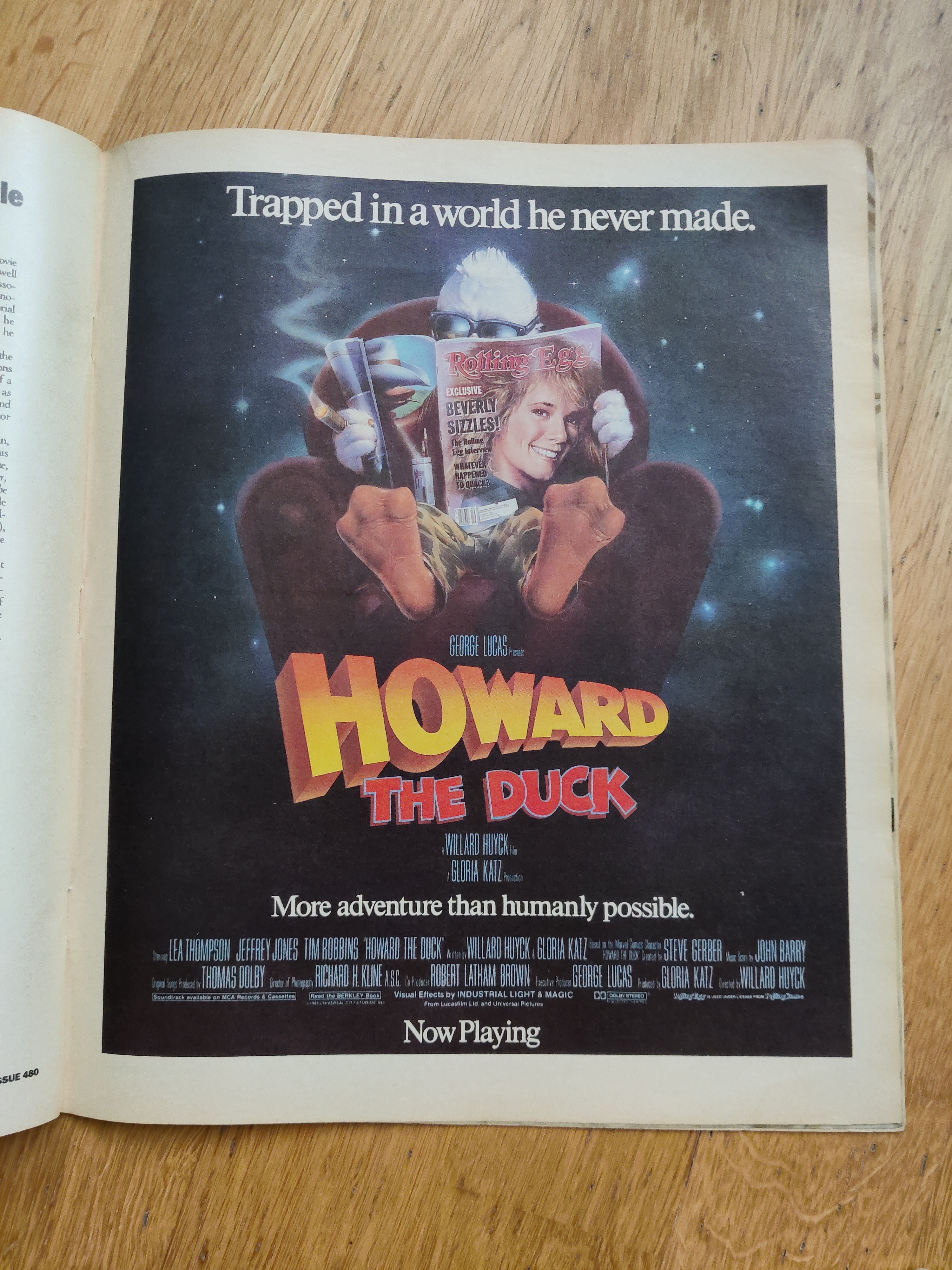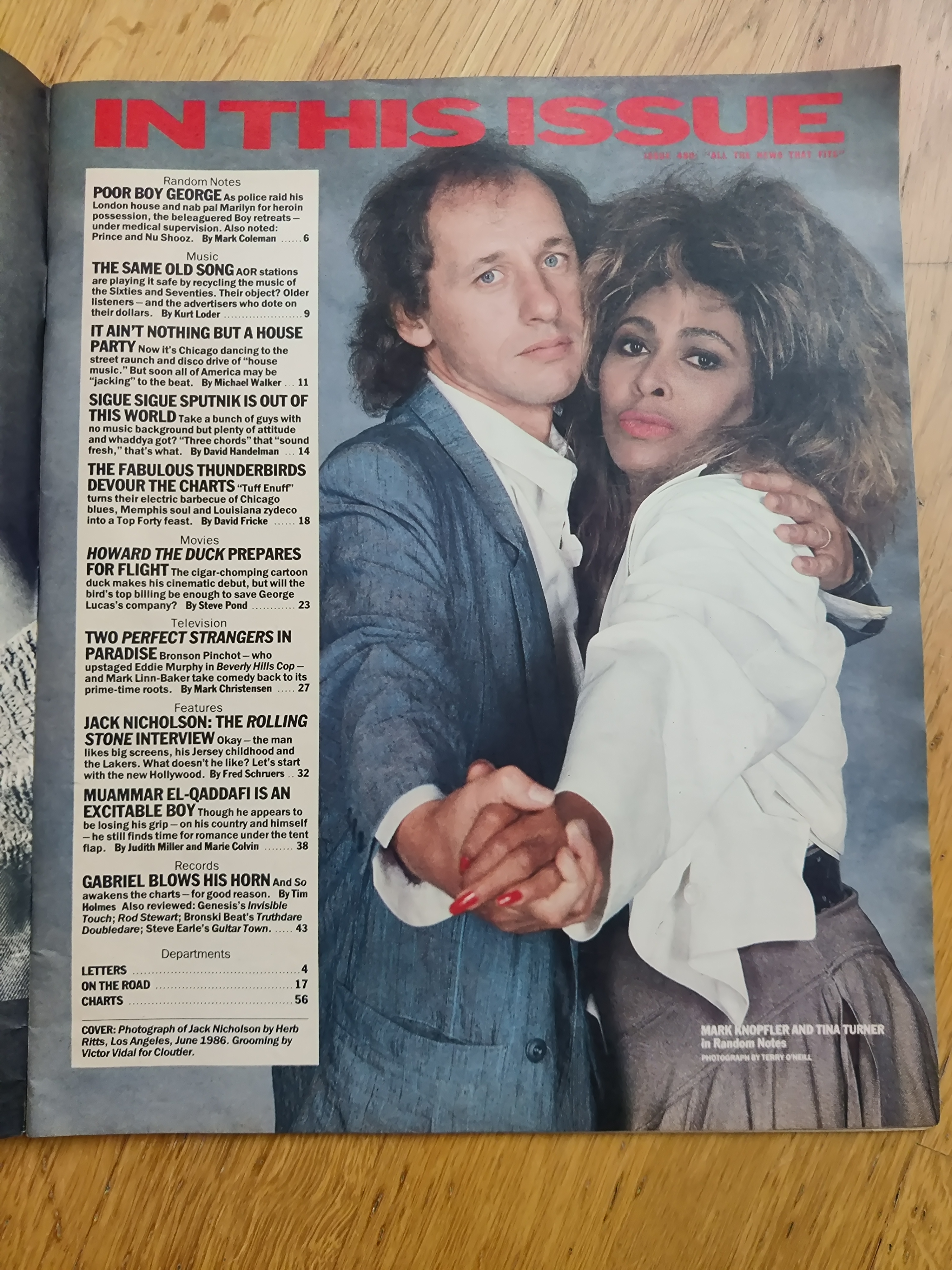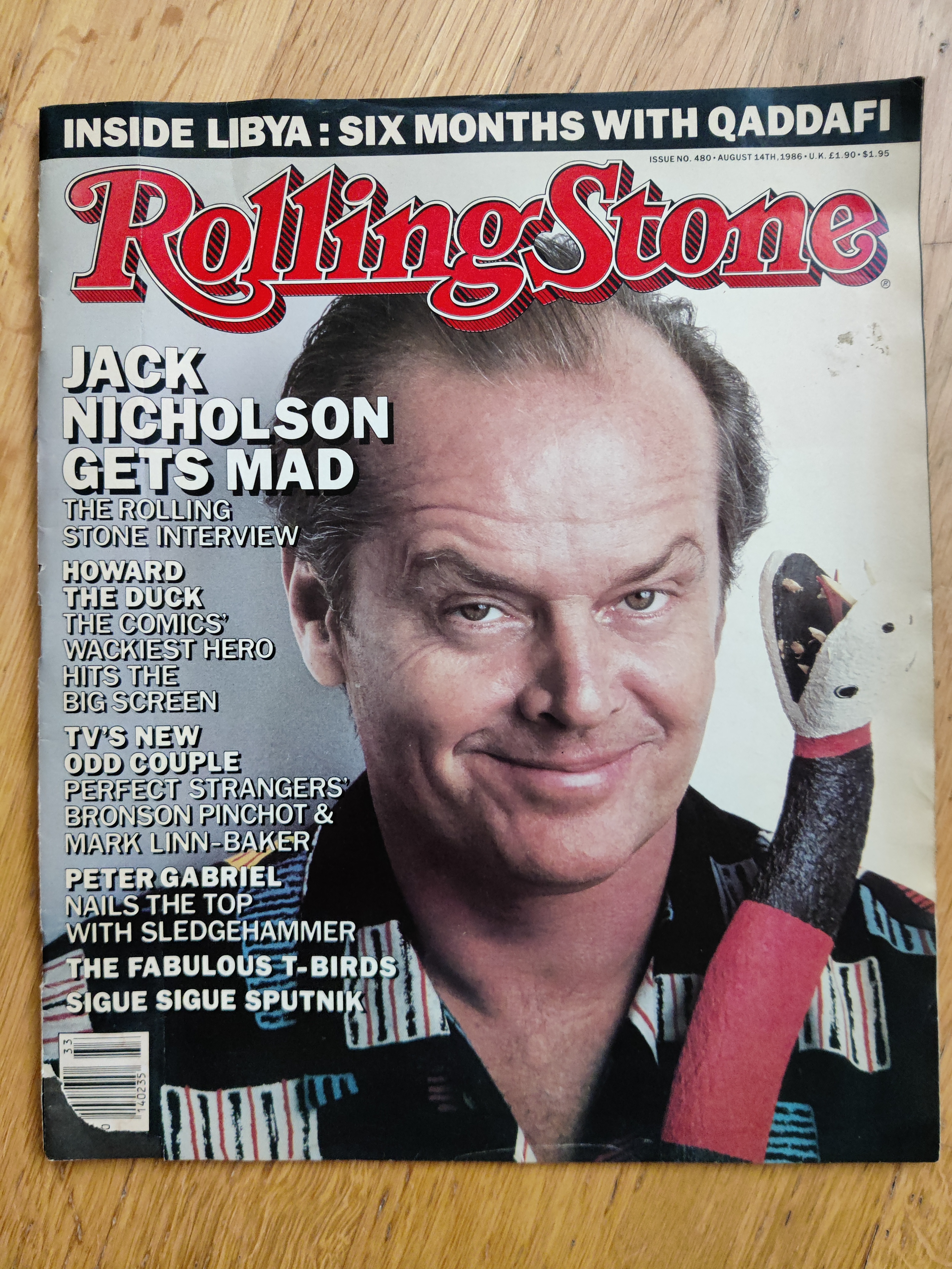 Rolling Stone Magazine issue 480, 14. august 1986. Jack Nicholson med sit vanvittige fjæs er på forsiden og til interview. Desuden lille feature og reklame for Howard the Duck, en fed Levi's 501 reklame, og masser af historier om firsernes musikhelte.