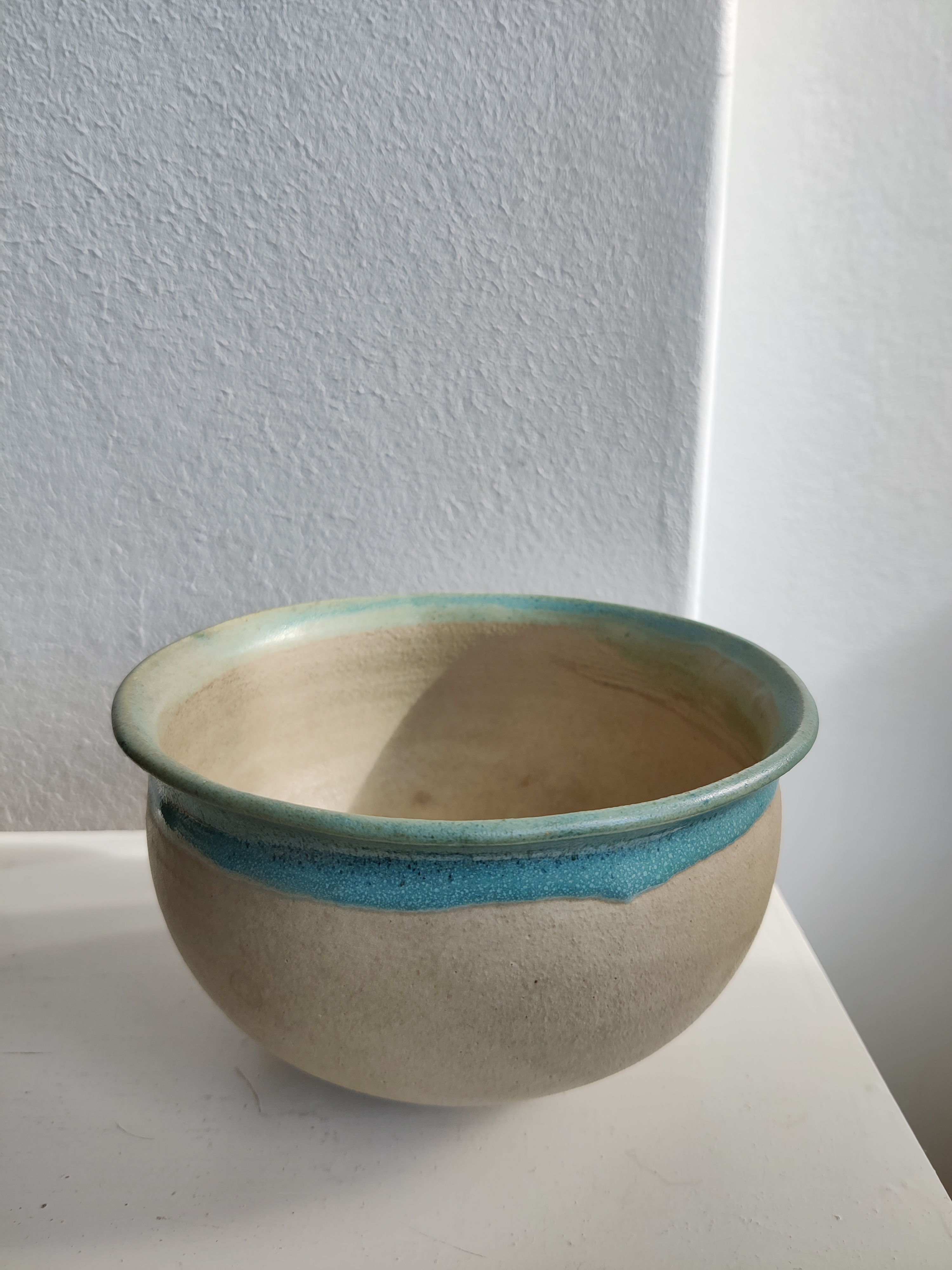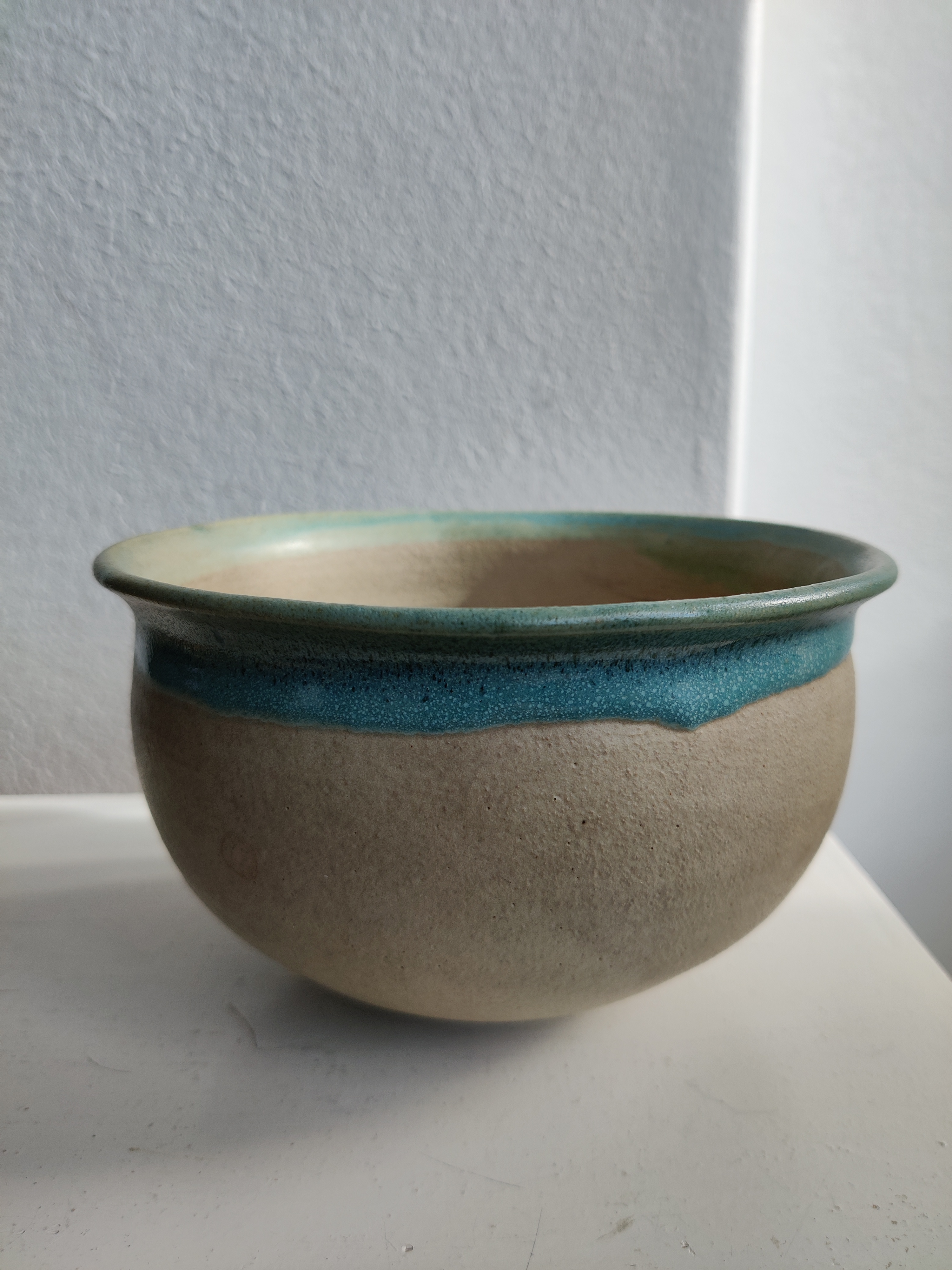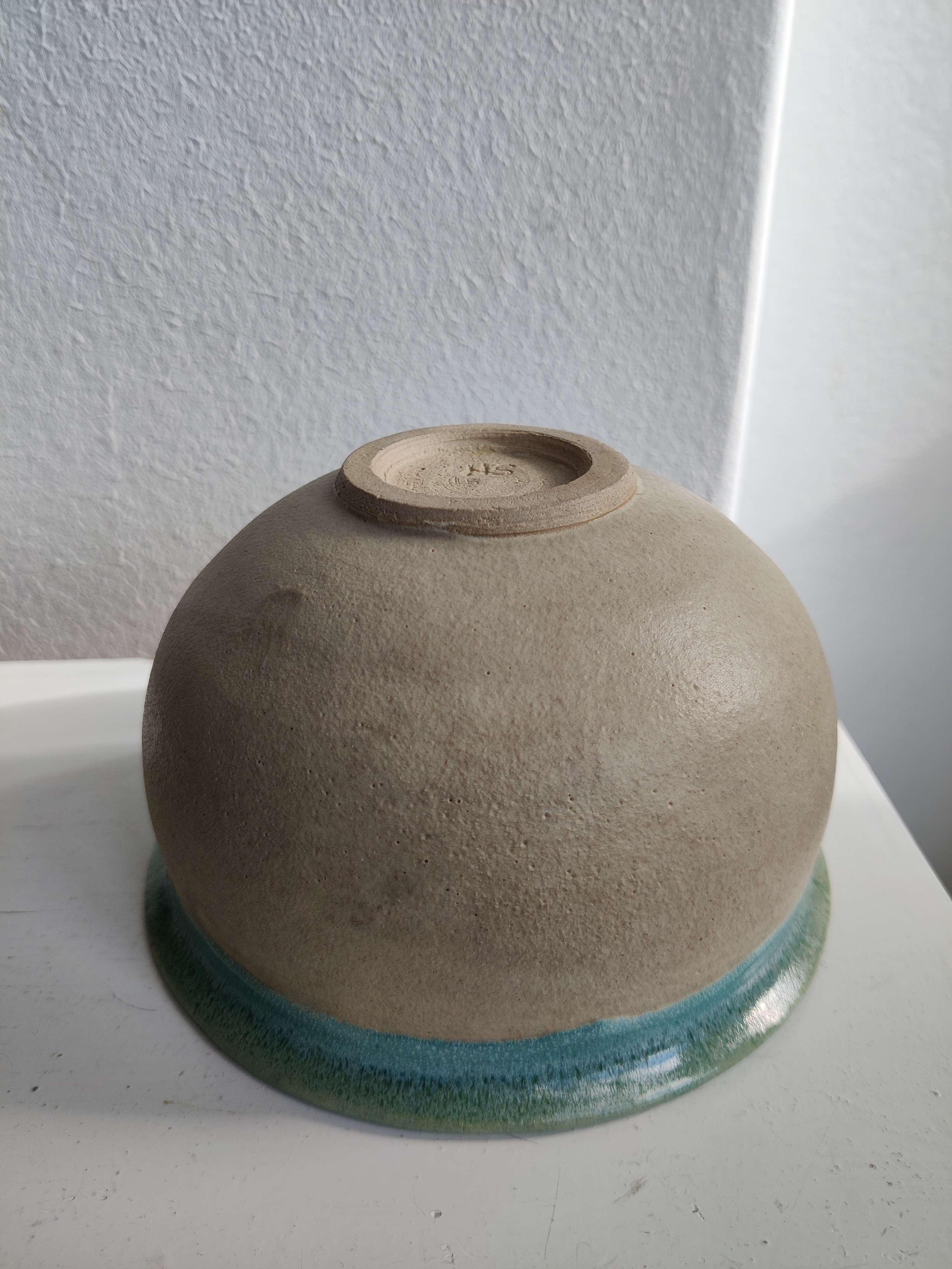 Smuk håndlavet skål i stentøj med gæaseret turkis kant. Den er signeret HS. Mål 14 x 8,5 cm.