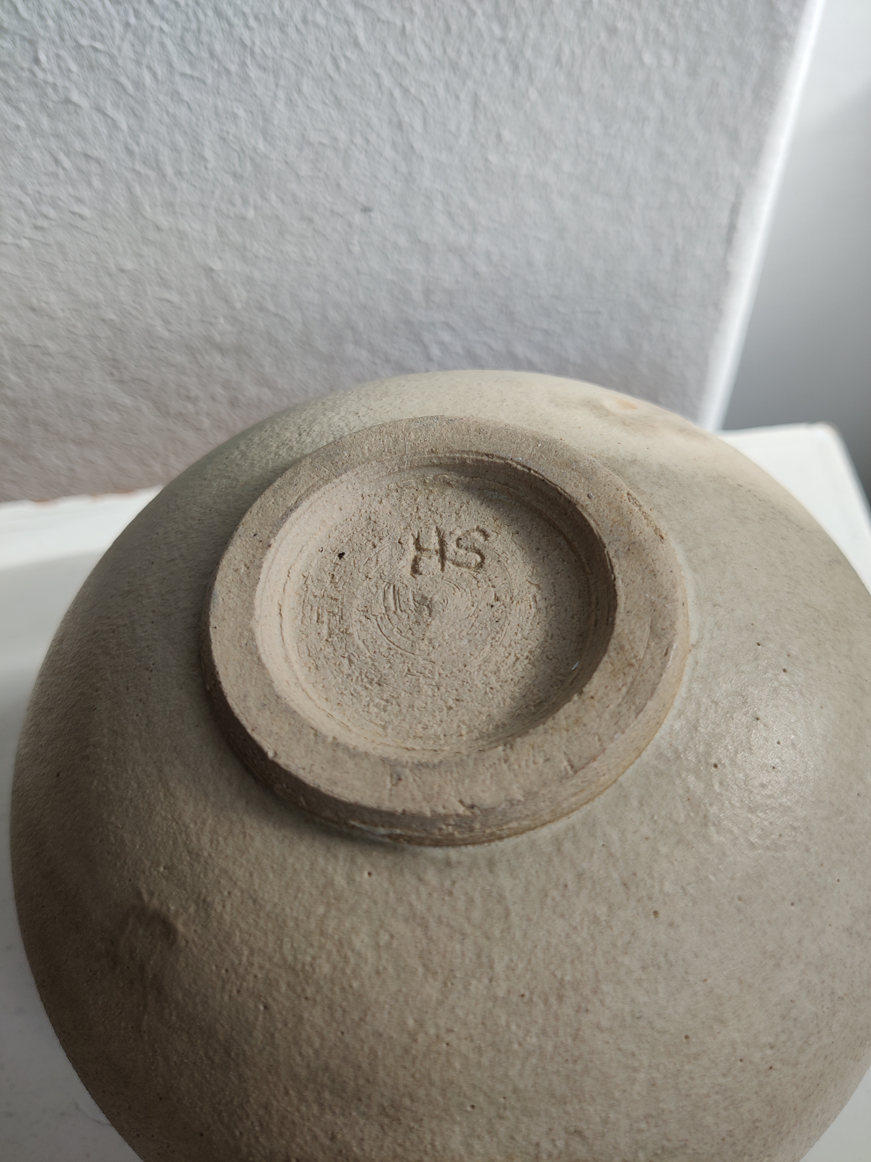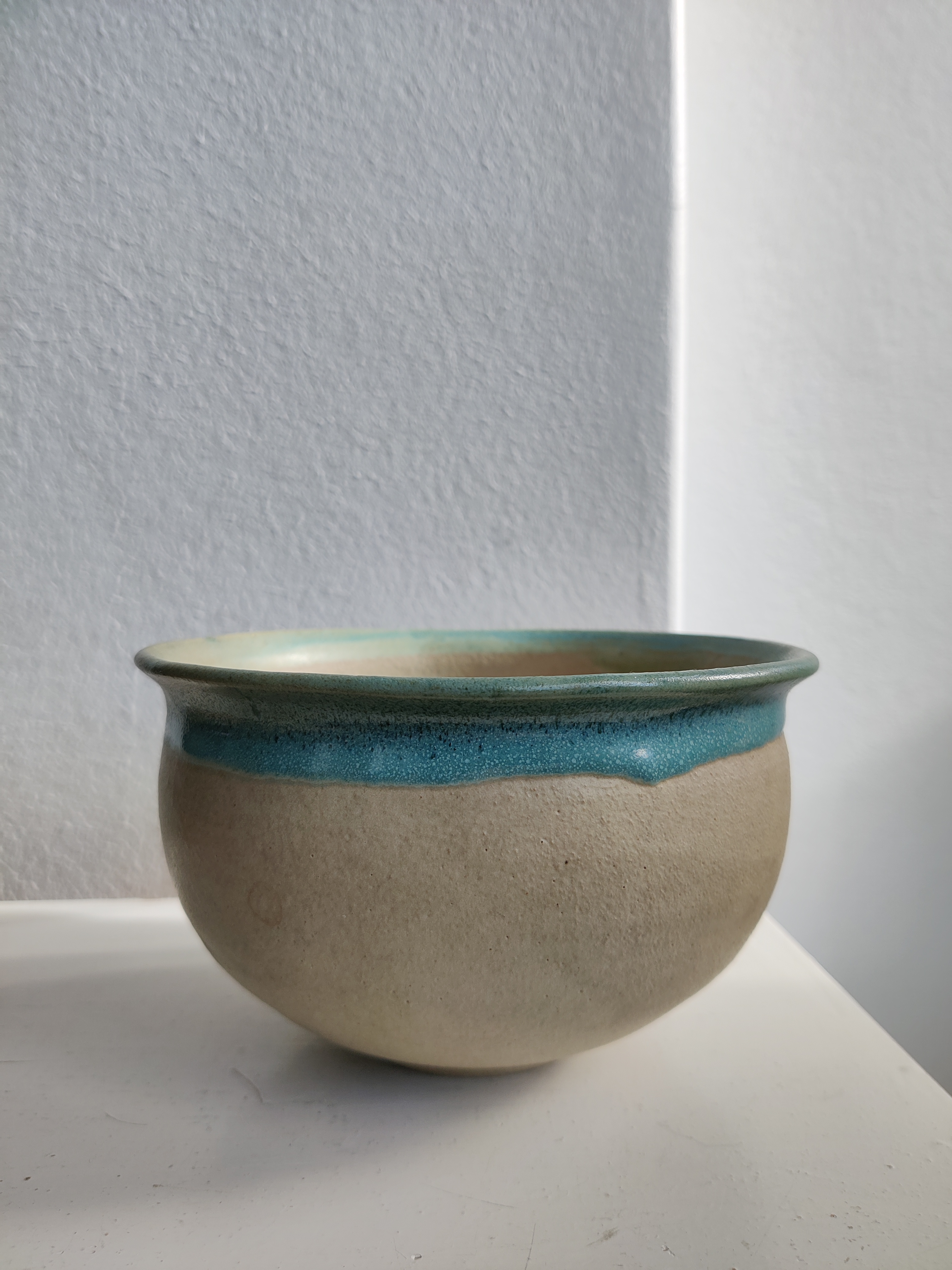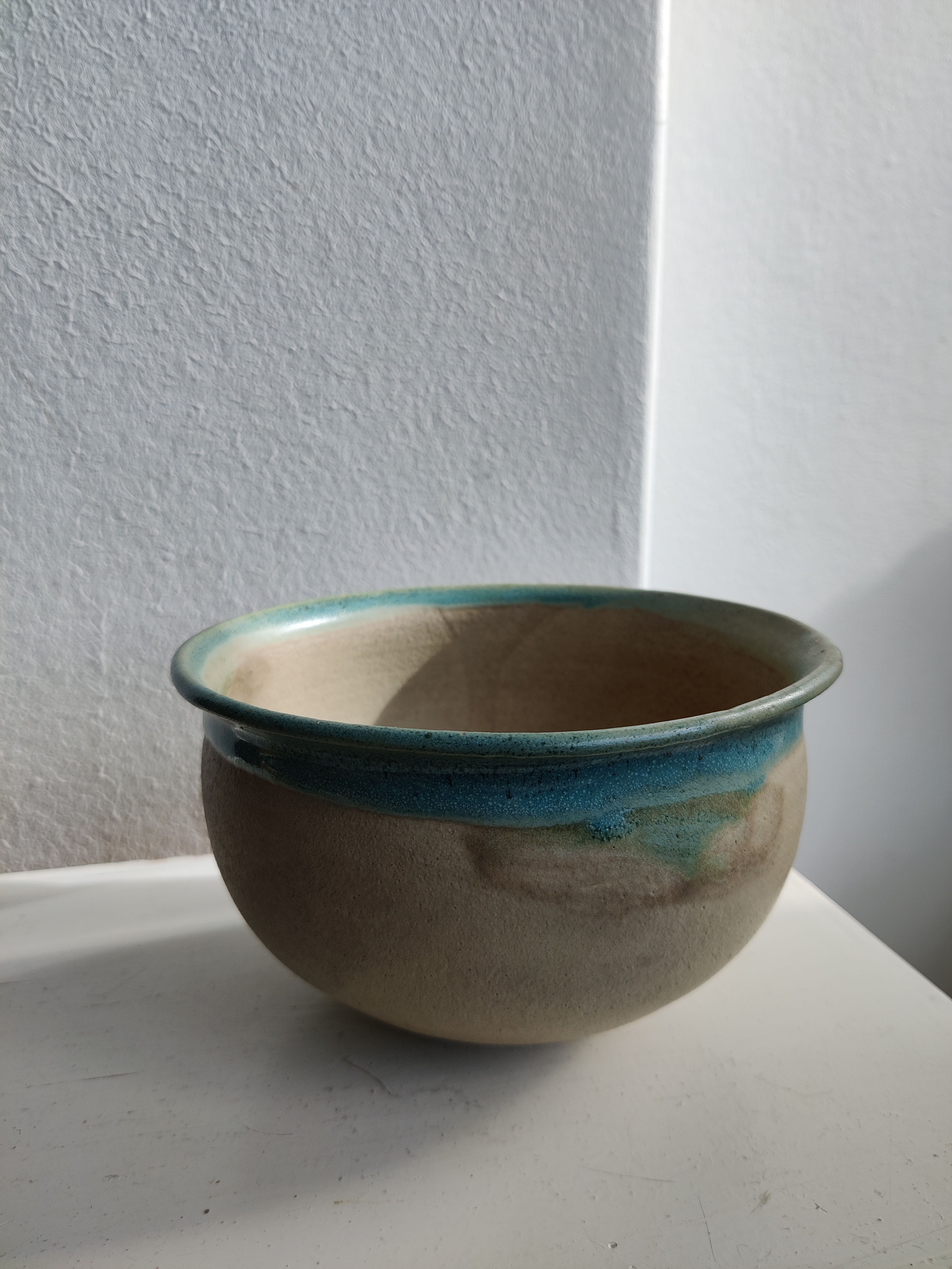 Smuk håndlavet skål i stentøj med gæaseret turkis kant. Den er signeret HS. Mål 14 x 8,5 cm.