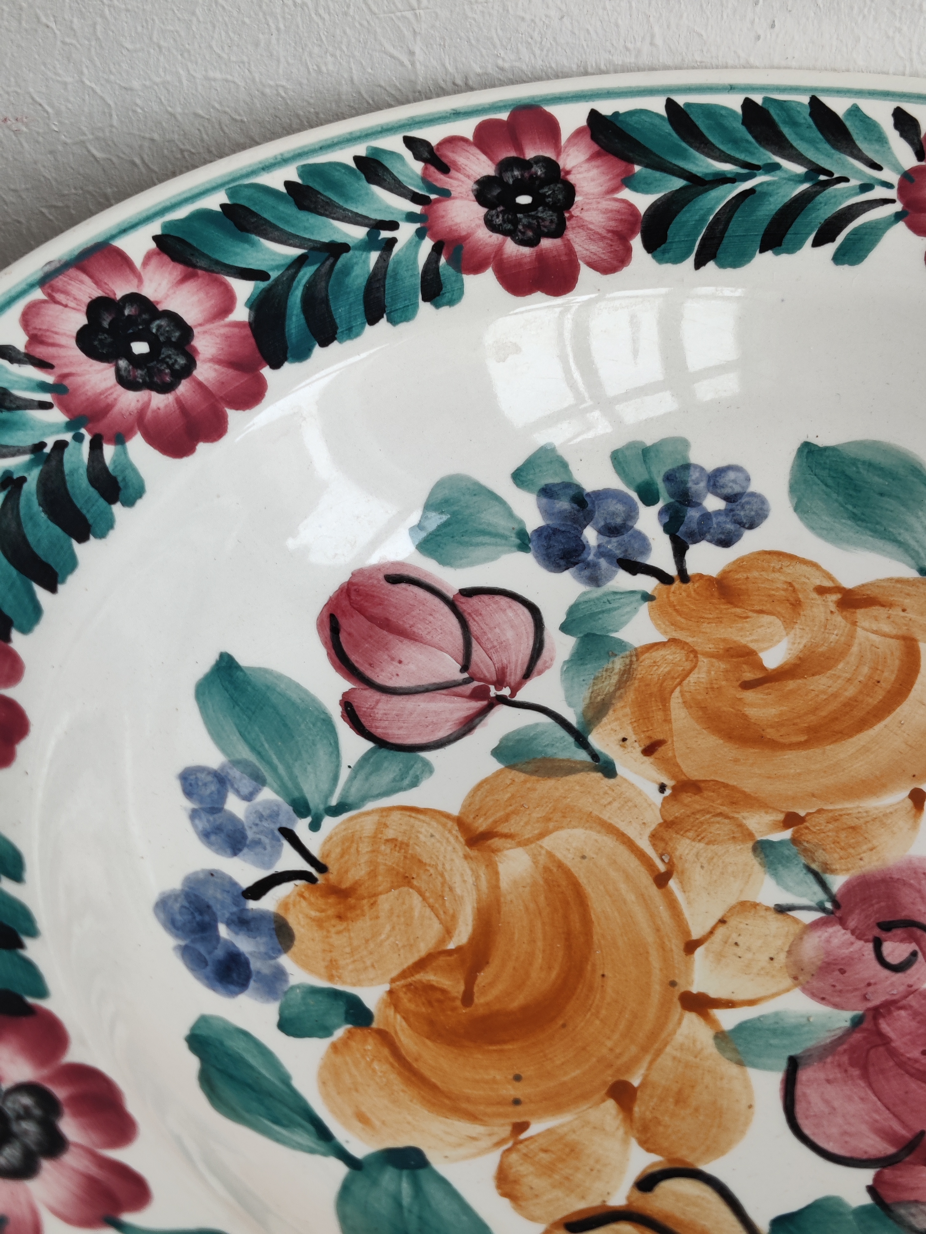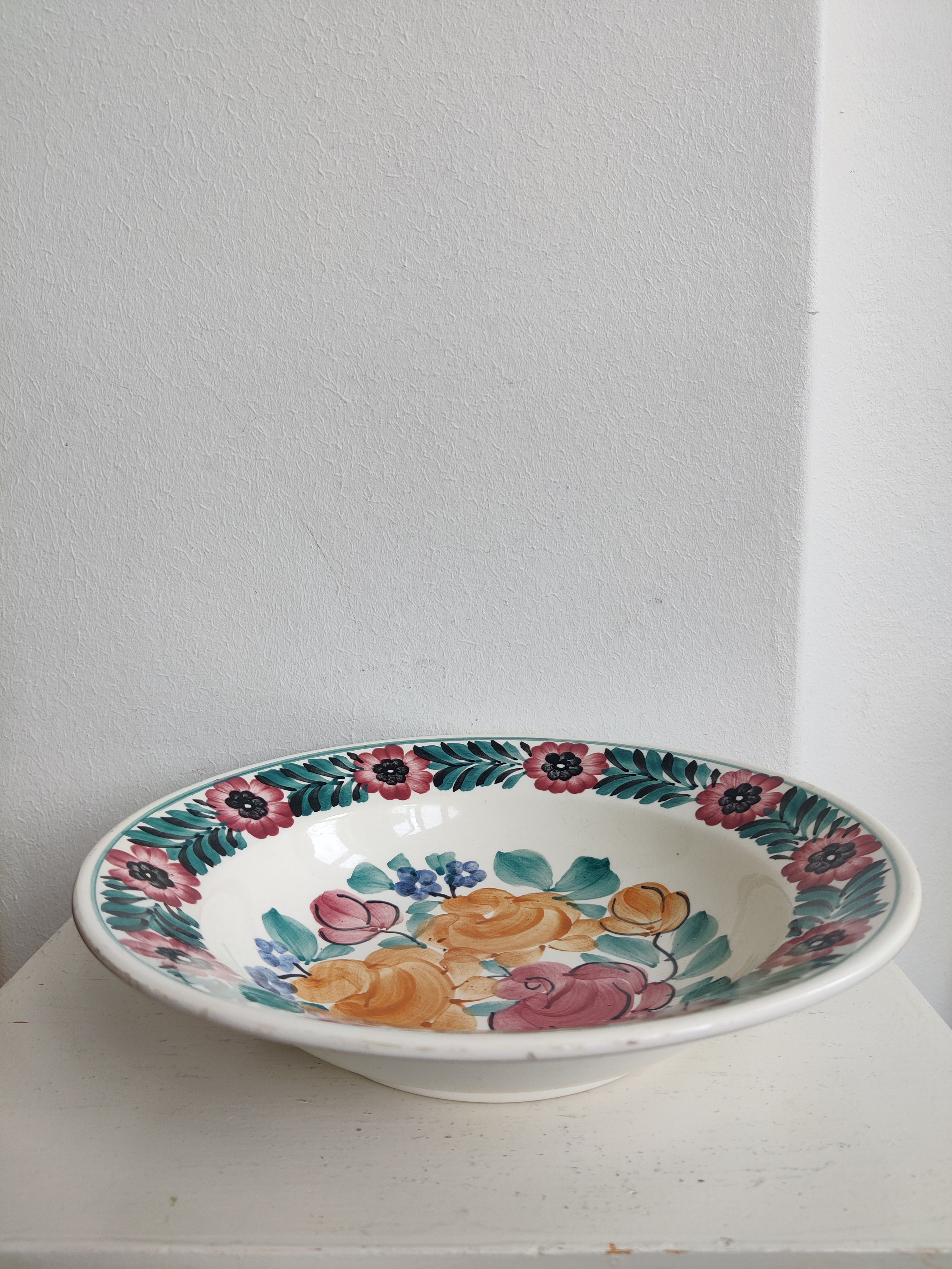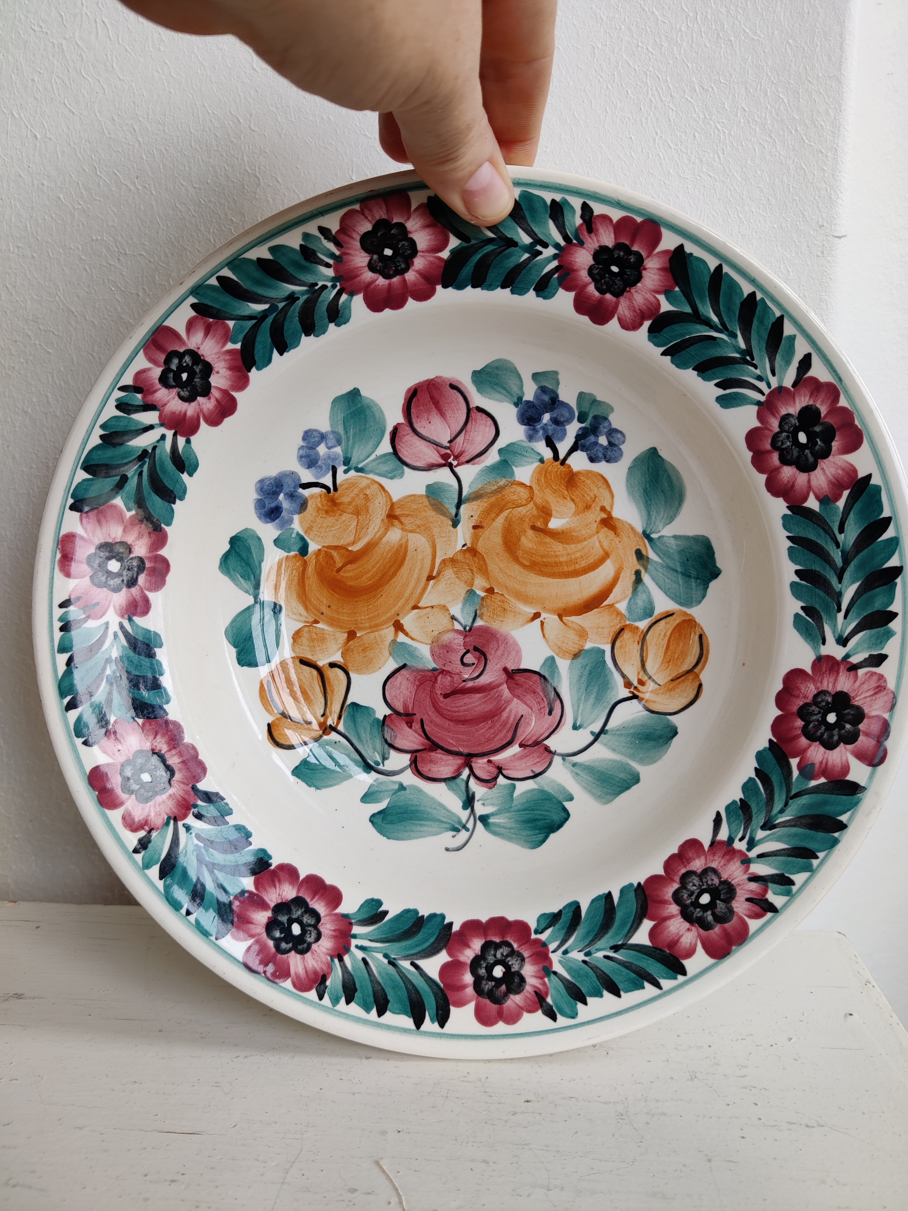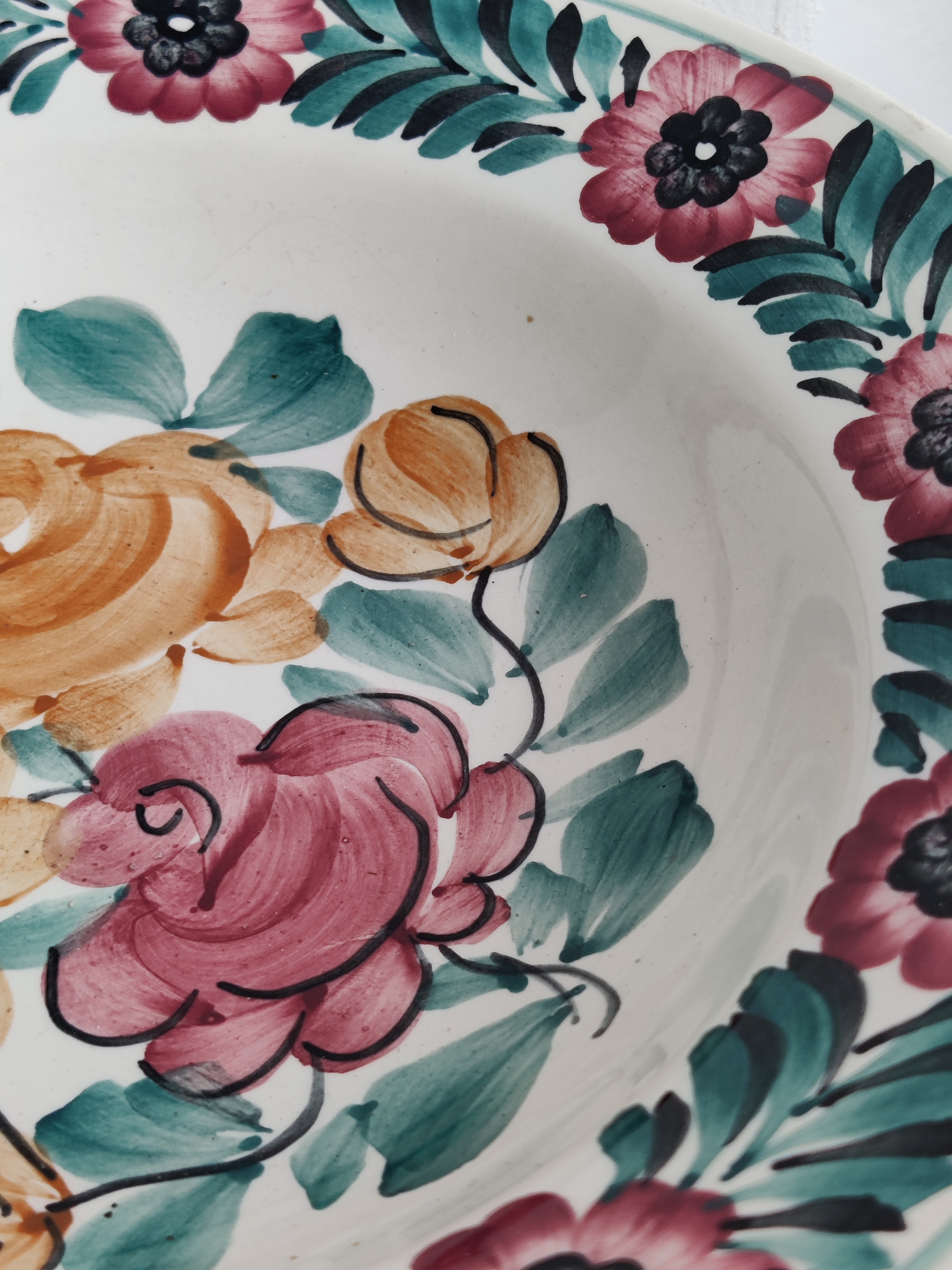 Vintage fajance skål med roser og blomster. Håndmalet og fra 1970'erne. Det kan monteres ophæng bagpå, hvis man hellere vil kigge frem for at bruge. Mål 24 cm.
