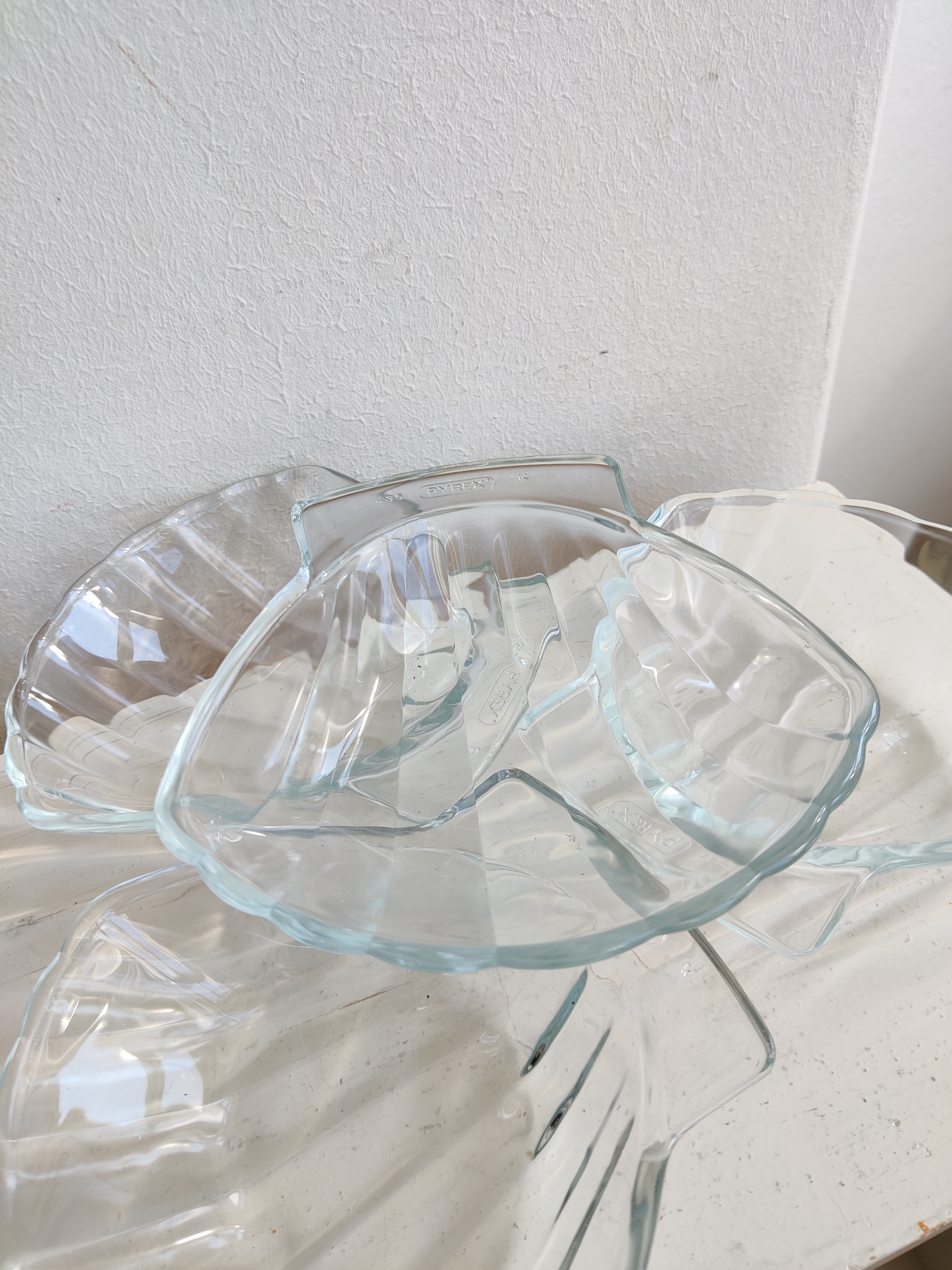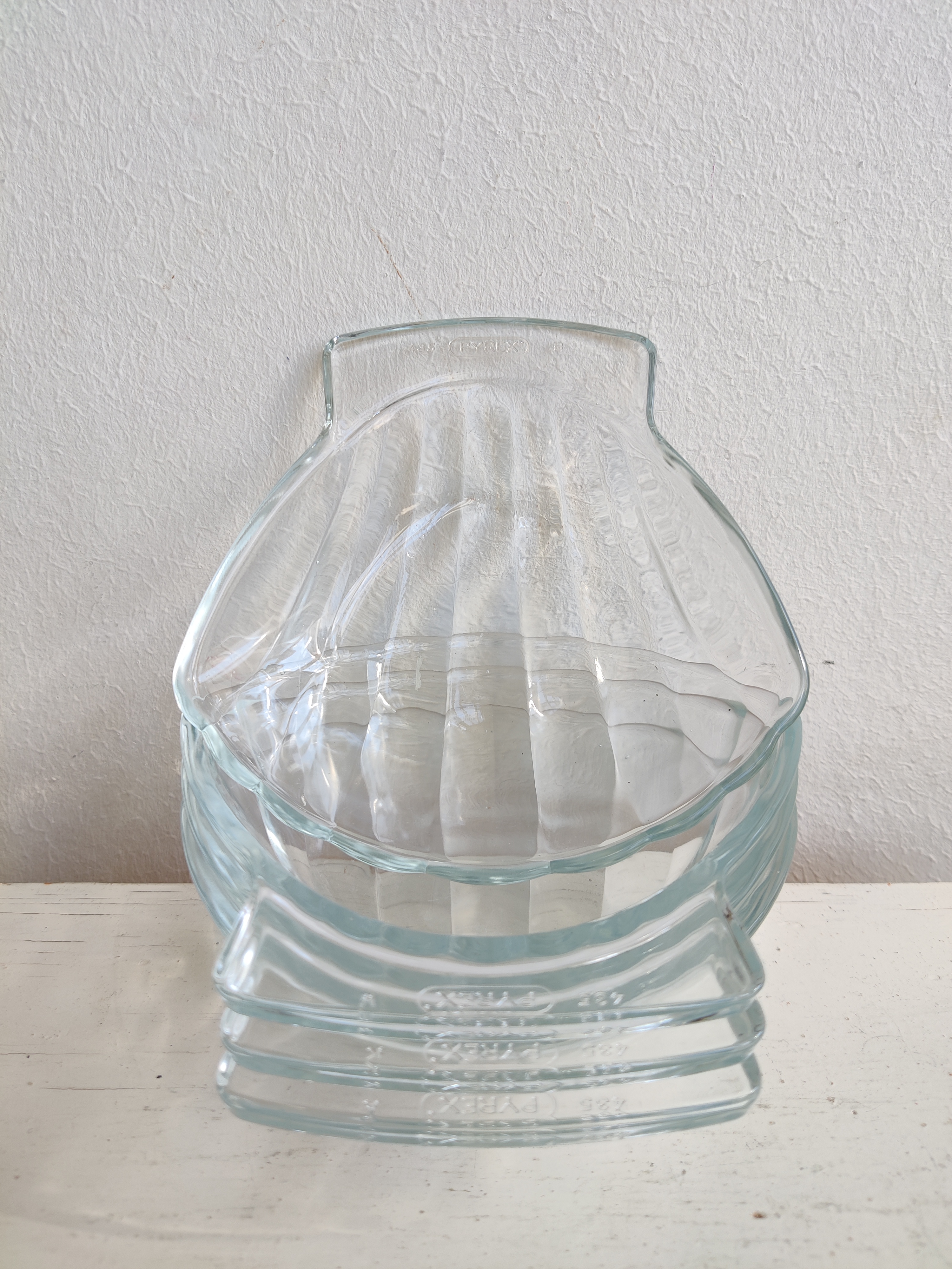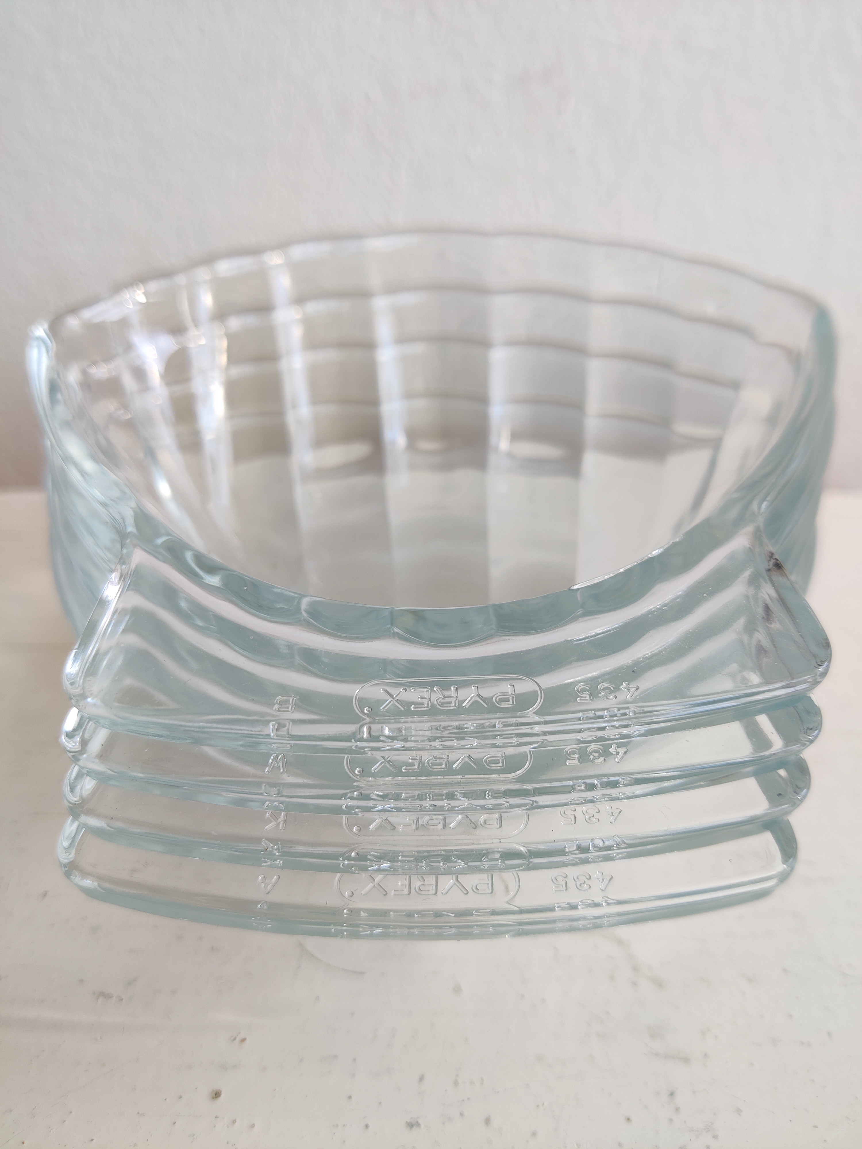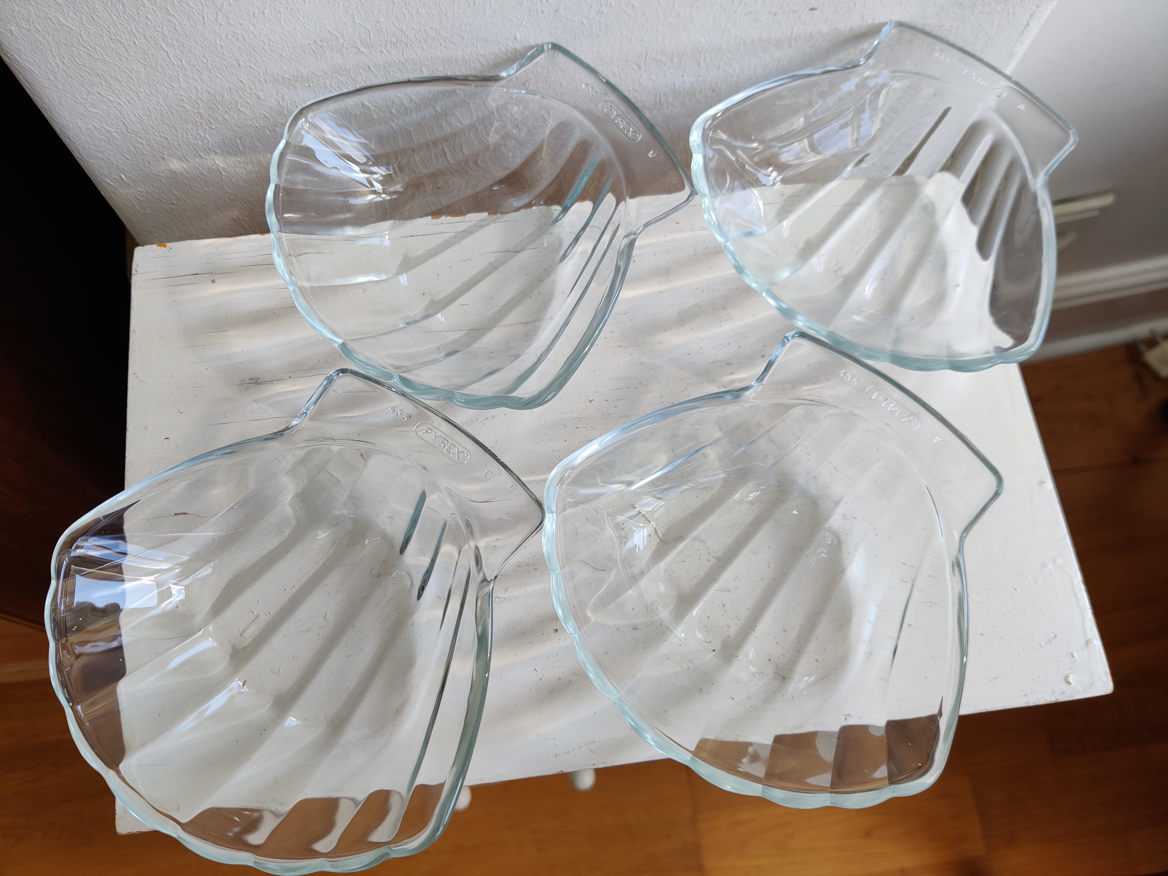 Fire flotte Pyrex muslingeskåle, der kan bruges både til pynt og madlavning - skal du lige gratinere en østers, servere en hjemmerørt aioli til rejerne, eller skal du arrangere dine smykker - så er du landet det rette sted. Mål 13 x 13 cm.