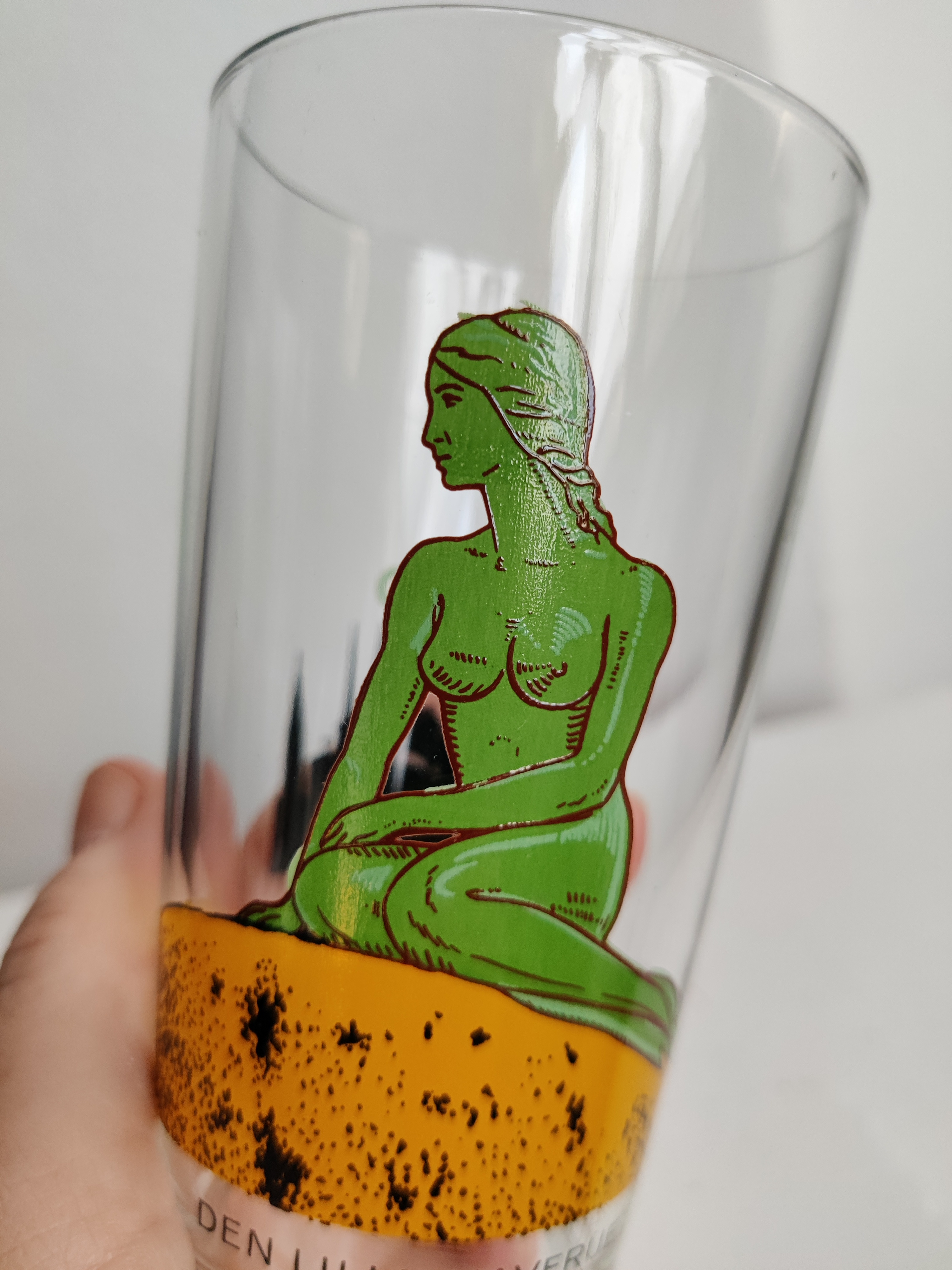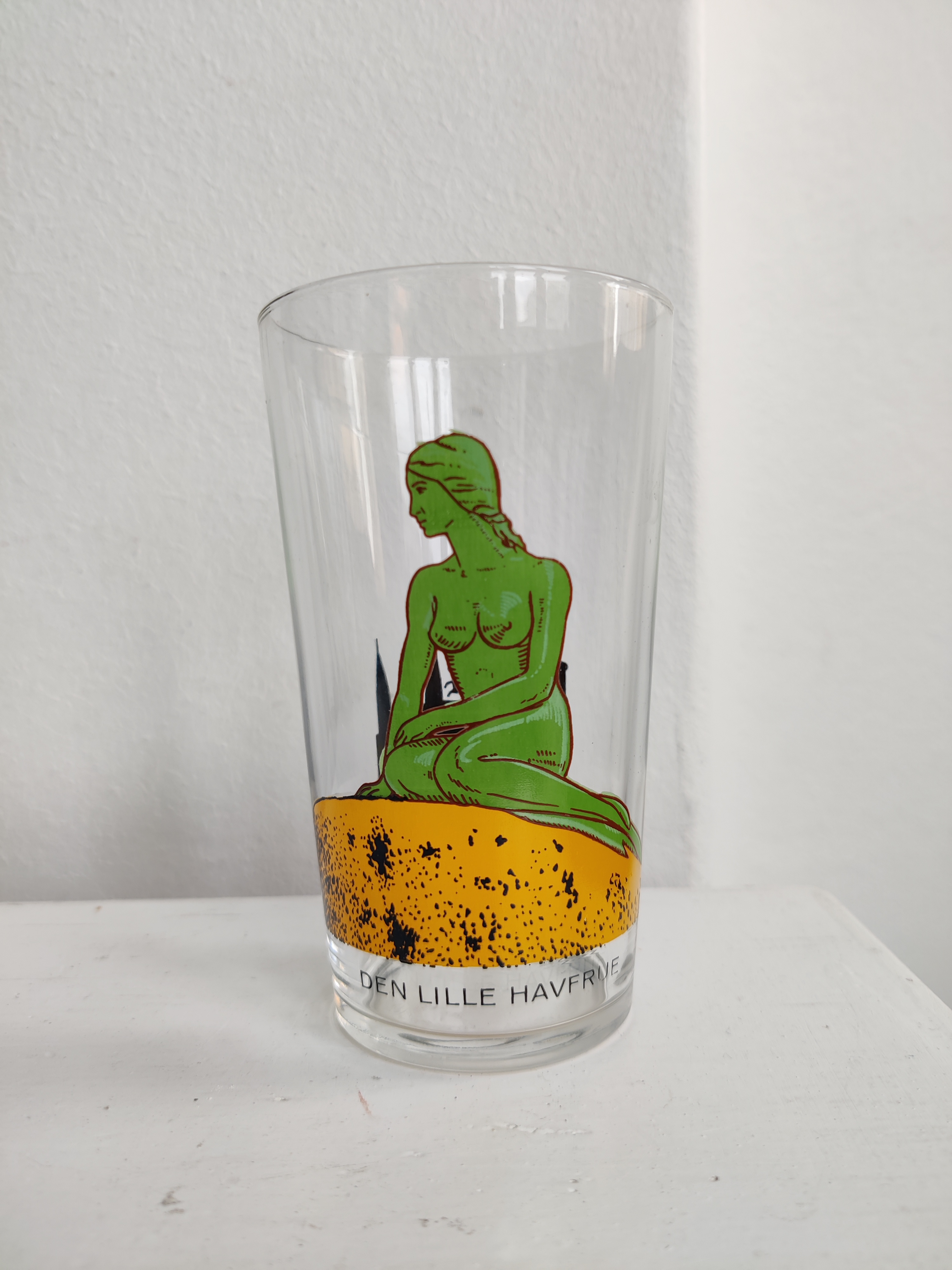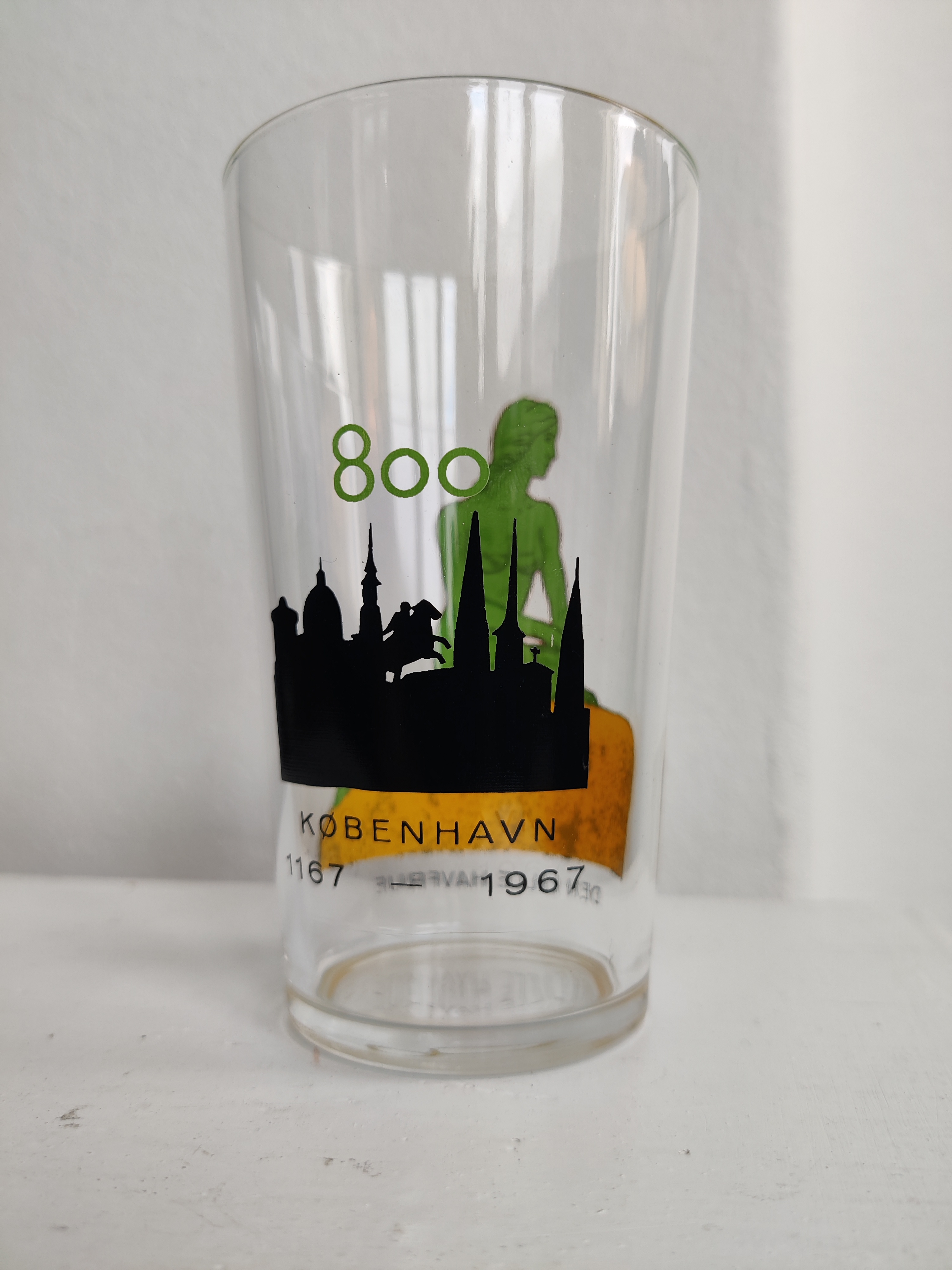 Gammelt souvenirglas i anledning af Københavns 800 års fødselsdag i 1967. Havfruen har holdt sig godt siden da. Meget fint glas til samlingen eller en lille københavnersjus. 12 cm højt.
