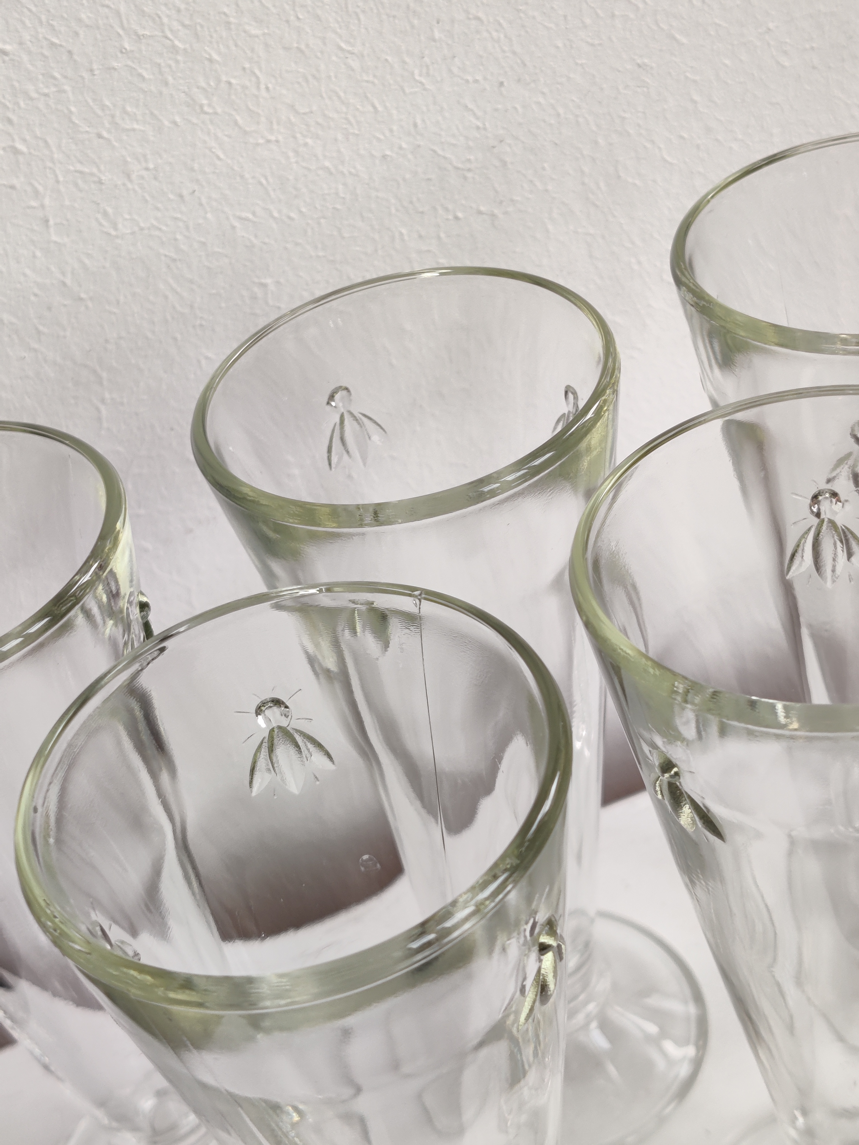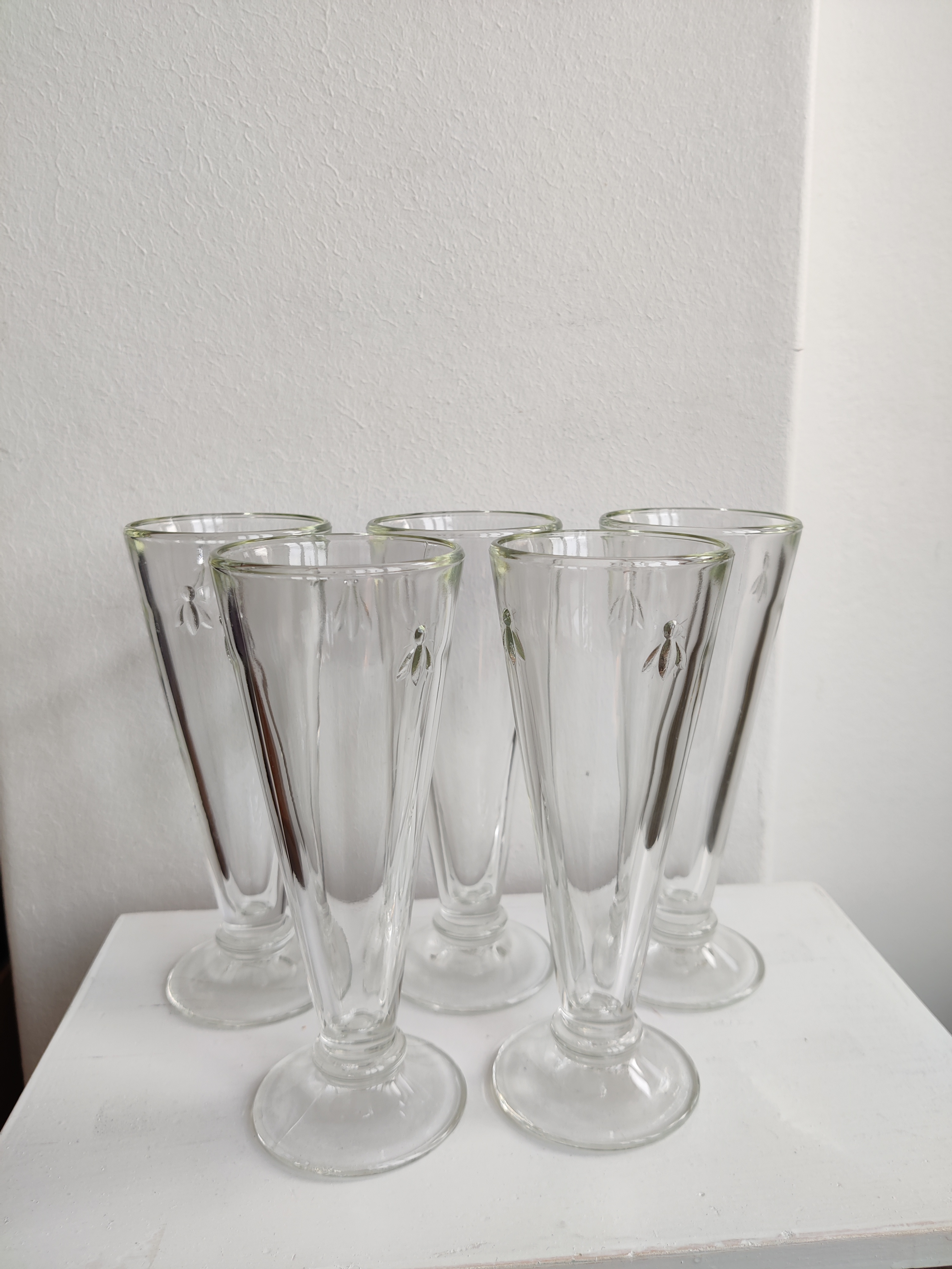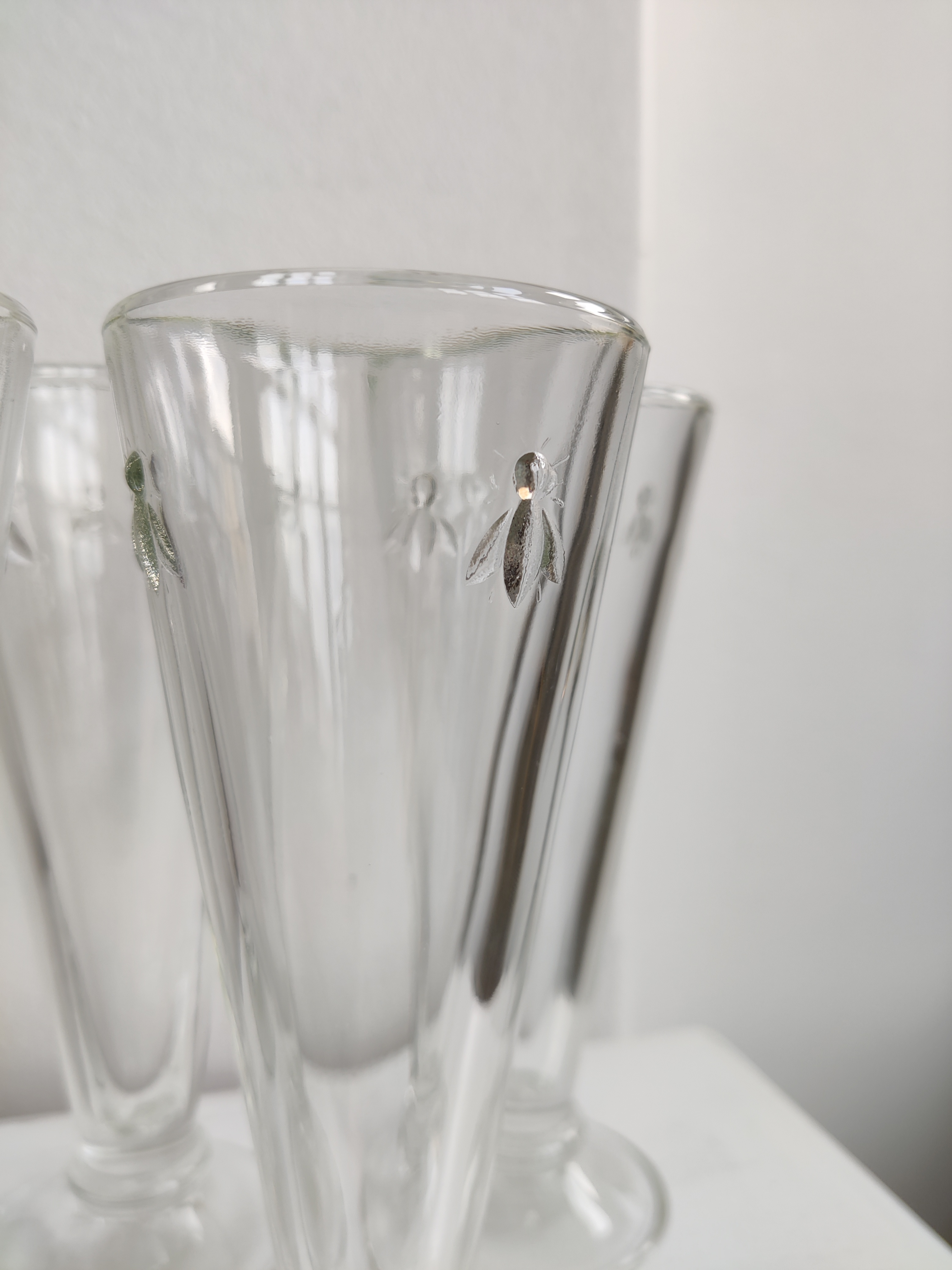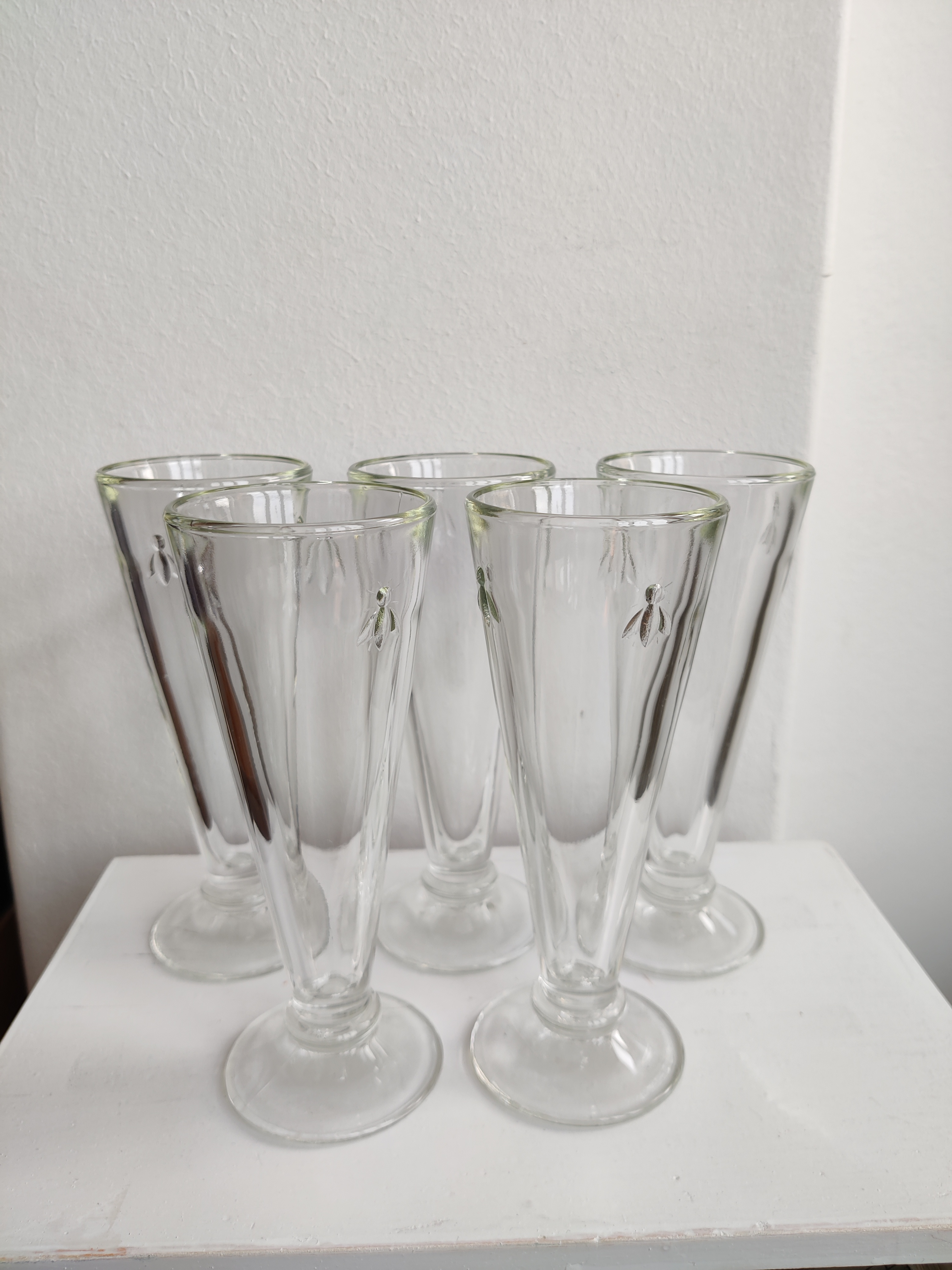 5 fine franske Abeille champagneglas fra La Rochère, signeret Paris Musées. Glassene er en museumsreproduktion af champagnefløjter fra Napoleons tid, og bien (abeille) findes på et væld af glastyper fra La Rochère. Bien var den lille kejsers selvvalgte symbol på sin egen unikke storhed og det franske folks arbejdsomhed. Oui oui, monsieur. De måler 17 cm i højden.