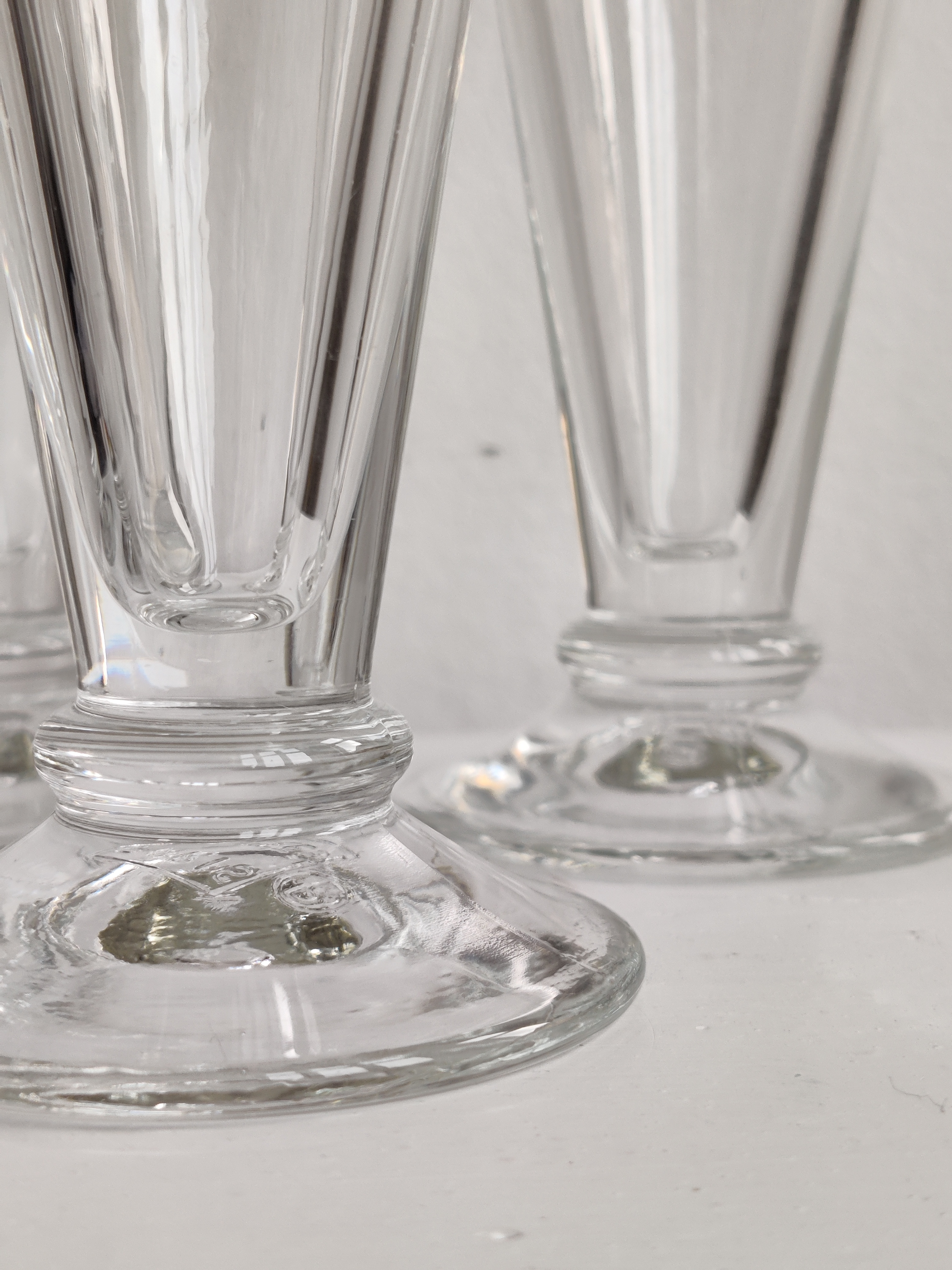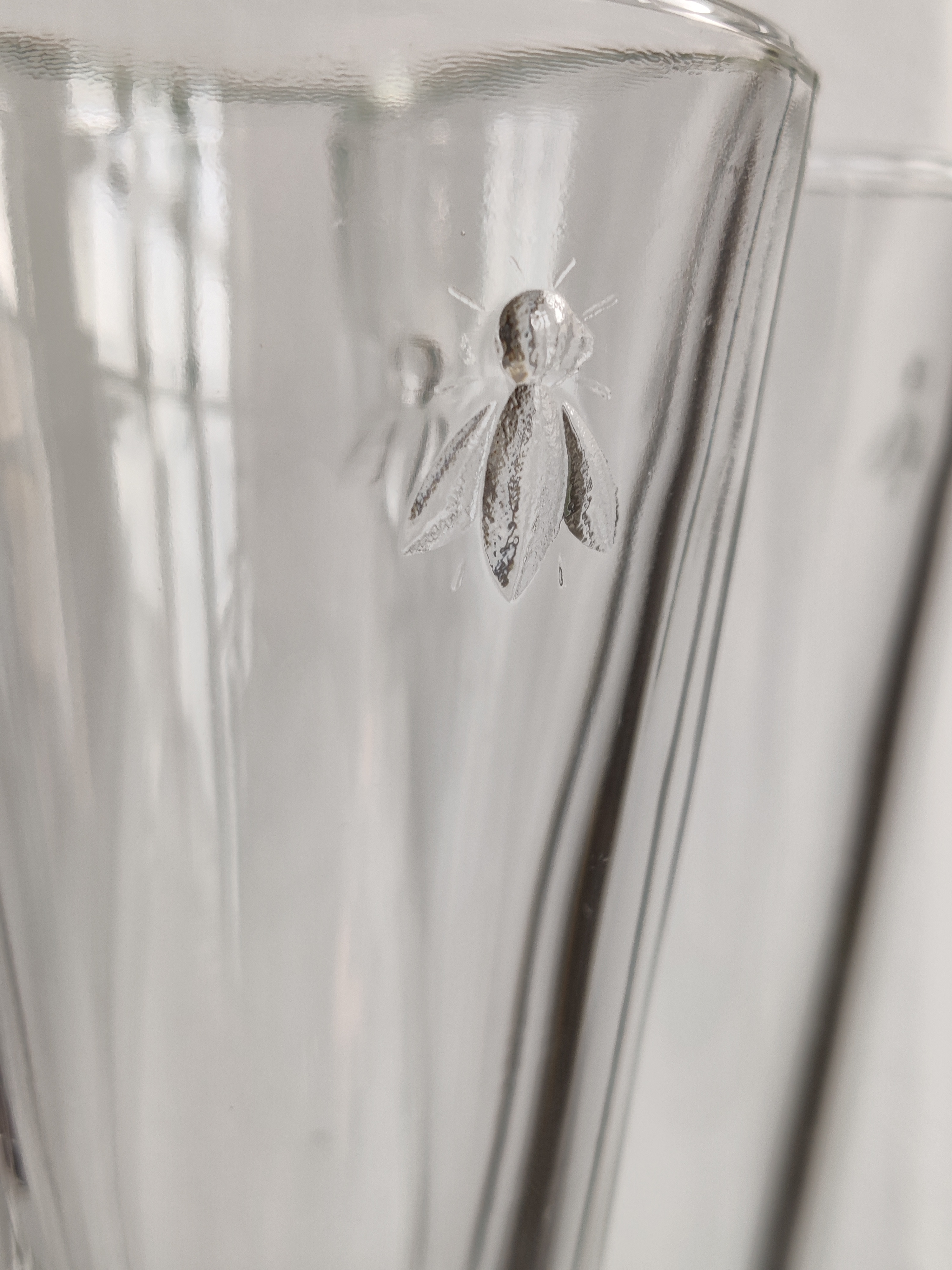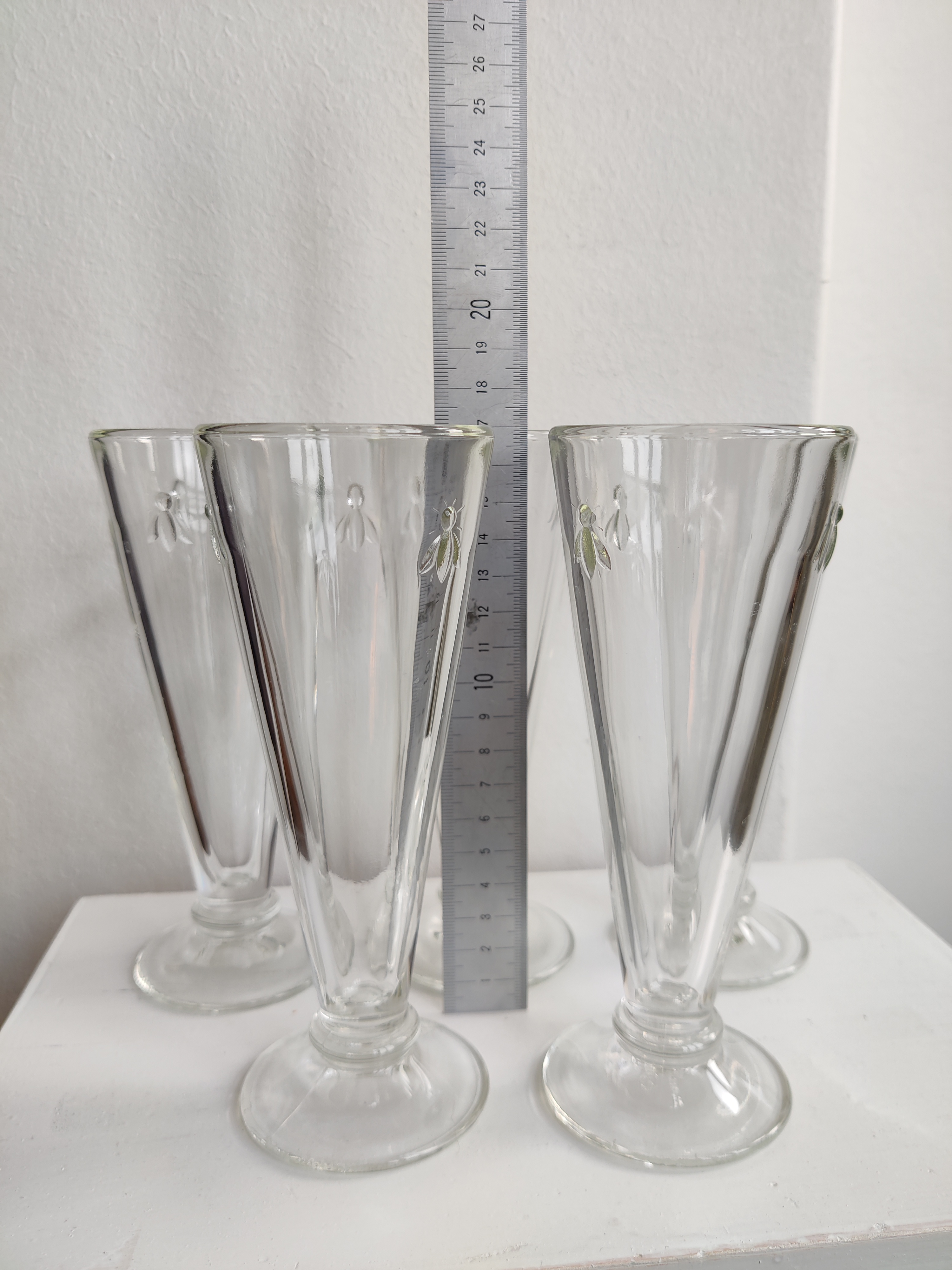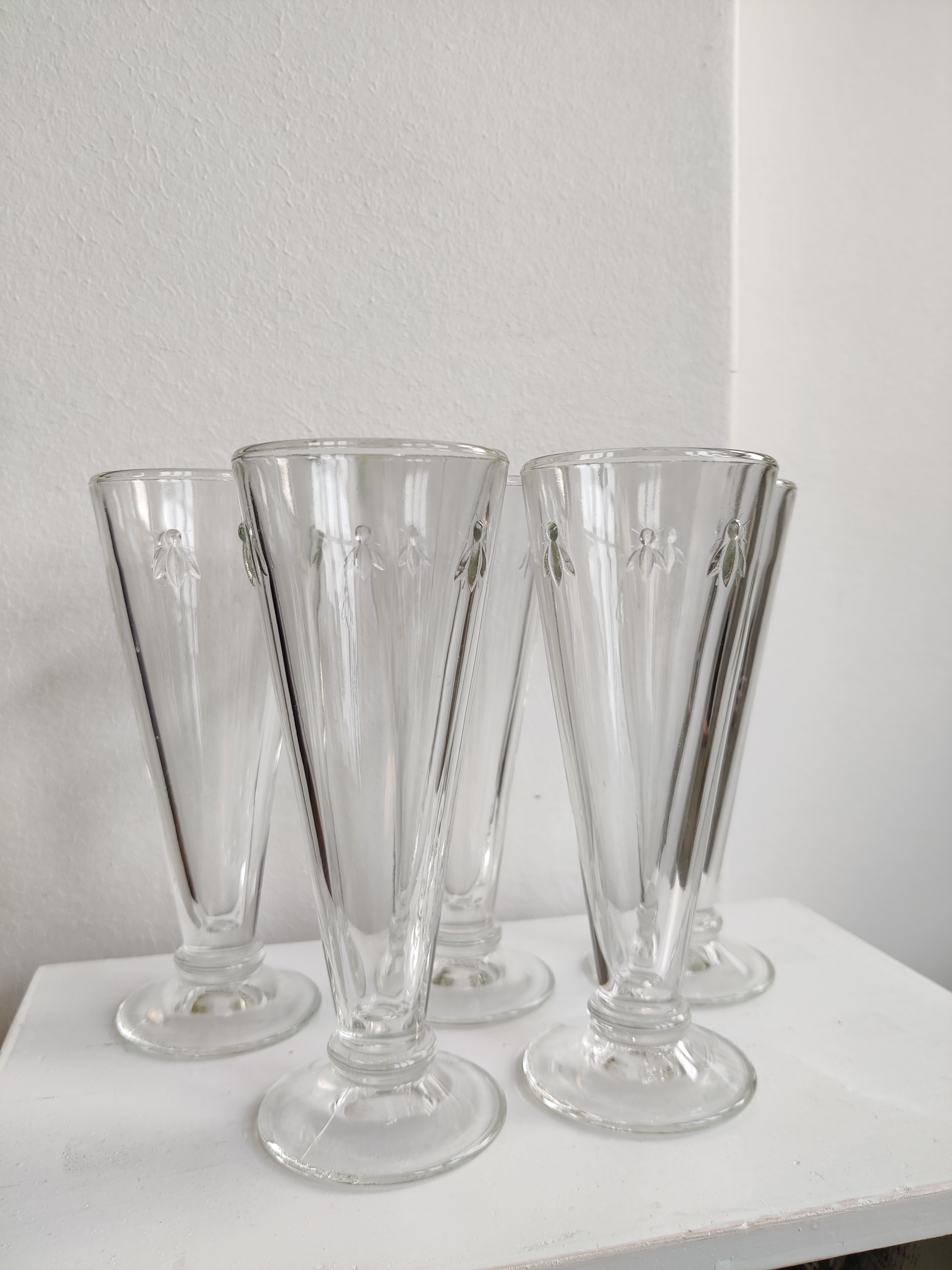 5 fine franske Abeille champagneglas fra La Rochère, signeret Paris Musées. Glassene er en museumsreproduktion af champagnefløjter fra Napoleons tid, og bien (abeille) findes på et væld af glastyper fra La Rochère. Bien var den lille kejsers selvvalgte symbol på sin egen unikke storhed og det franske folks arbejdsomhed. Oui oui, monsieur. De måler 17 cm i højden.