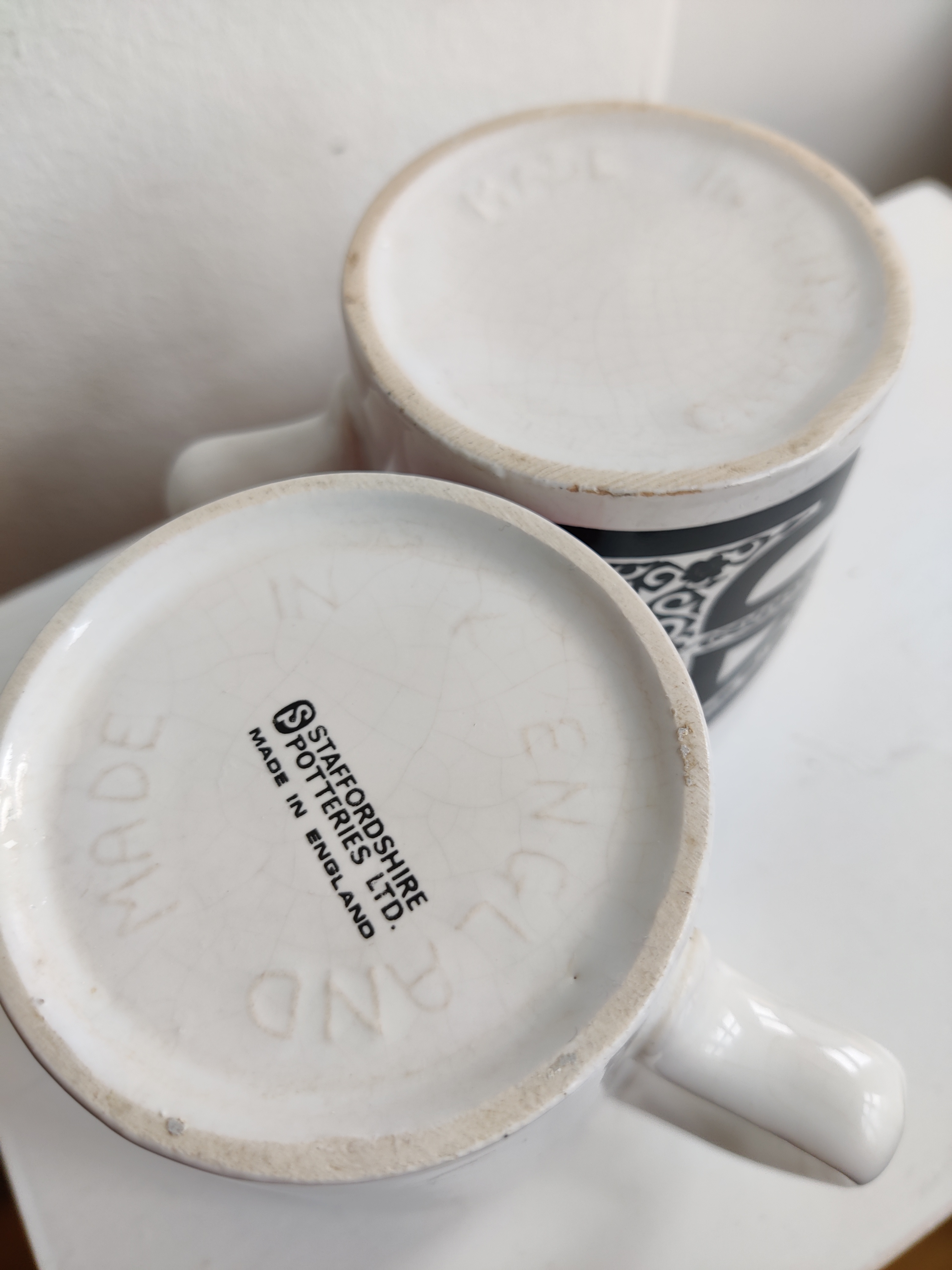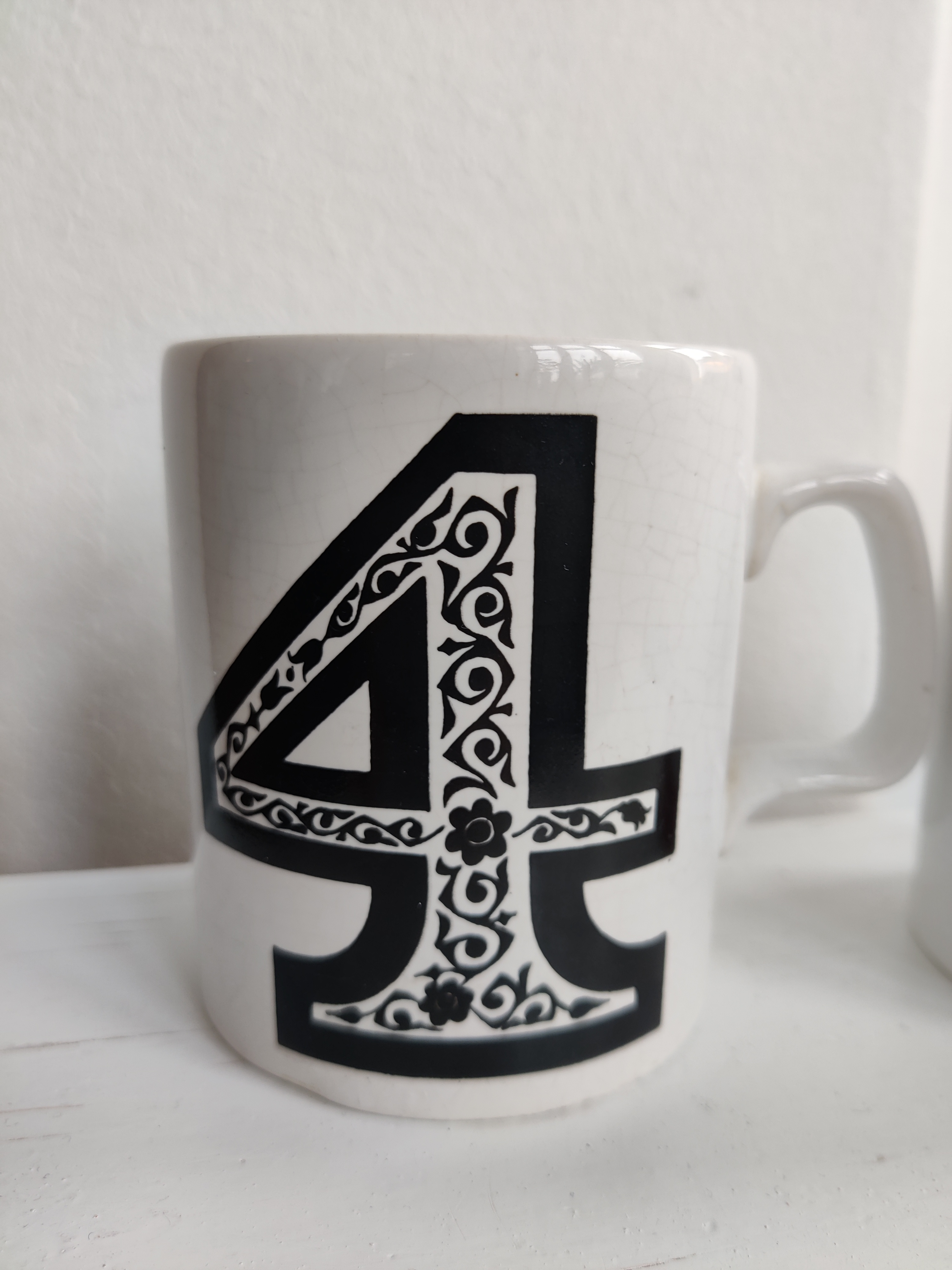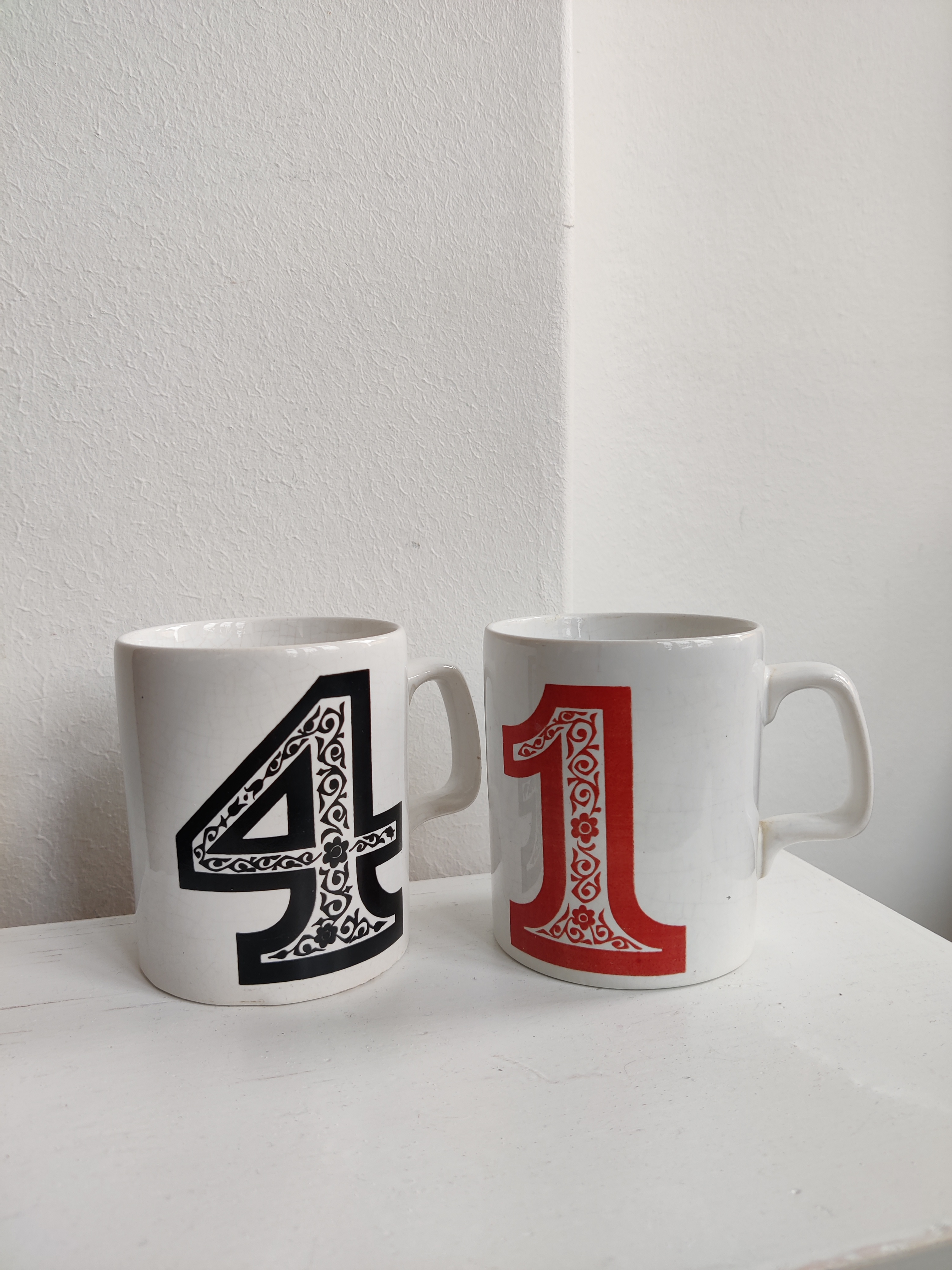 Staffordshire England krus fra 1970'erne med tallene 1 og 4. Gode gaver til en 41-års fødselar - eller måske er det dine lykketal? Sælges samlet.