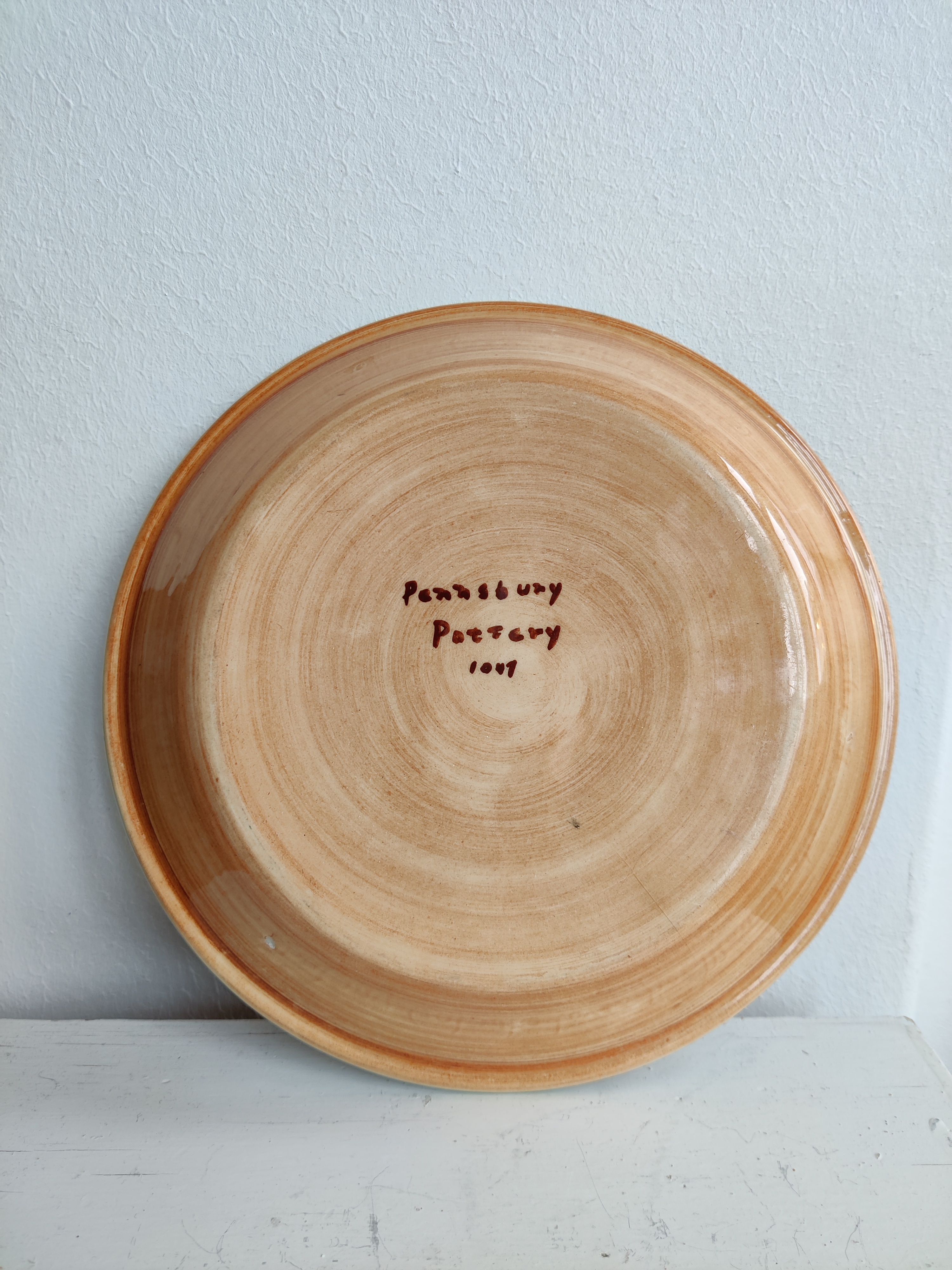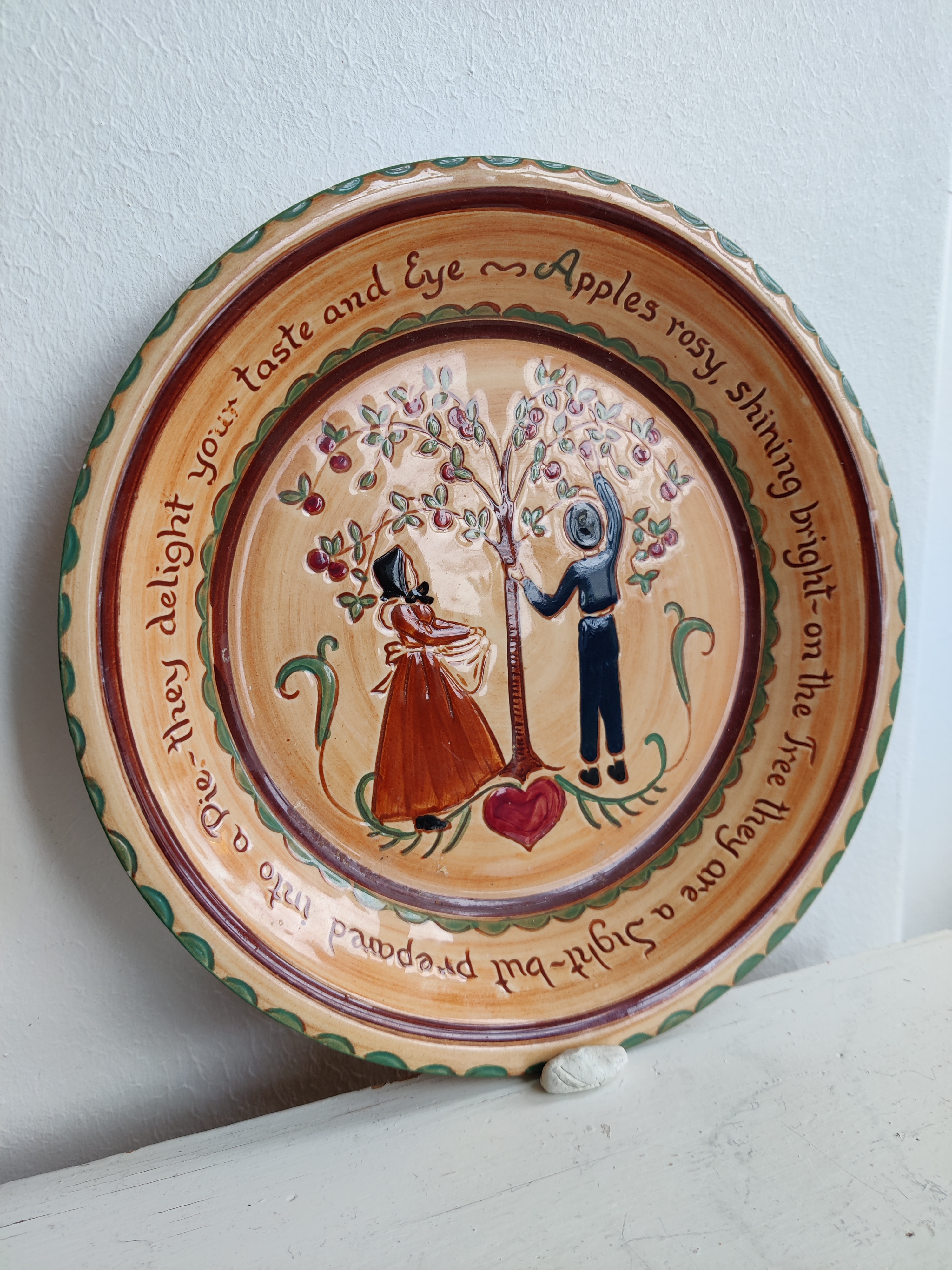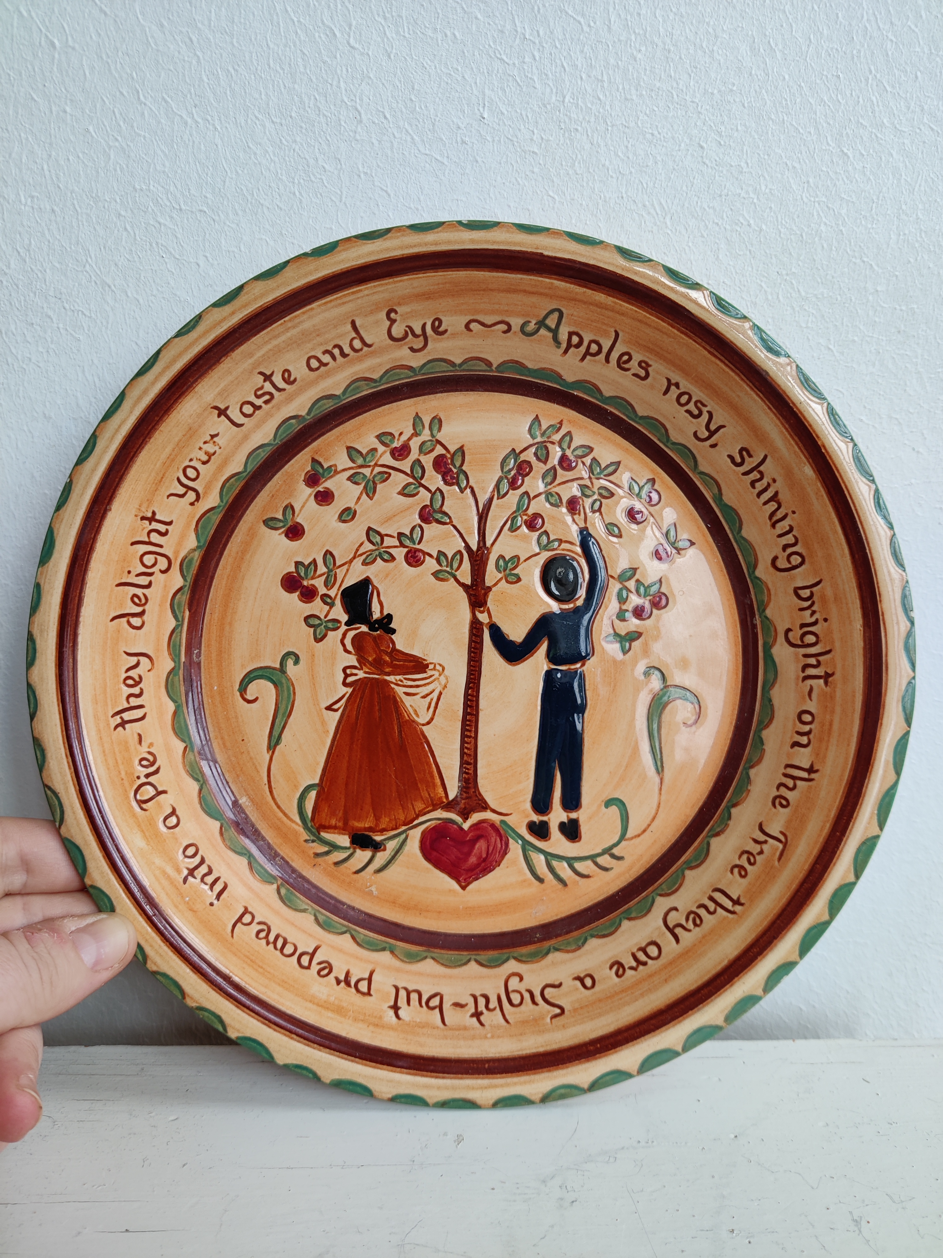 Pennsbury Pottery var et amerikansk pottemagerværksted, der kun fandtes i 20 år mellem 1950 og 1970, indtil det blev ødelagt i en brand. Motiverne var folksy, hyggelige og naturlige - her et par, der plukker æbler til deres næste æbletærte. Meget fint. Diameter 23 cm.