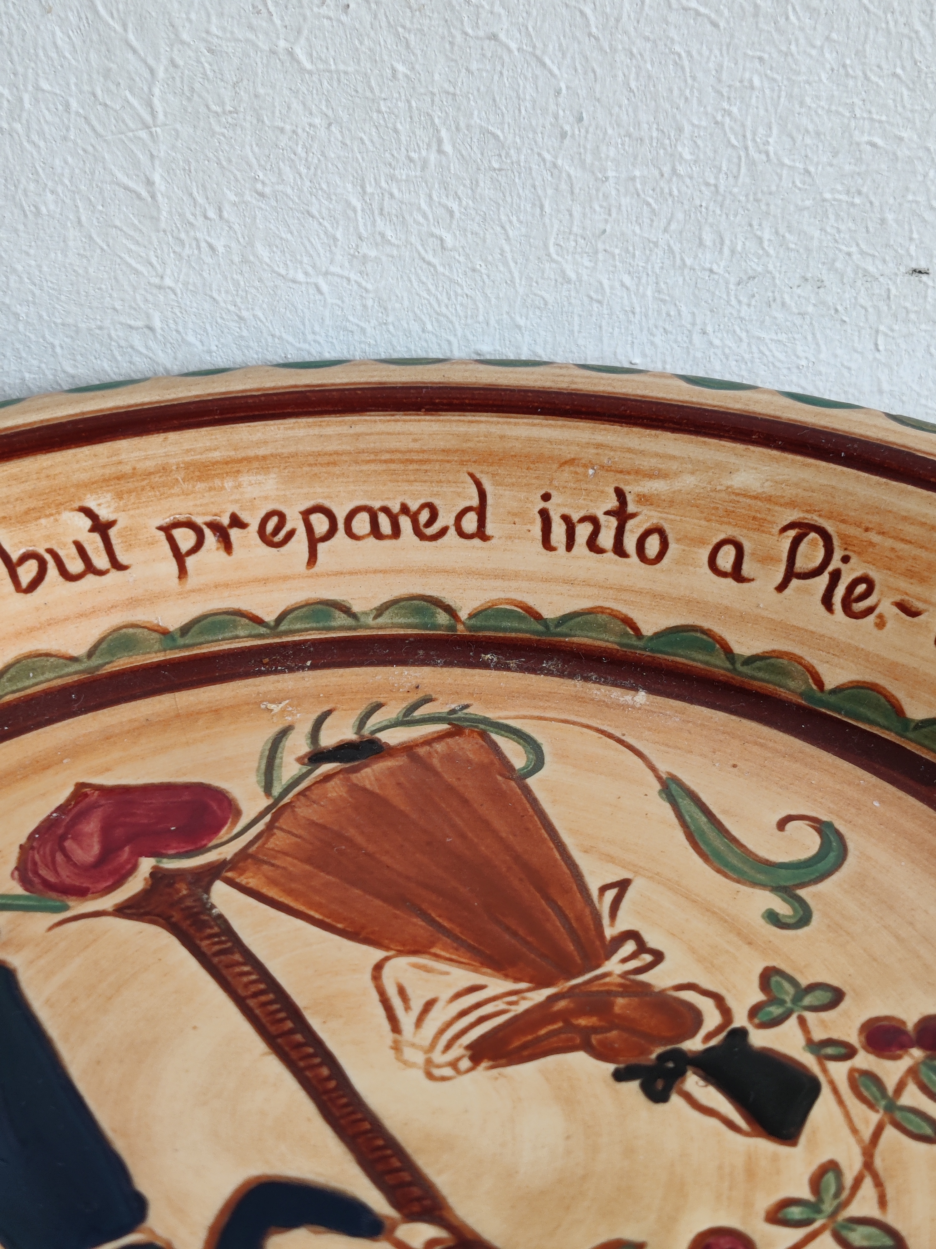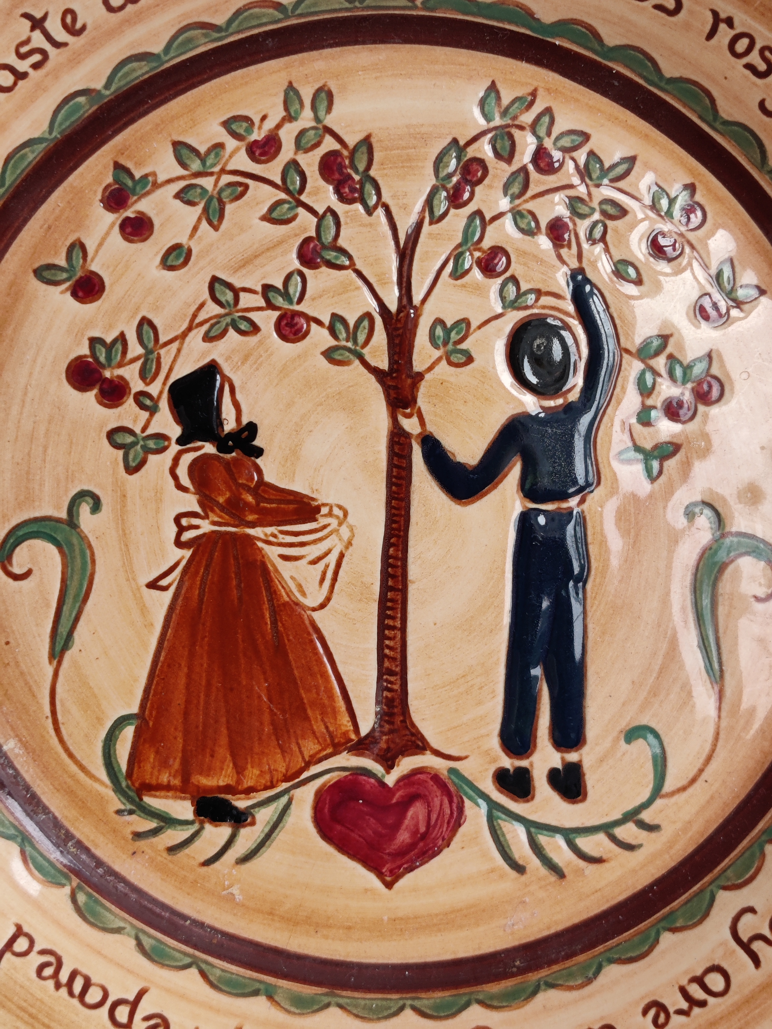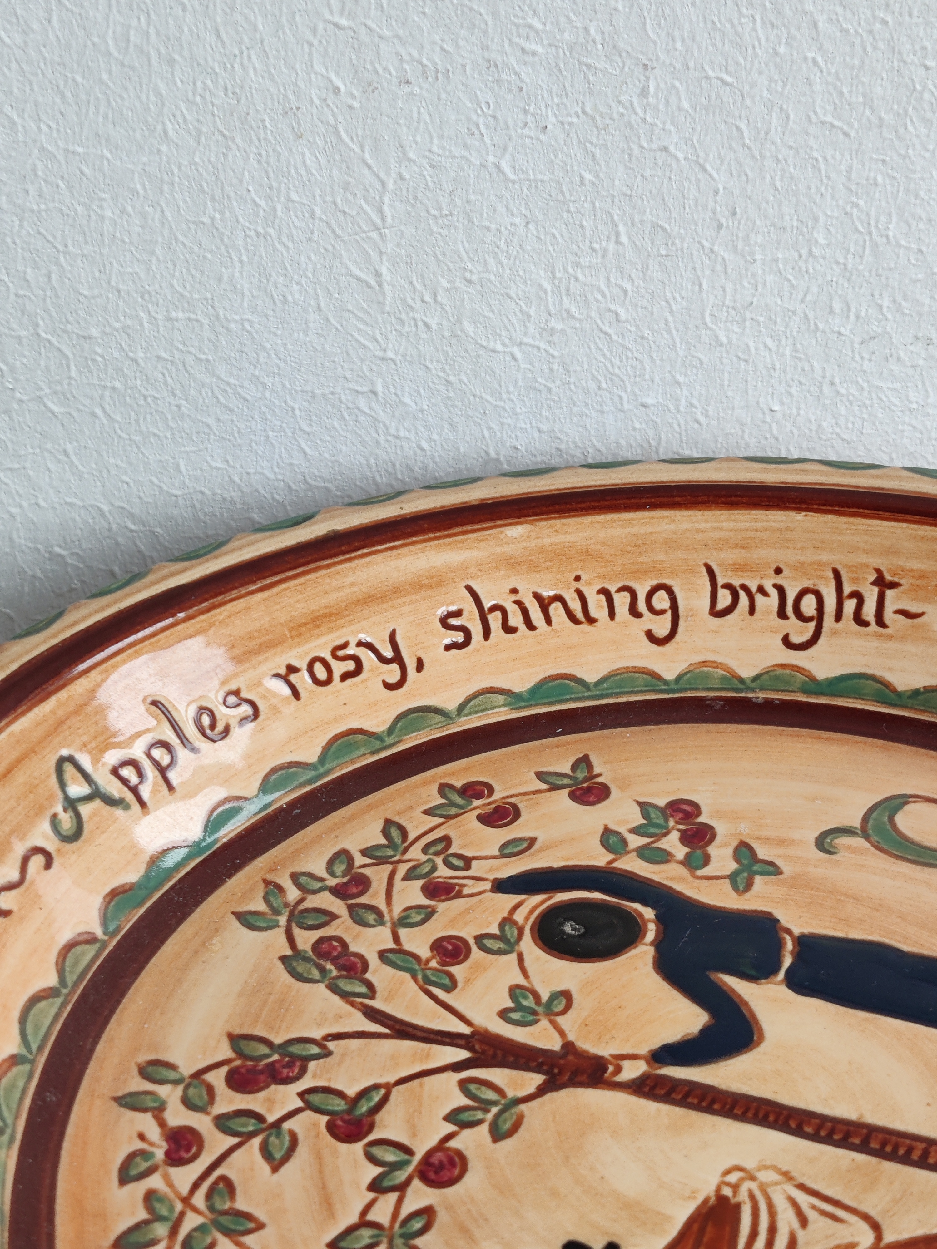 Pennsbury Pottery var et amerikansk pottemagerværksted, der kun fandtes i 20 år mellem 1950 og 1970, indtil det blev ødelagt i en brand. Motiverne var folksy, hyggelige og naturlige - her et par, der plukker æbler til deres næste æbletærte. Meget fint. Diameter 23 cm.