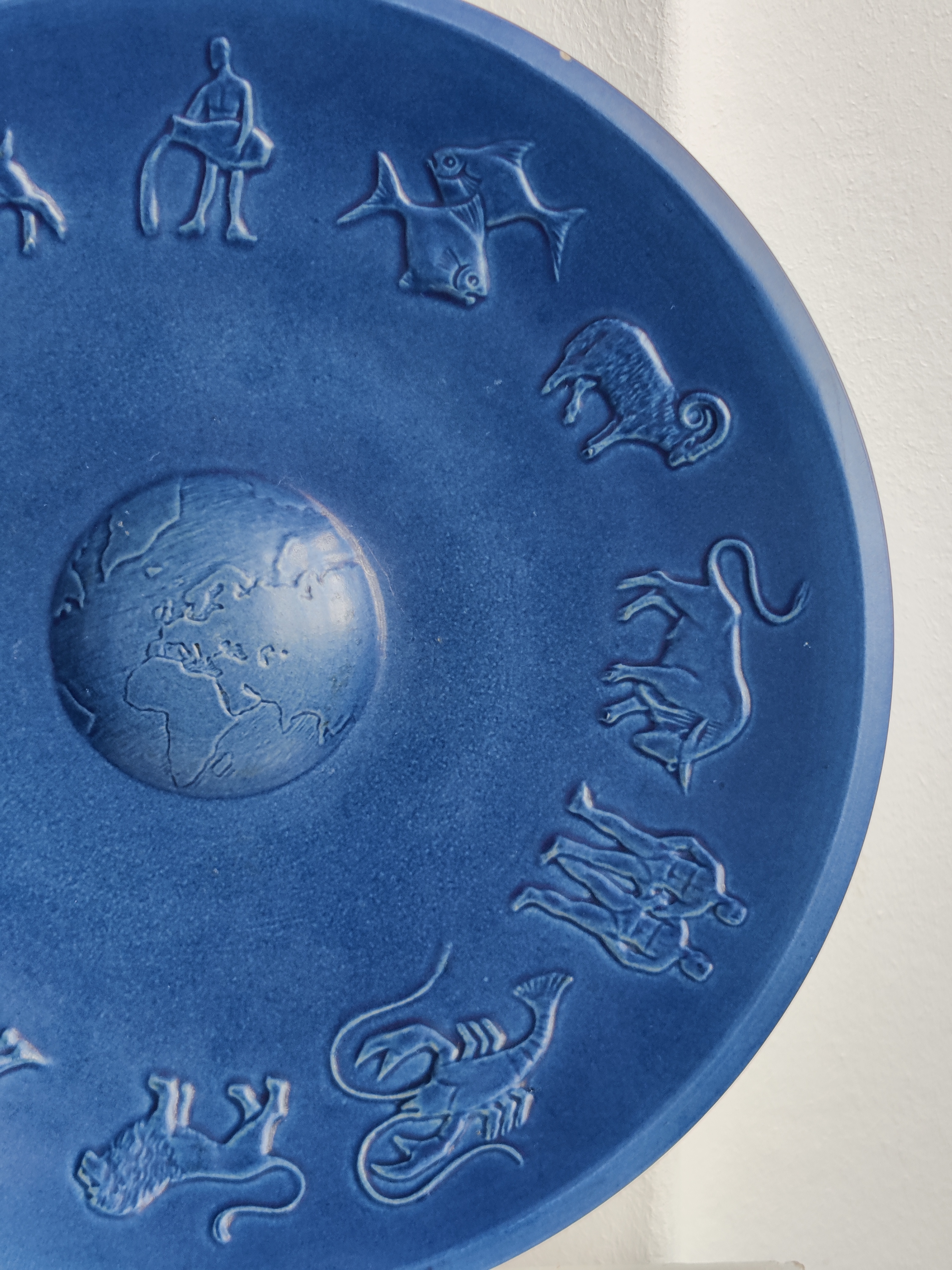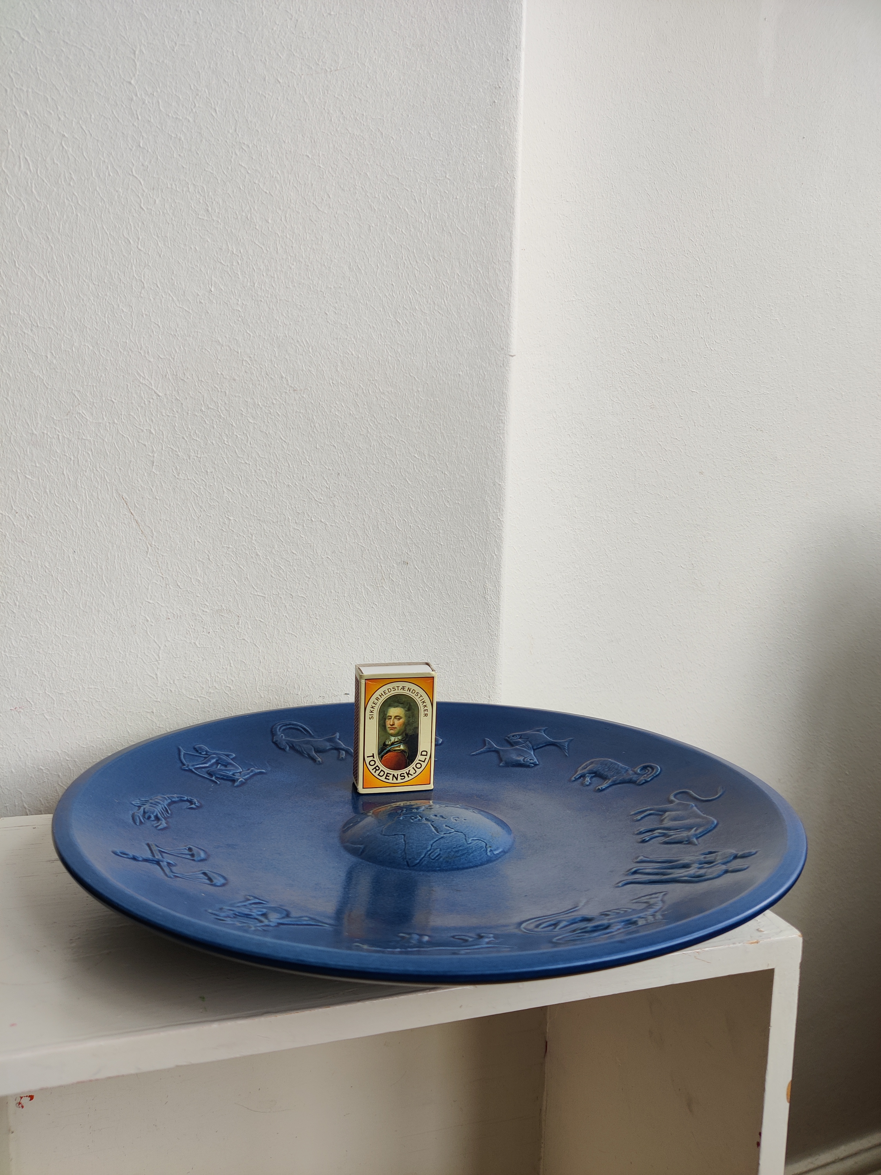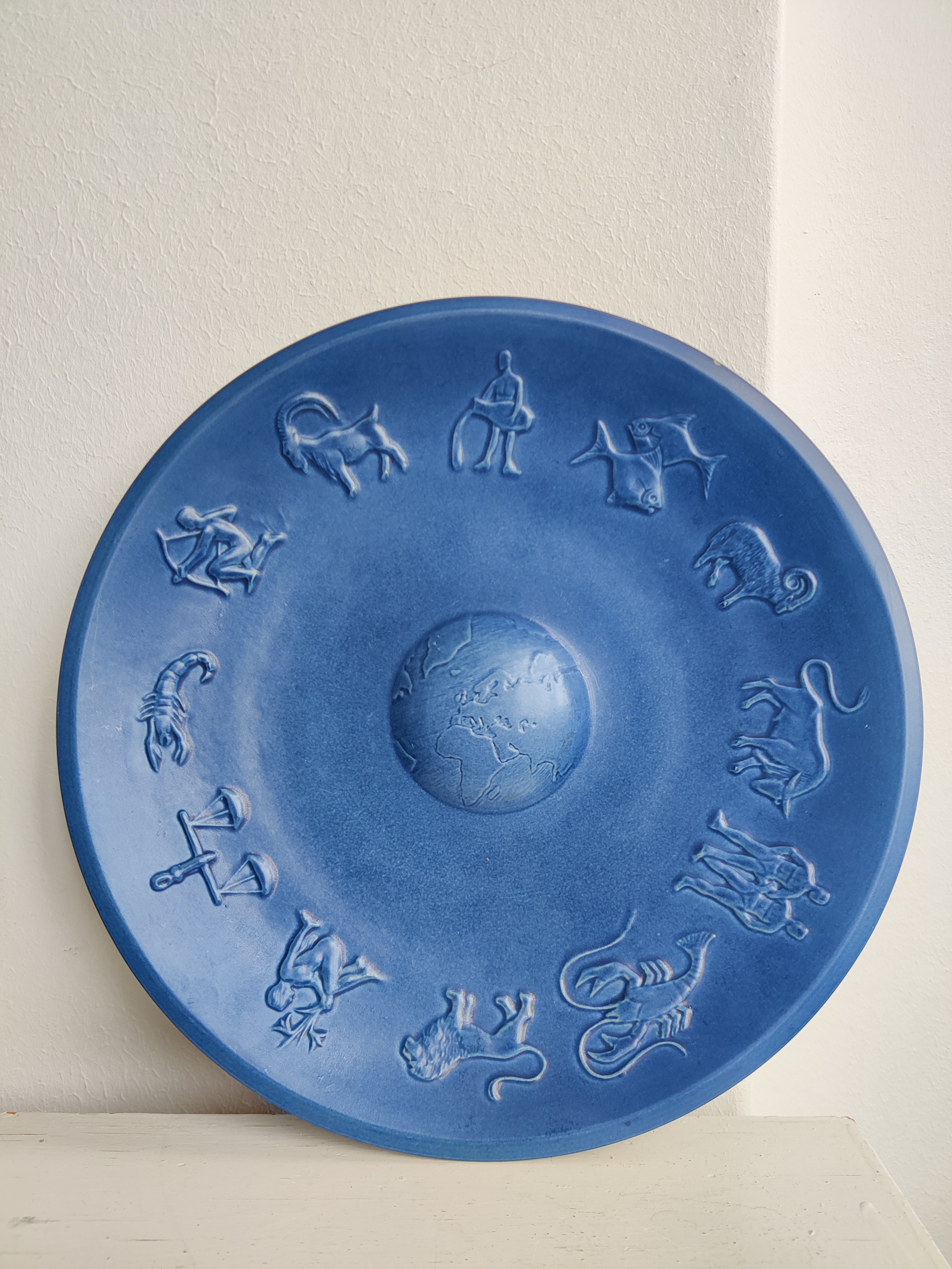 Stort fad i keramik med de 12 stjernetegn og jordkloden i midten. Den smukkeste dybe blå farve, og kun med et mikro nag, se billede. Fremstillet hos Ipsens Enke. Diameter 28 cm.
