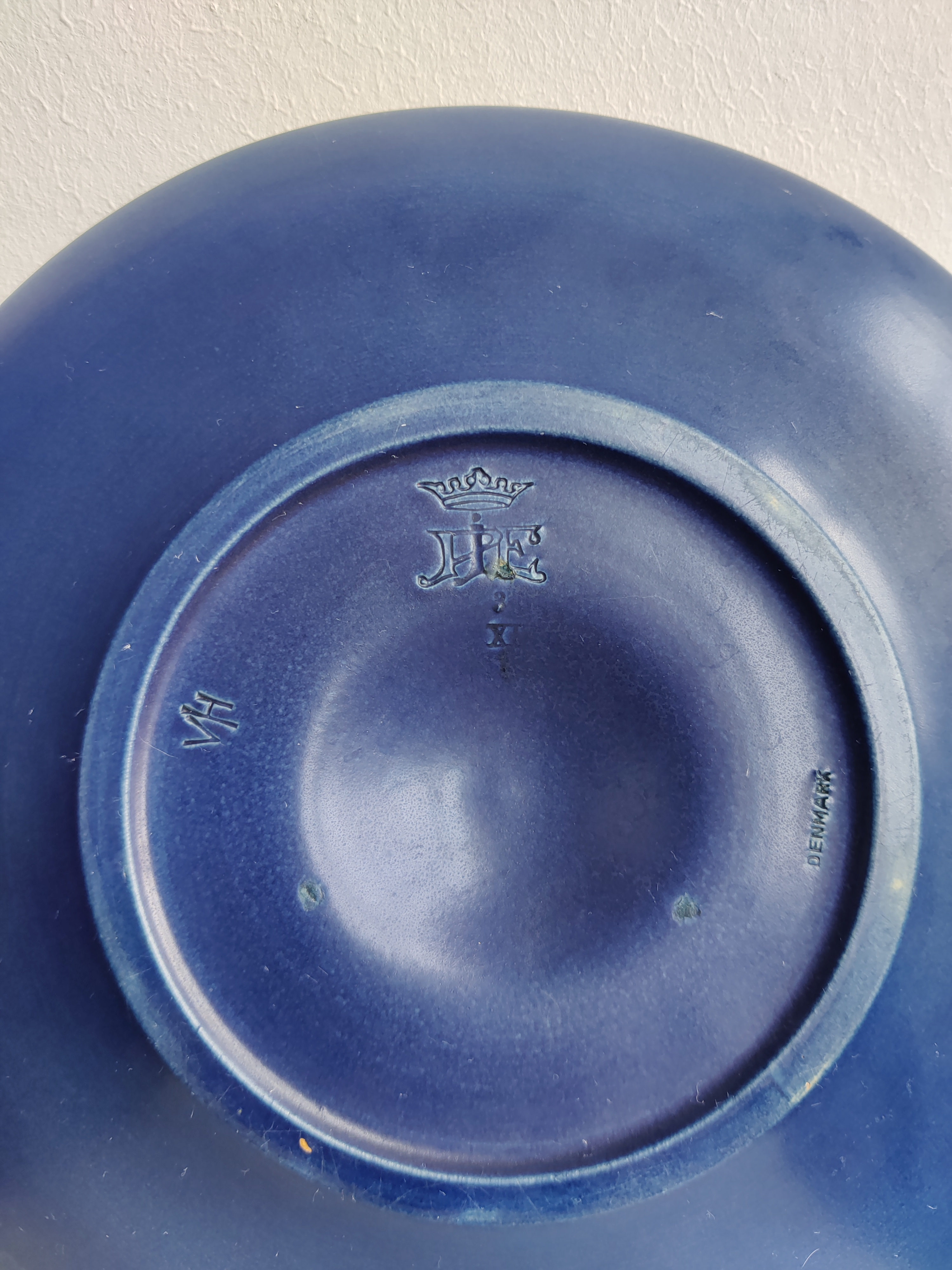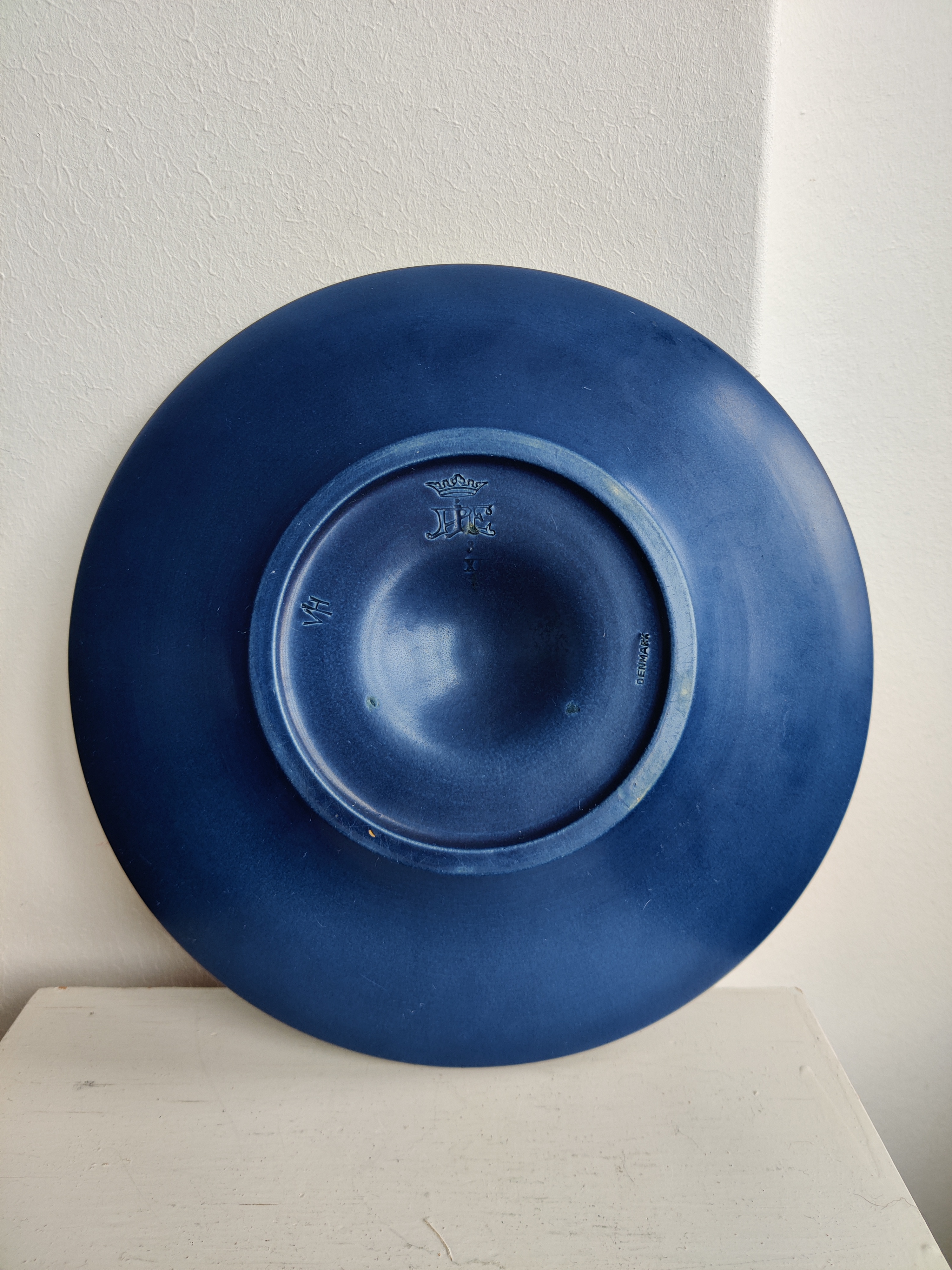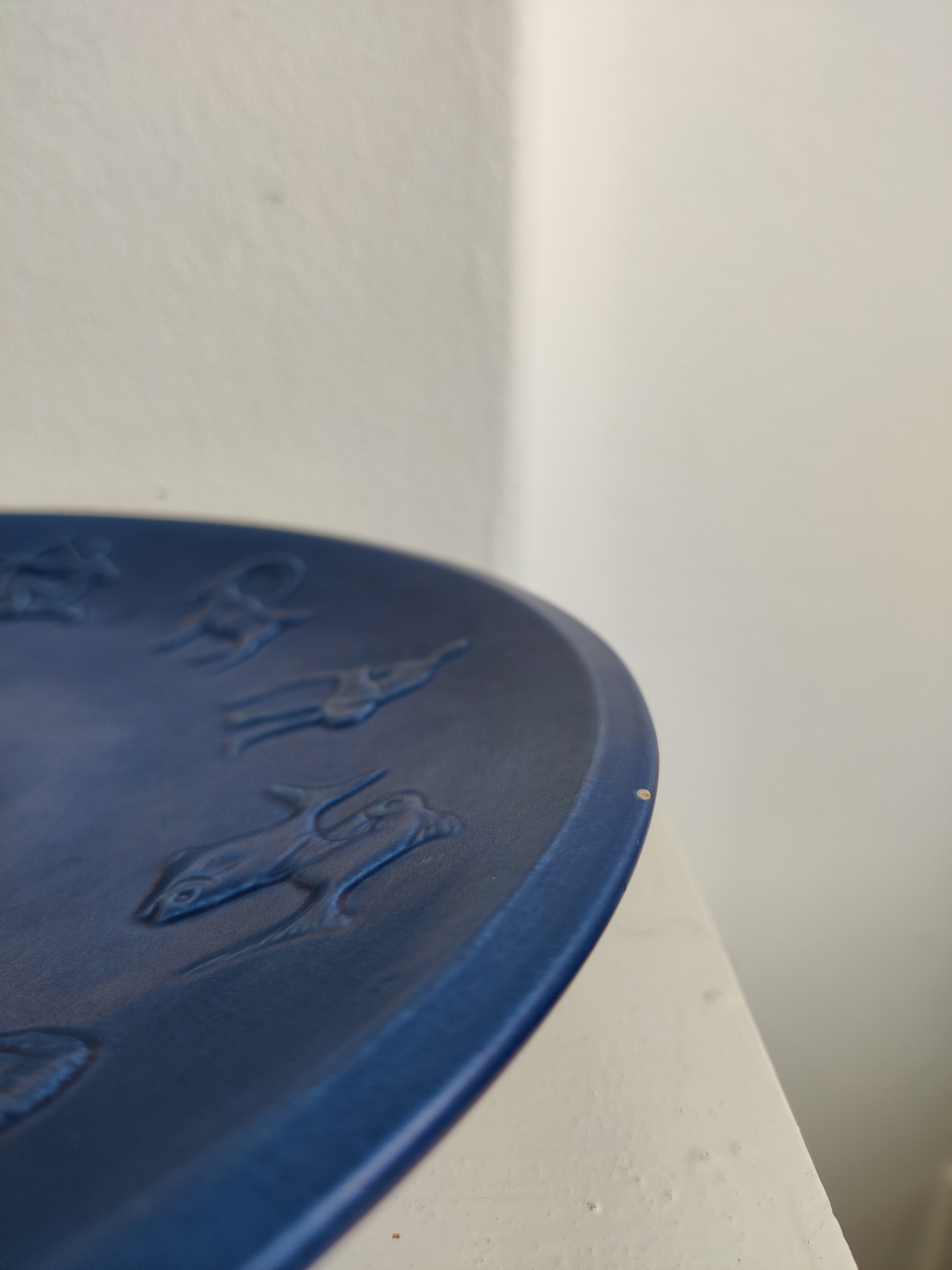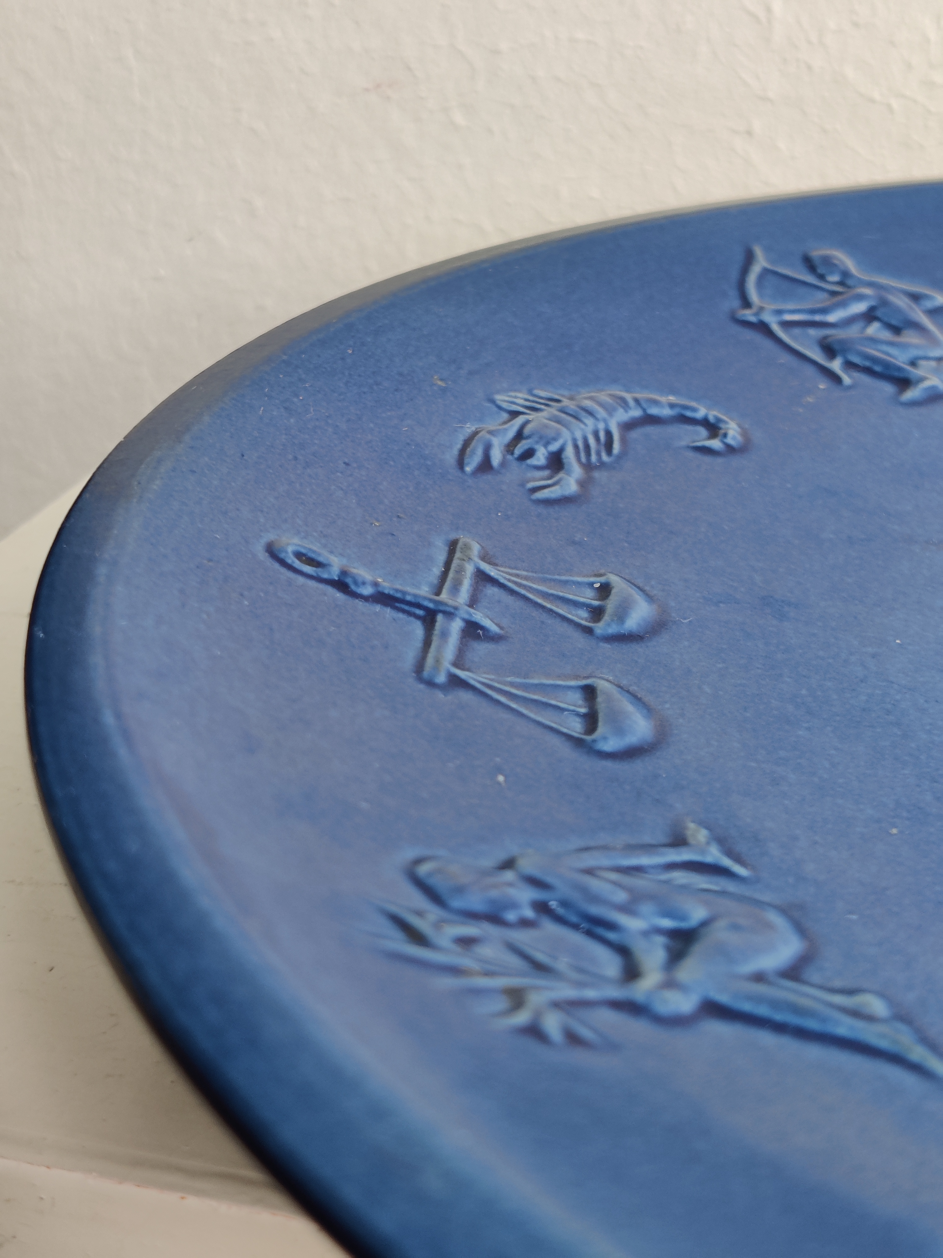 Stort fad i keramik med de 12 stjernetegn og jordkloden i midten. Den smukkeste dybe blå farve, og kun med et mikro nag, se billede. Fremstillet hos Ipsens Enke. Diameter 28 cm.