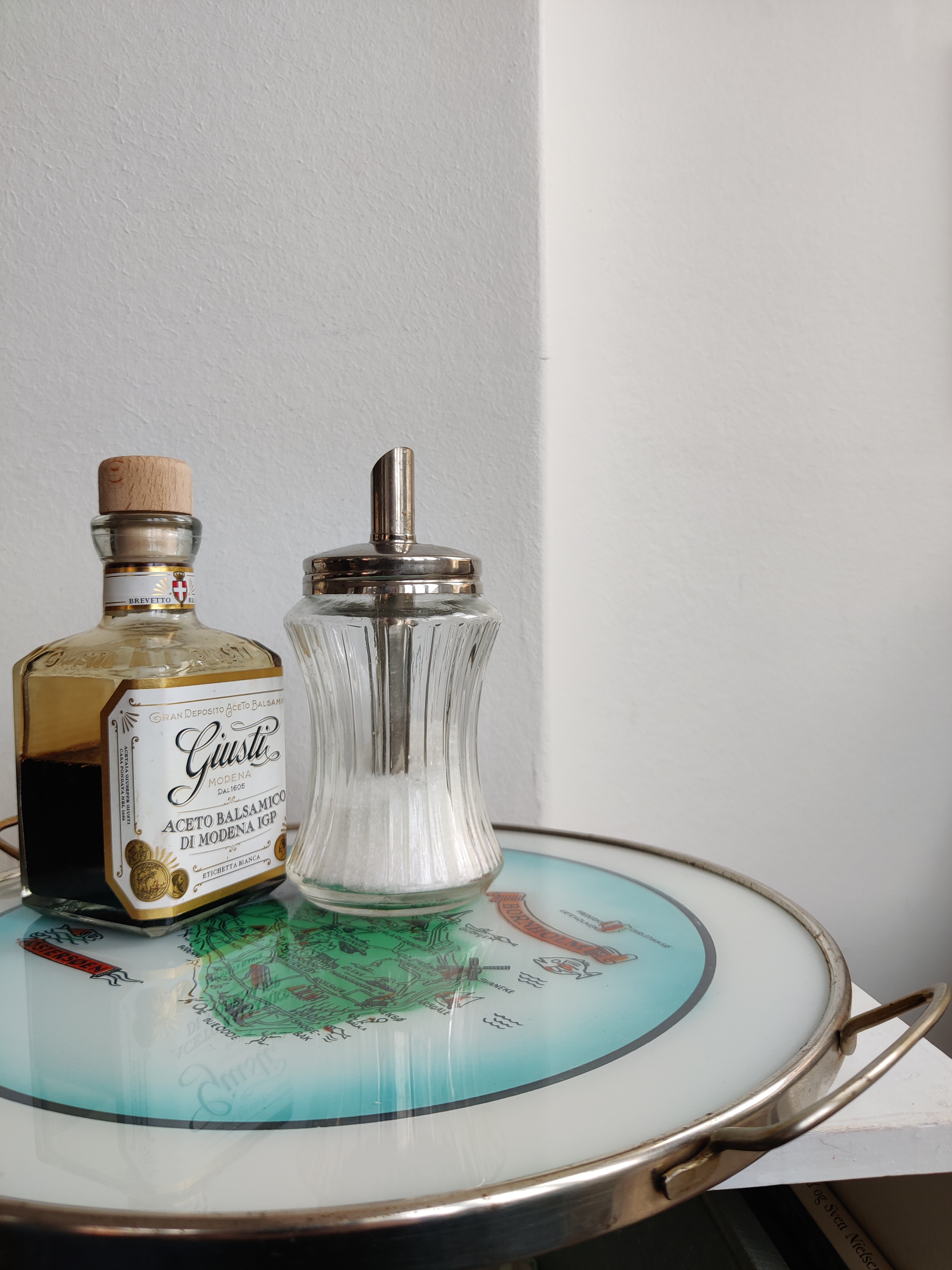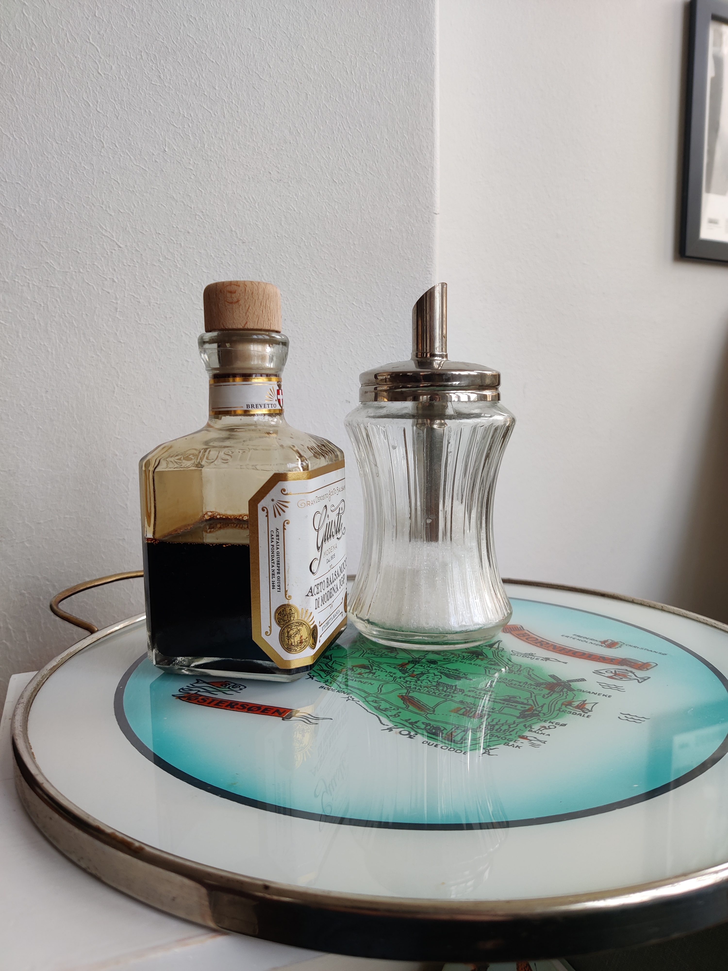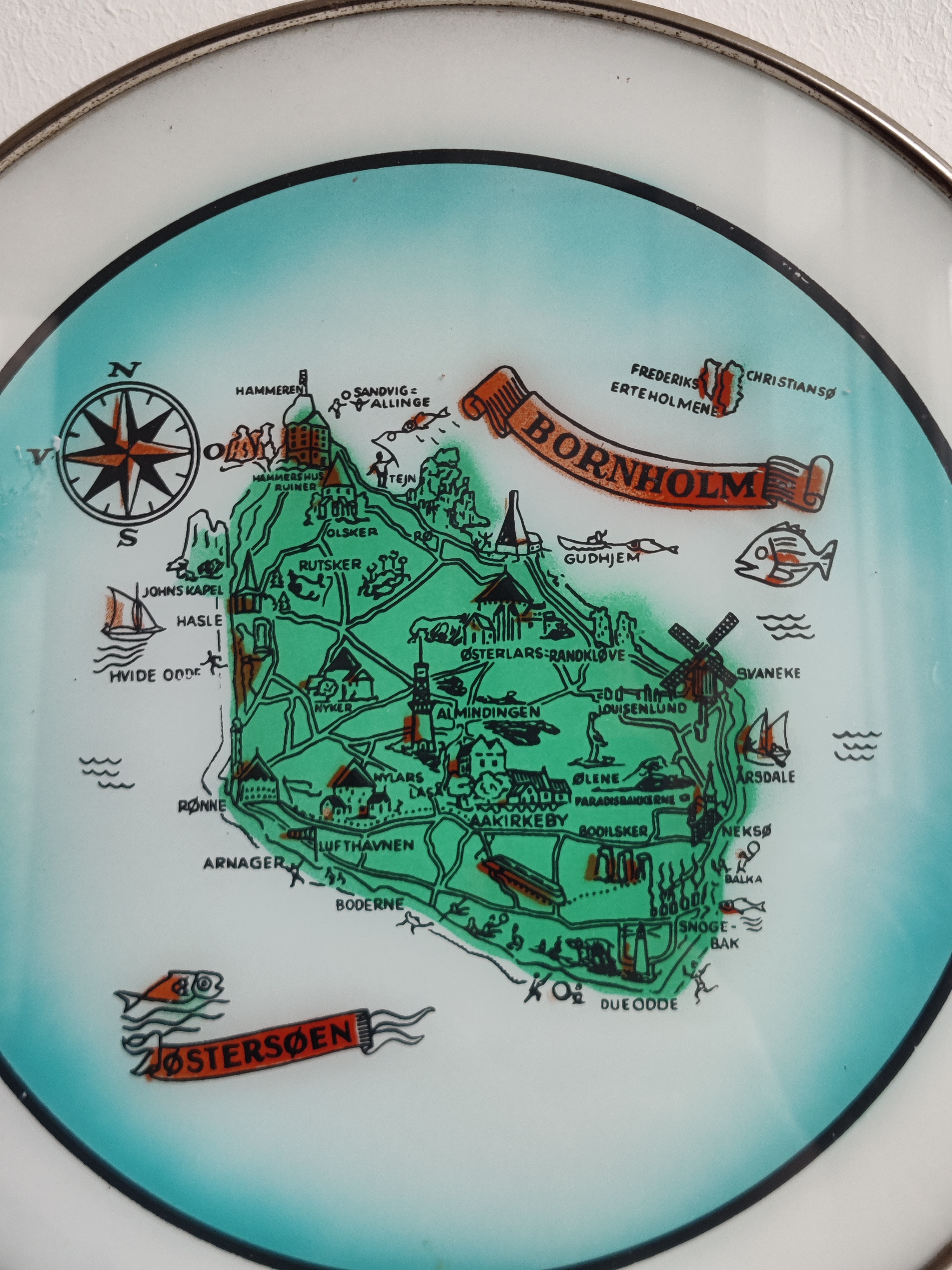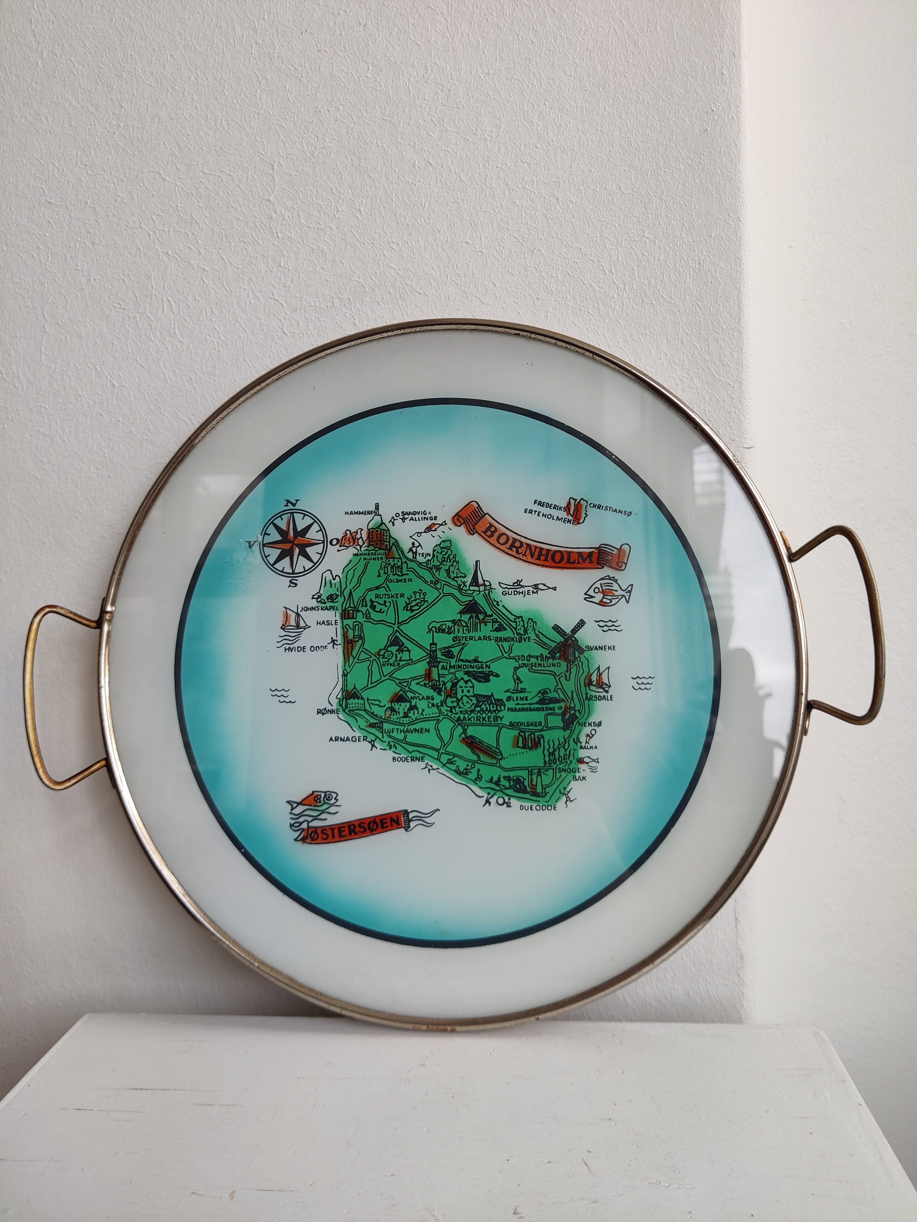 Fantastisk vintage bakke i metal og glas med Bornholm i centrum. Brug den til at servere de røgede sild - eller stil den et sted, hvor den kan pynte med for eksempel lys og dimser eller i køkkenet med olie, eddike, salt og peber. Mål 29 cm i diameter.