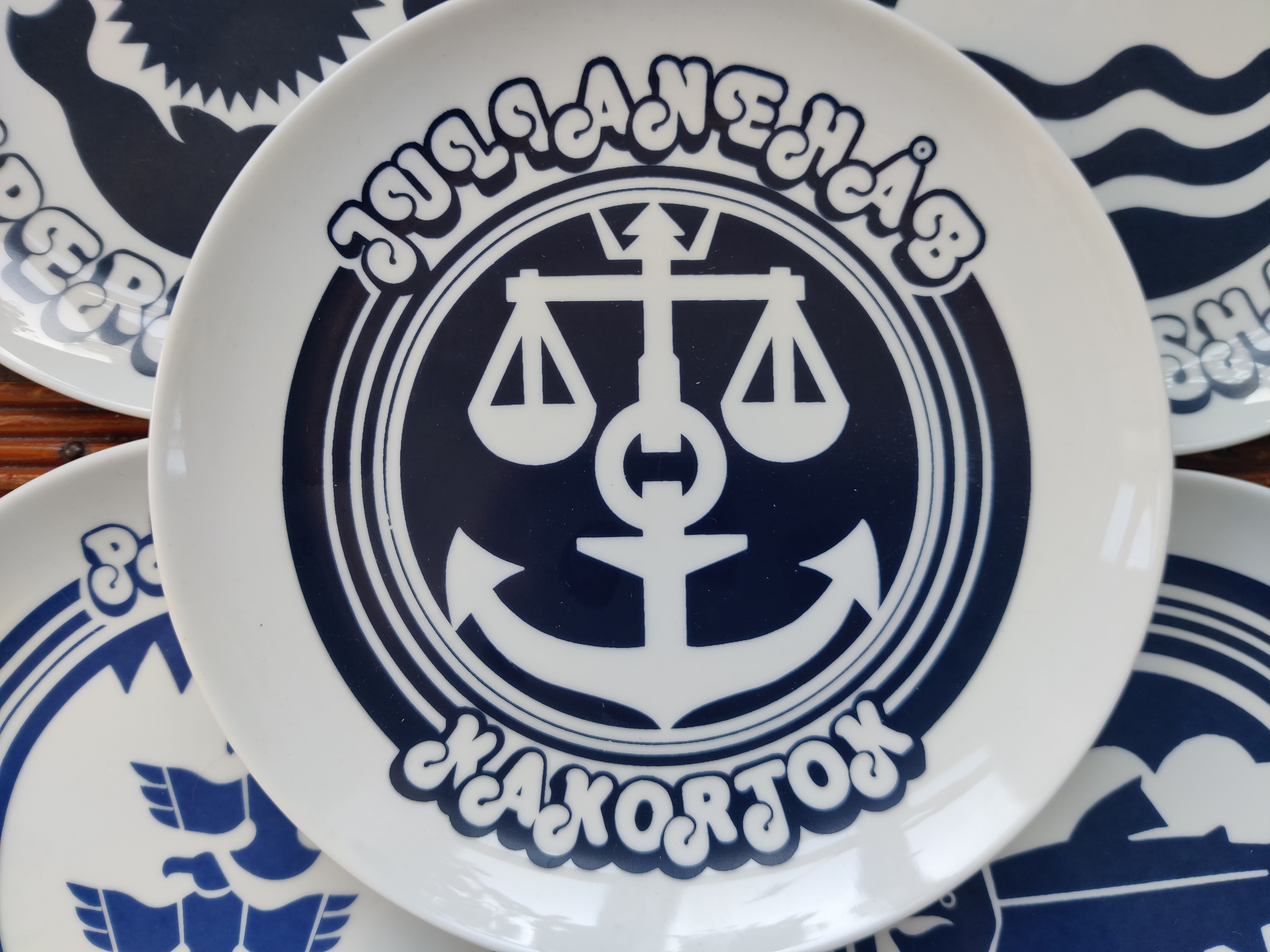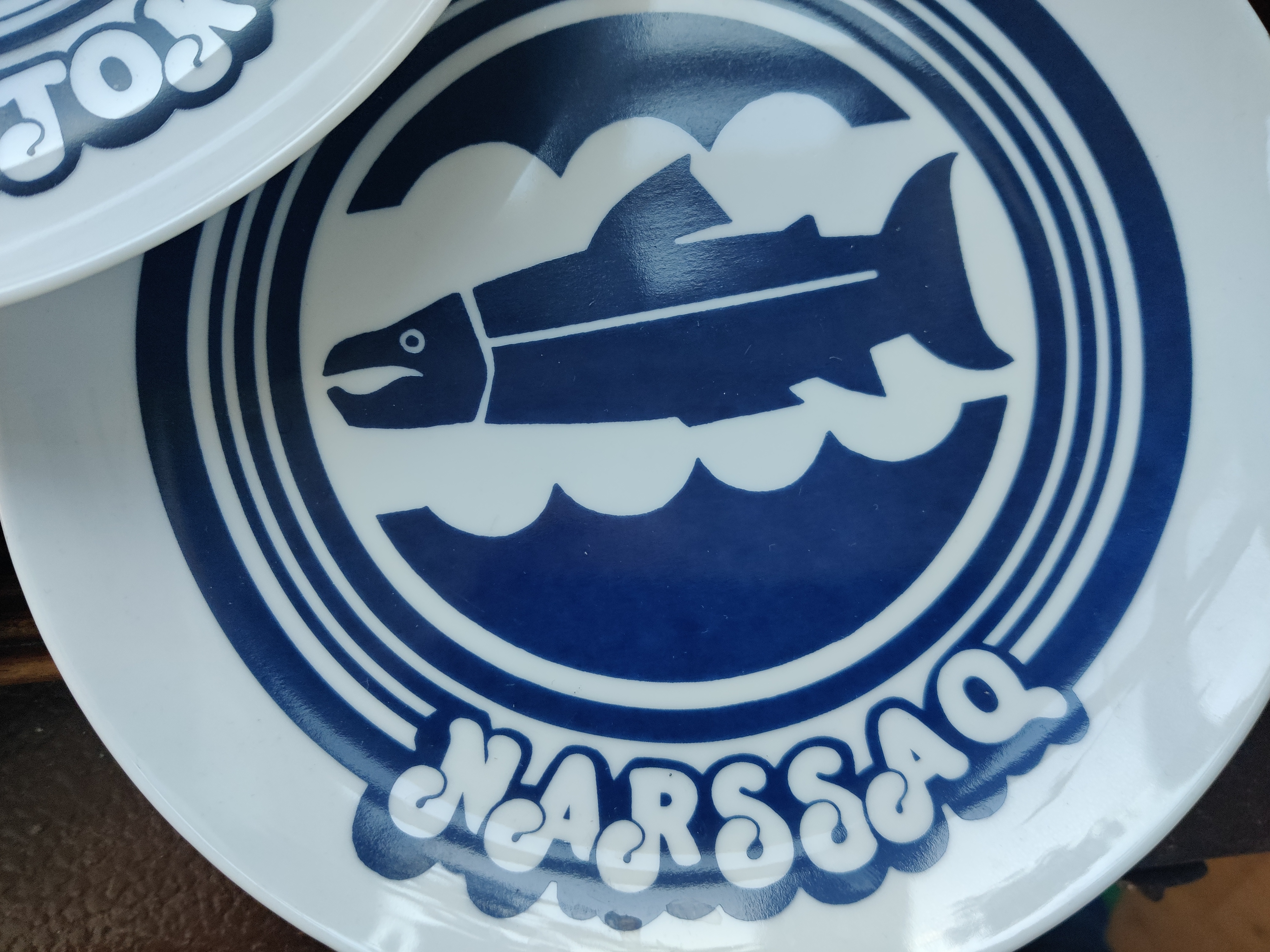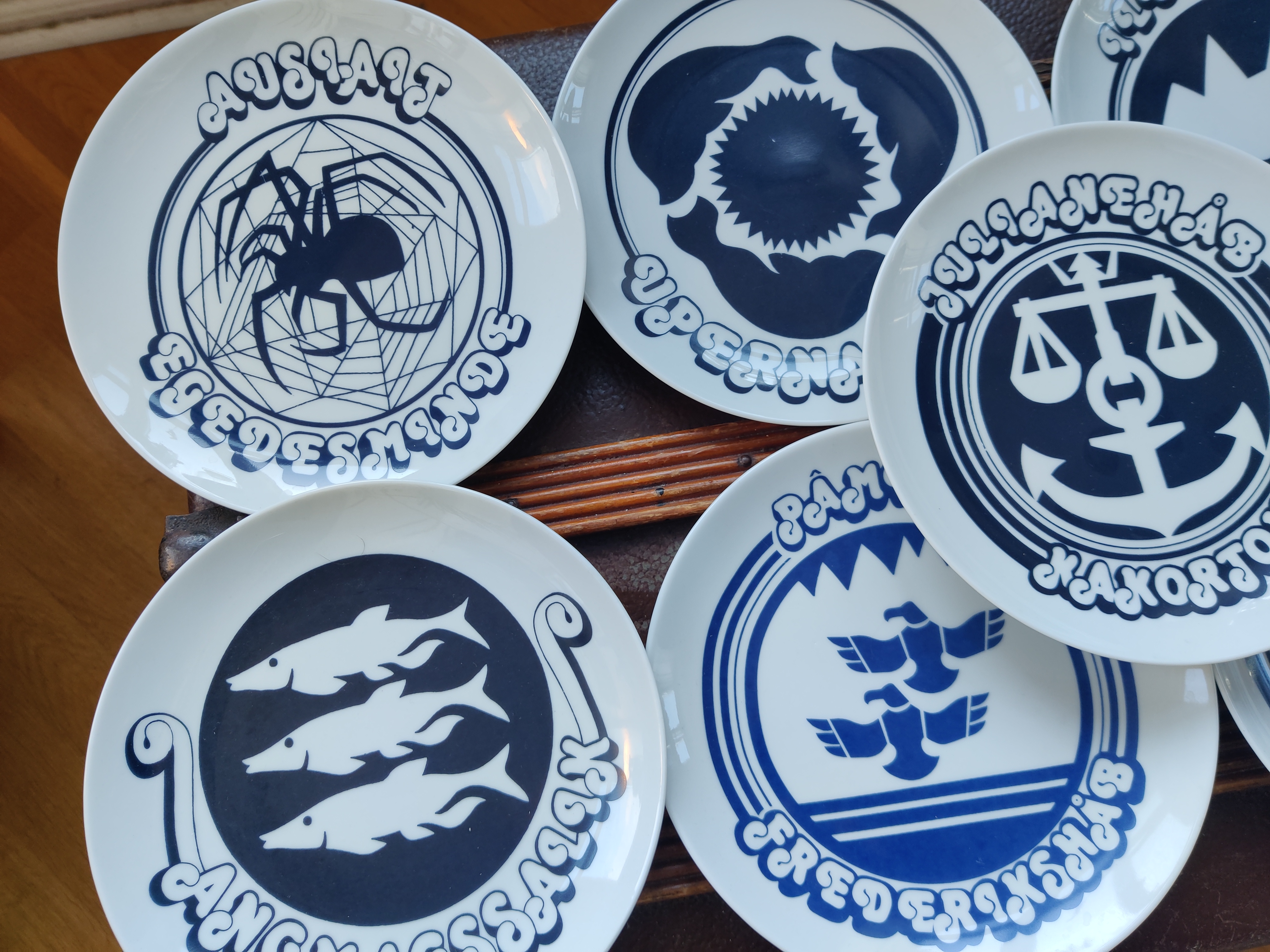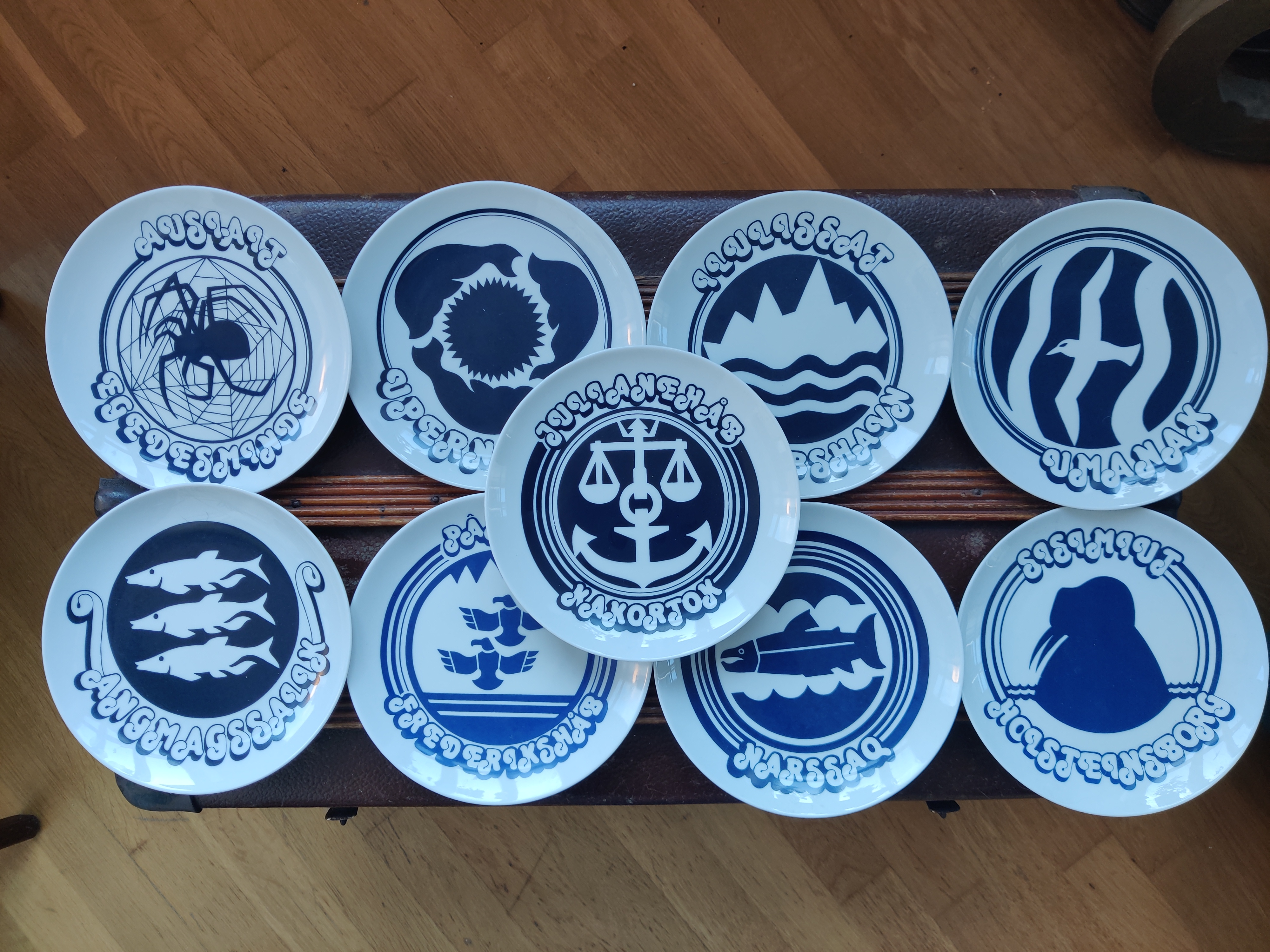 Sjældne tallerkener eller platter med grønlandske byer. Motiverne er et væld af smukke havdyr og den mest firser-fantastiske font. De er fra Polar Magasinet, som vist eksisterer endnu, en butik med udstyr og sager - og altså også et lækkert stel, dengang i 1980'erne. 9 stk sælges samlet. Ø19 cm.