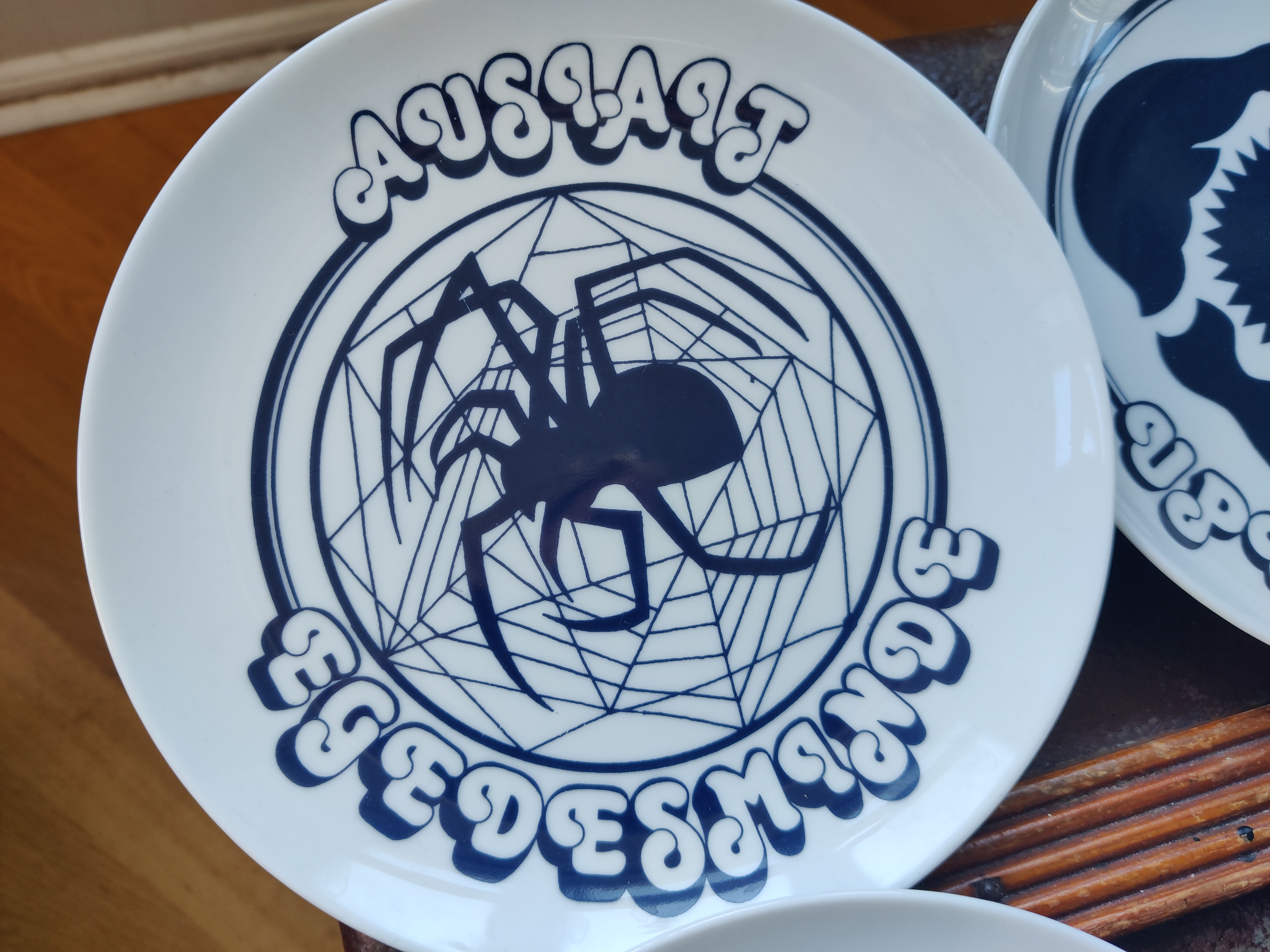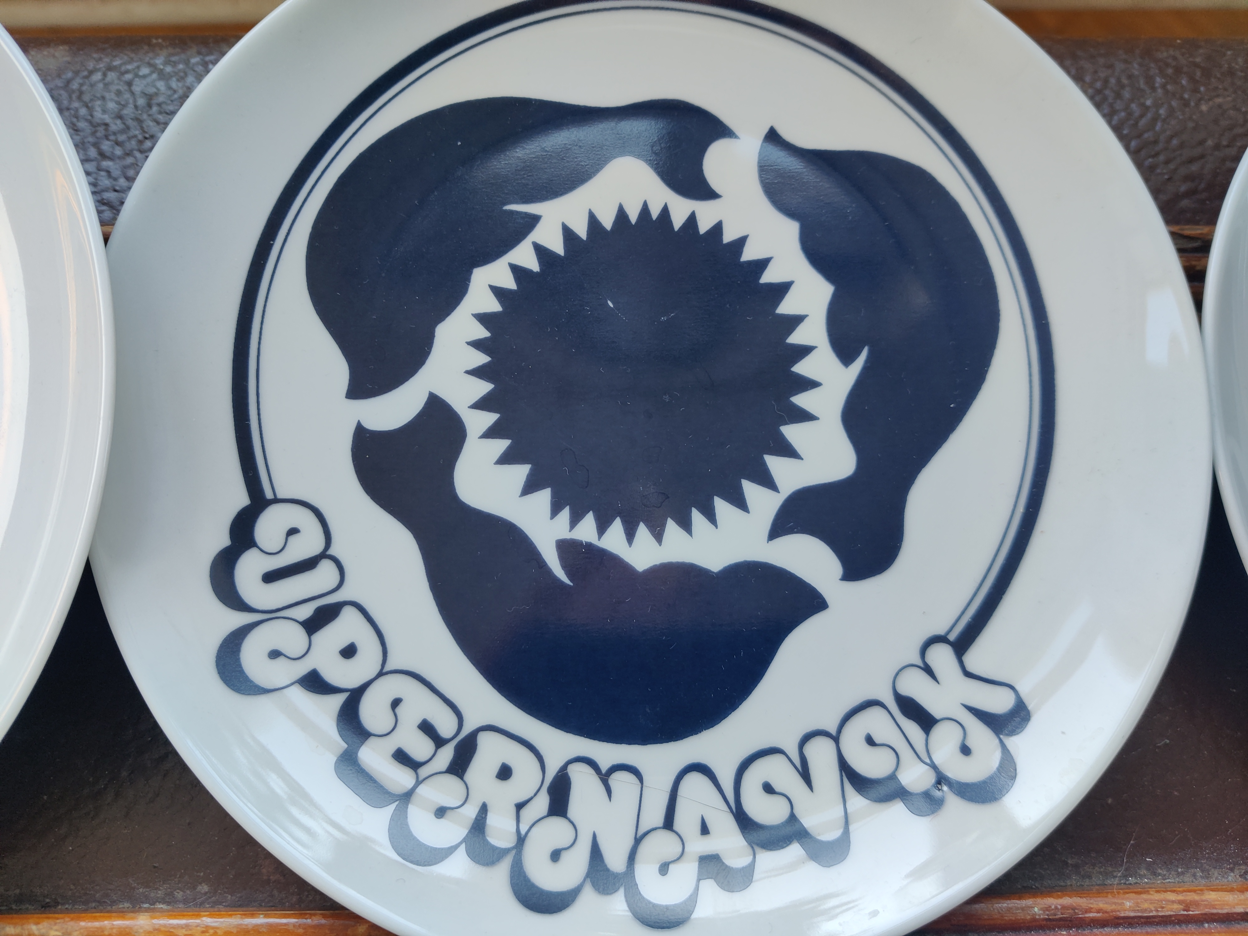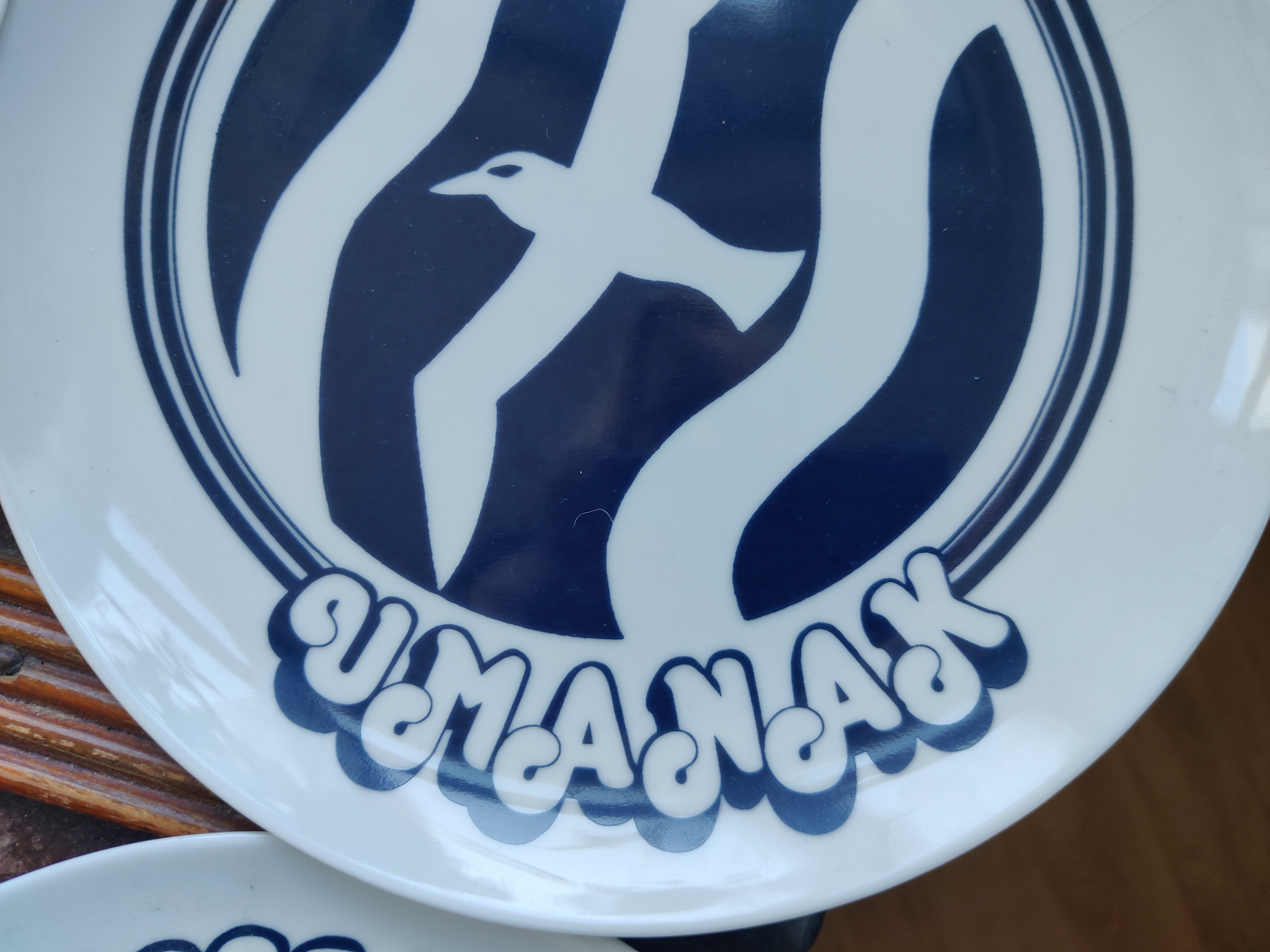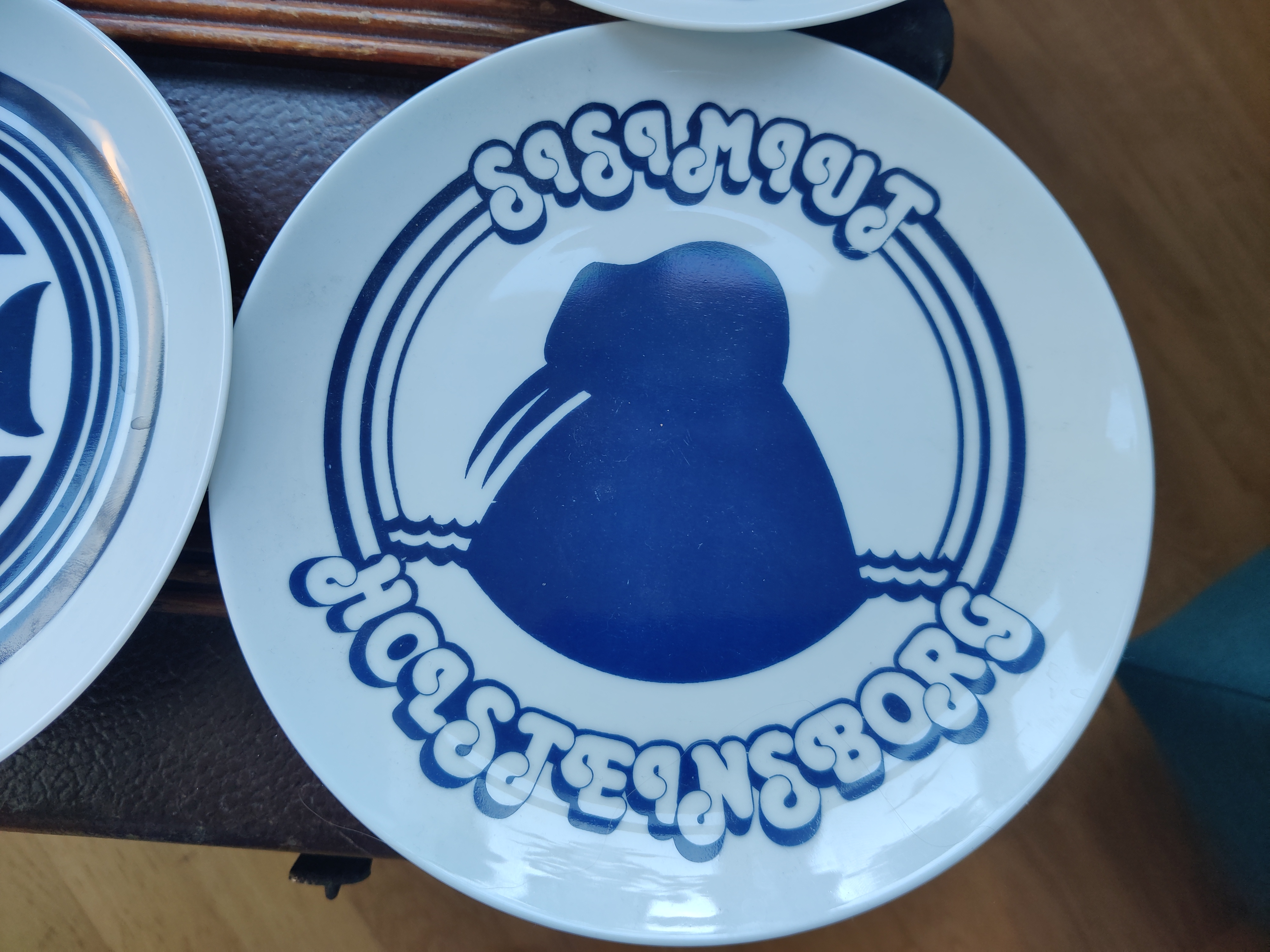 Sjældne tallerkener eller platter med grønlandske byer. Motiverne er et væld af smukke havdyr og den mest firser-fantastiske font. De er fra Polar Magasinet, som vist eksisterer endnu, en butik med udstyr og sager - og altså også et lækkert stel, dengang i 1980'erne. 9 stk sælges samlet. Ø19 cm.