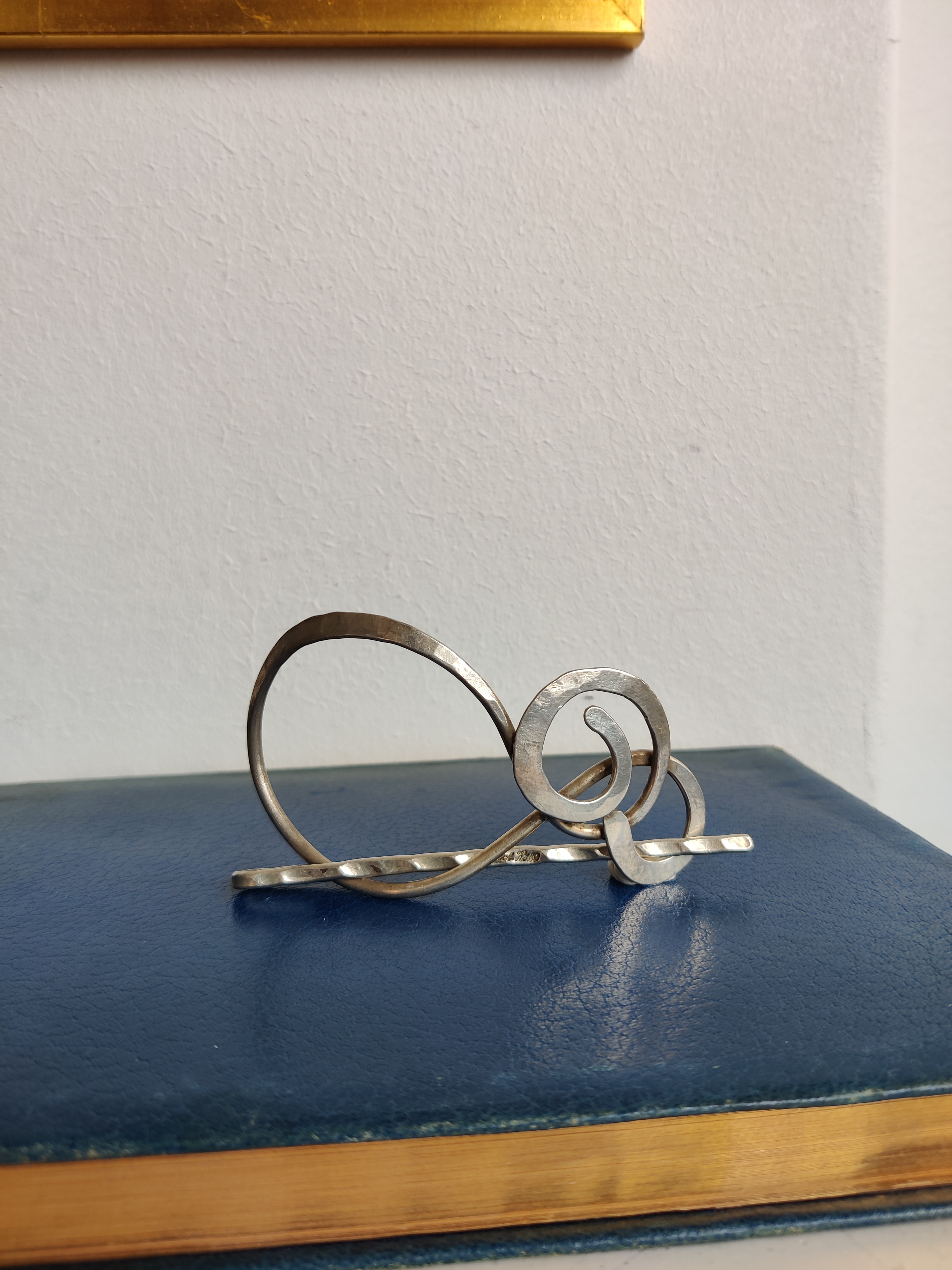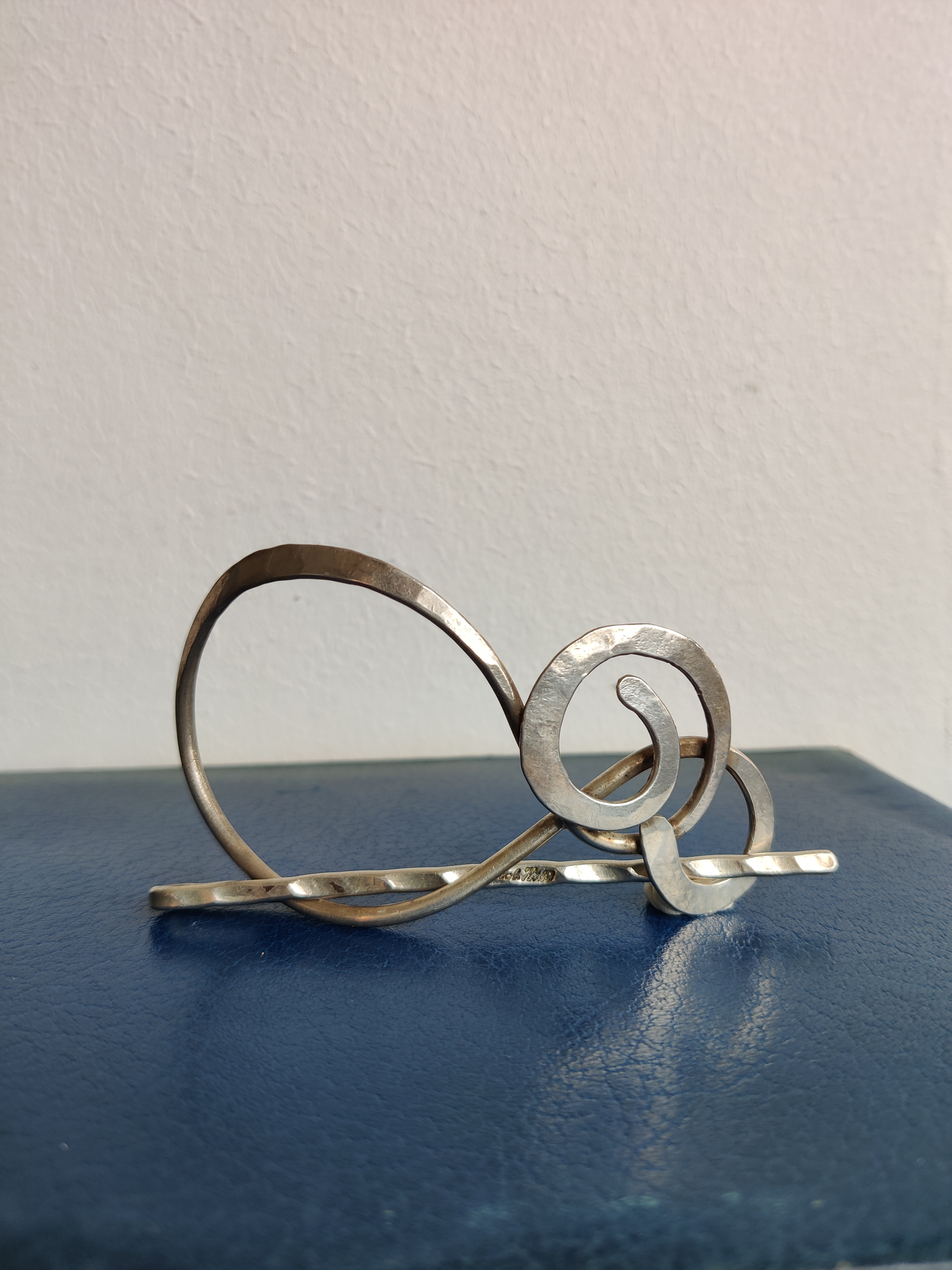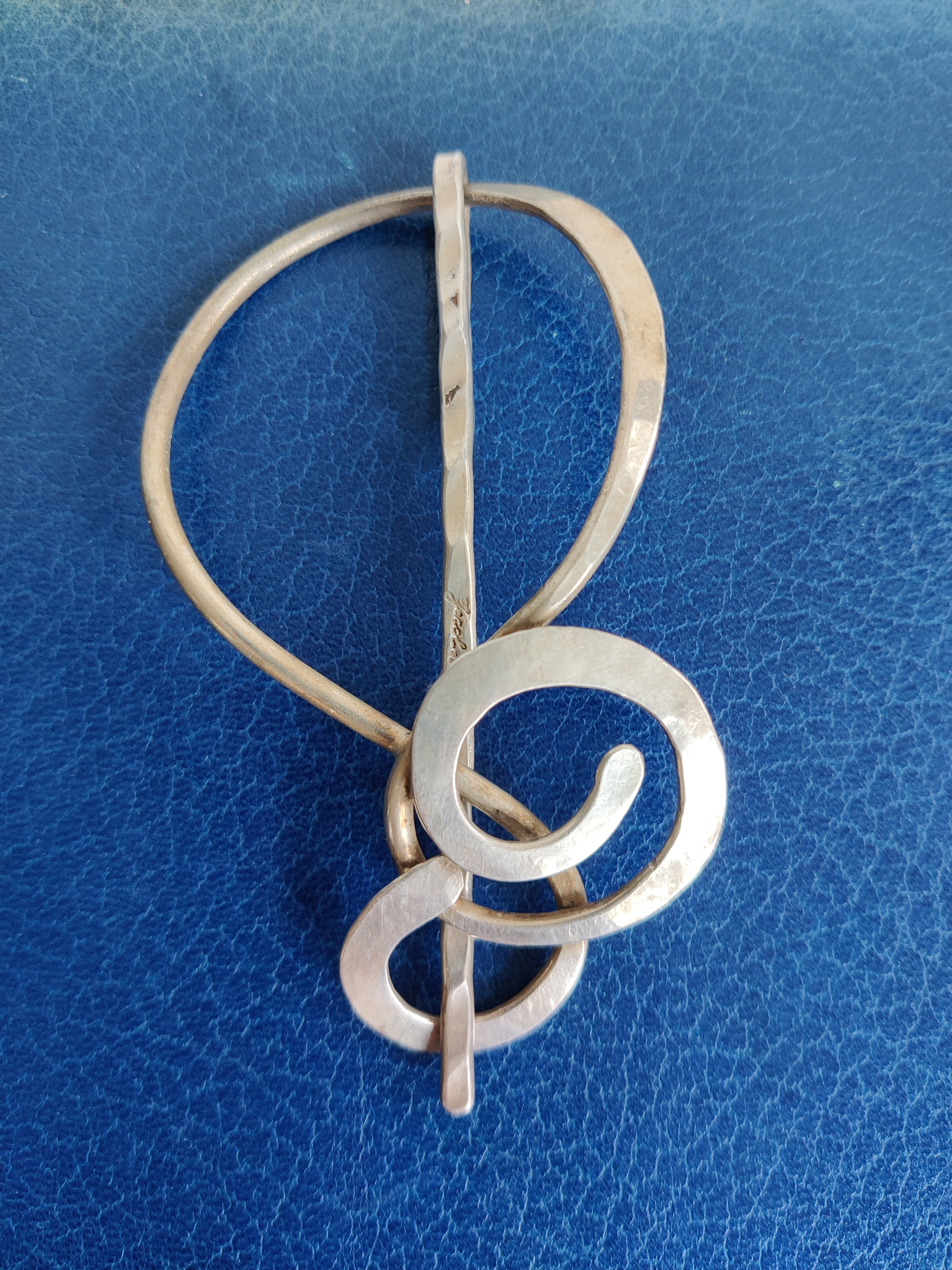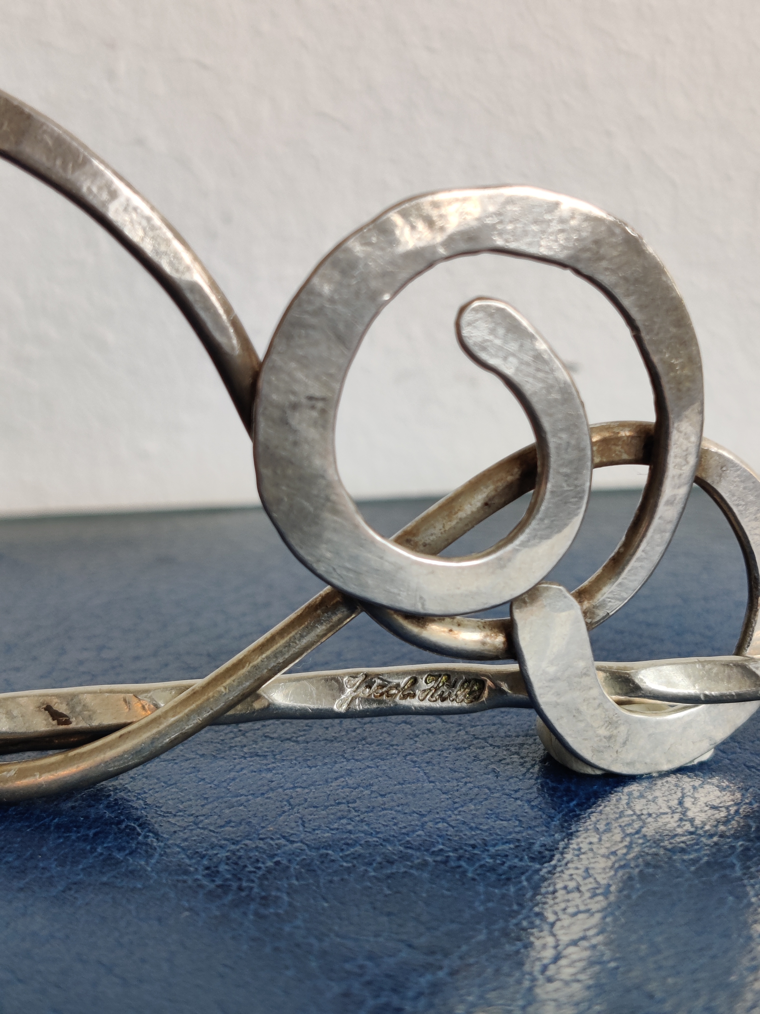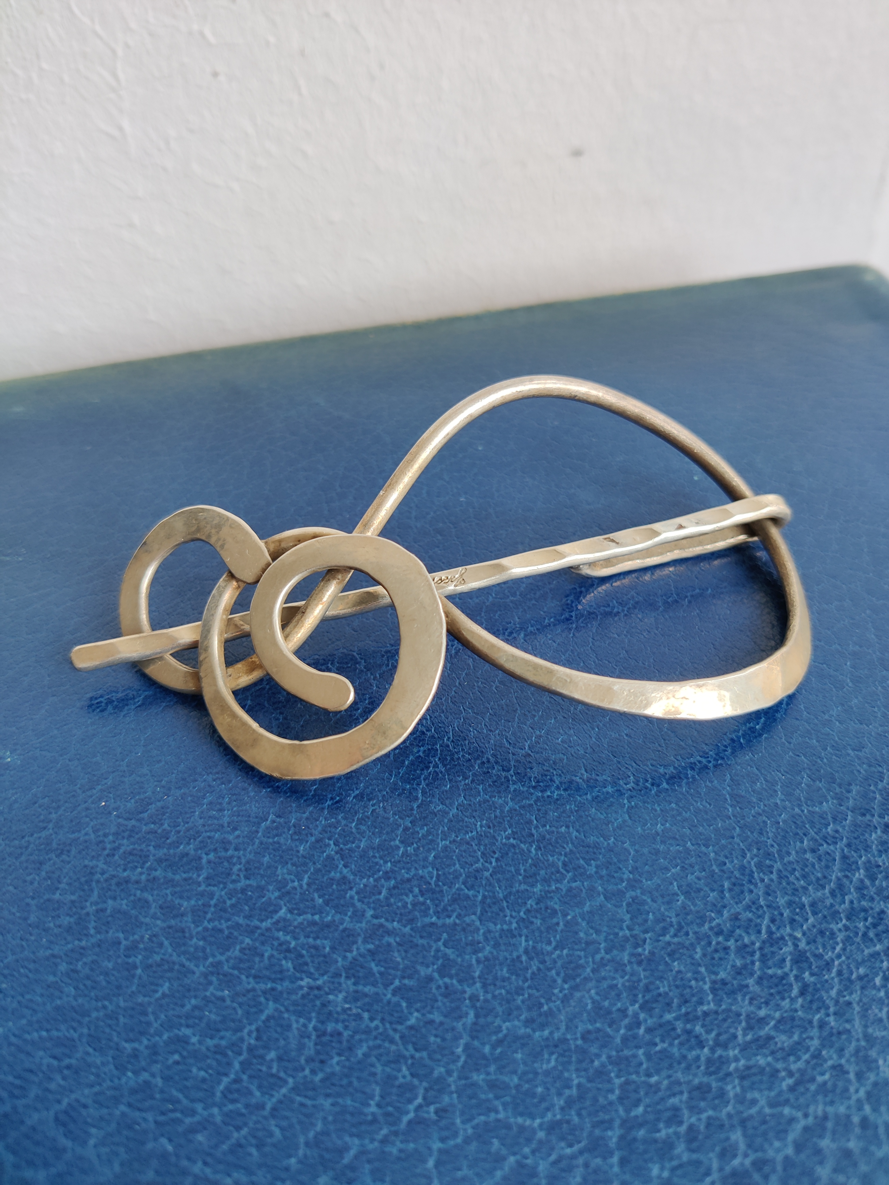 Unika hårspænde af forsølvet metal, signeret Jacob Hull. En dansk billedhugger, multikunstner og smykkedesigner prominent i 1970'erne, hvor dette spænde også er fra. Mål 9,5 x 5,5 cm.