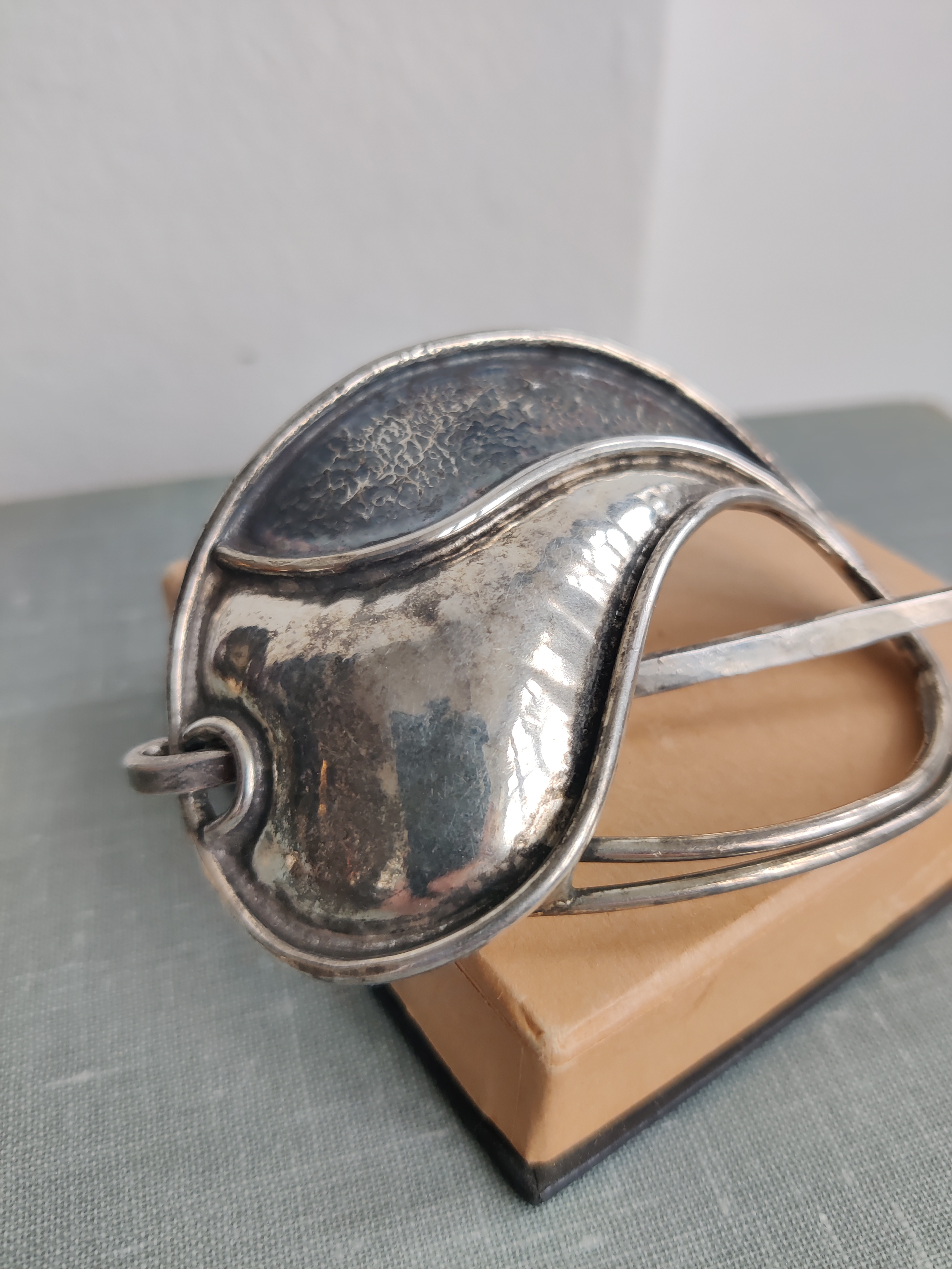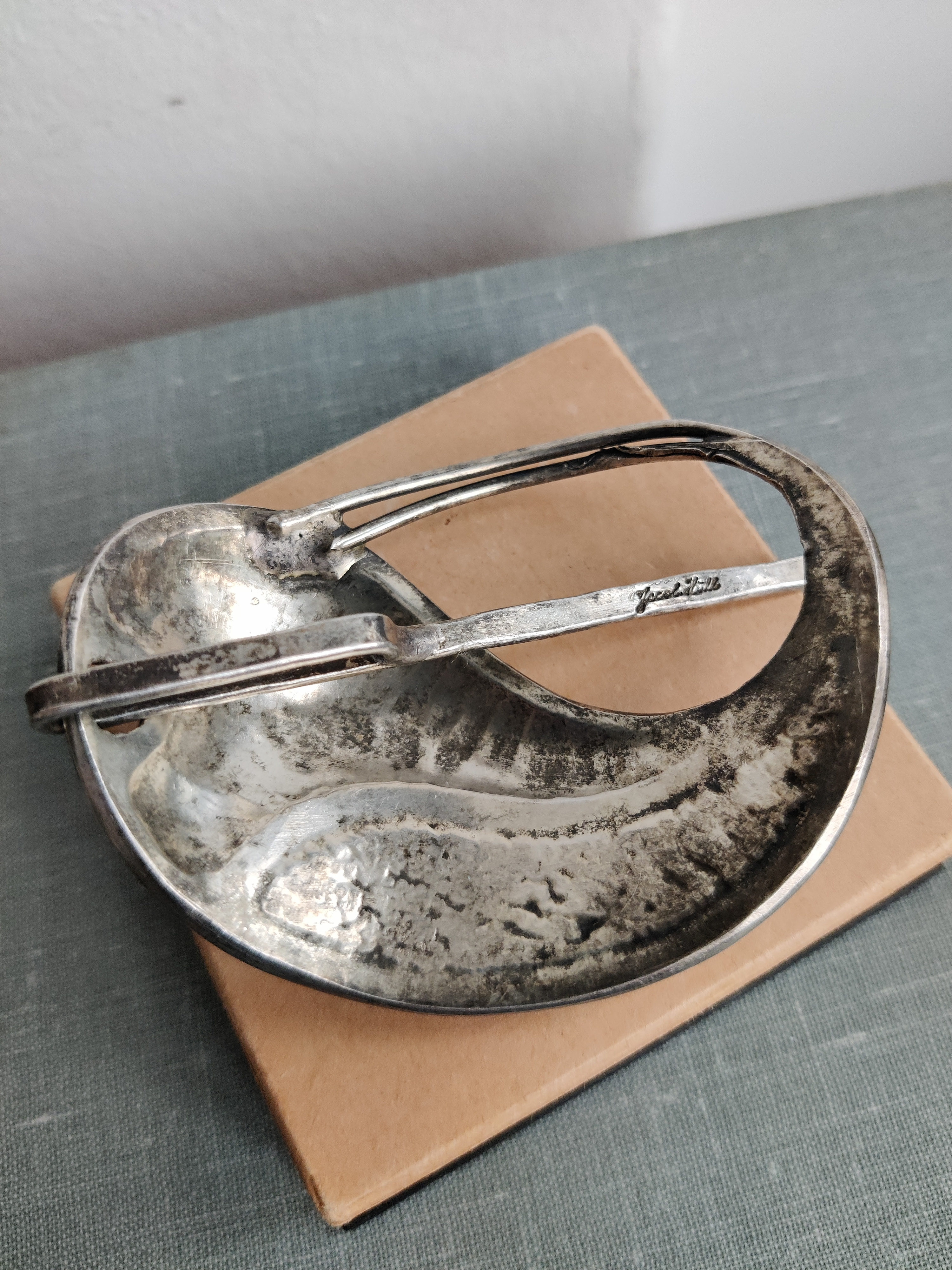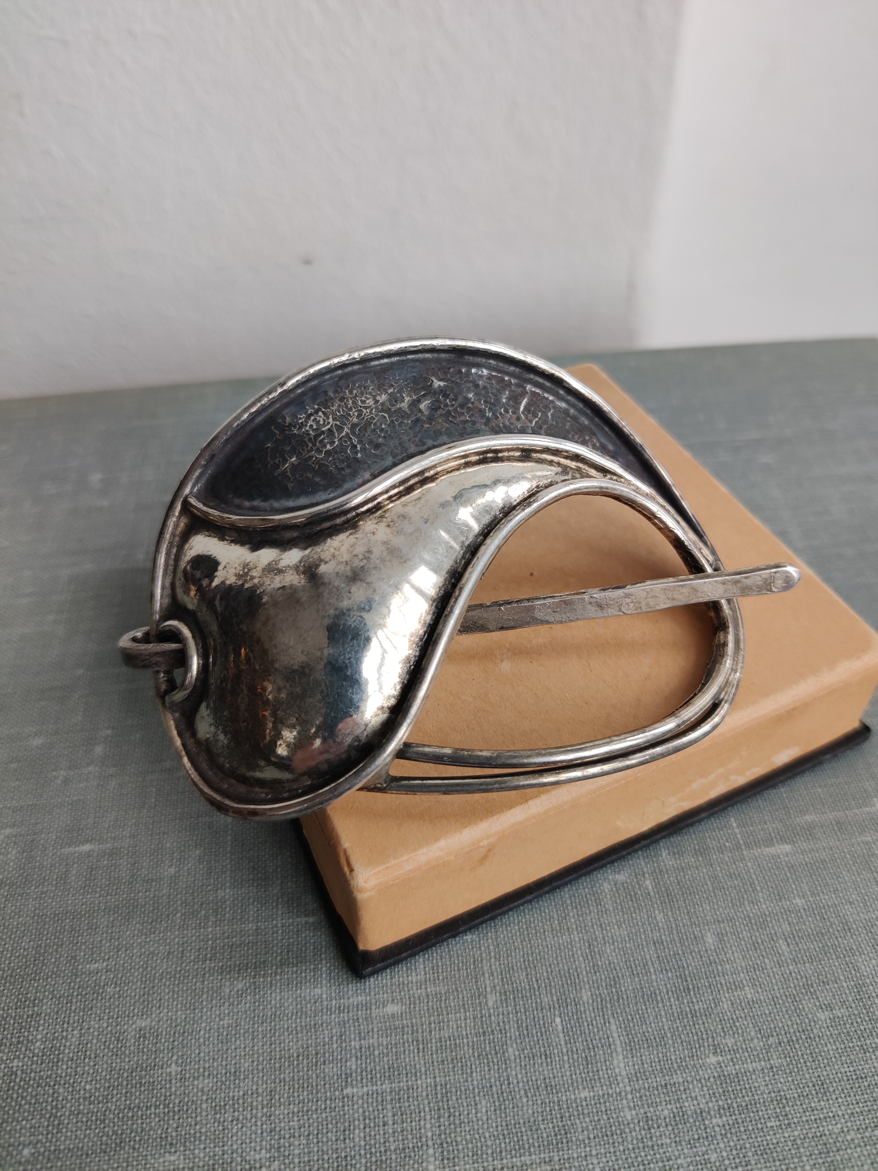 Lækkert unika hårspænde af forsølvet metal, signeret Jacob Hull, som var billedhugger, multikunstner og smykkedesigner. Mål 8 x 6 cm.