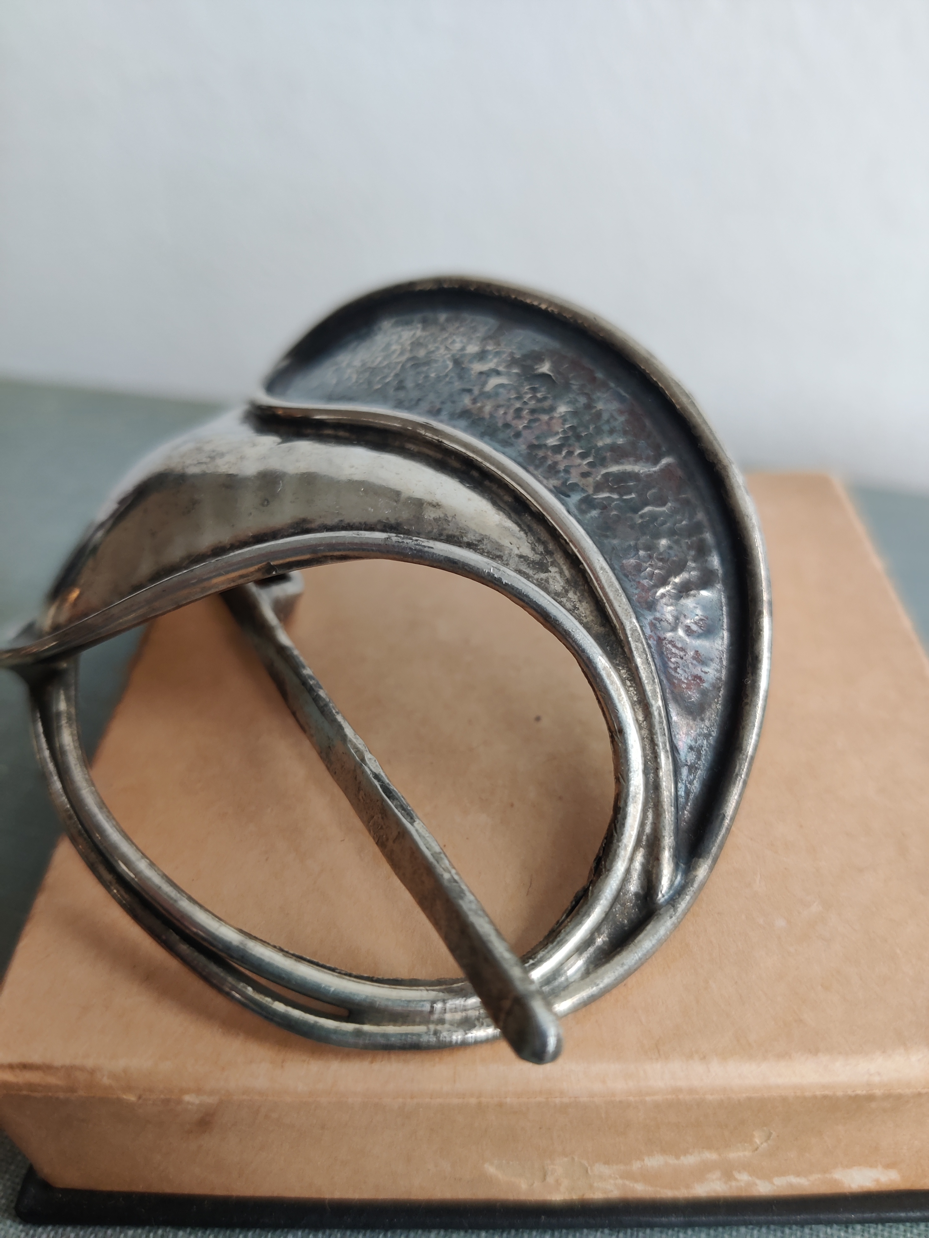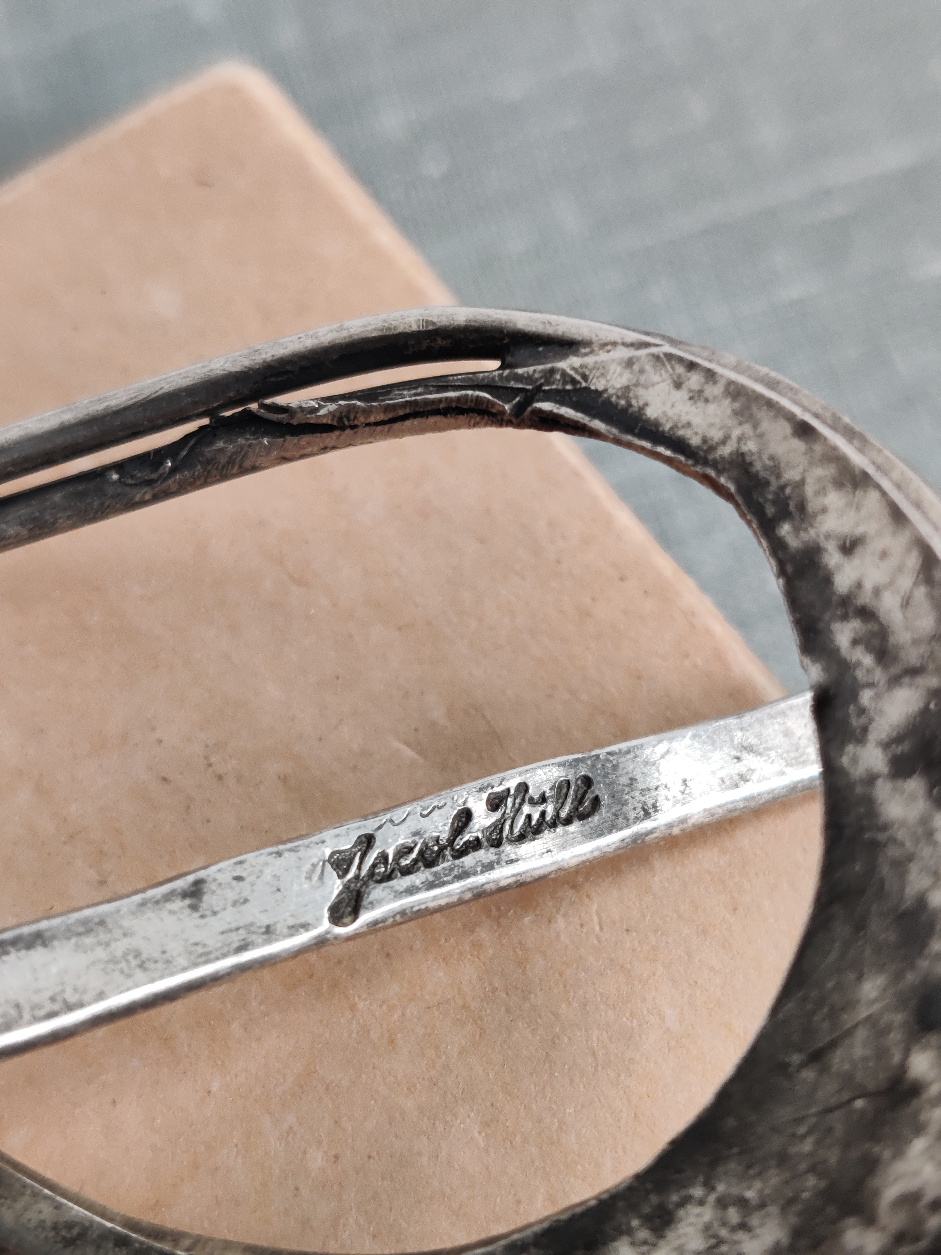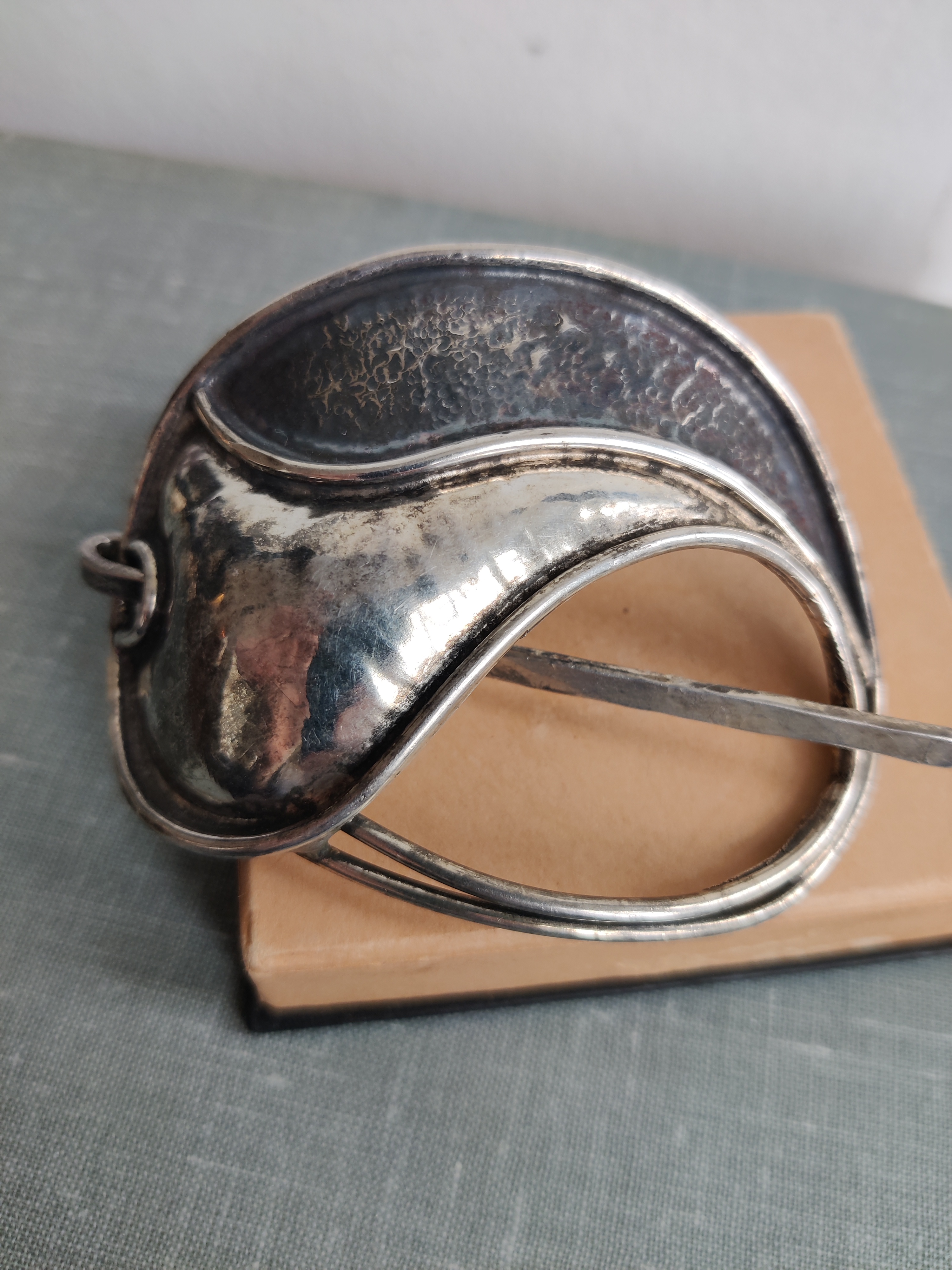 Lækkert unika hårspænde af forsølvet metal, signeret Jacob Hull, som var billedhugger, multikunstner og smykkedesigner. Mål 8 x 6 cm.