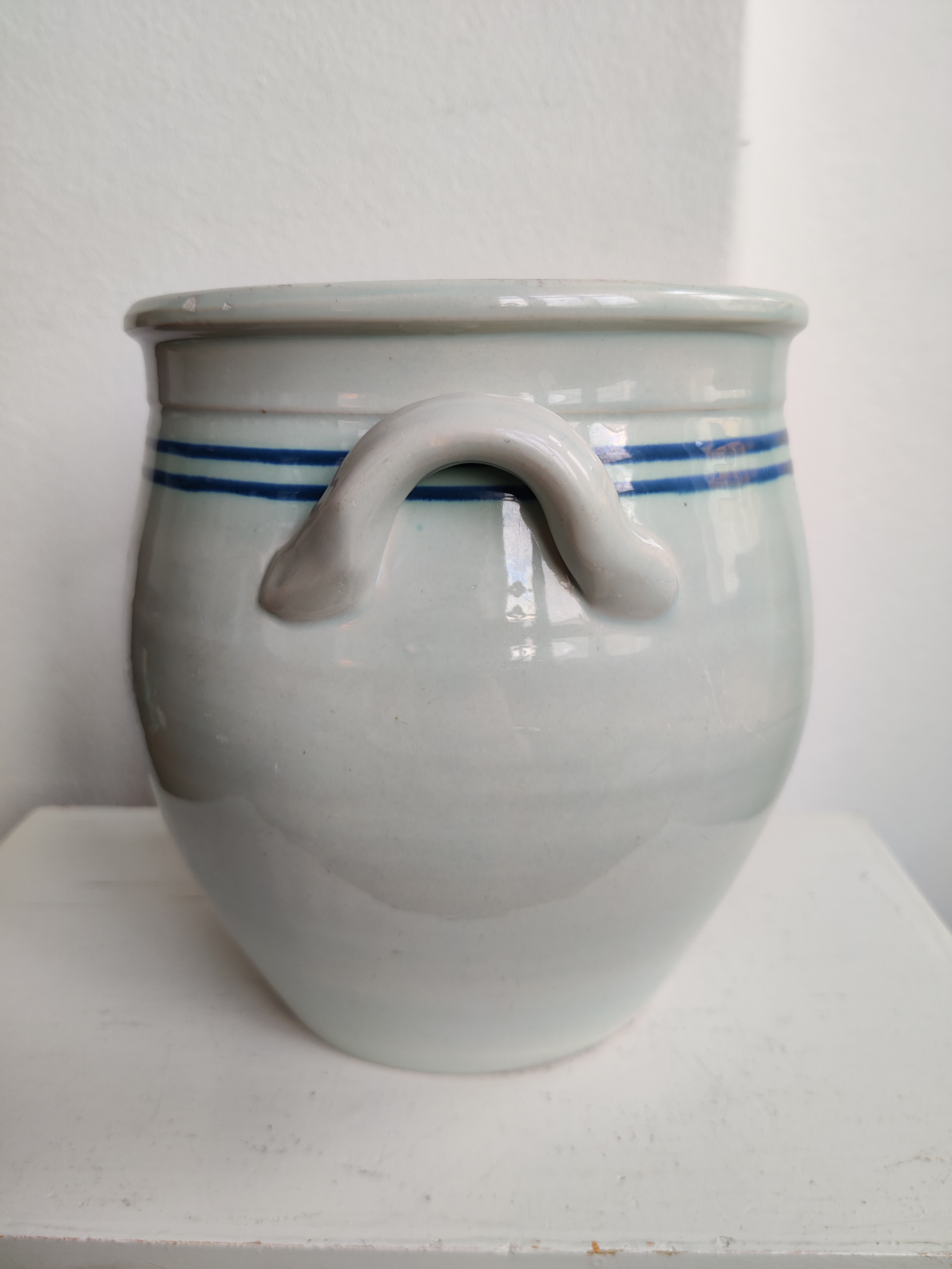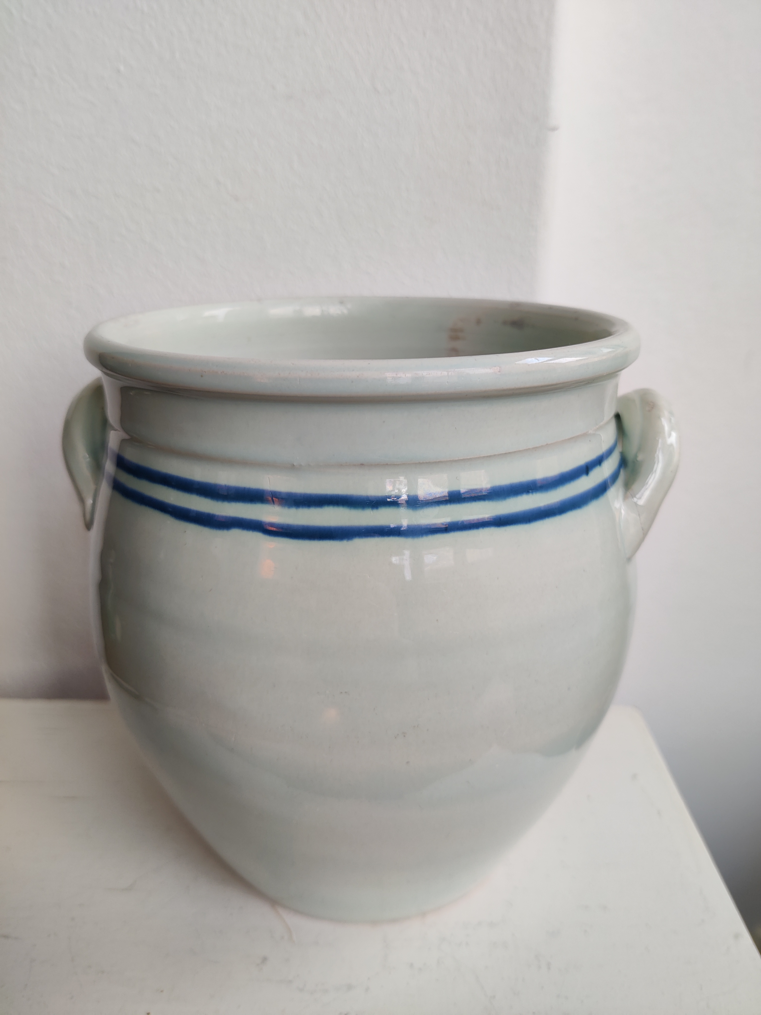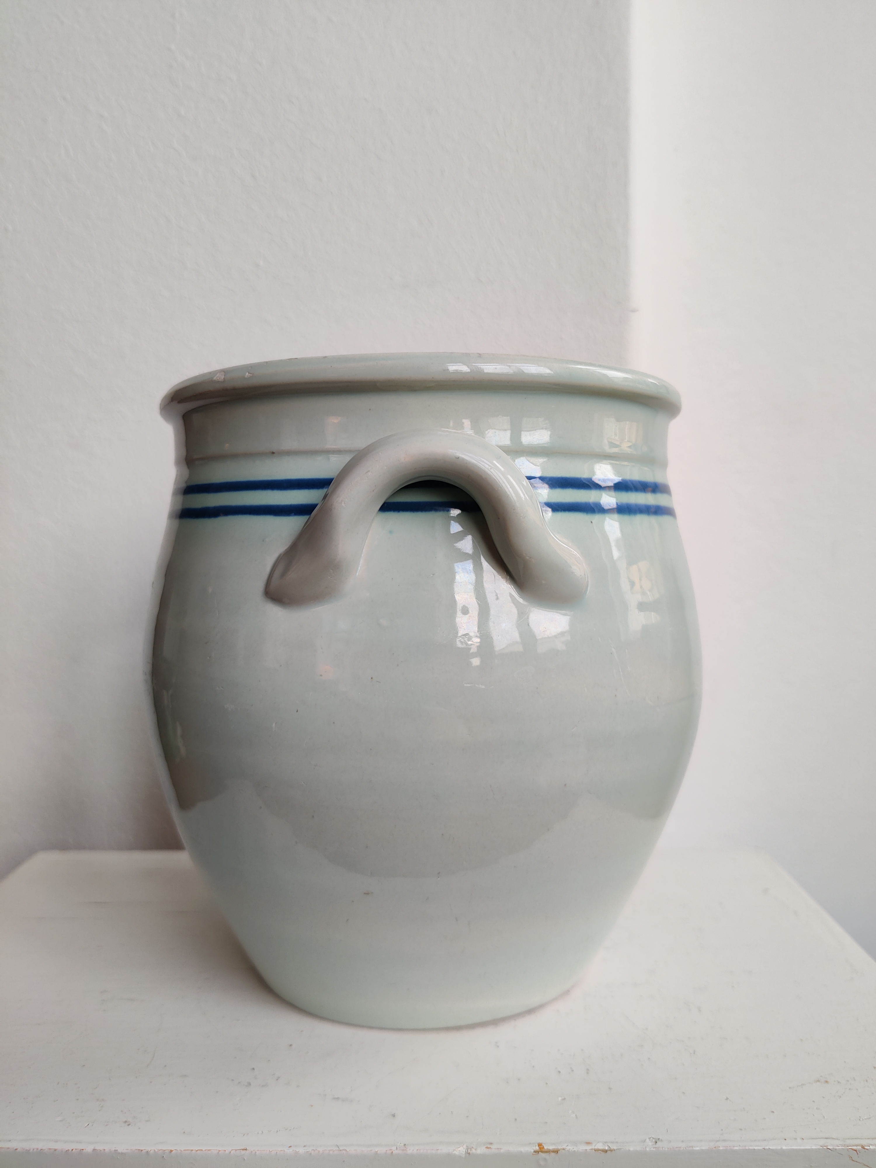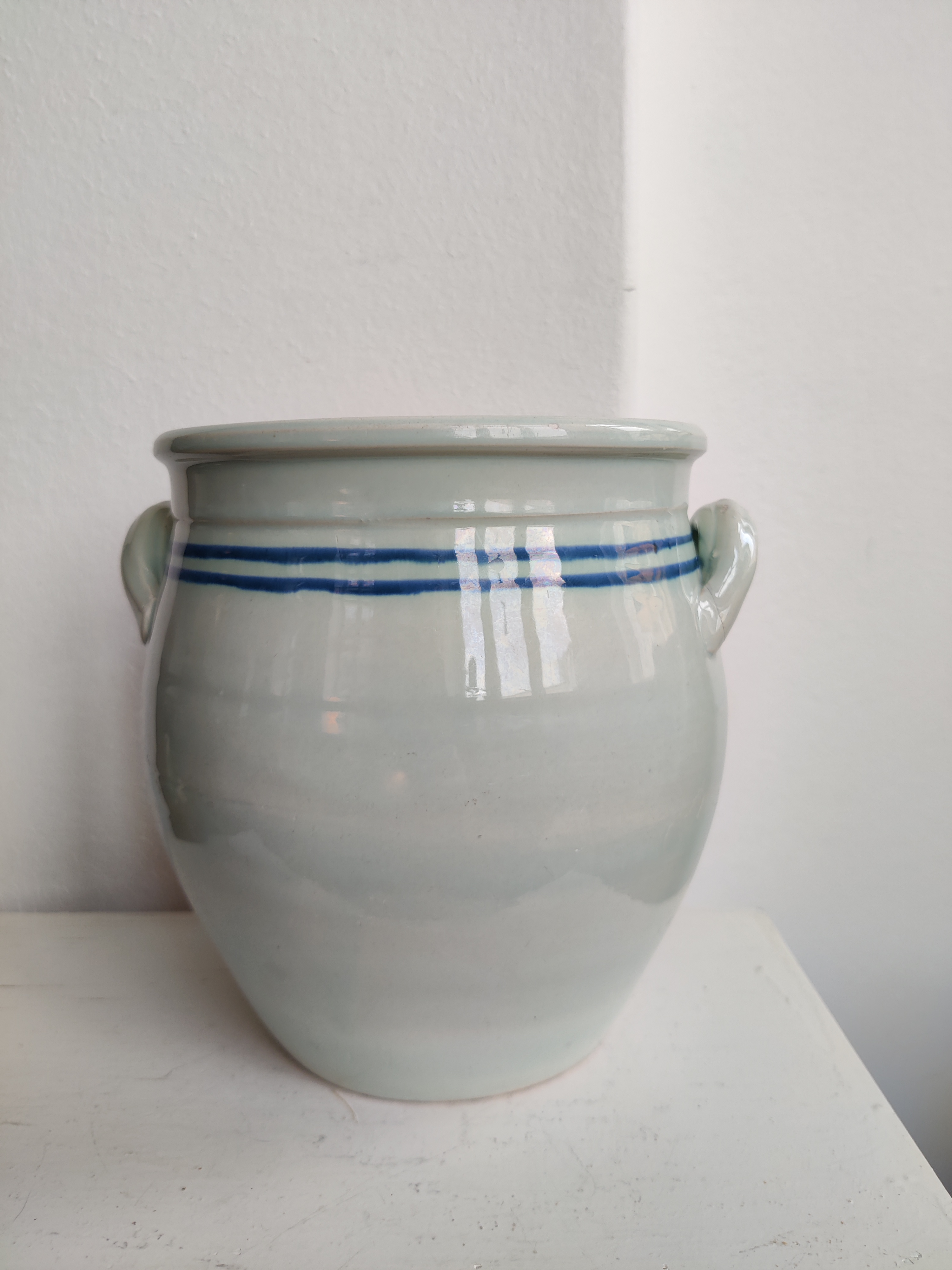 Stor og smuk lyseblå syltekrukke fra et sted omkring 1930. Den er svensk og stemplet Gefle Bo Sweden. Den har en lille reparation ved det ene håndtag. Brug den til dine grydeskeer eller som potteskjuler til krydderurter. Mål 18 x 18 cm.