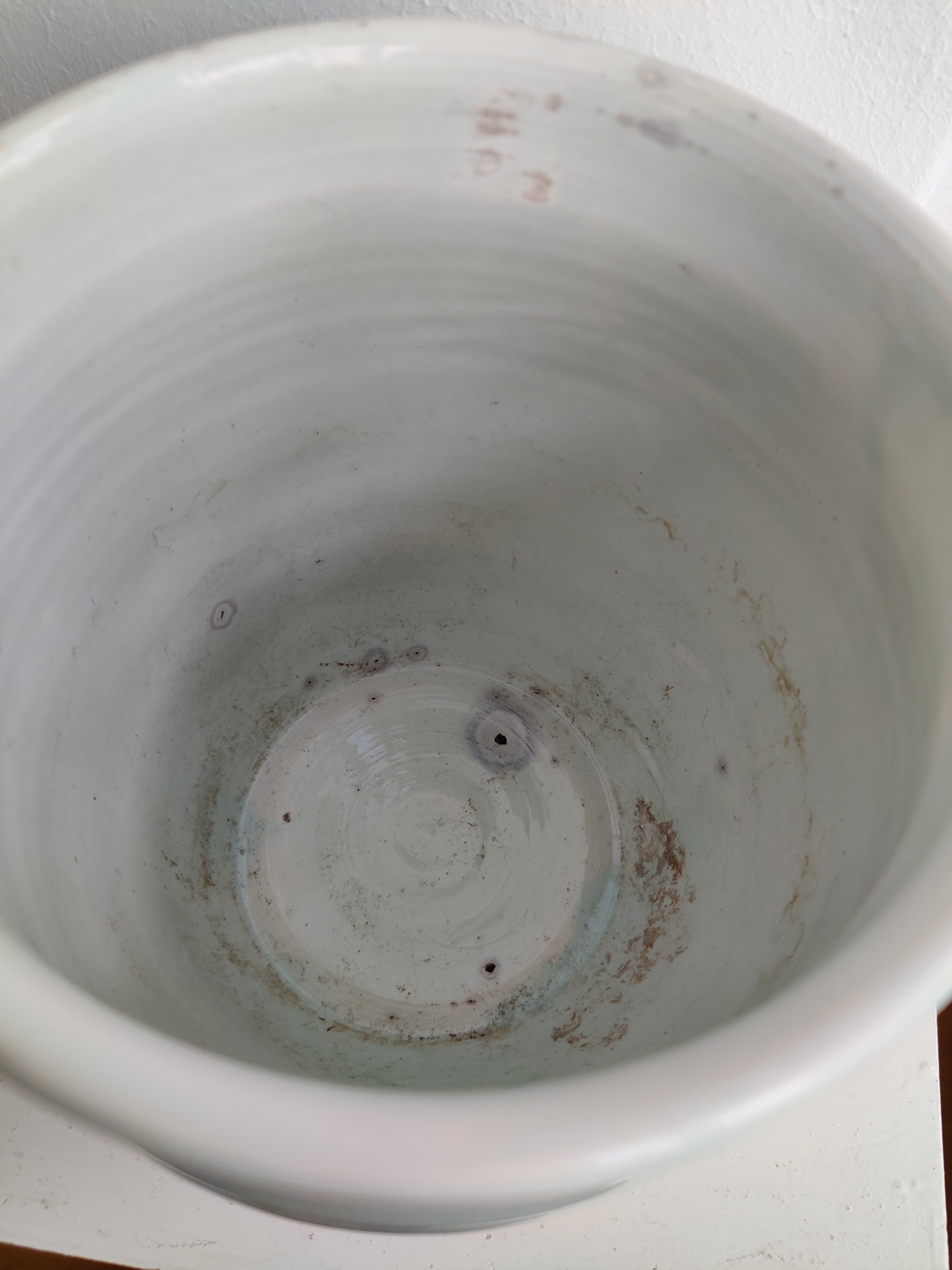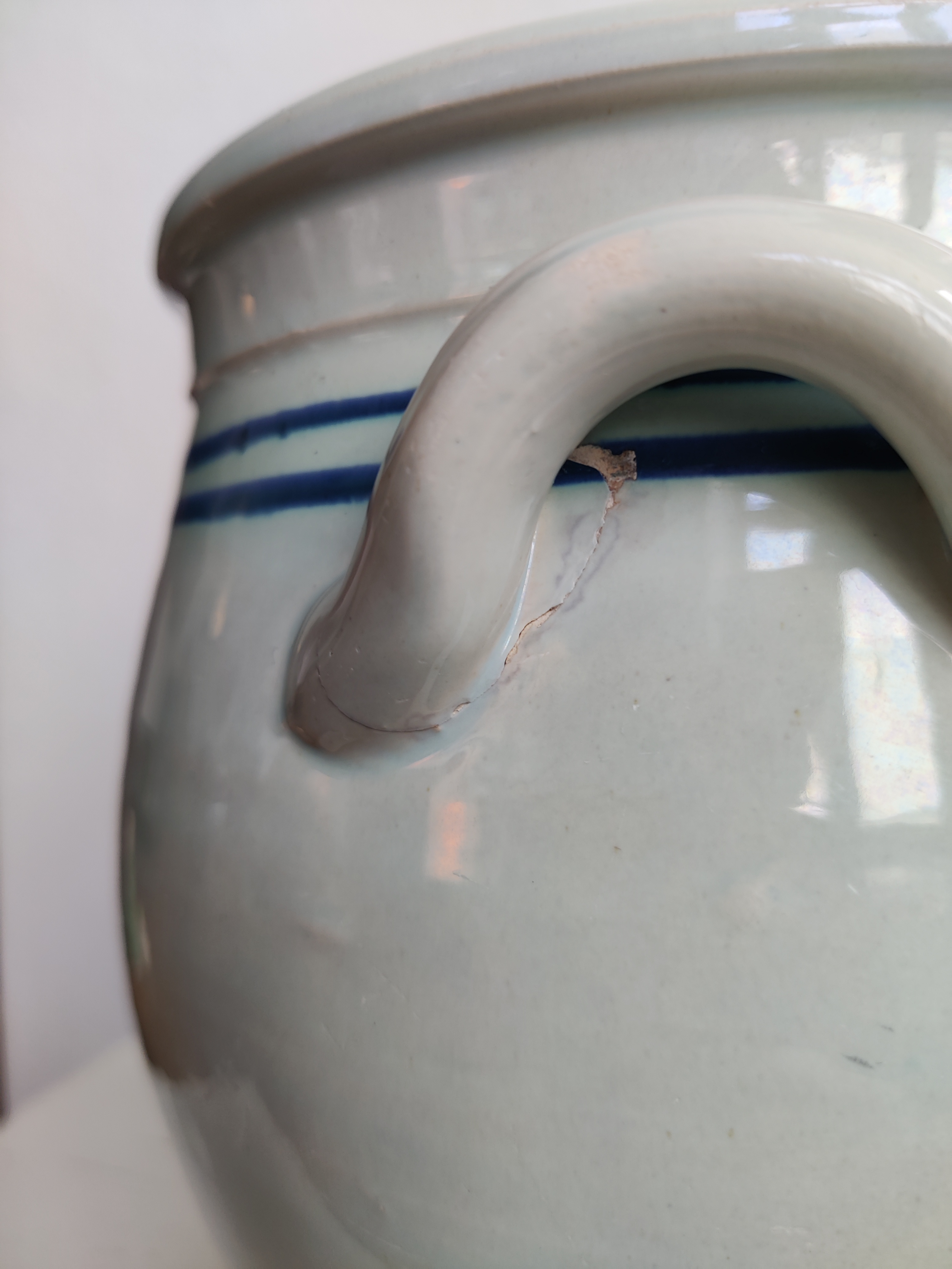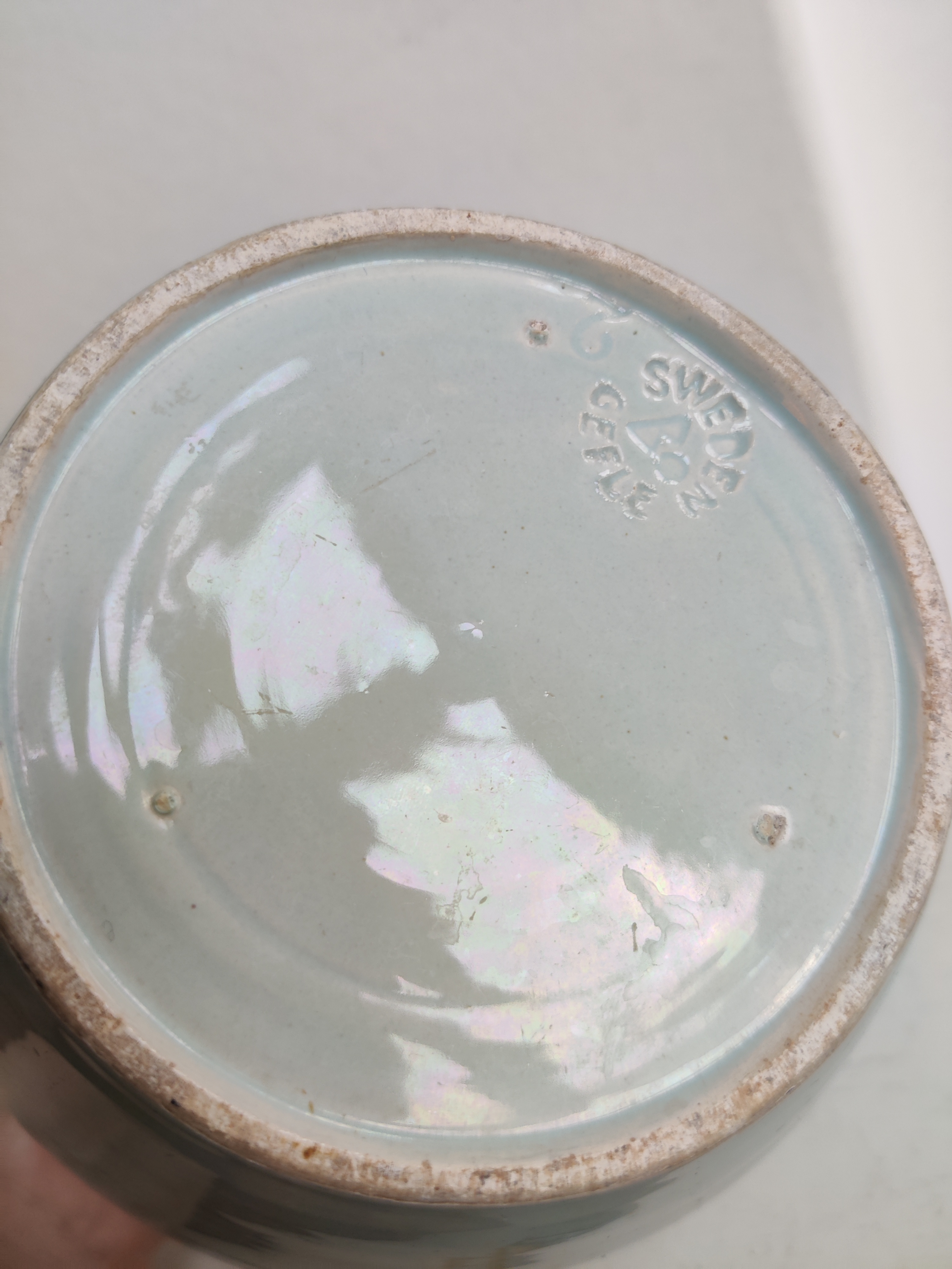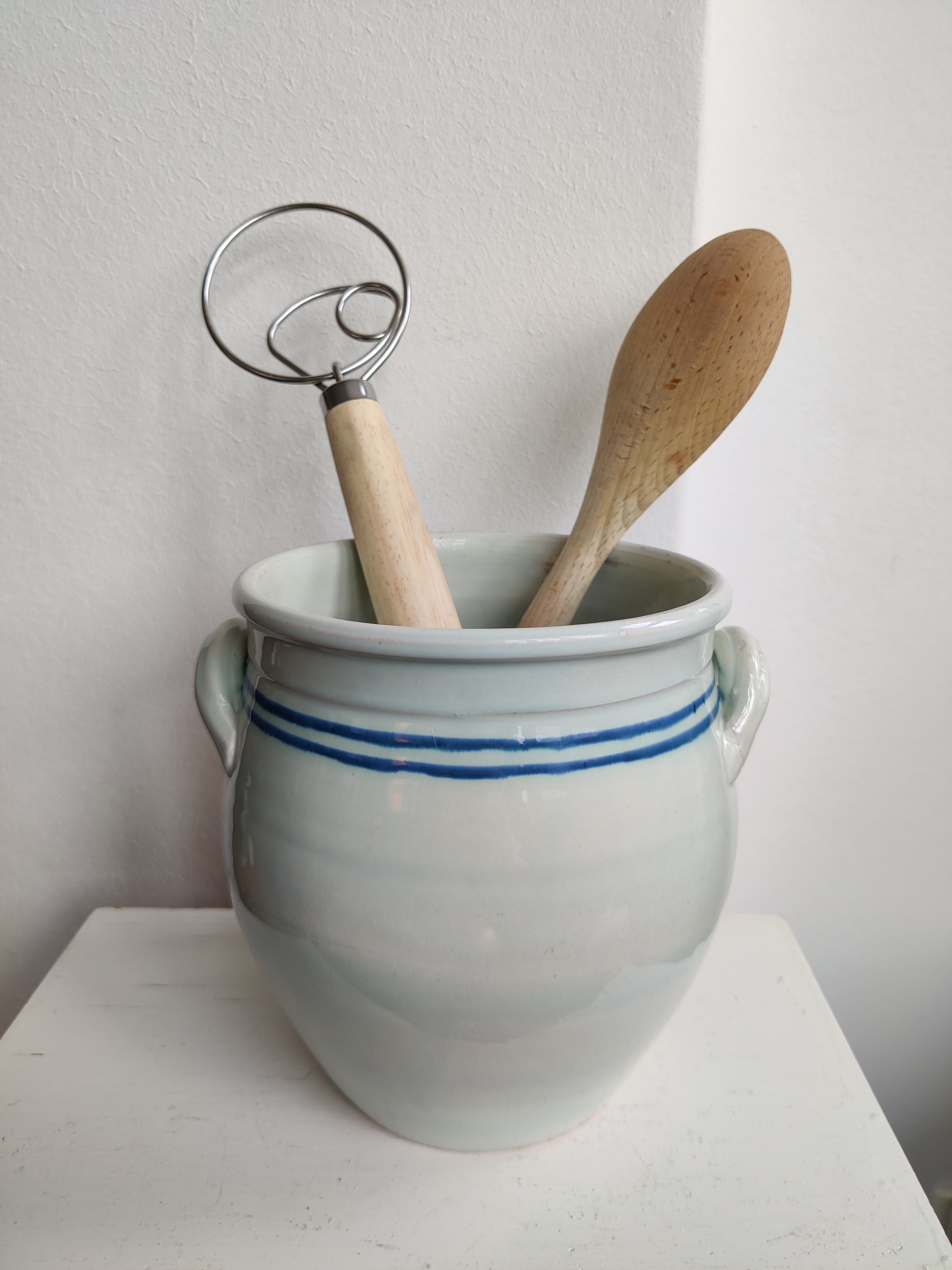 Stor og smuk lyseblå syltekrukke fra et sted omkring 1930. Den er svensk og stemplet Gefle Bo Sweden. Den har en lille reparation ved det ene håndtag. Brug den til dine grydeskeer eller som potteskjuler til krydderurter. Mål 18 x 18 cm.