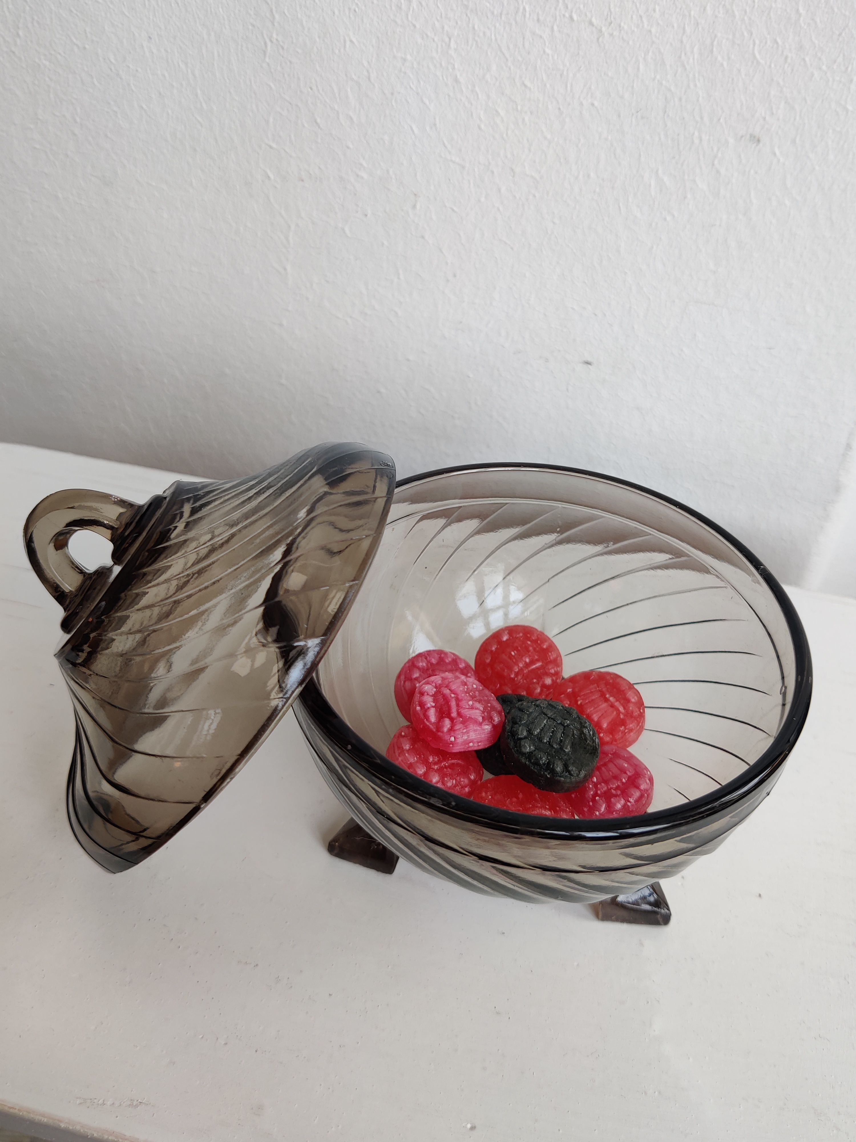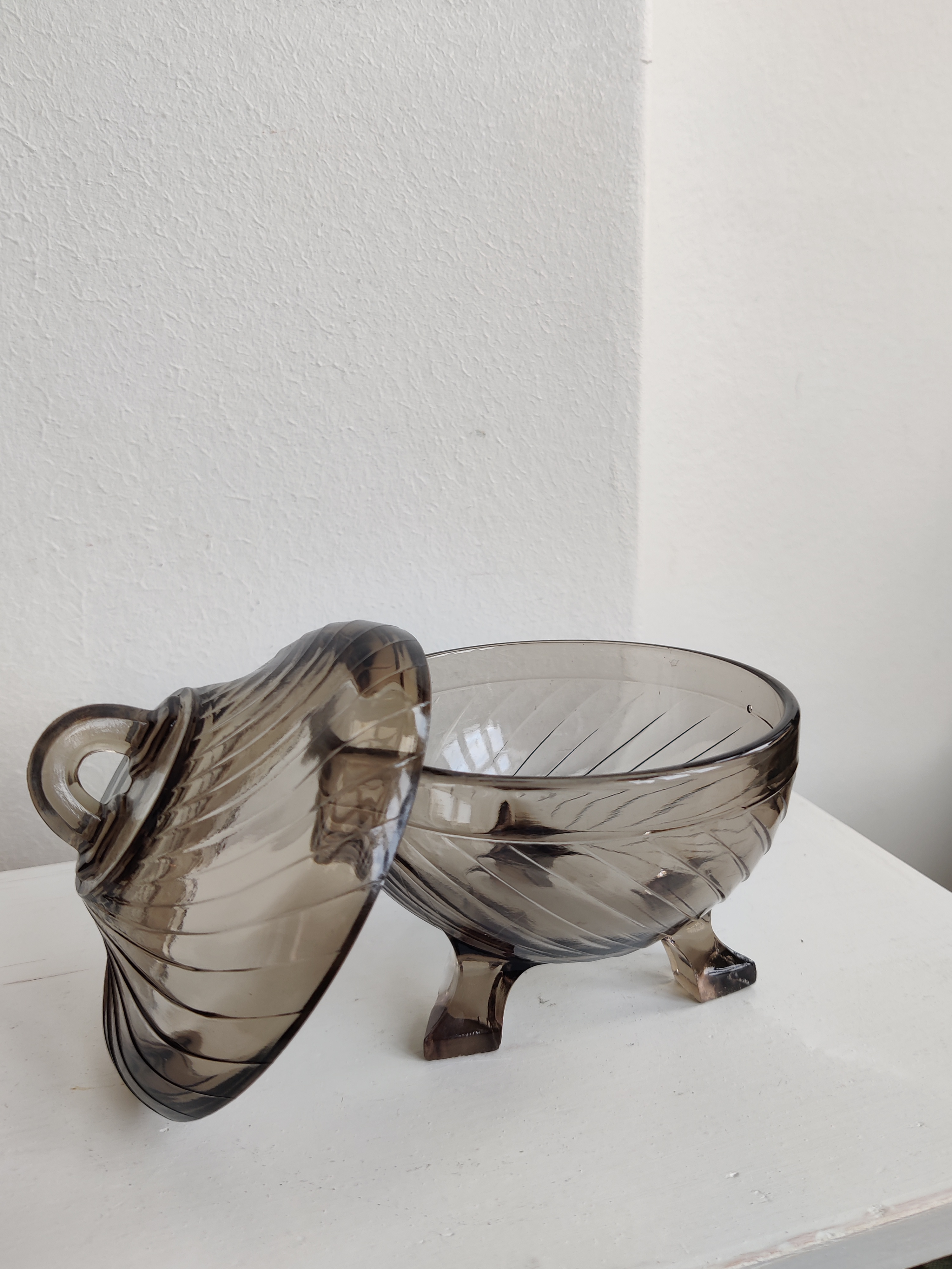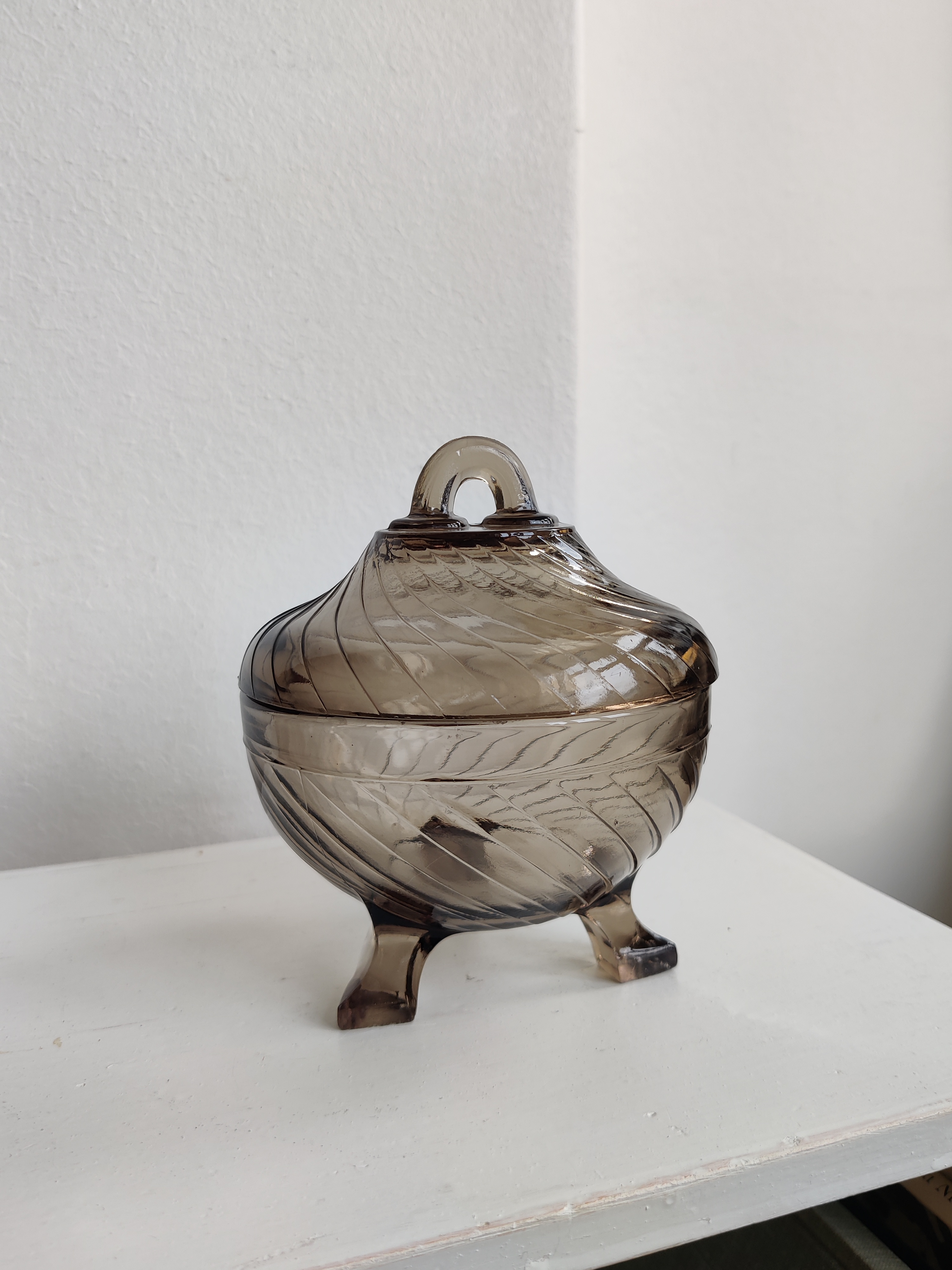 Meget sød gammel lågkkukke i presset røgfarvet glas. Brug den til sukkerknalder, fredagsslik, fine sten fra stranden, øreringe eller påskeæg. Mål 12 x 10.