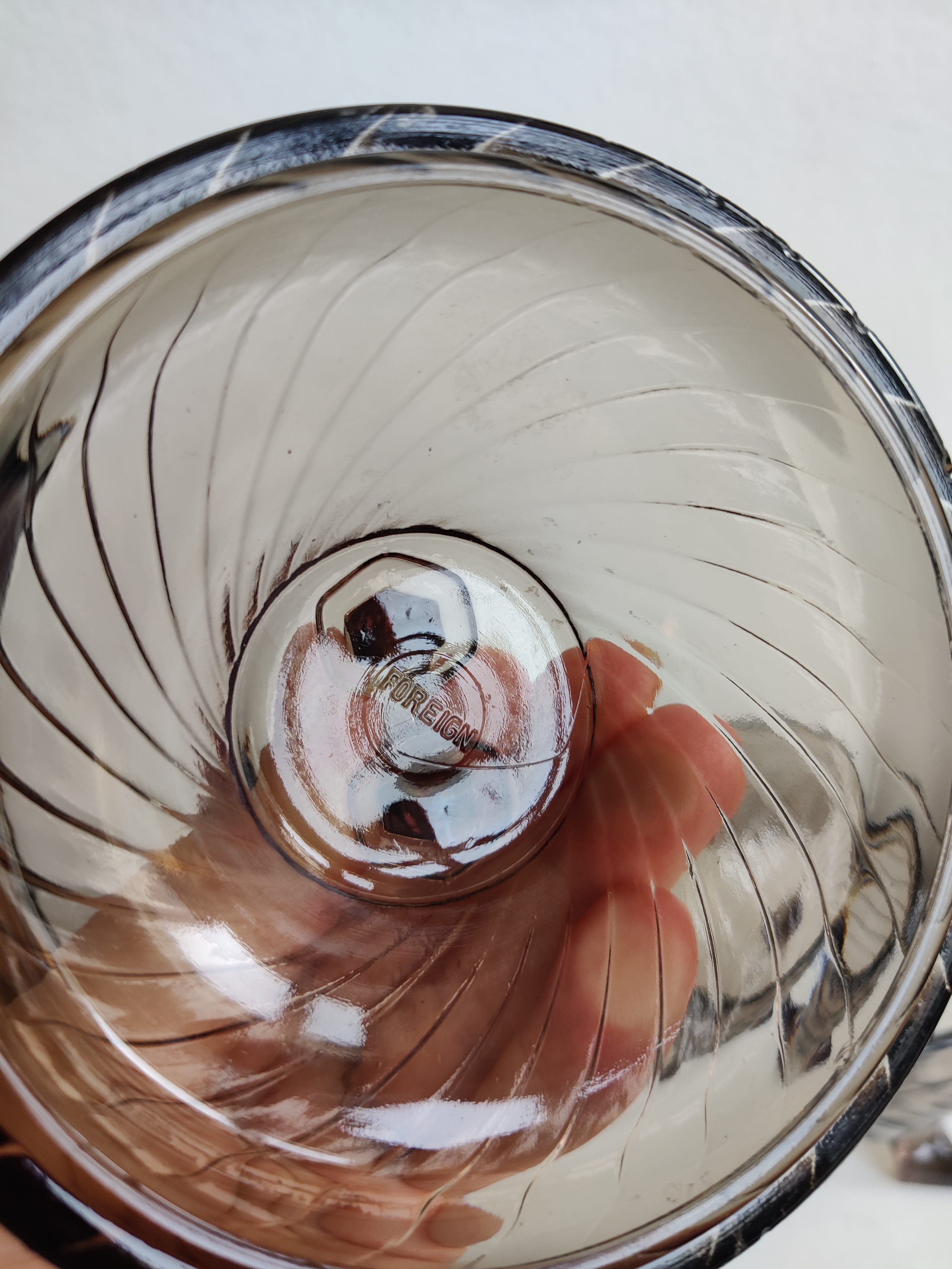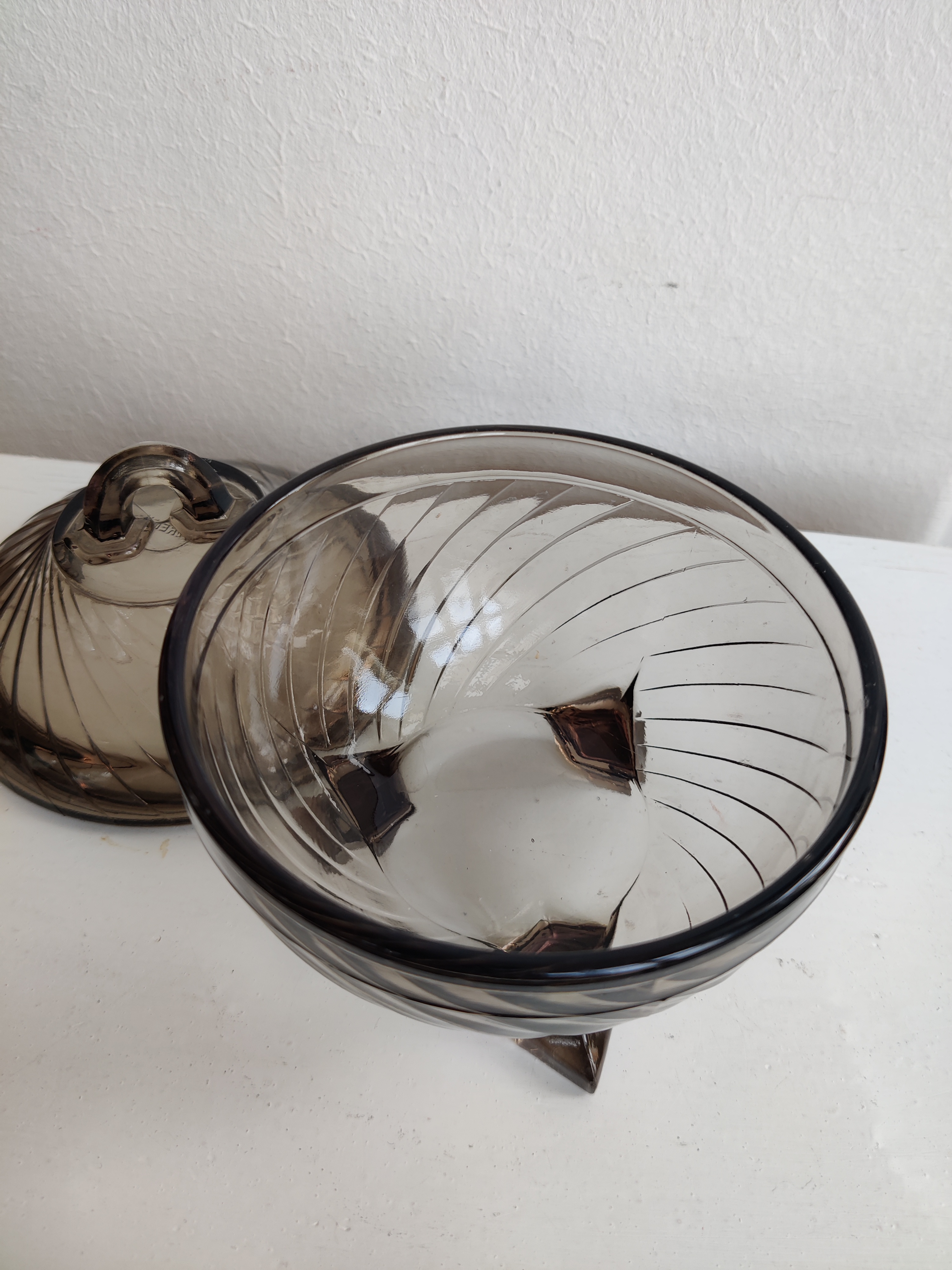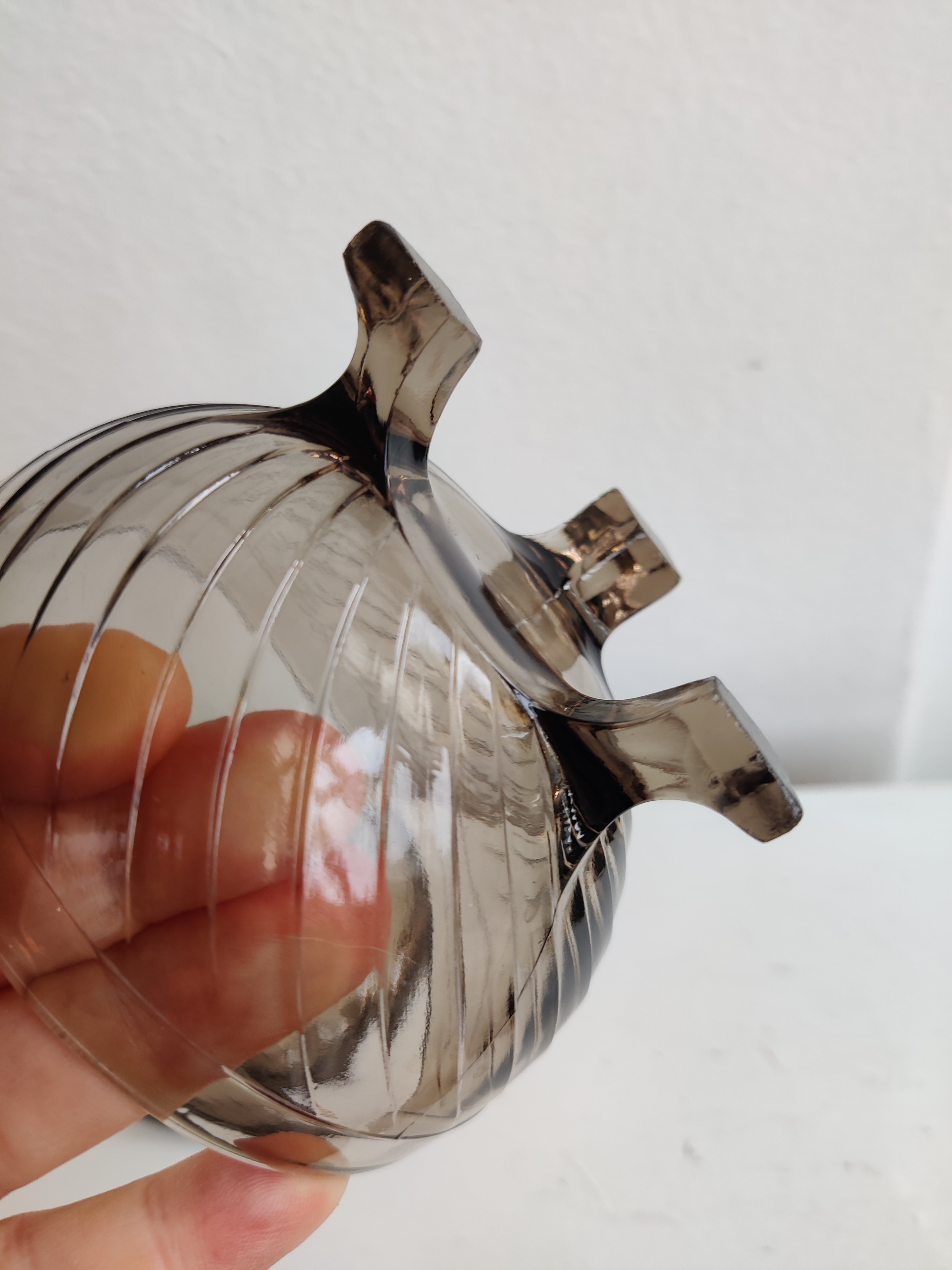 Meget sød gammel lågkkukke i presset røgfarvet glas. Brug den til sukkerknalder, fredagsslik, fine sten fra stranden, øreringe eller påskeæg. Mål 12 x 10.
