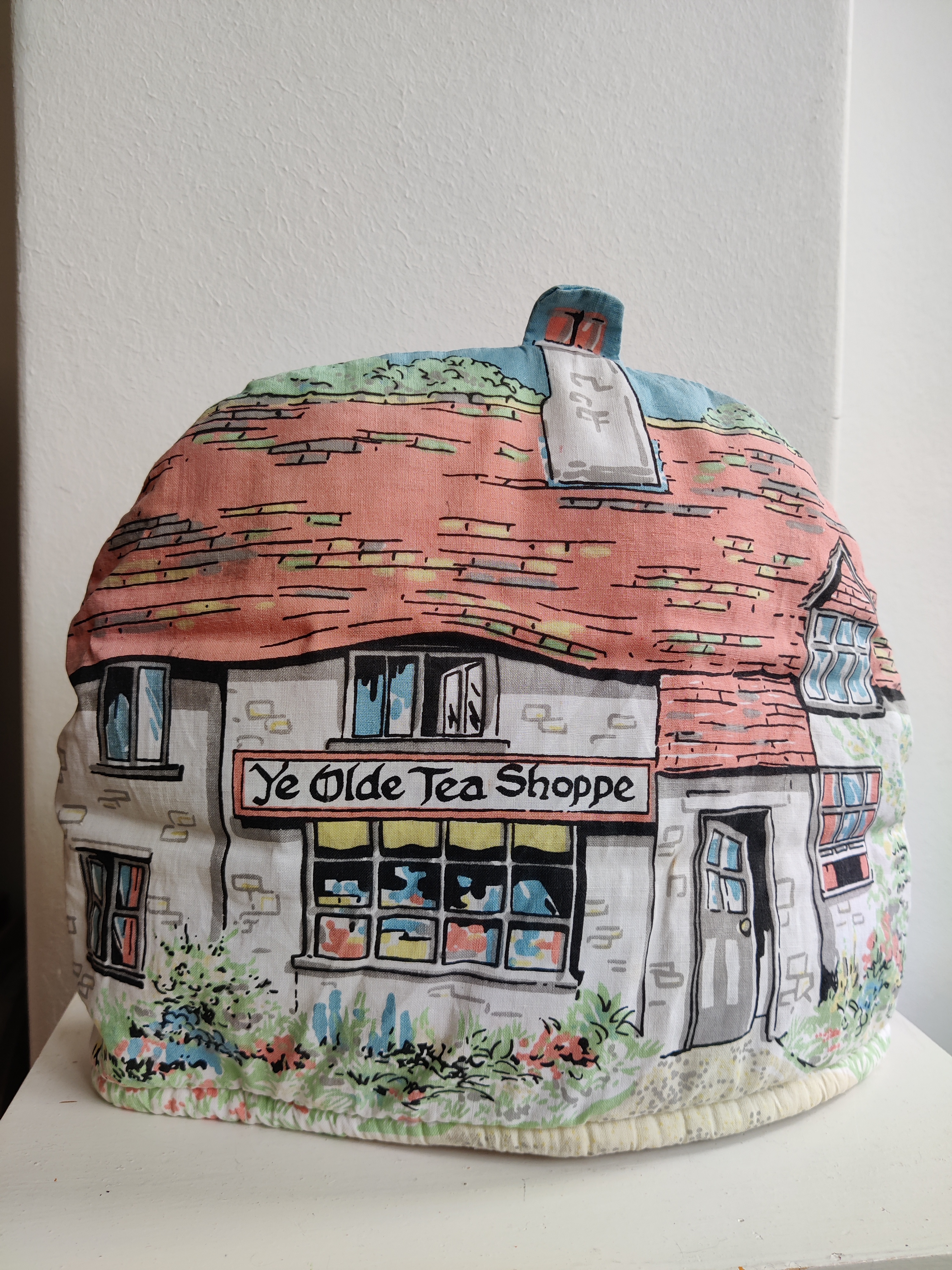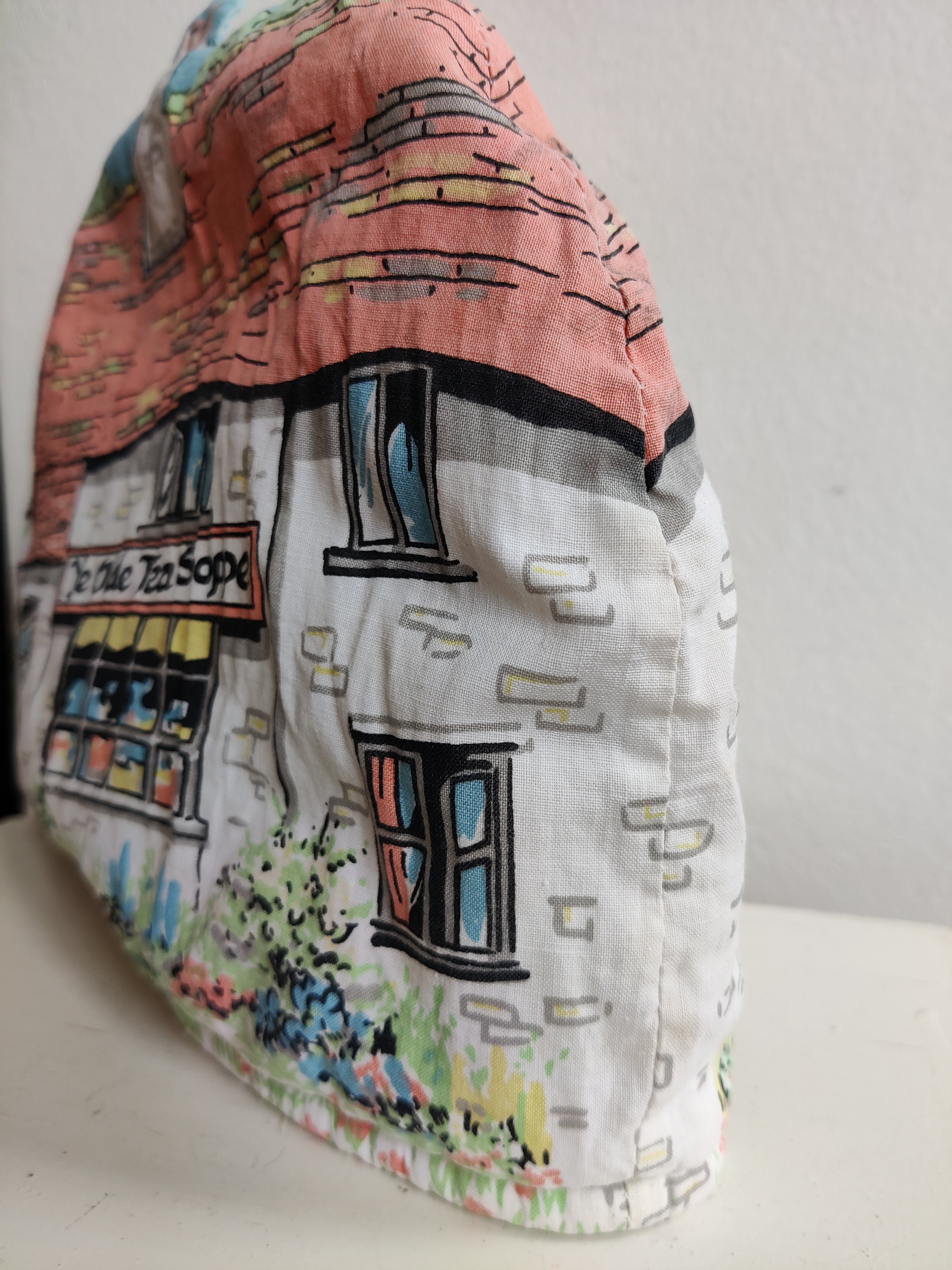 Fineste tehætte, der forestiller et lille hus med en tebutik. Meget charmerende og meget engelsk. Renset og vasket efter alle kunstens regler. 30 x 23 cm.