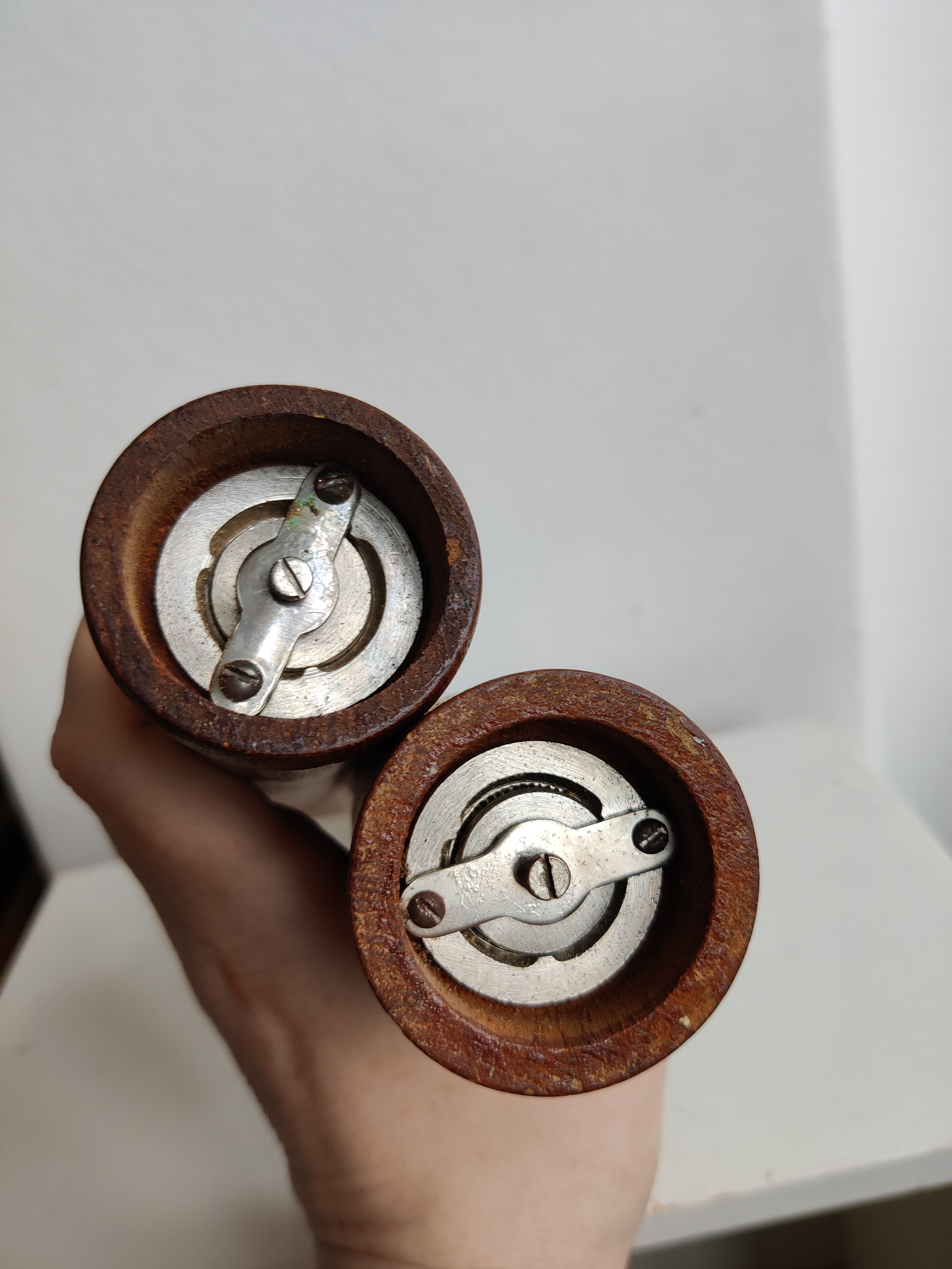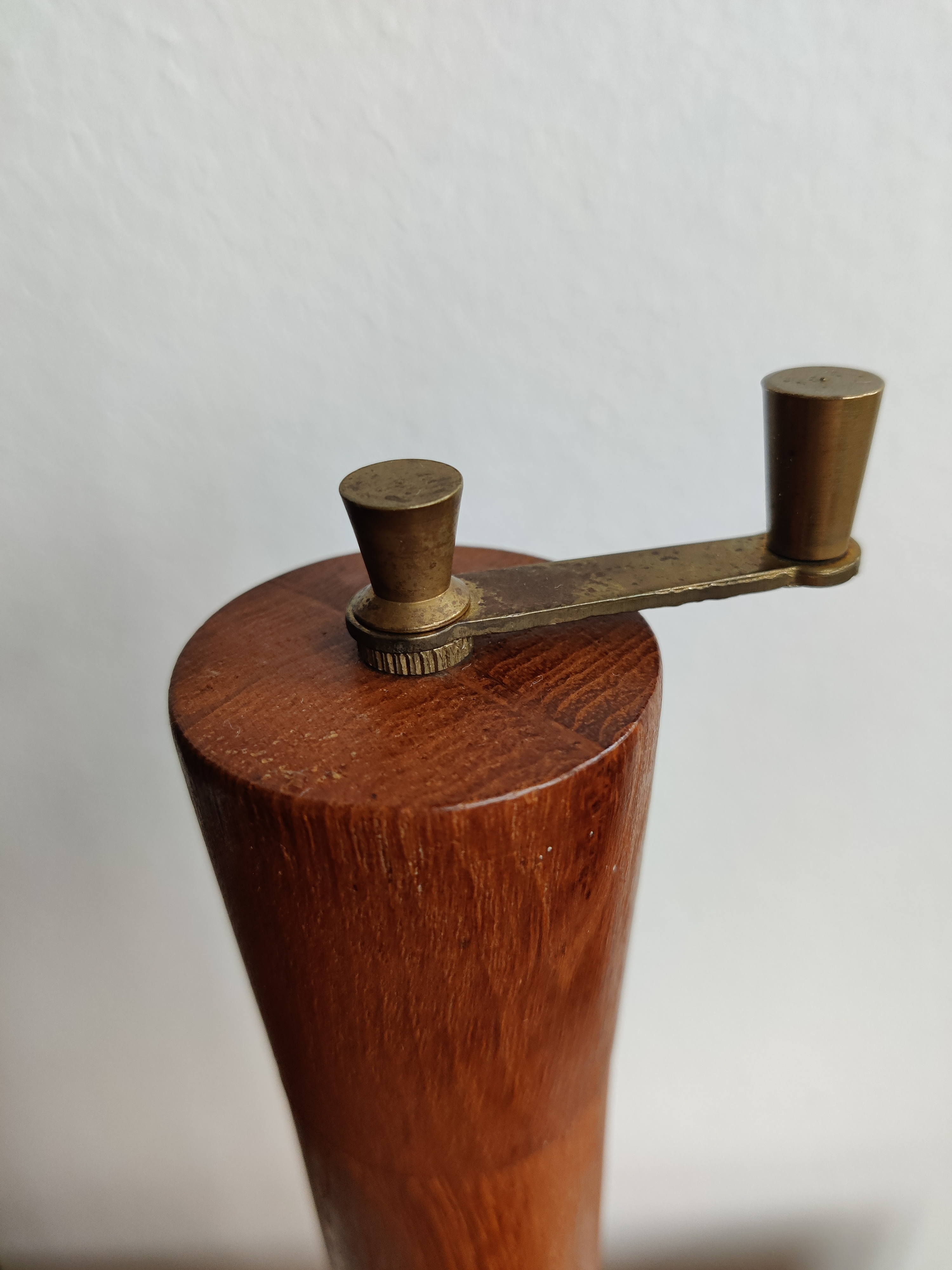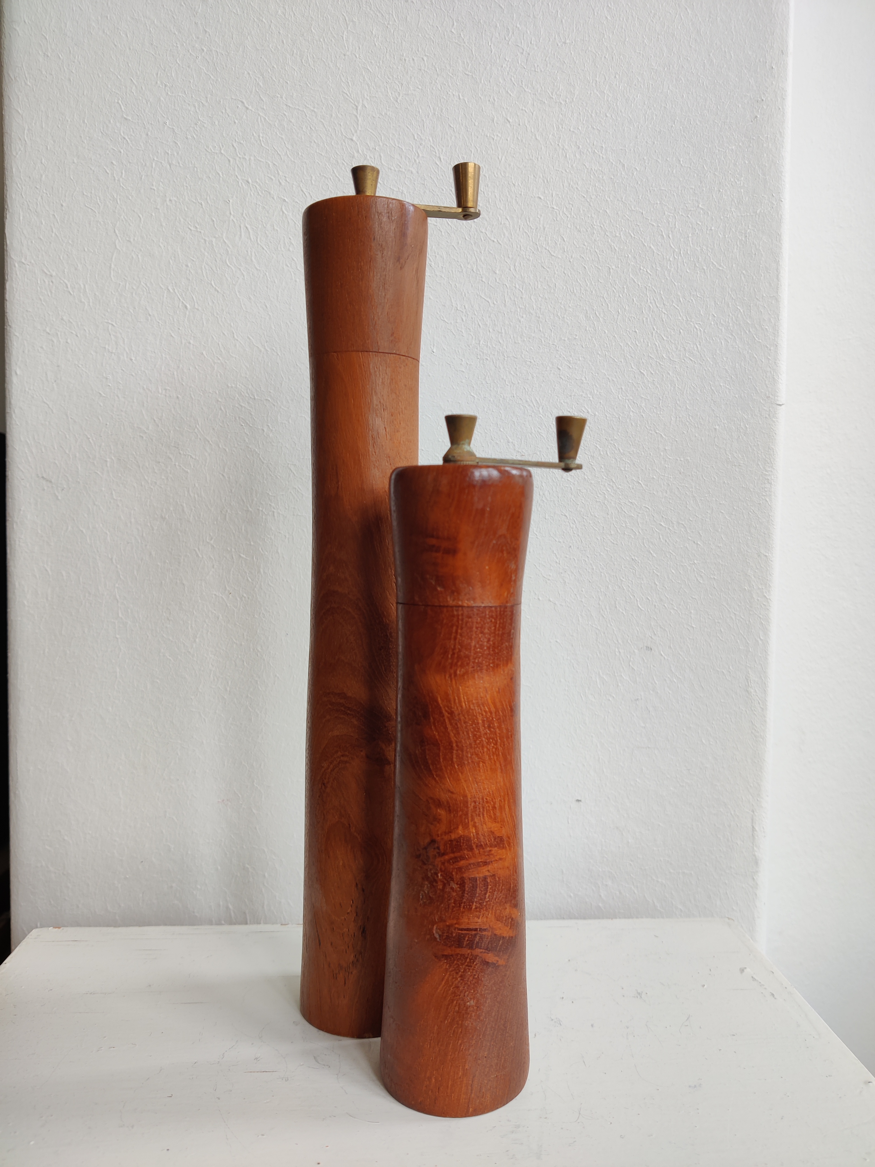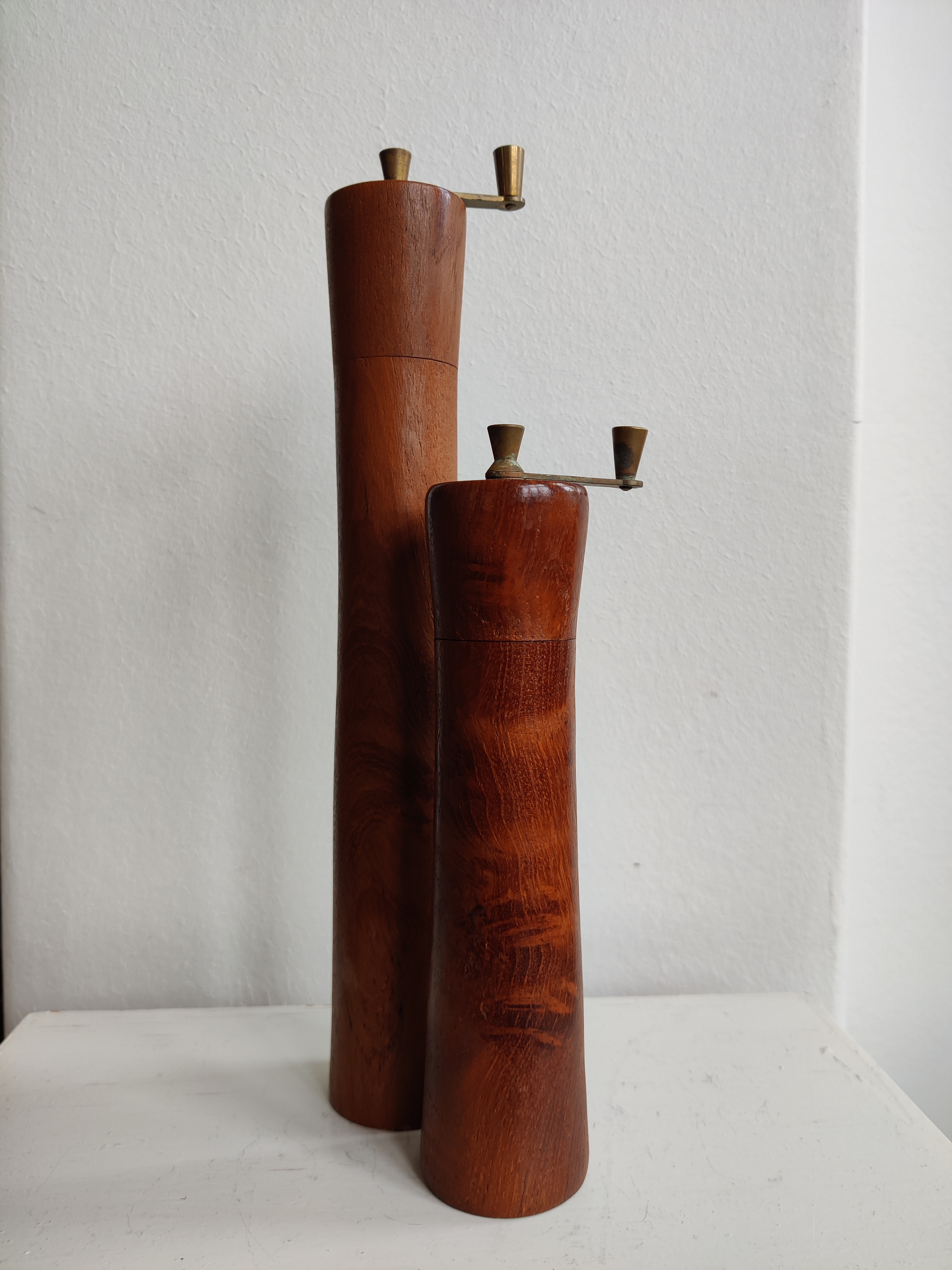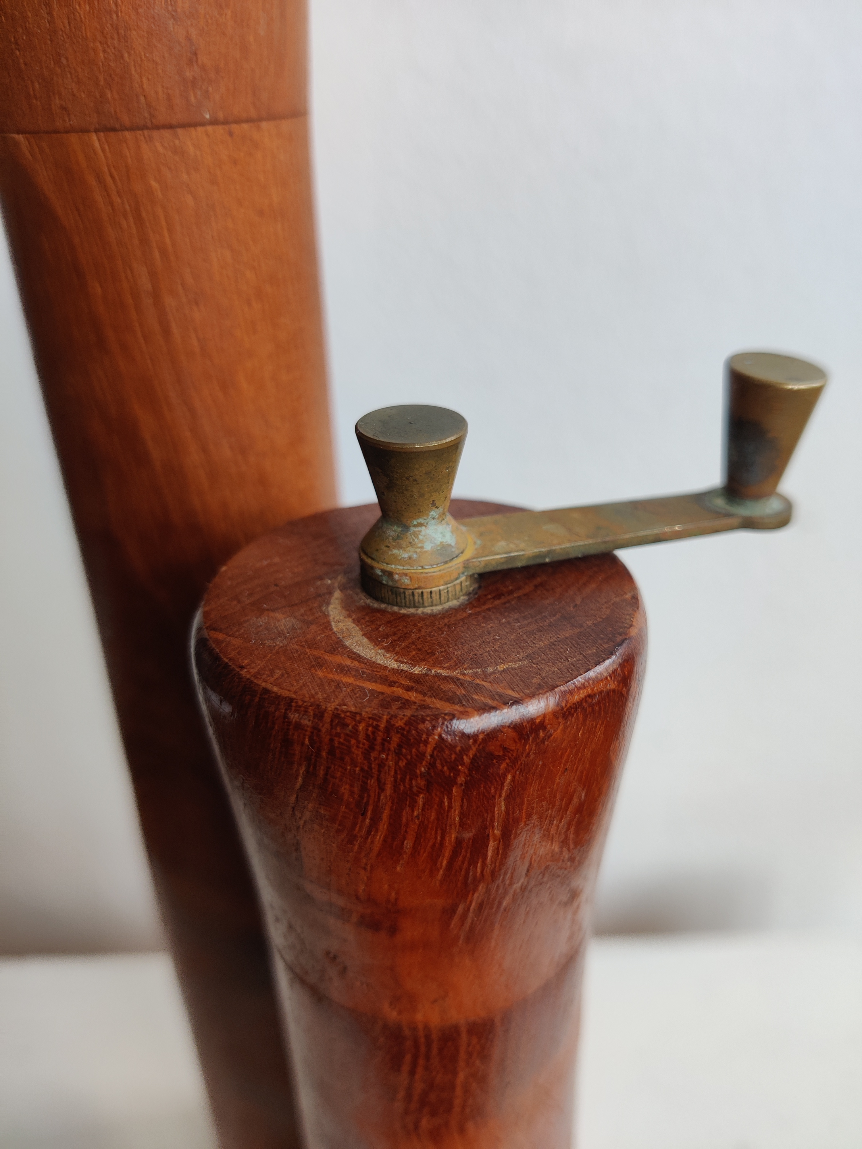 Smukt og højt salt- og pebersæt med messinghåndtag. De er af teak og fra 1960'erne. Den høje peberkværn måler 28 cm, den lave saltkværn måler 19 cm.
