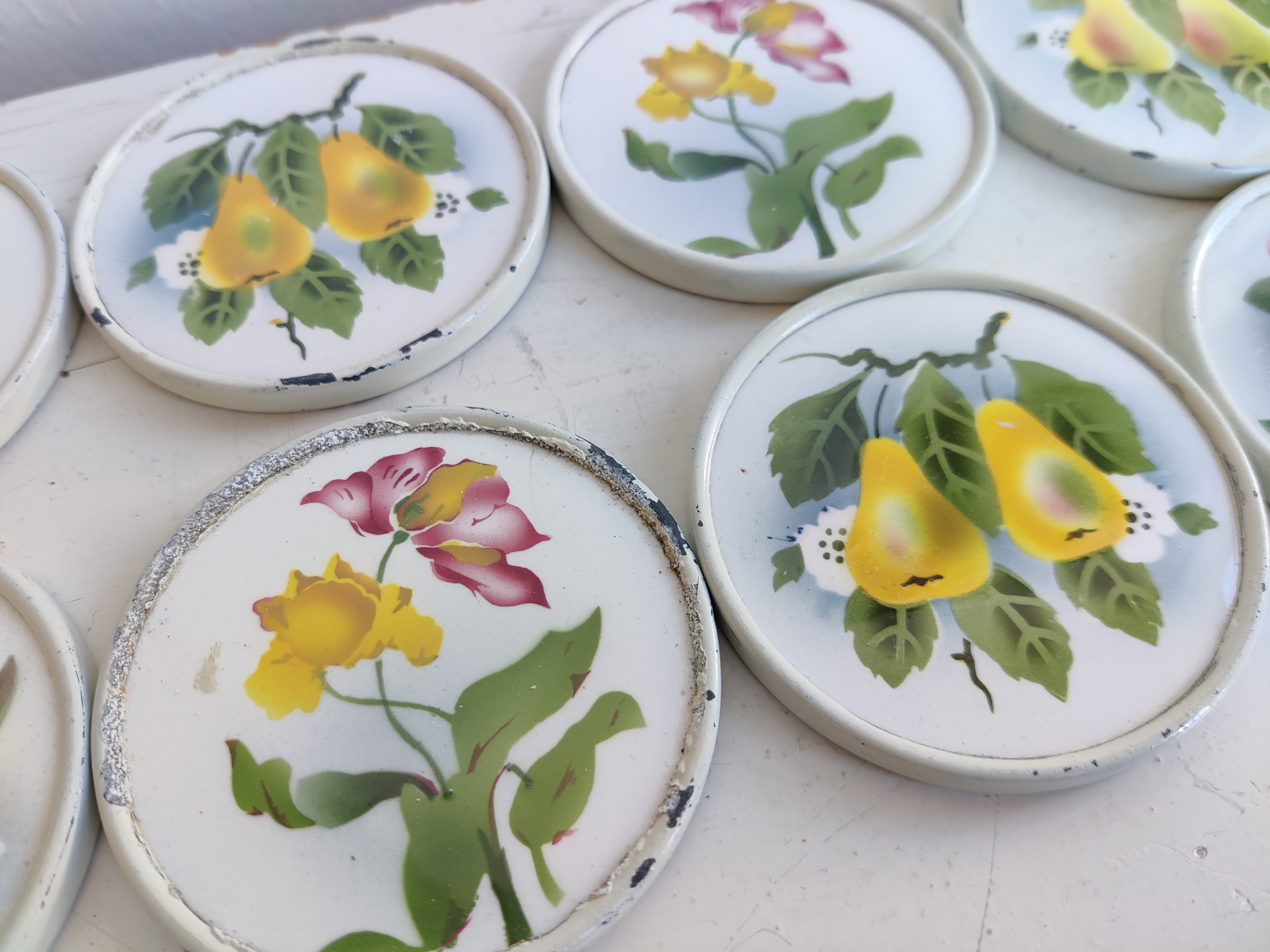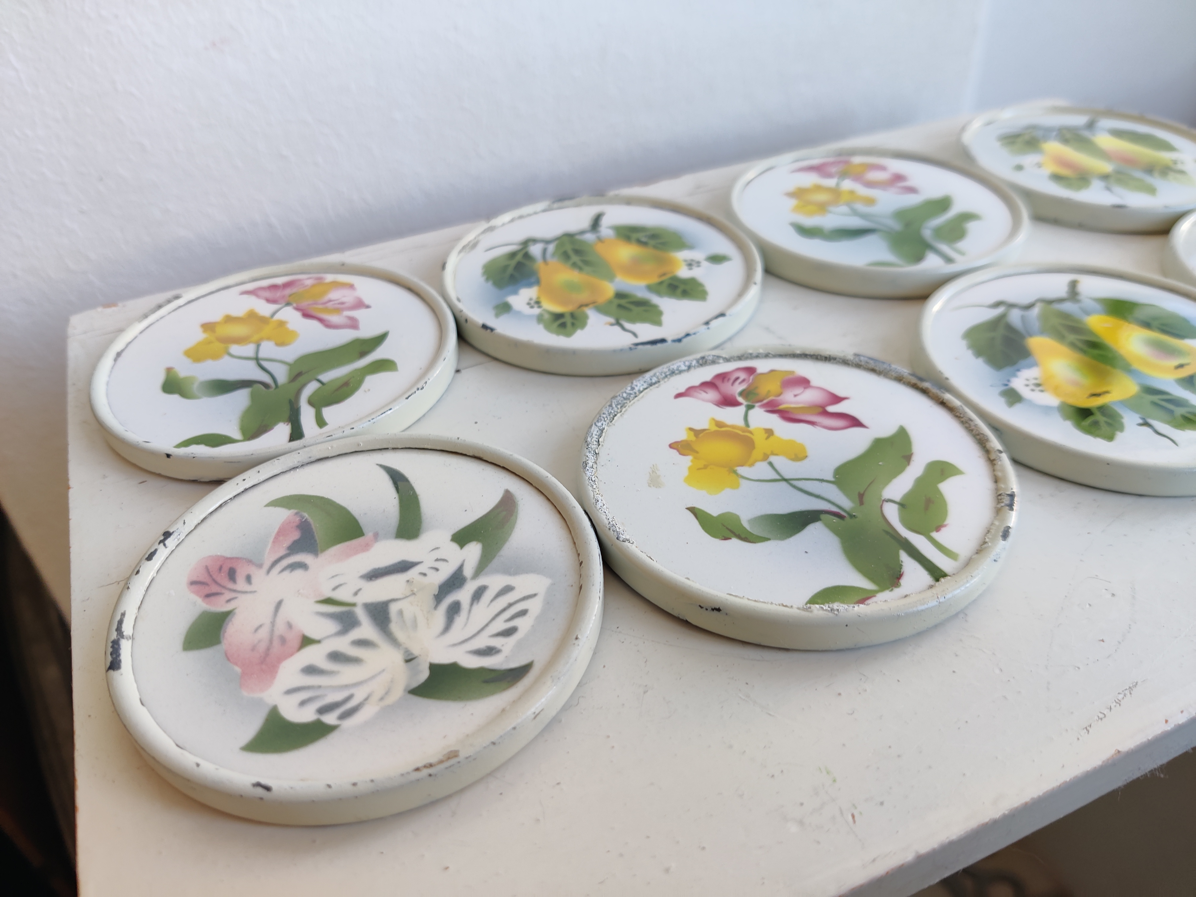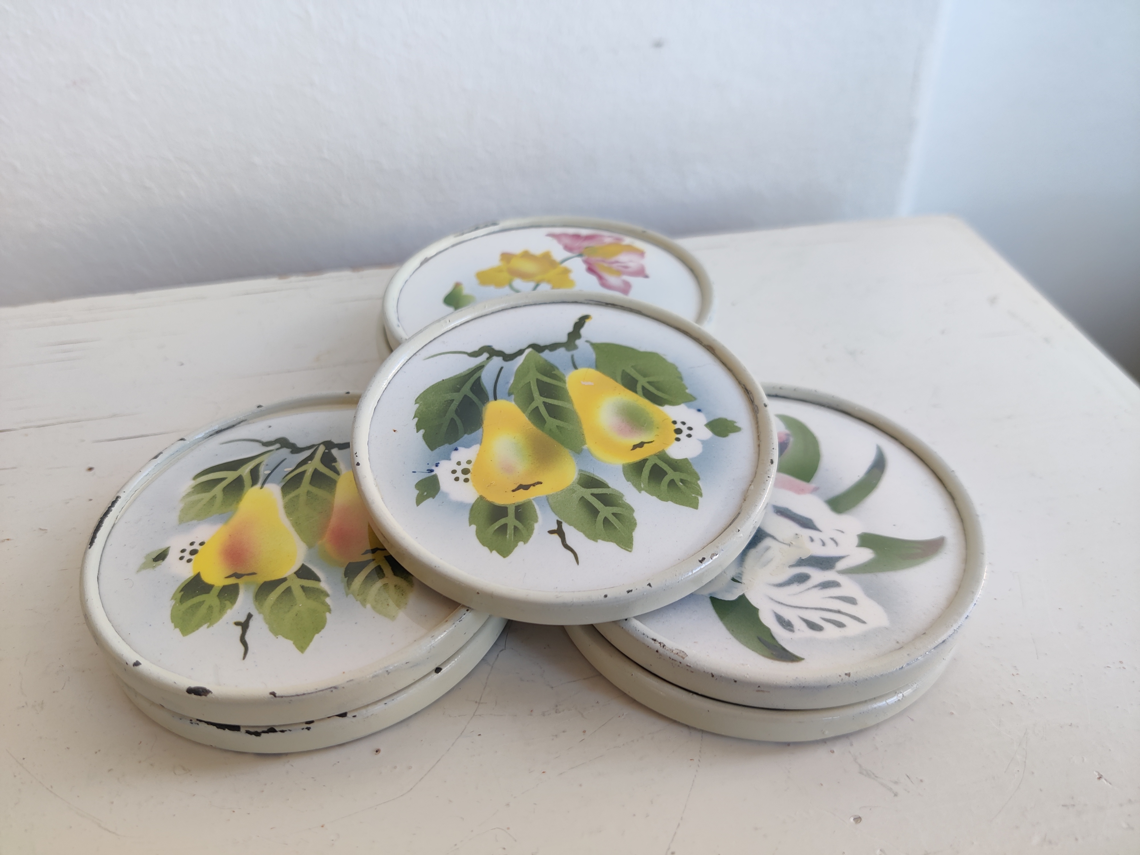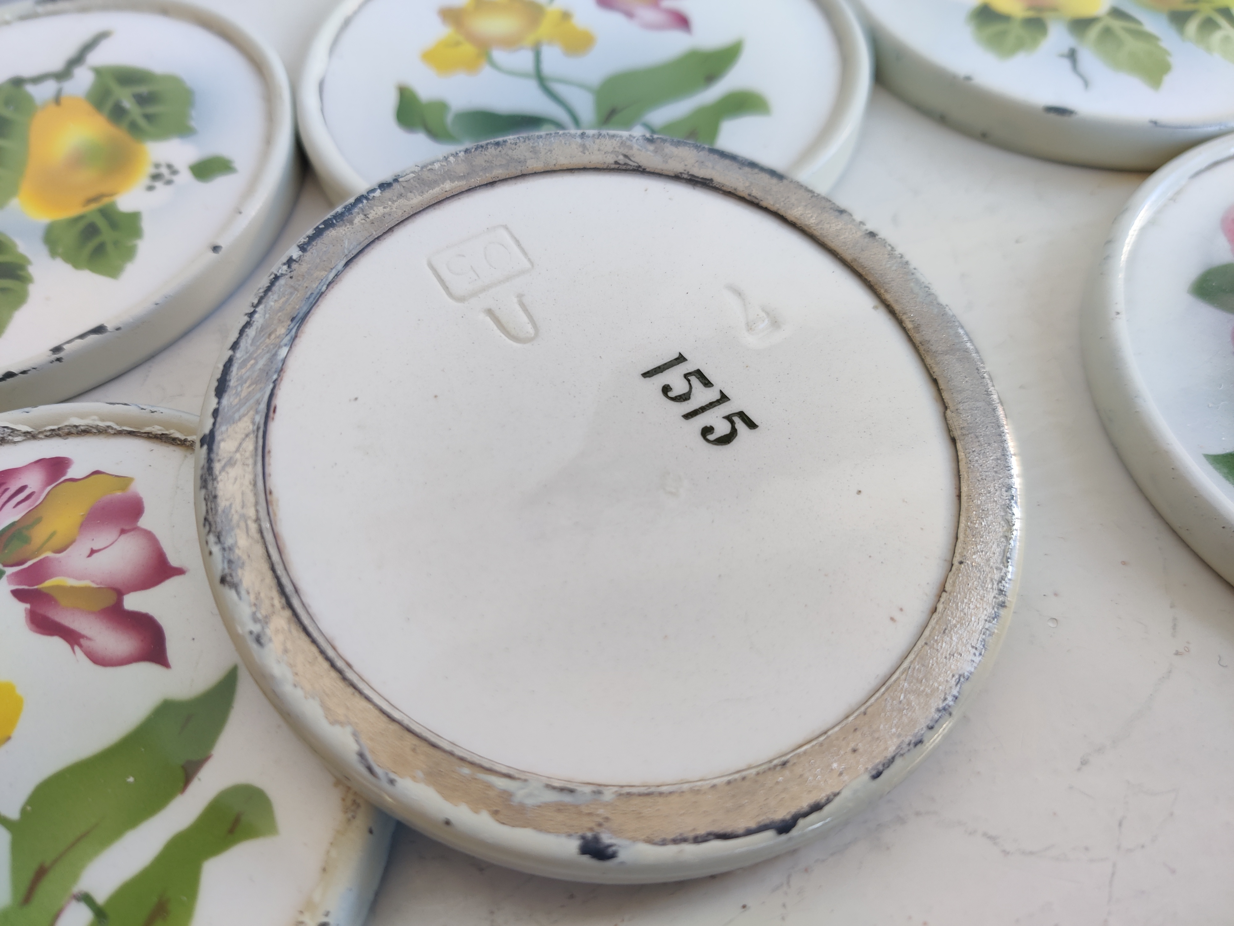 Otte smukke rigtig gamle coasters med pærer og blomstermotiver. De er franske og af porcelæn med emaljeret metalkant. Diameter 7 cm.