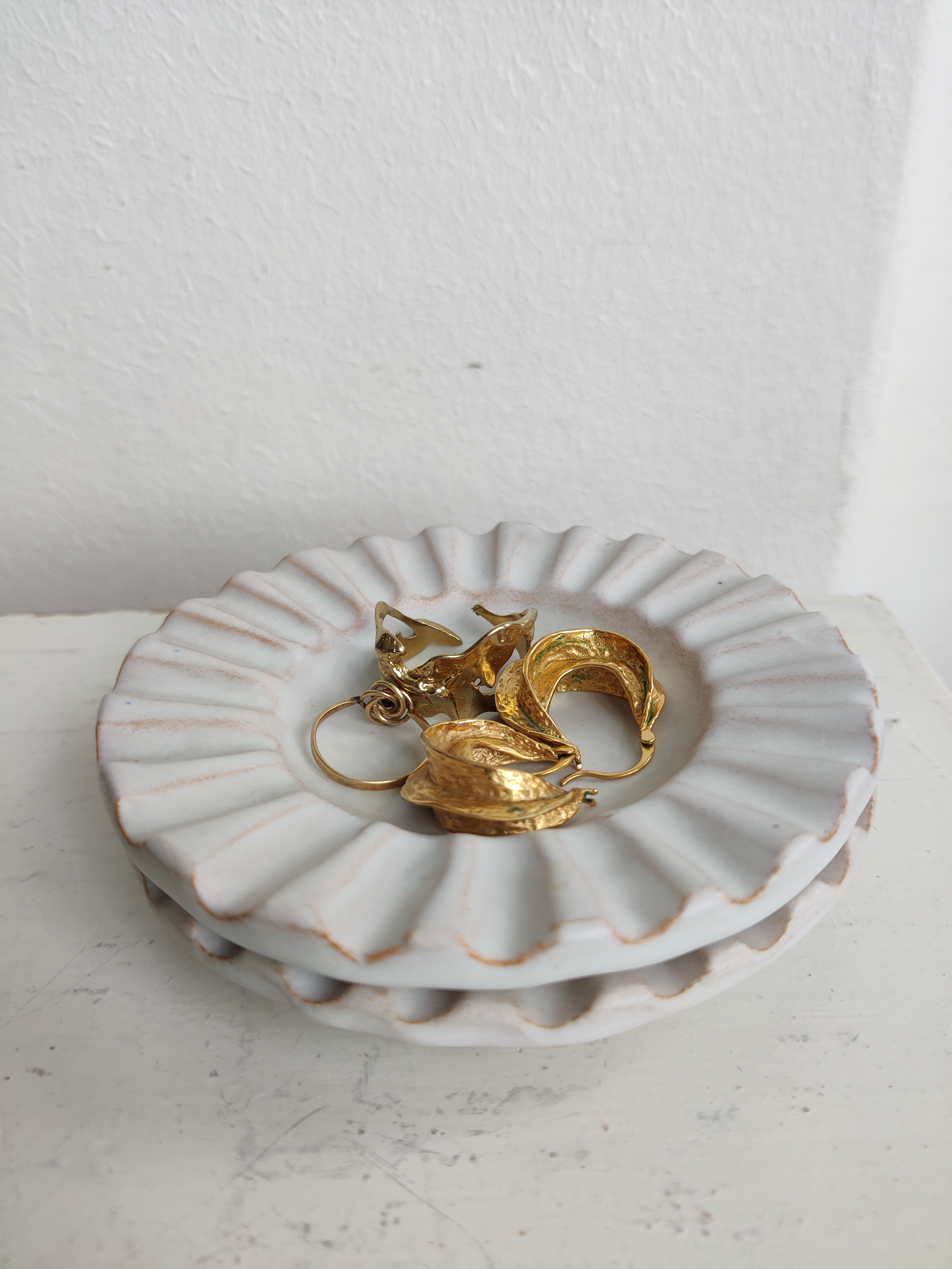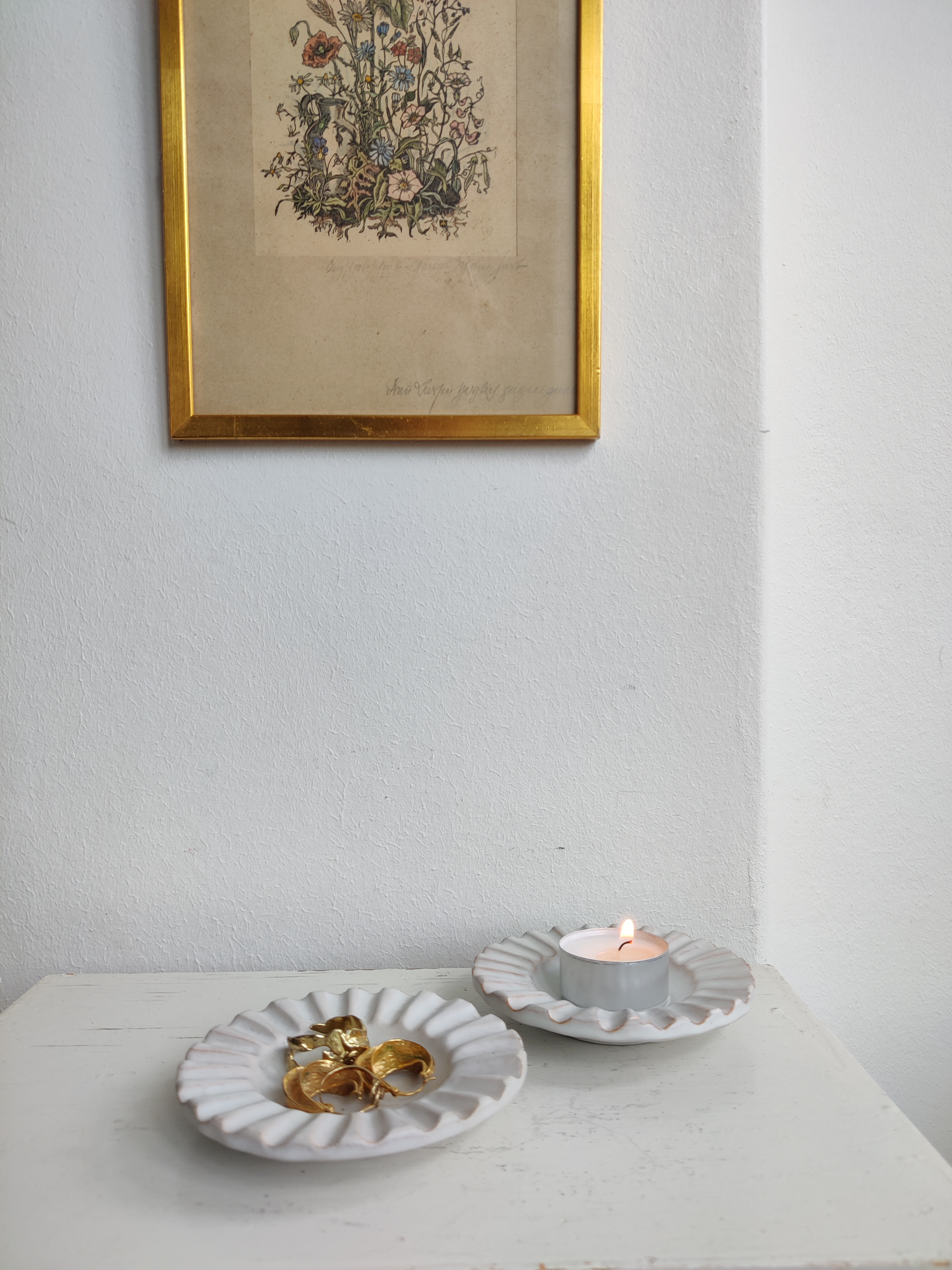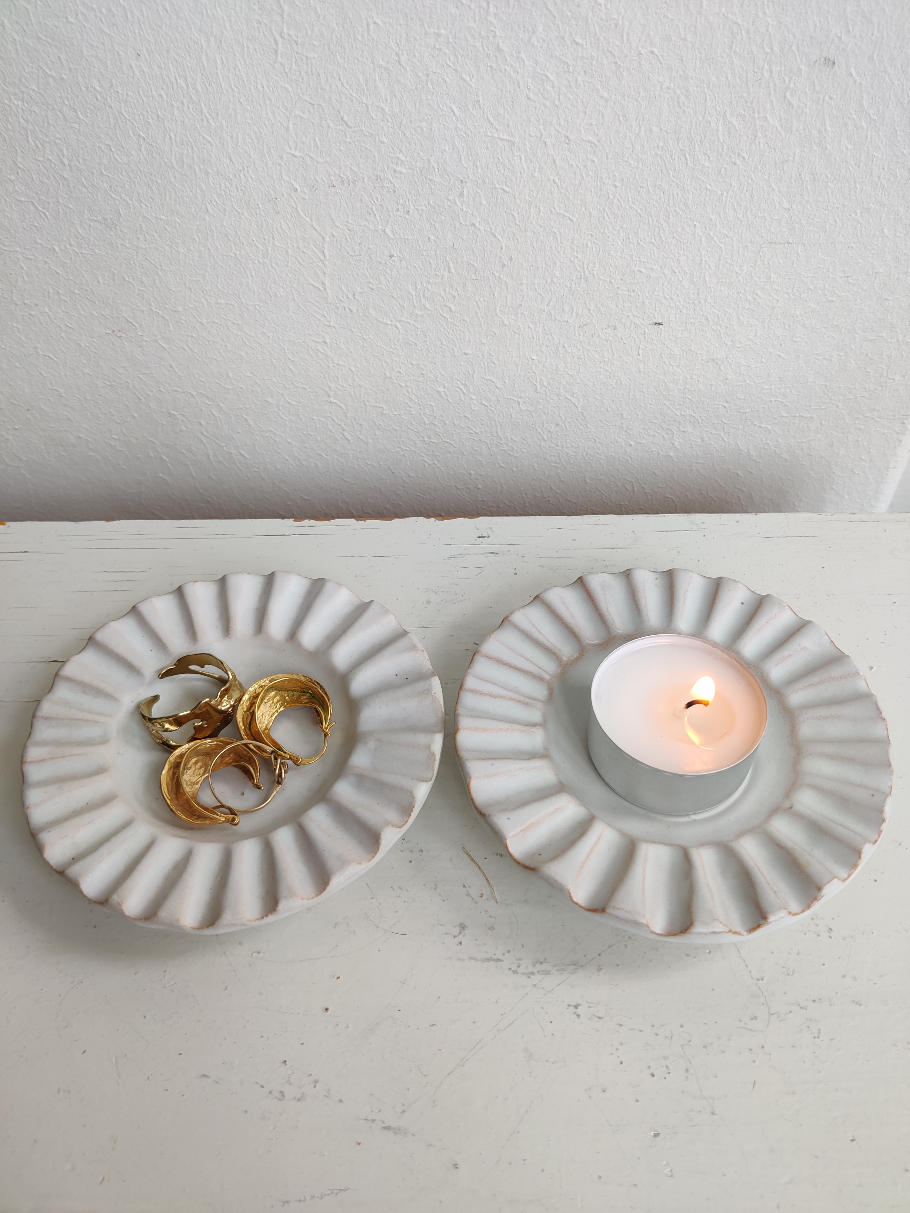 Et par meget fine og velholdte rillede hvide keramik miniskåle - i fortiden askebægre, men det er vi da ligeglade med. De er perfekte til fyrfadslys eller som mini smykkeskåle på dit natbord - eller andre små arrangementer. Ikke signerede, men de har den der Eslau/Schollert feeling. ø10 cm. Pris for begge.