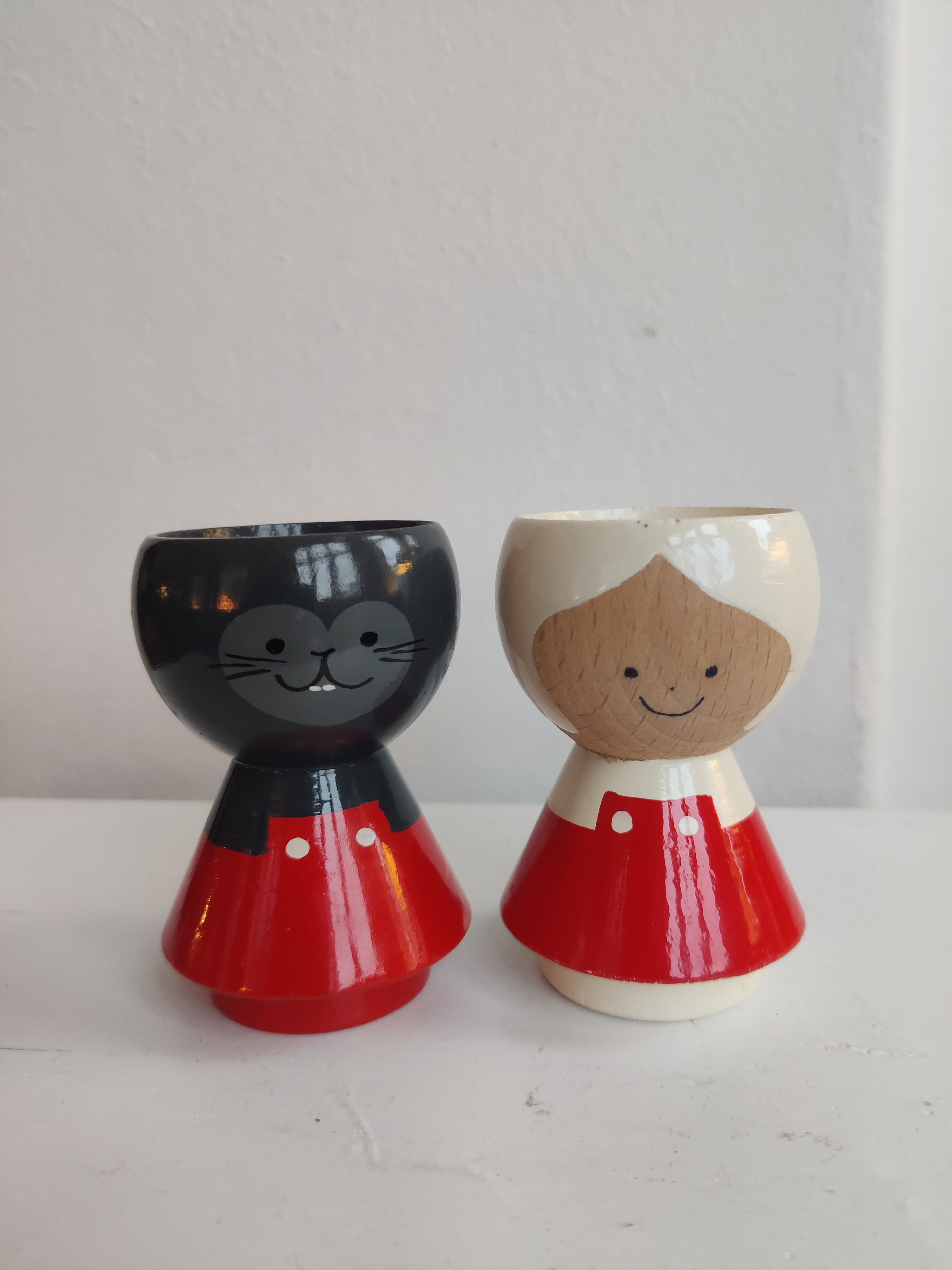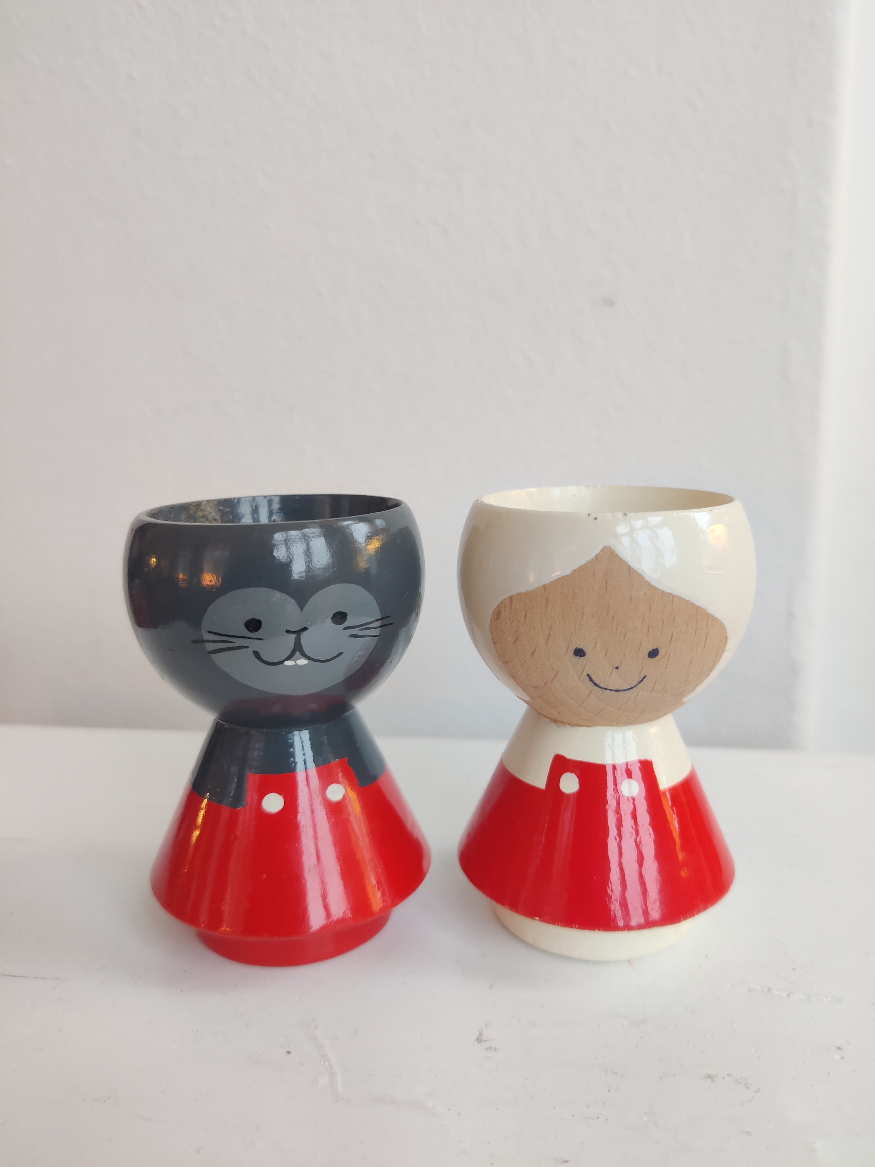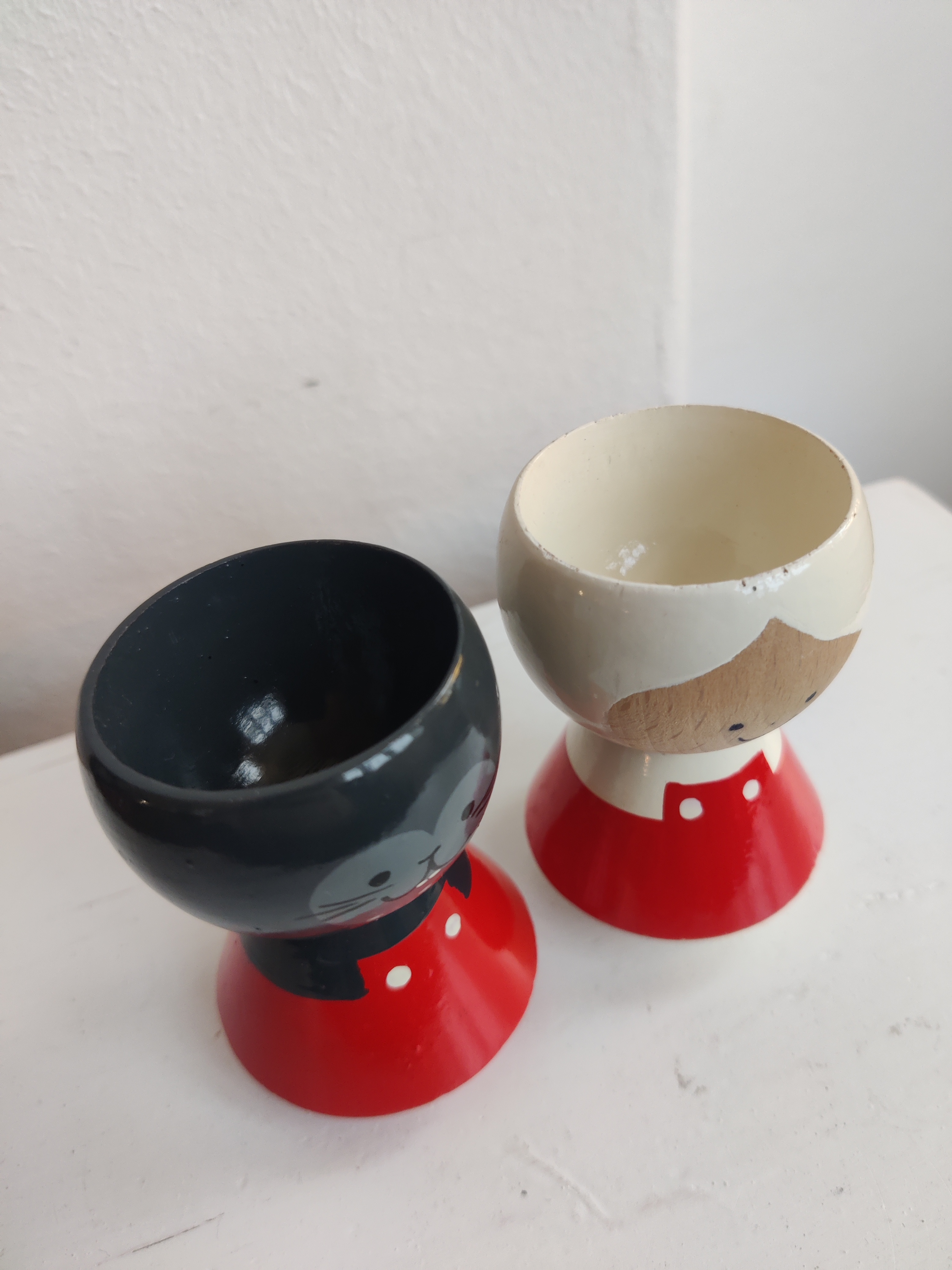 To æggebægre i form af en mus og en pige med hvidt hår fra Lyholmer. Dejligt lille par til dine morgenæg. Meget flot stand. Pigen har et Made in Denmark mærkat. Samlet pris.