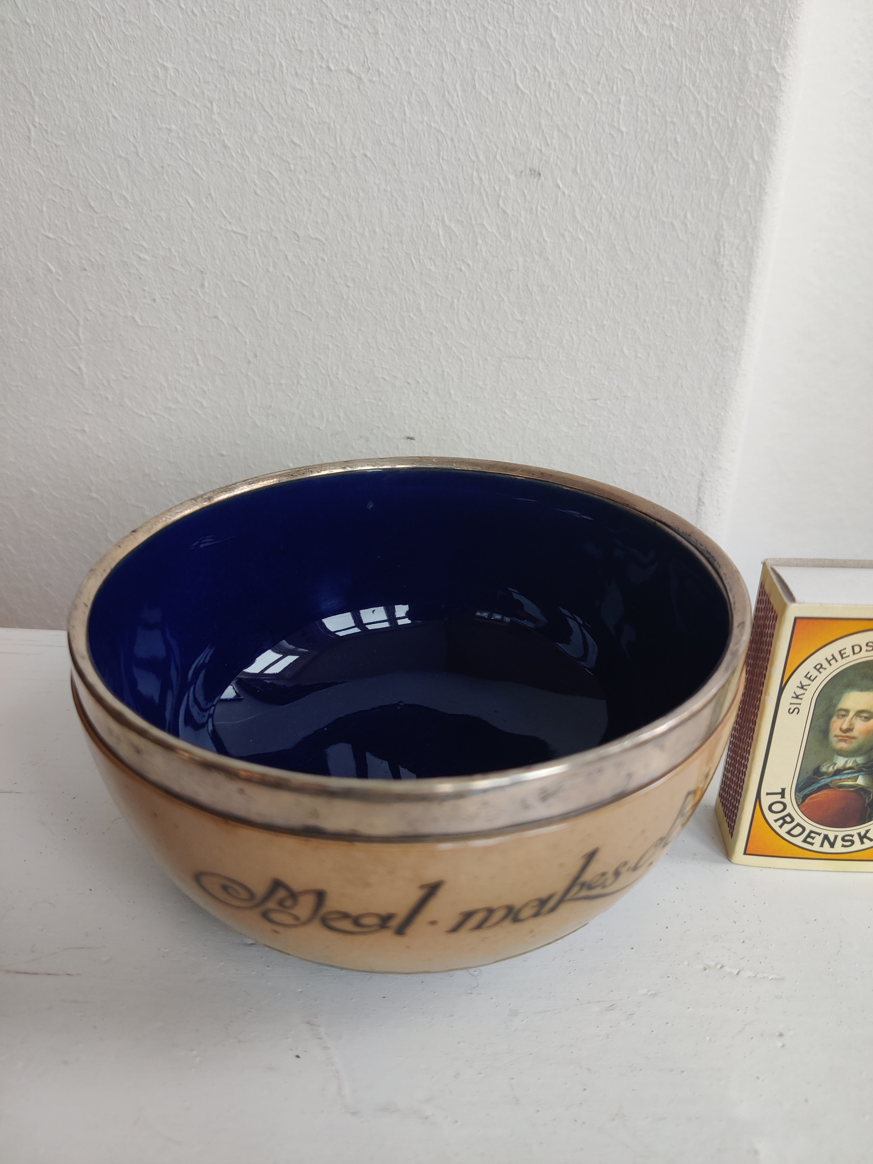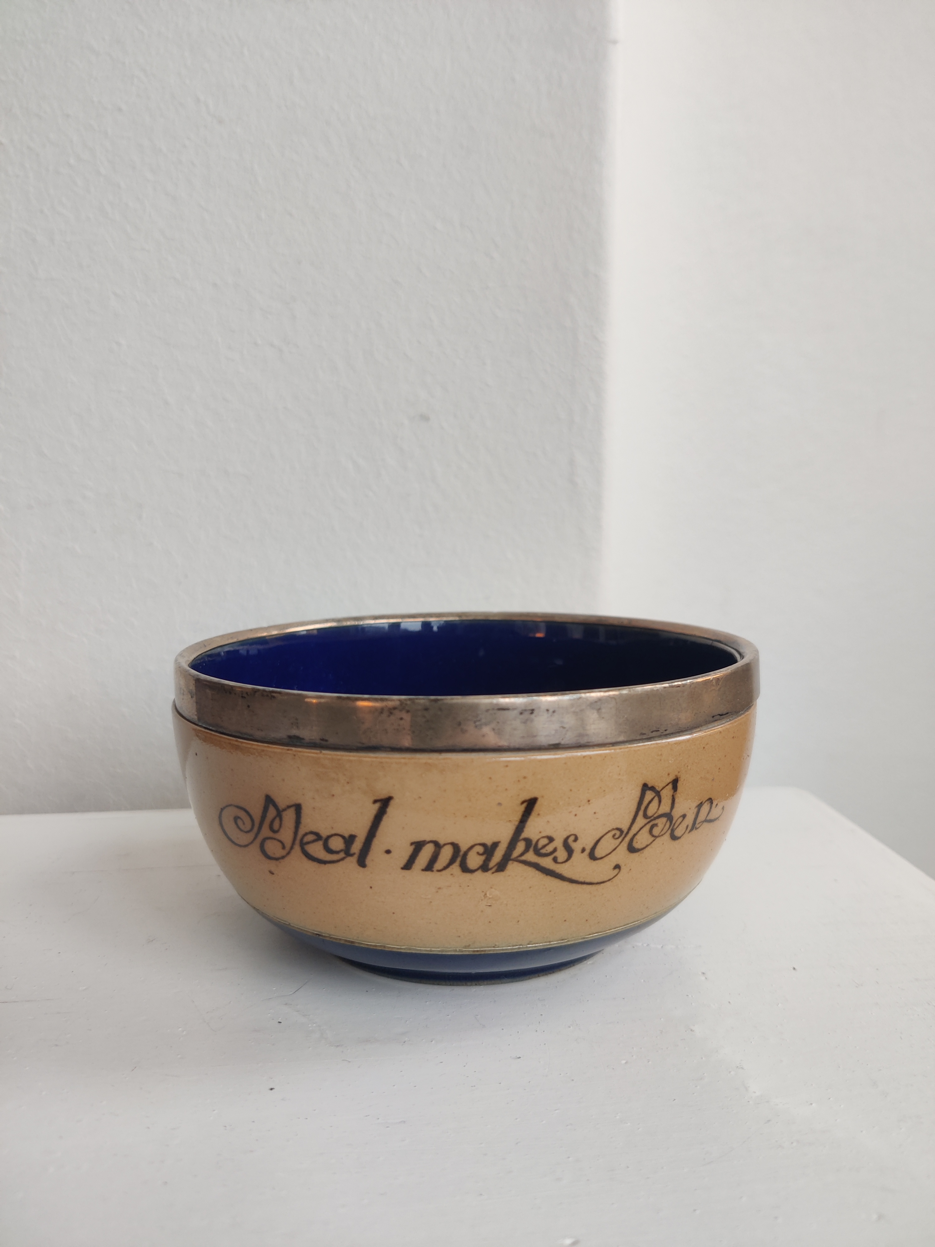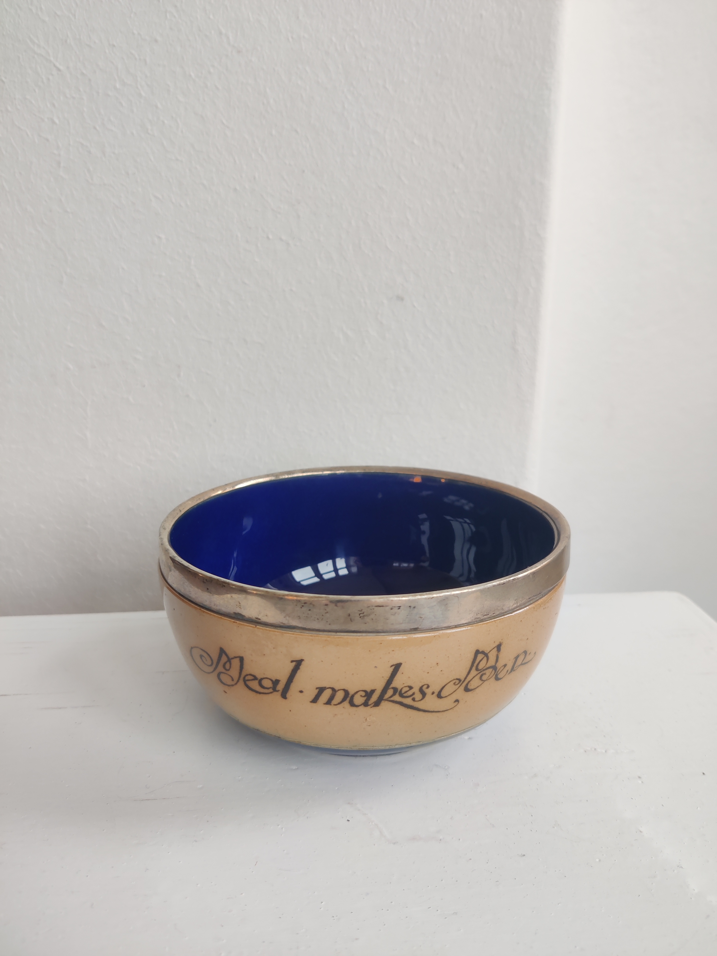 "Meal Makes Men" Royal Doulton antik og sjælden keramikskål med sterlingsølv-kant og smuk kongeblå glasur. Stemplerne fortæller, at den er fremstillet hos Cornelius Sanders & Francis Shepard i Chester, England, 1906. Den er oprindeligt en grødskål til børn. Forfatteren til Alice i Eventyrland, Lewis Caroll, voksede op i nærheden, så jeg kan ikke lade være med at forestille mig en lille pige i blå kjole spise af sådan en skål. Mål 15 cm i diameter.