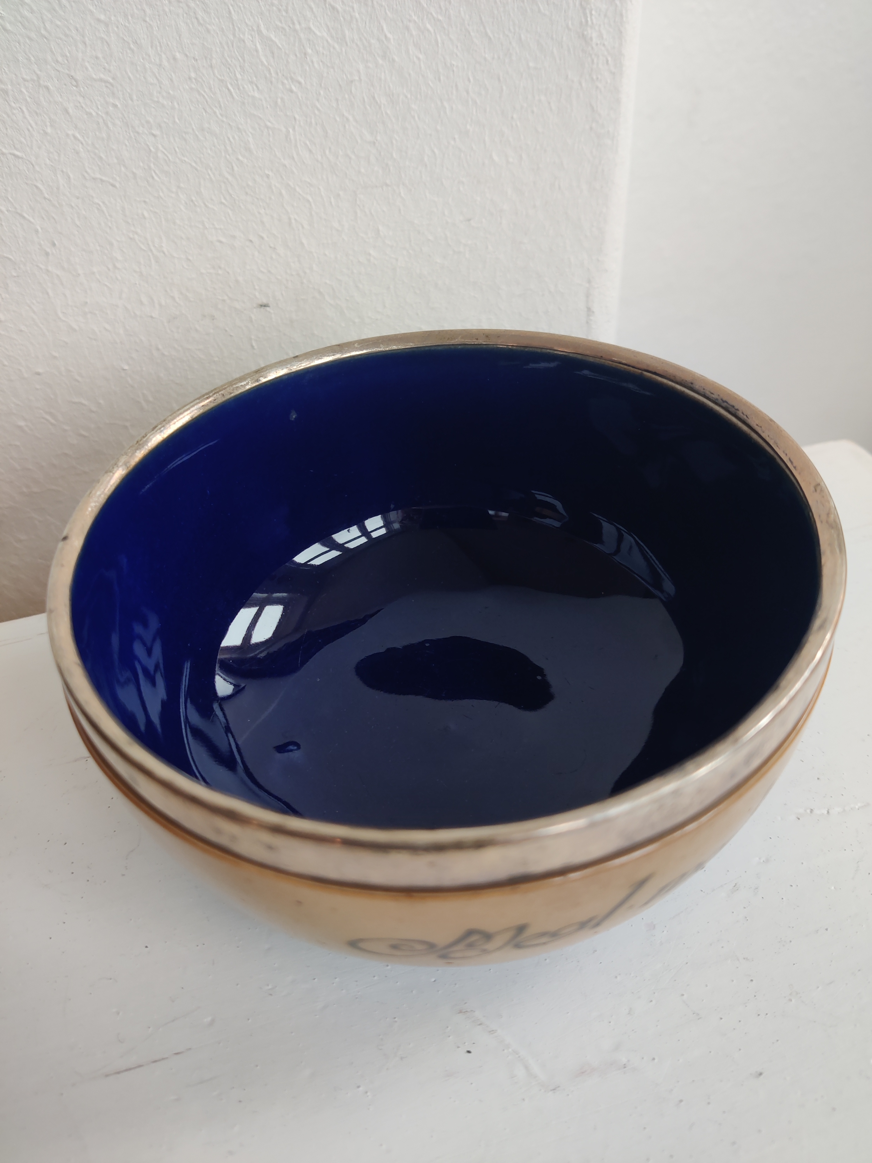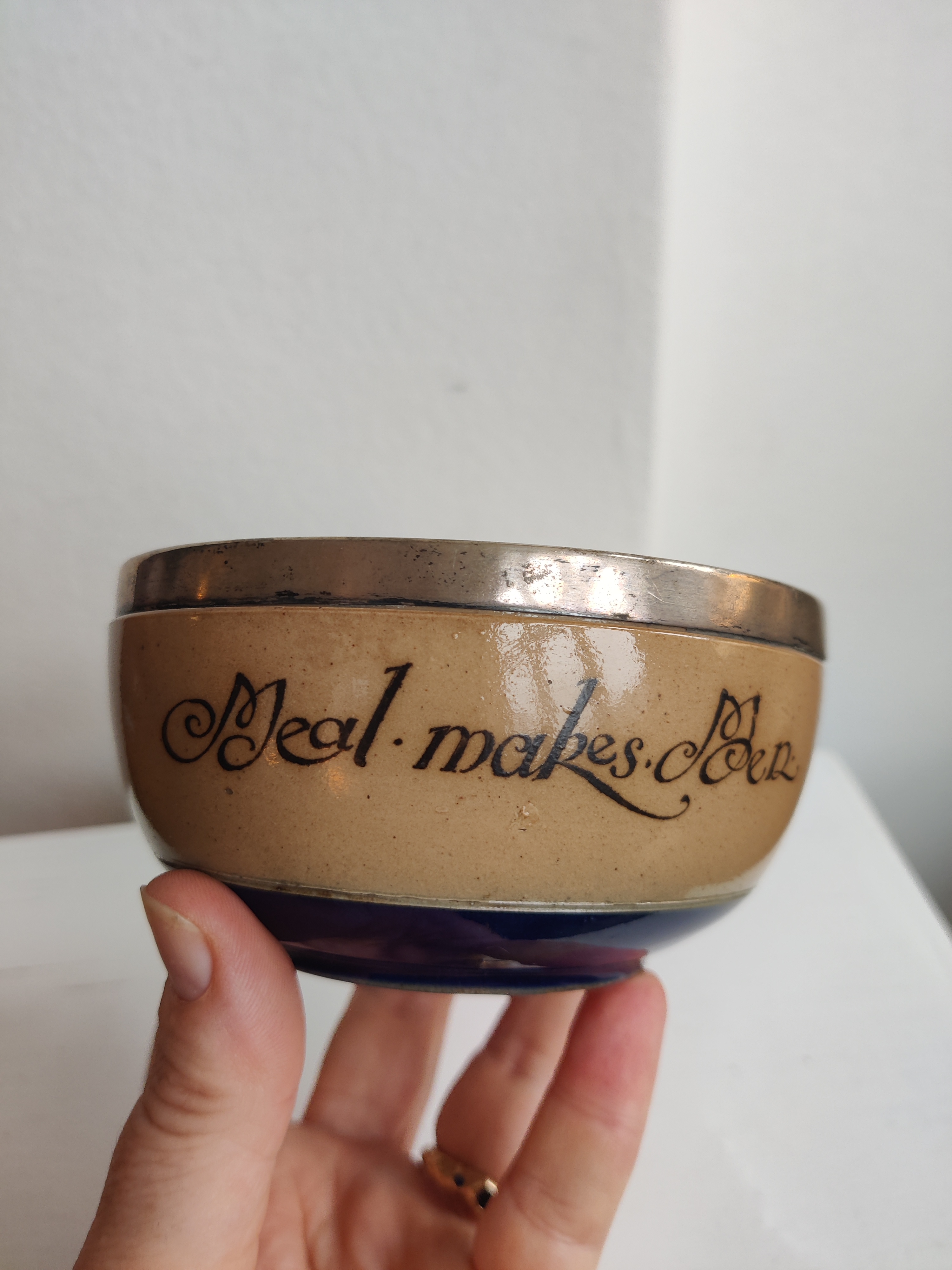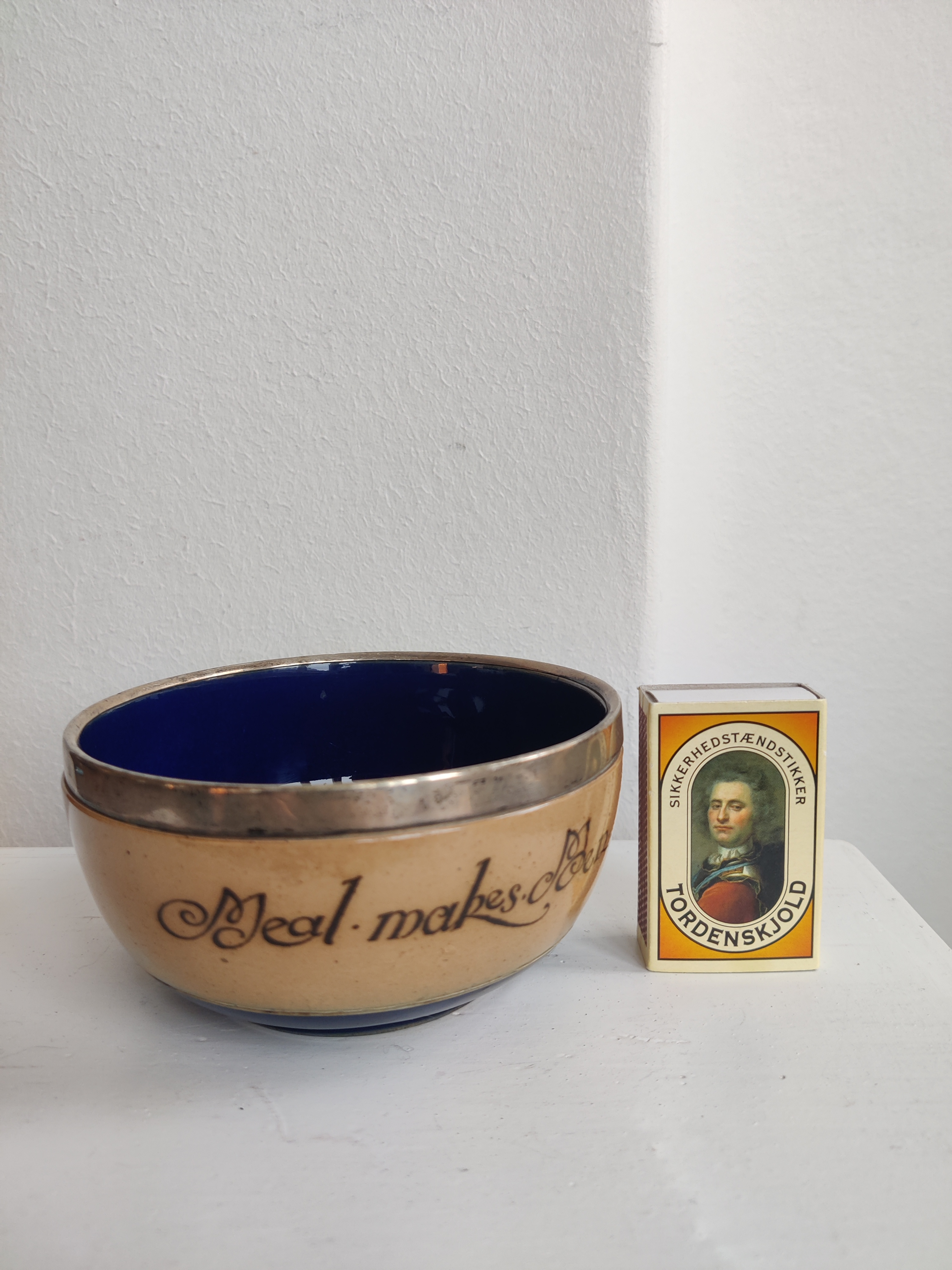 "Meal Makes Men" Royal Doulton antik og sjælden keramikskål med sterlingsølv-kant og smuk kongeblå glasur. Stemplerne fortæller, at den er fremstillet hos Cornelius Sanders & Francis Shepard i Chester, England, 1906. Den er oprindeligt en grødskål til børn. Forfatteren til Alice i Eventyrland, Lewis Caroll, voksede op i nærheden, så jeg kan ikke lade være med at forestille mig en lille pige i blå kjole spise af sådan en skål. Mål 15 cm i diameter.
