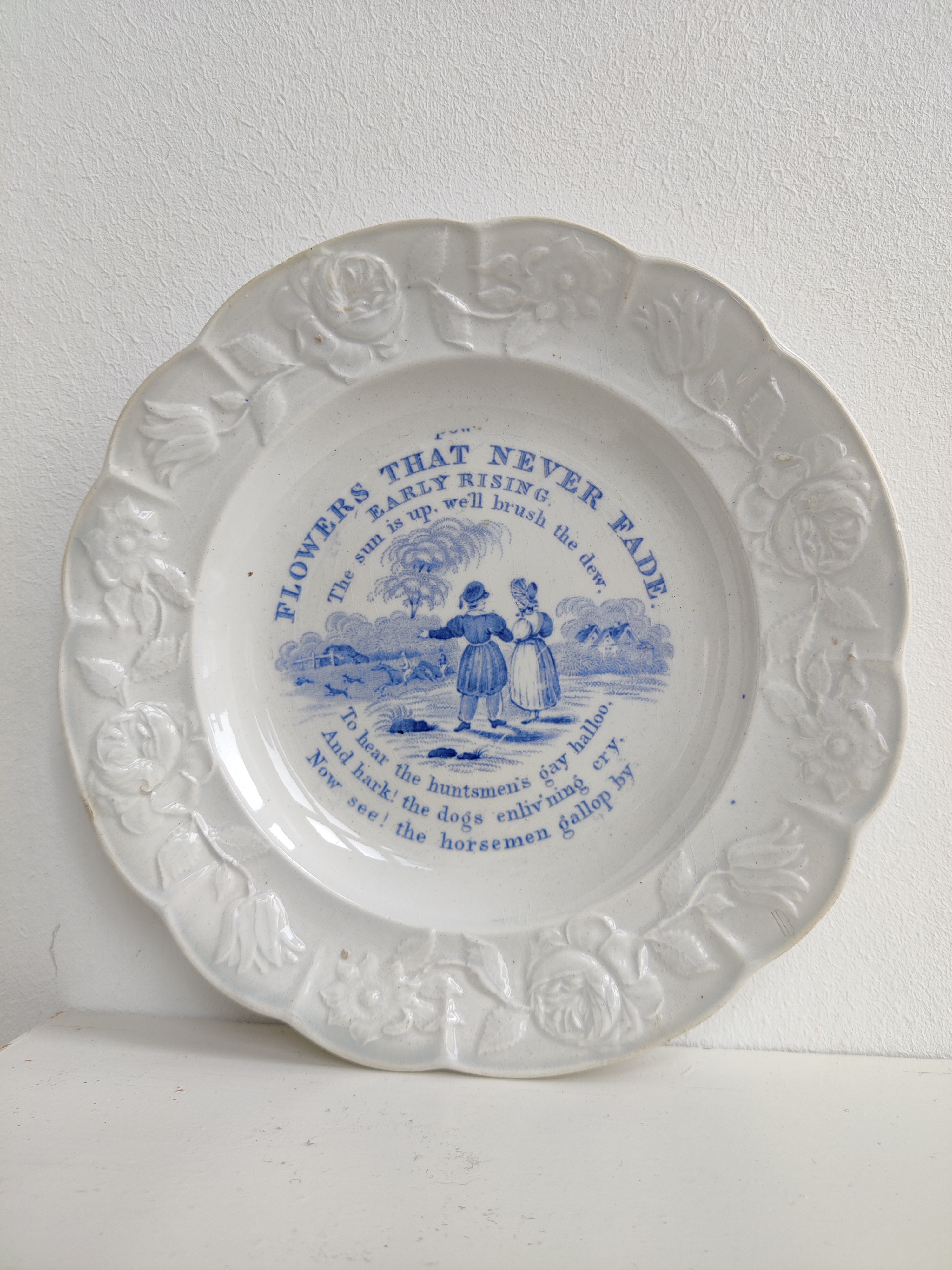Sjælden engelsk antik børnetallerken i serien "Flowers that never fade" om de dyder, man som et godt lille menneske skulle have. Datering er ca. 1840.